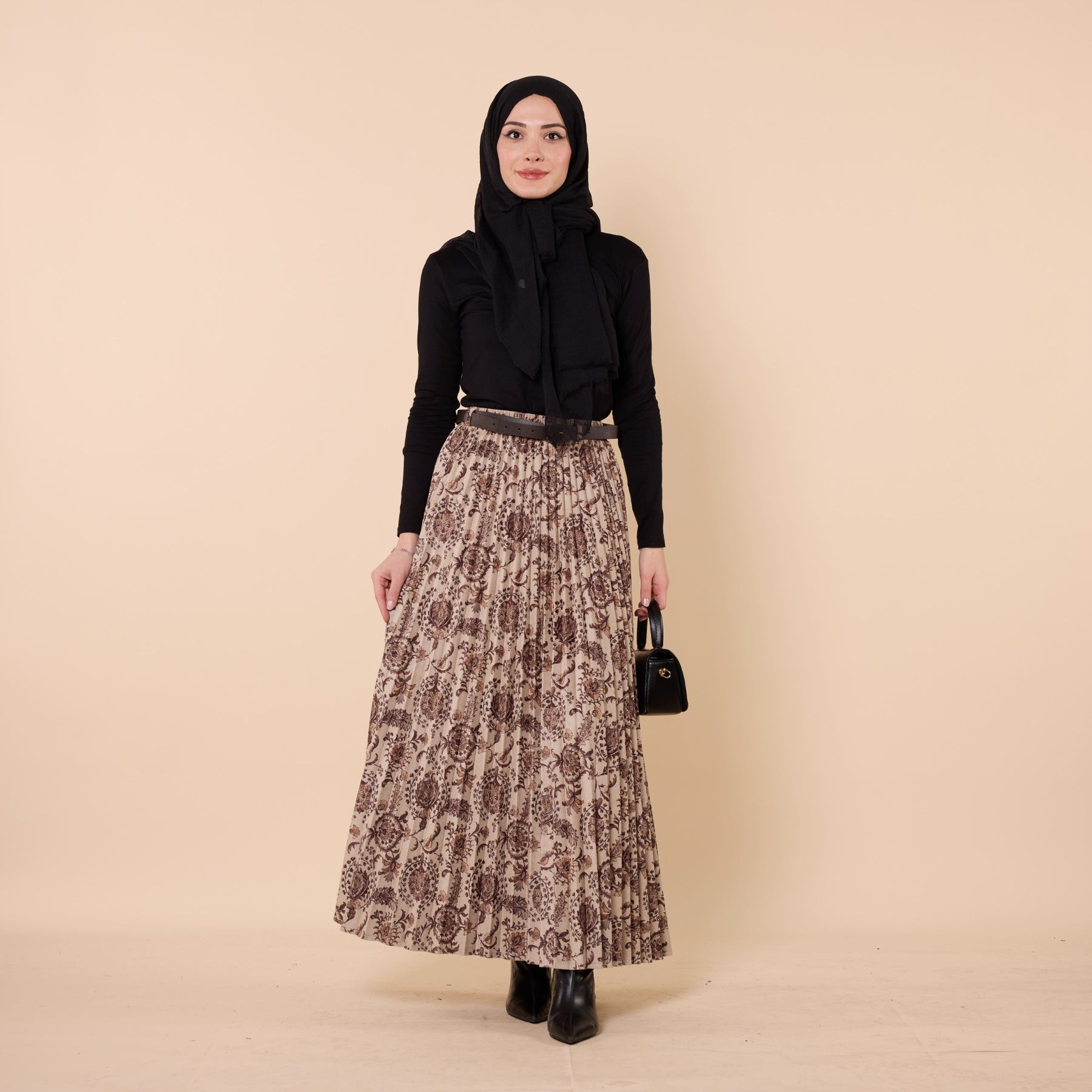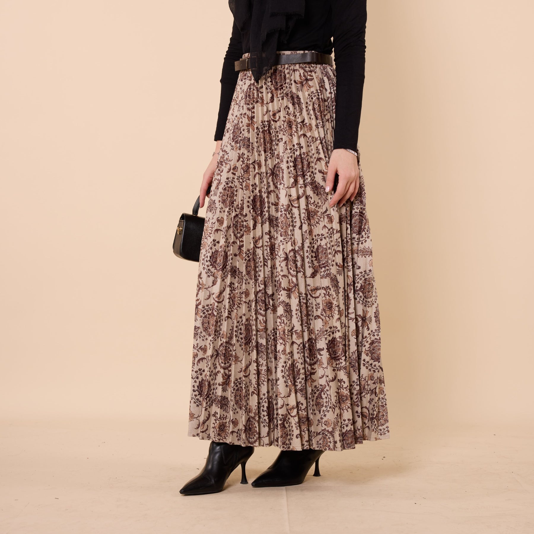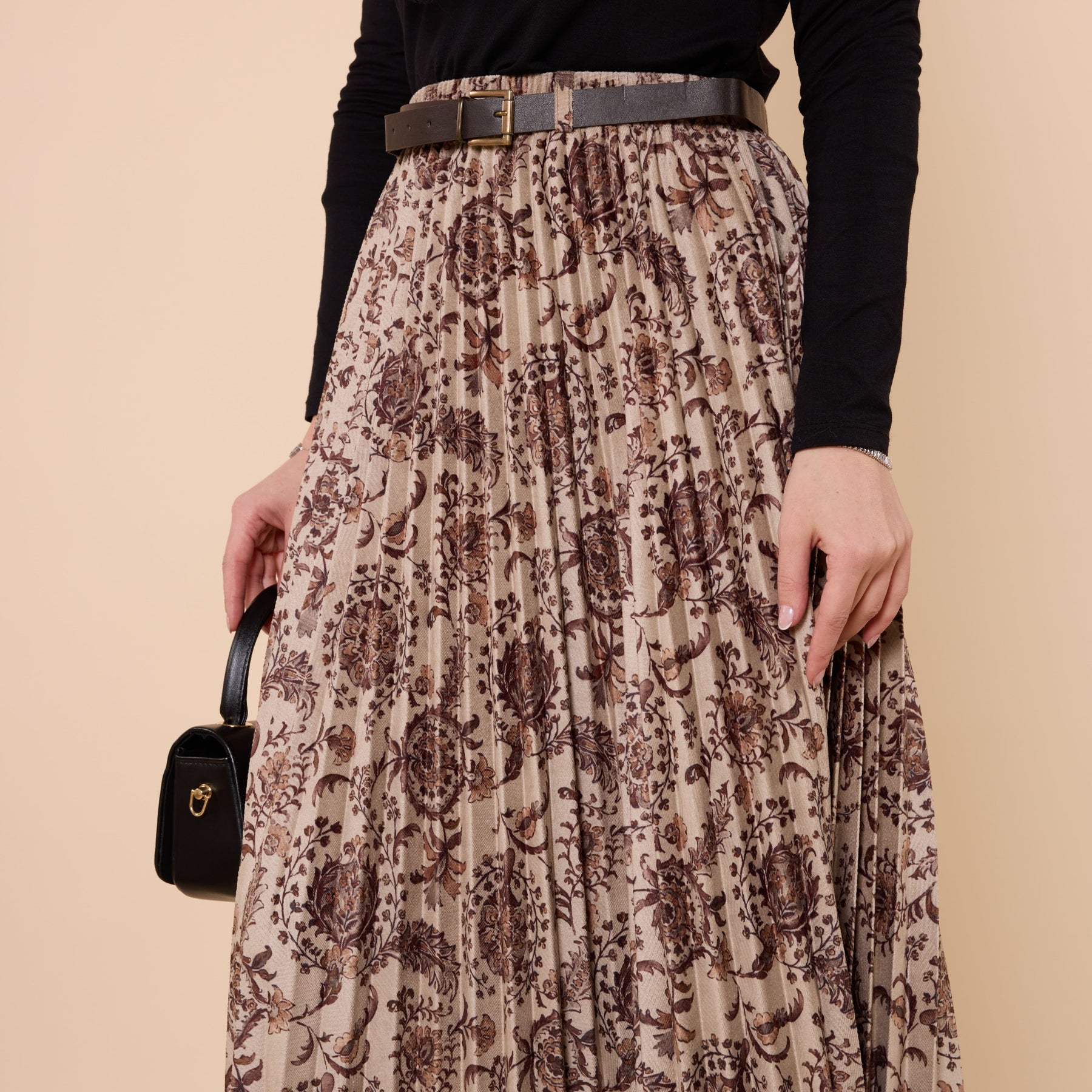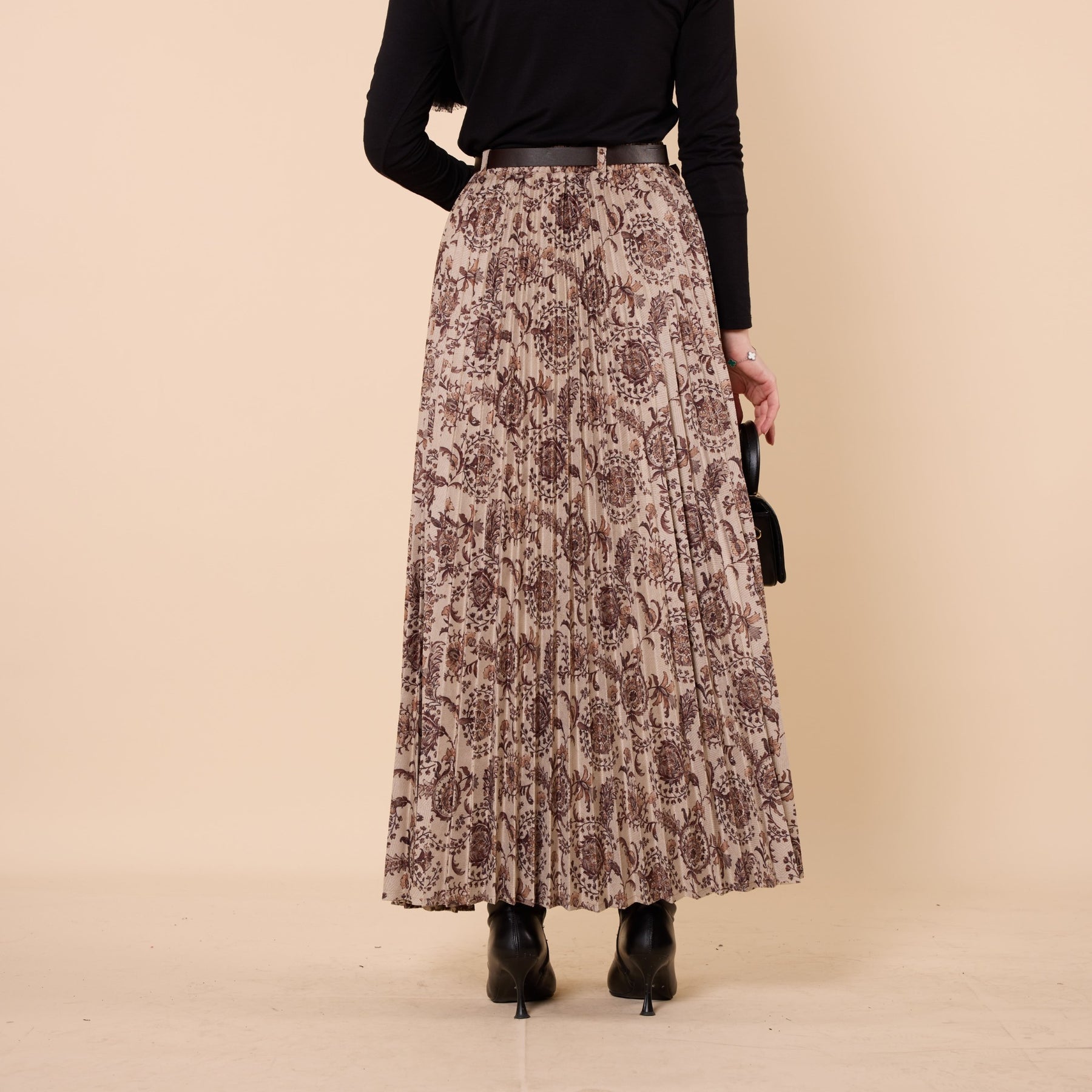 Featuring elegant floral patterns, this pleated long skirt is designed for the winter season with its thick fabric that offers warmth and comfort. The unlined structure ensures a lightweight feel, while the pleated form creates a flowing and feminine silhouette. An elasticated waistband provides all-day comfort, and the belt detail adds a refined finishing touch to the overall look.