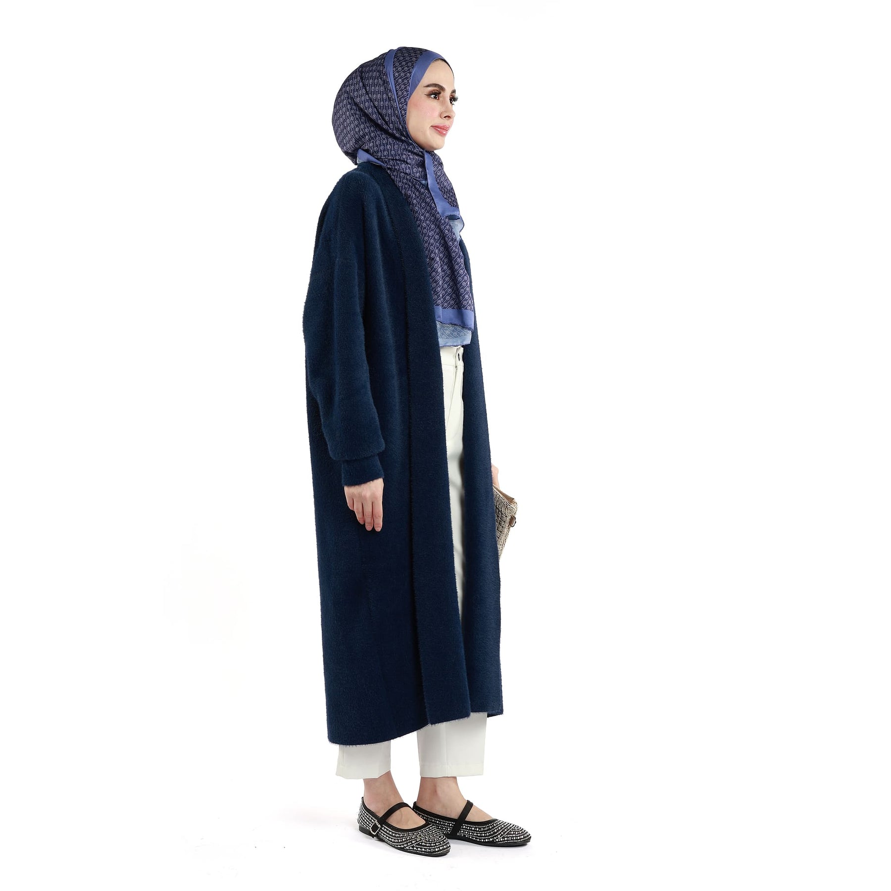 Buttonless, shawl-collar long tunic design