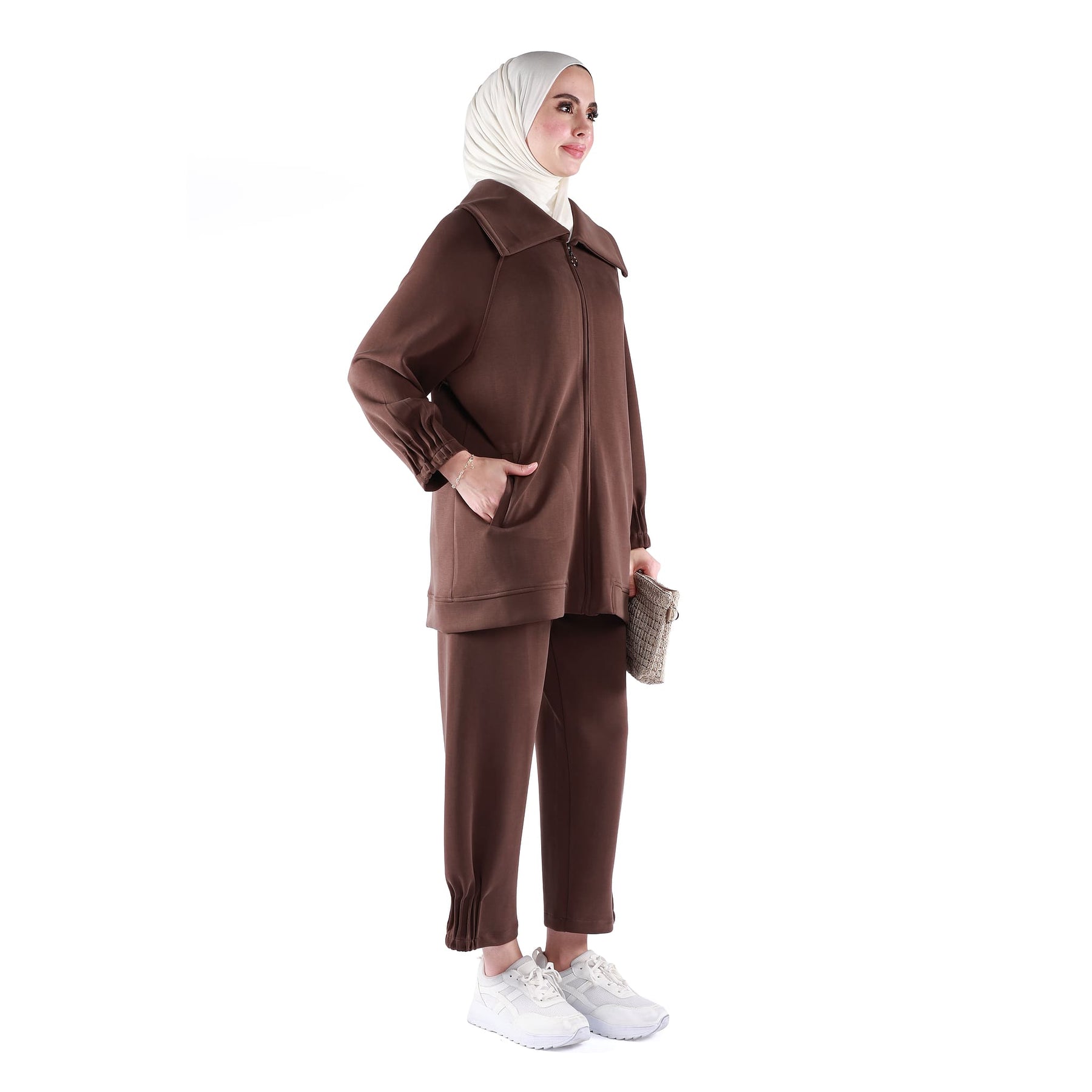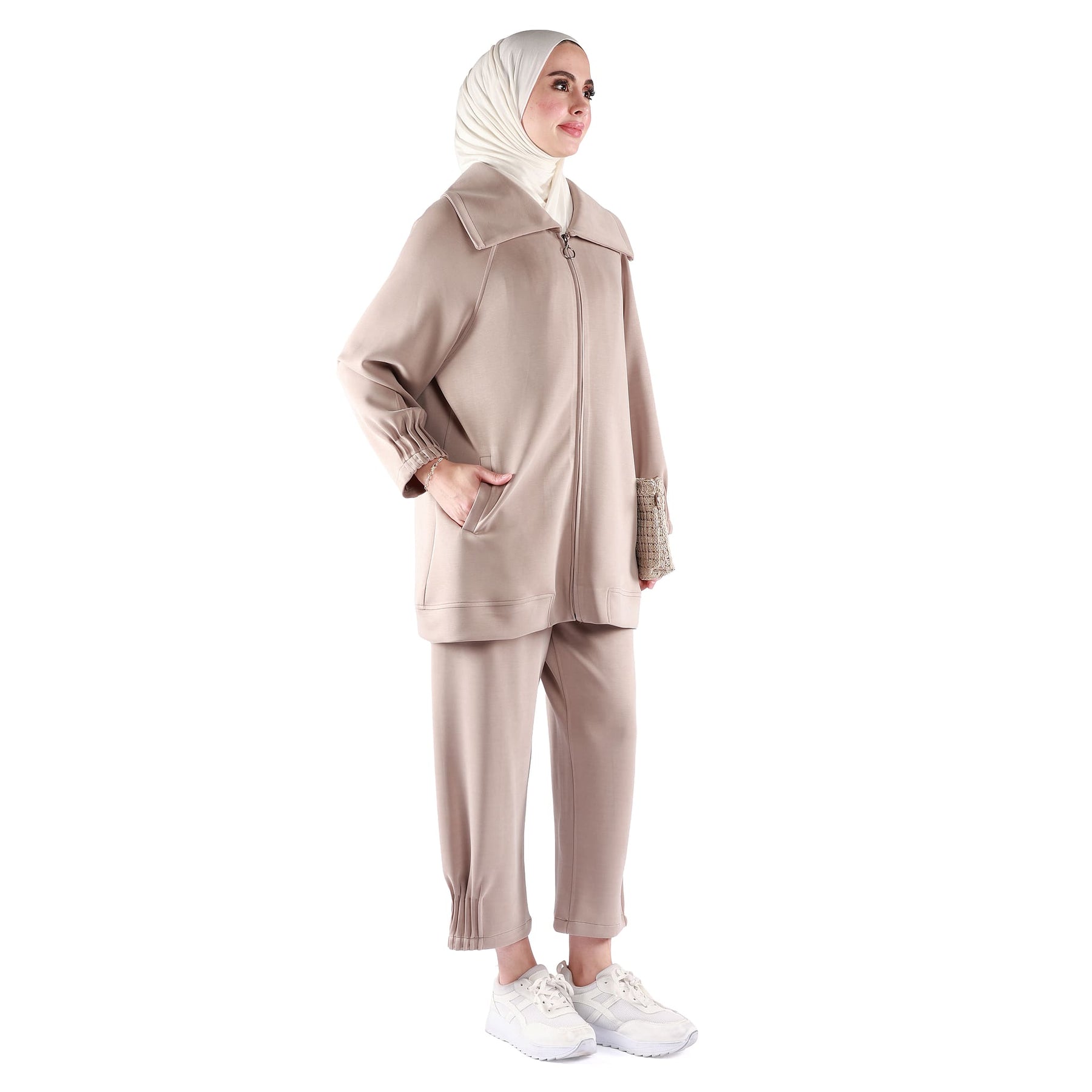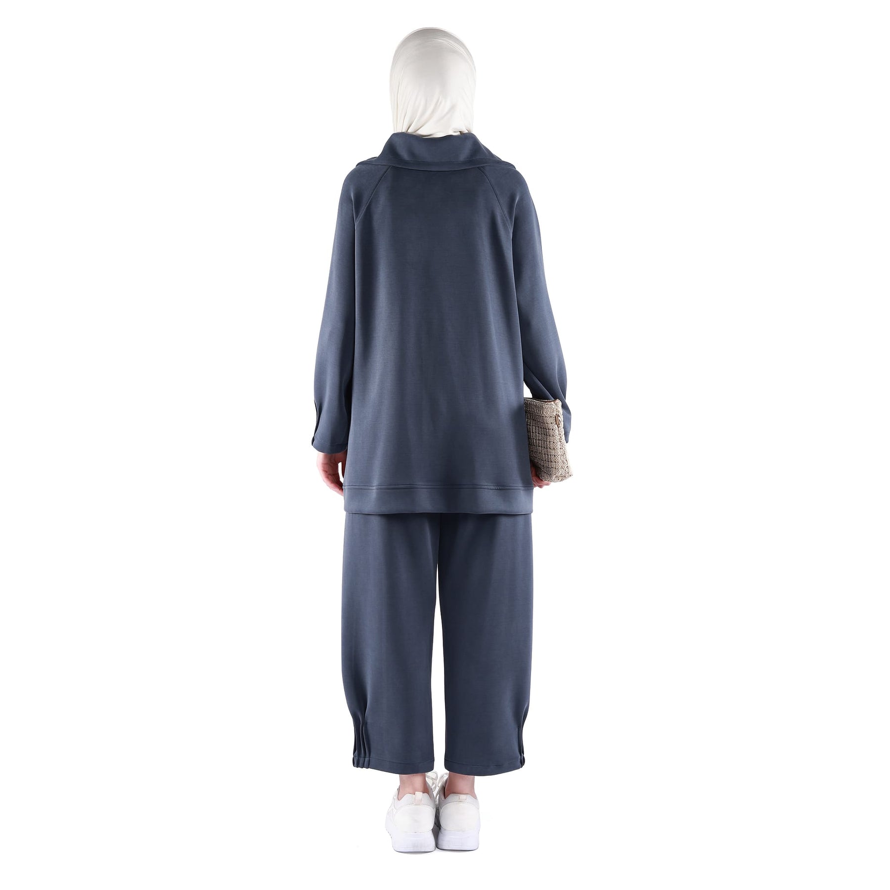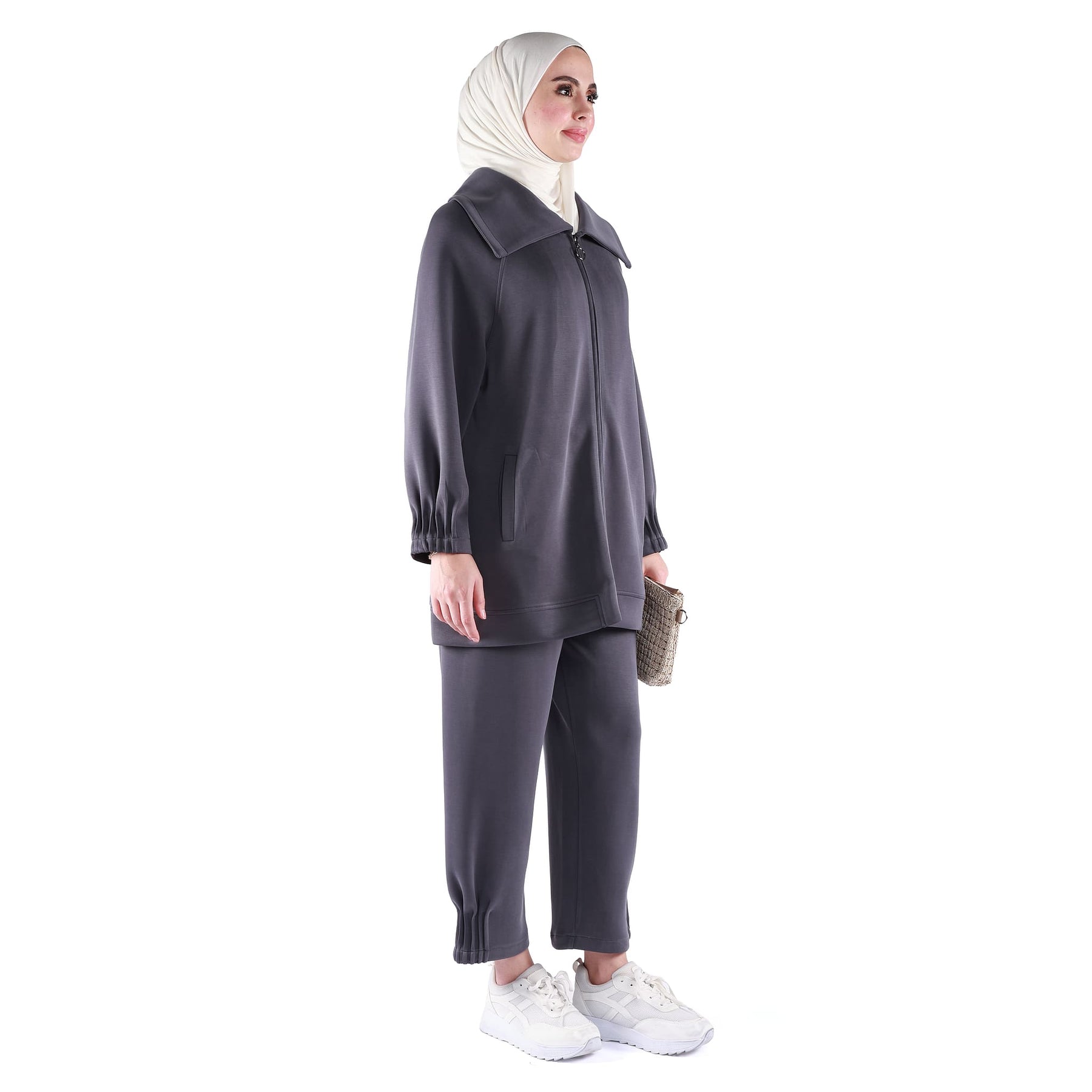 The polo collar zip-up gathered detail set offers comfort and style, perfect for daily wear. Made from 48% polyester, 48% modal, and 6% elastane, it provides a soft, lightweight, and stretchy fabric. The wide polo collar gives a modern look, while the gathered details on sleeves and ankles add a dynamic and stylish touch.