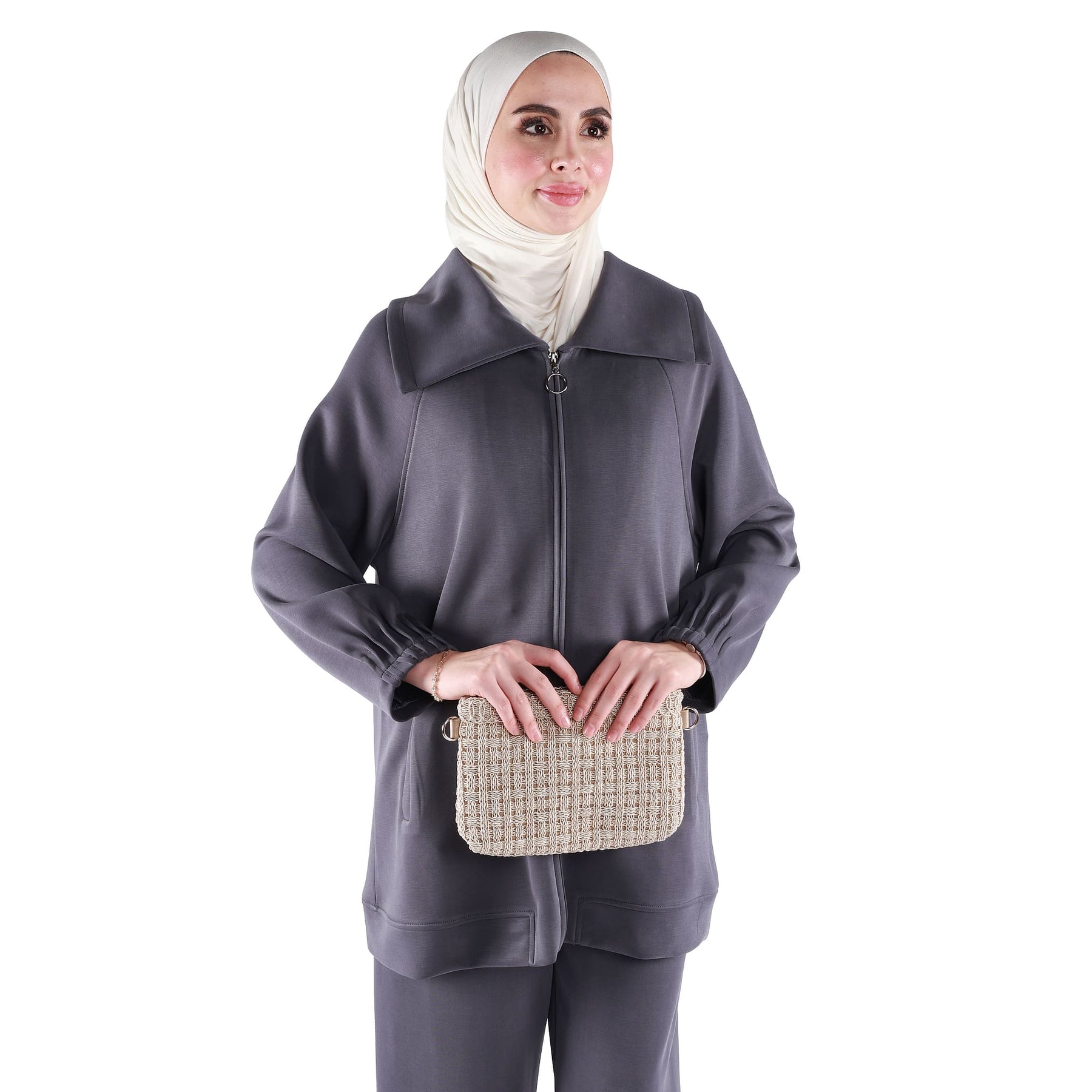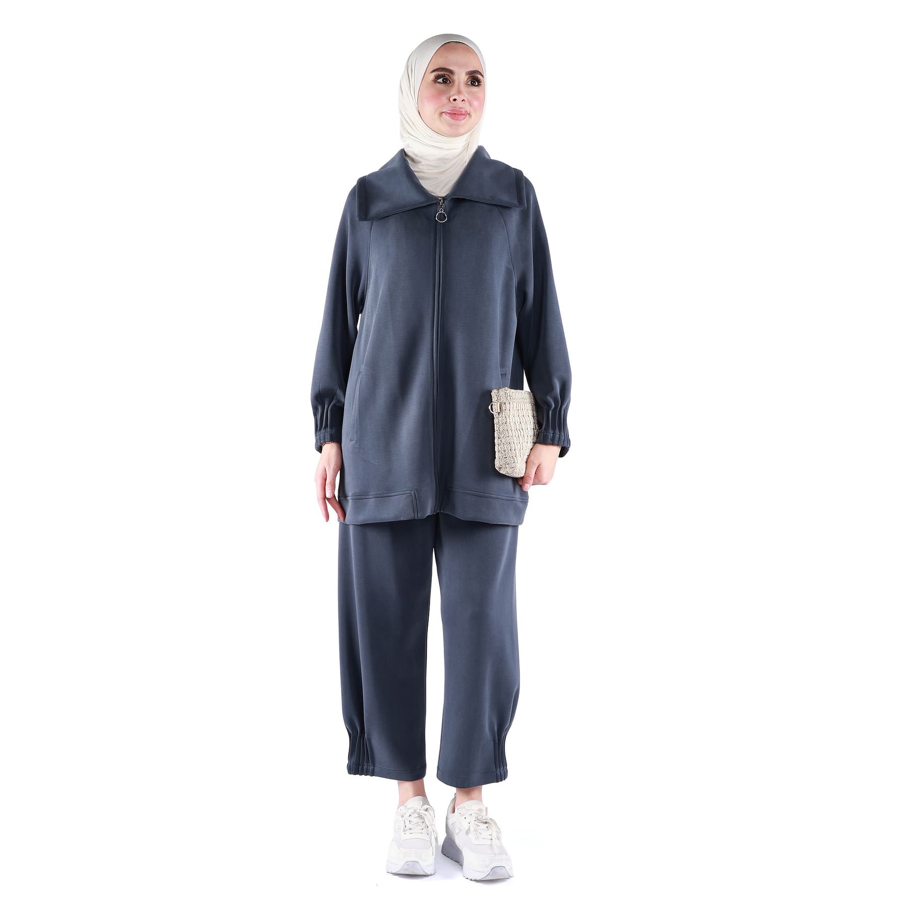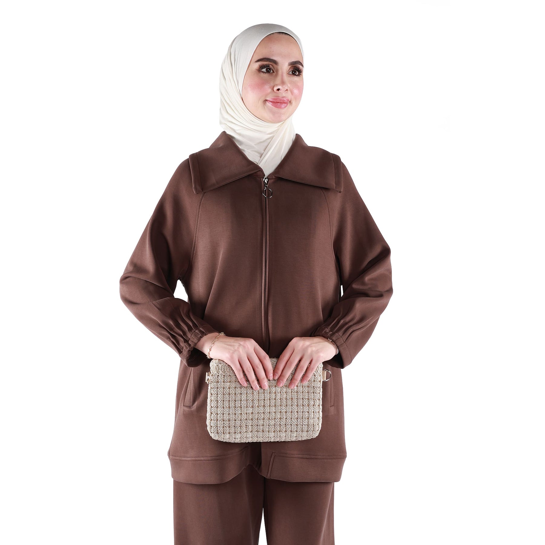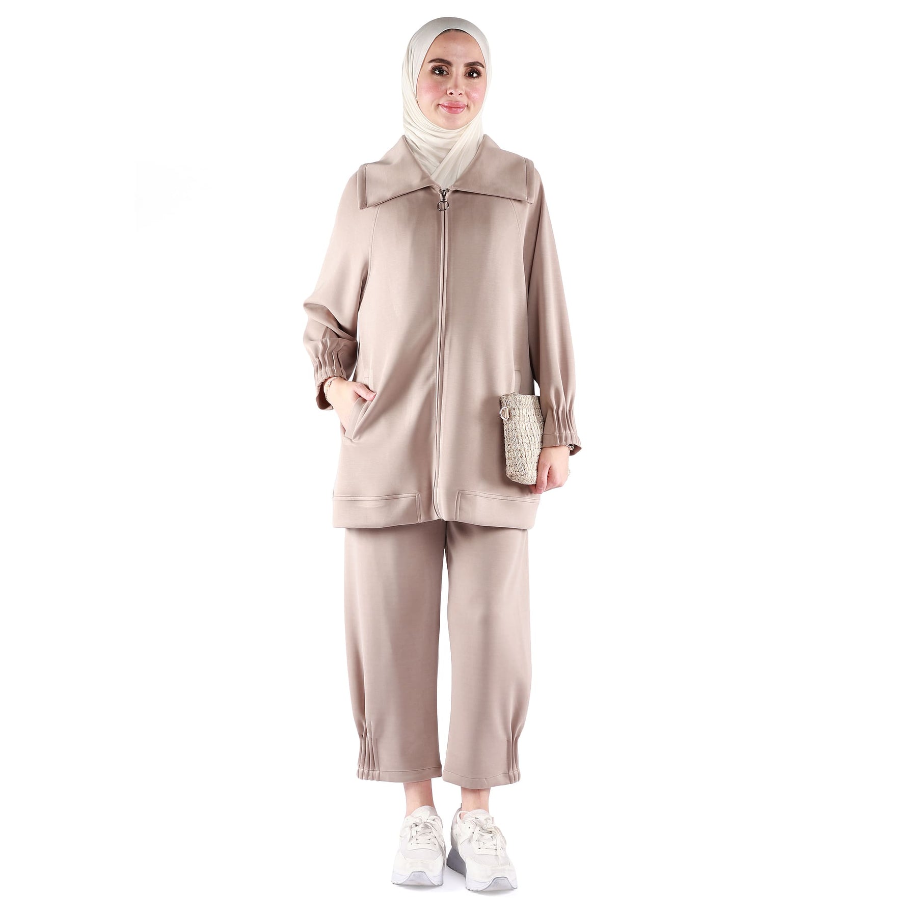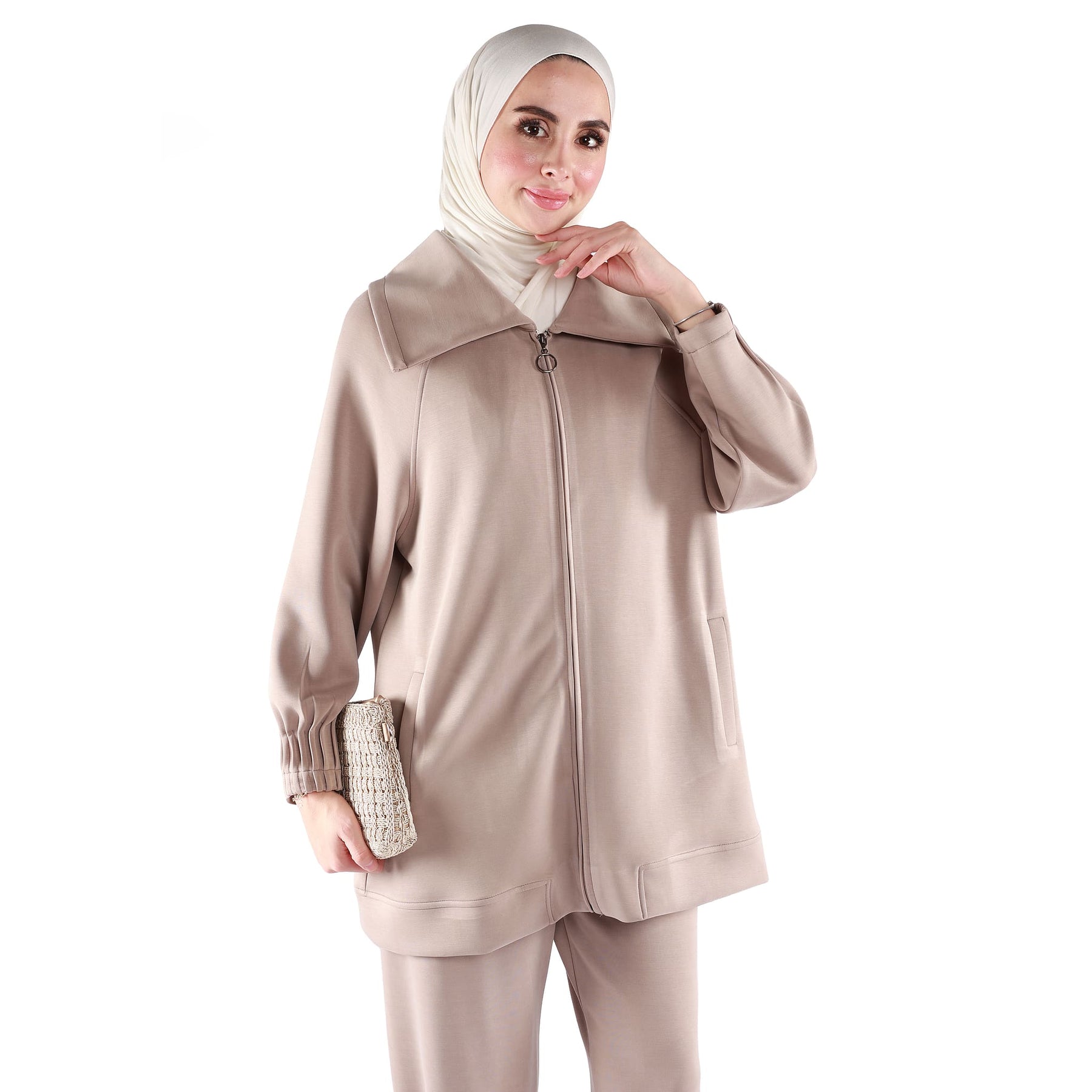 The polo collar zip-up gathered detail set offers comfort and style, perfect for daily wear. Made from 48% polyester, 48% modal, and 6% elastane, it provides a soft, lightweight, and stretchy fabric. The wide polo collar gives a modern look, while the gathered details on sleeves and ankles add a dynamic and stylish touch.