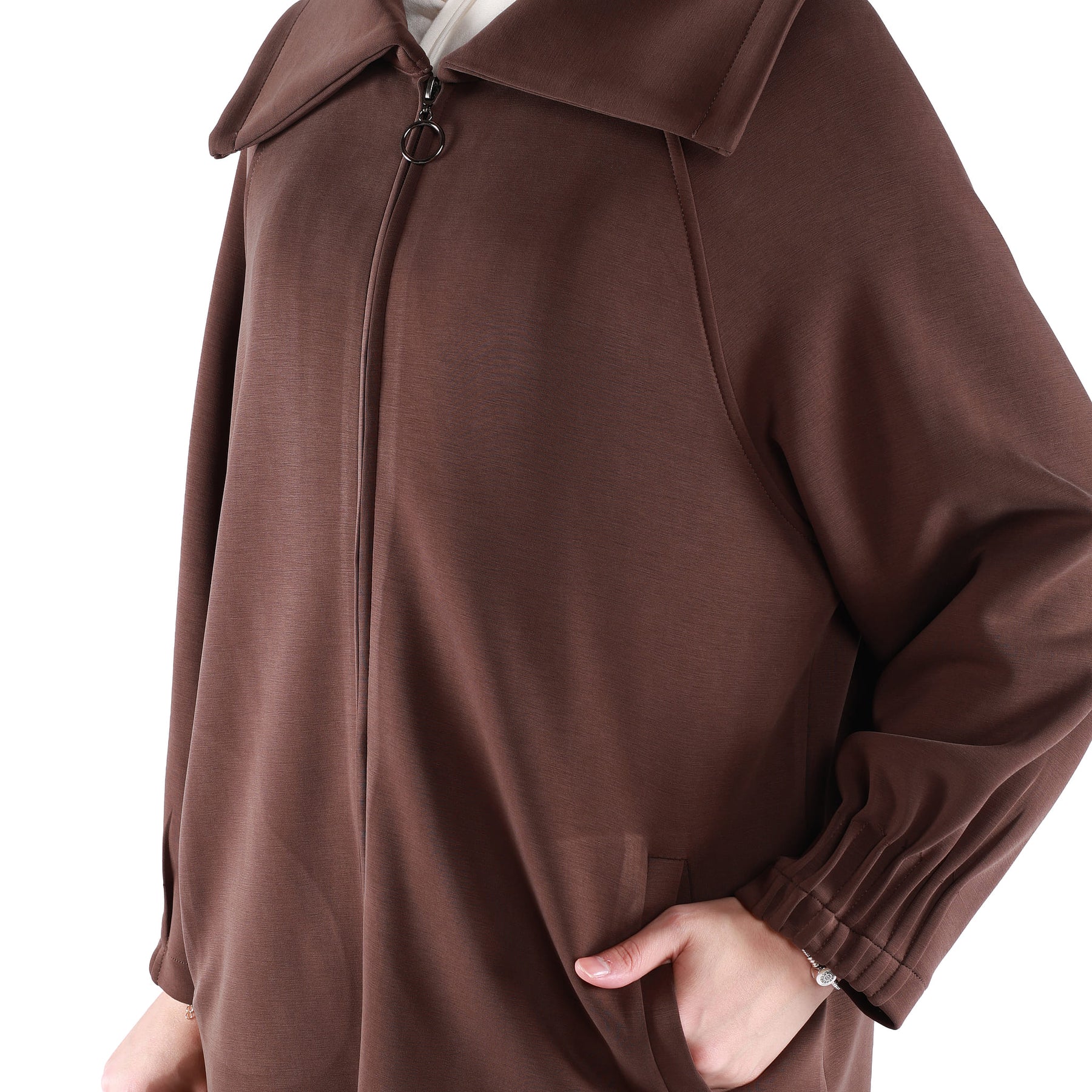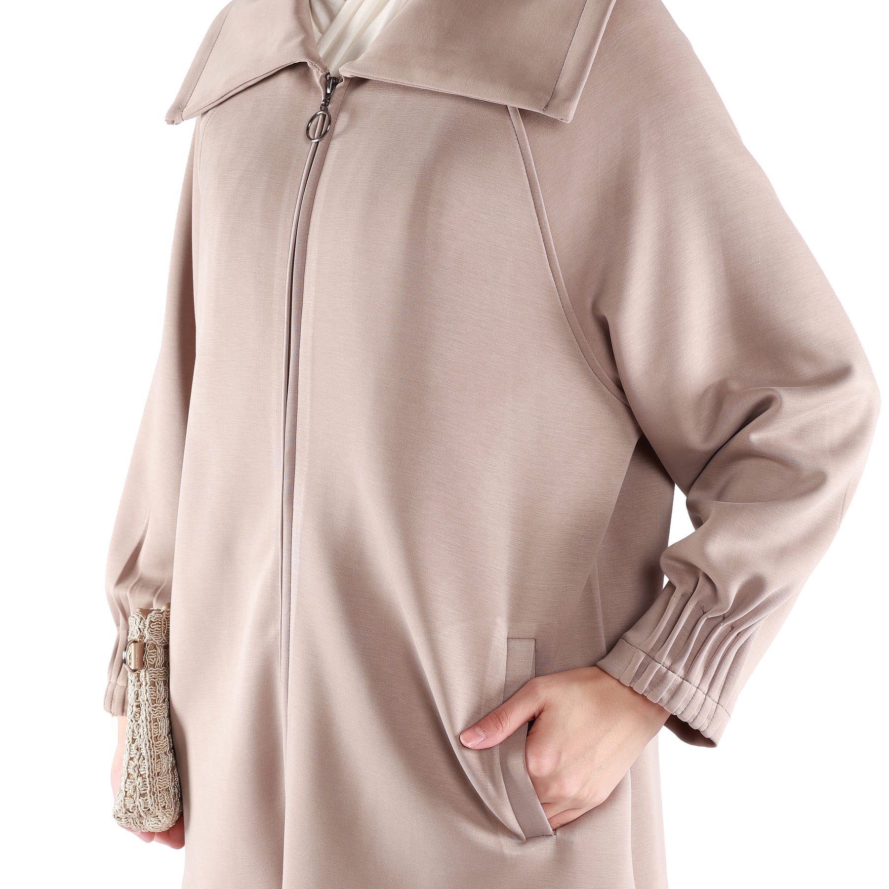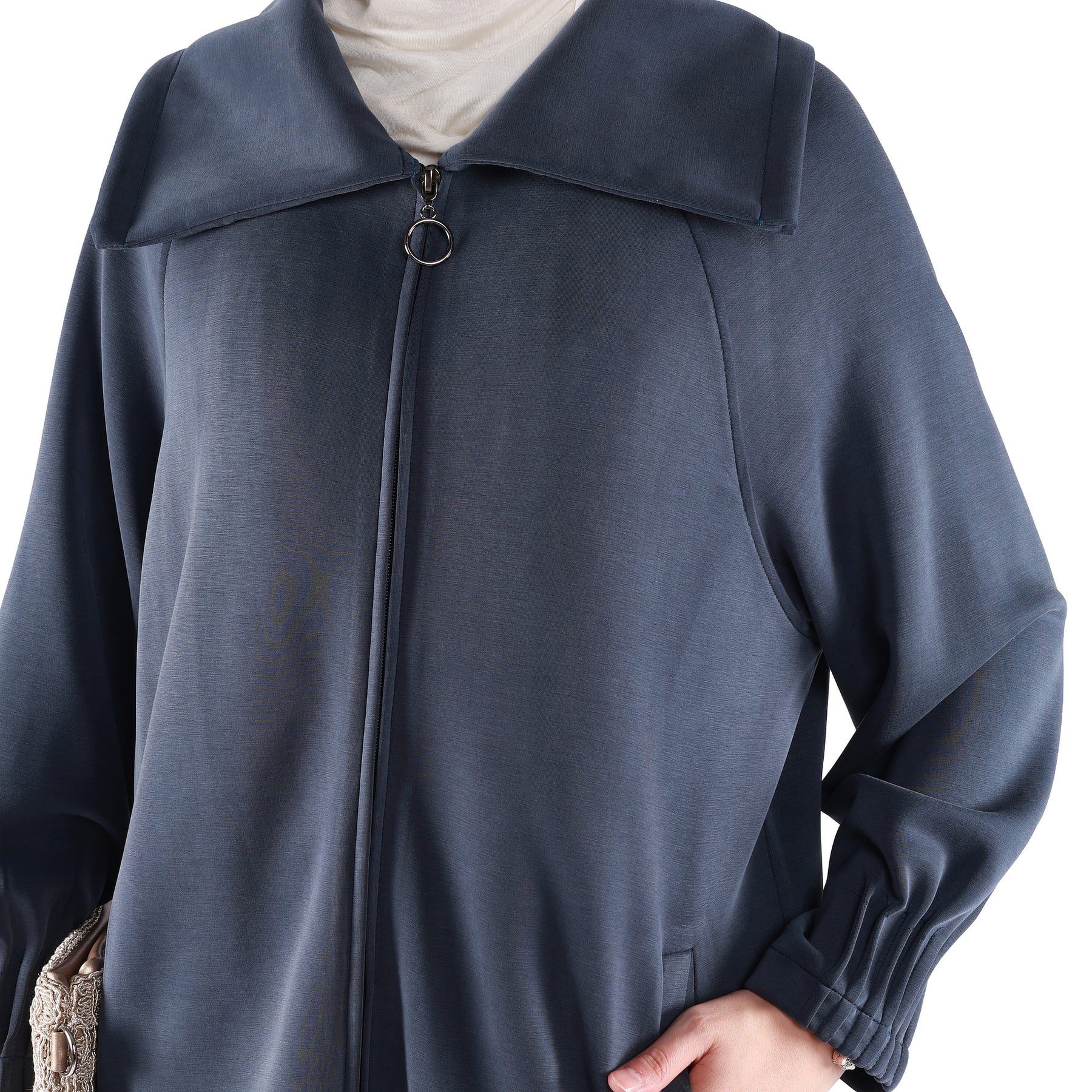 Detail: Wide polo collar, gathered sleeves and ankles, zip-up top