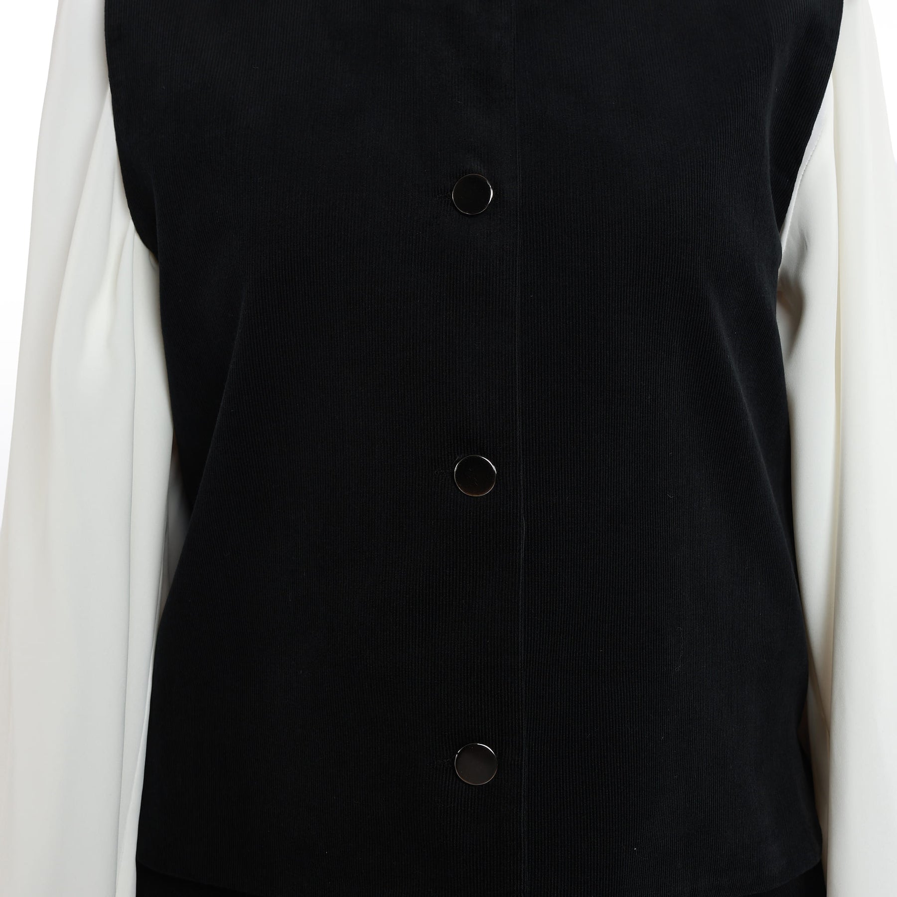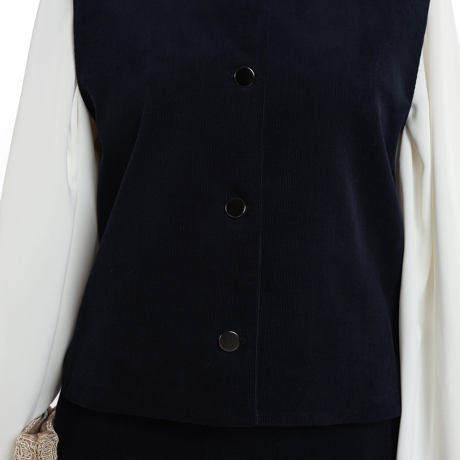 Top Detail: Sleeveless vest with silver button detail