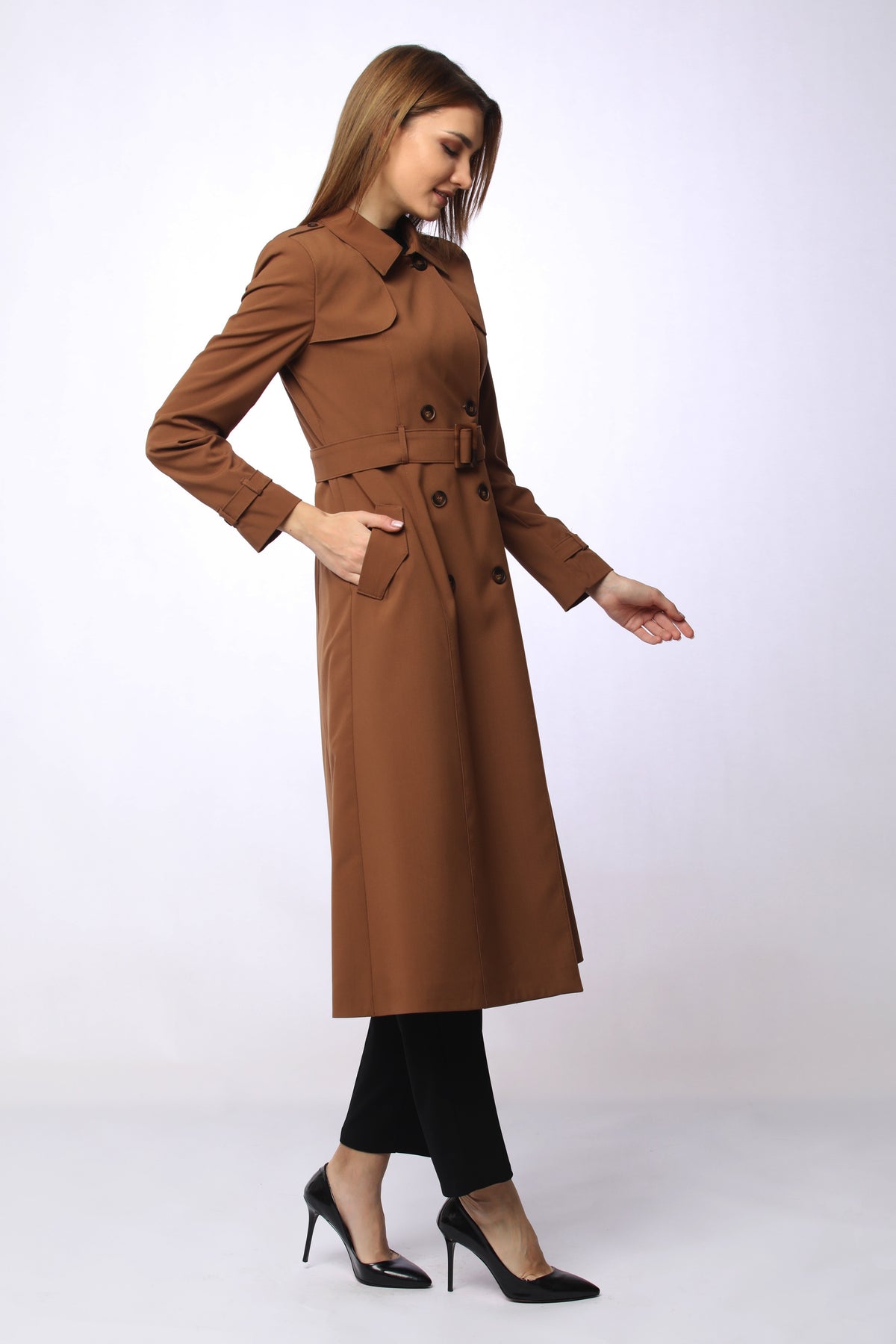Crafted from a blend of 73% polyester, 23% viscose, and 4% elastane, this trench coat is available in a wide range of colors: navy, brick, latte brown, mink, black, blue, rosewood, burgundy, tan, khaki, beige, stone, lilac, plum, and gray. Perfect for daily chic, professional looks, and special occasions.