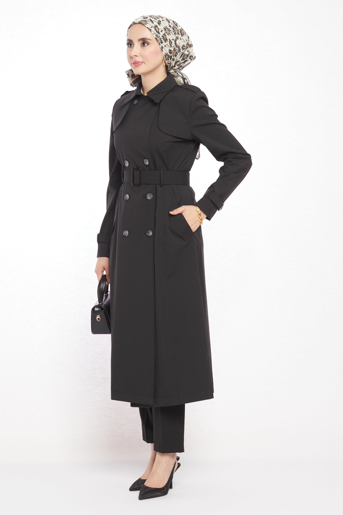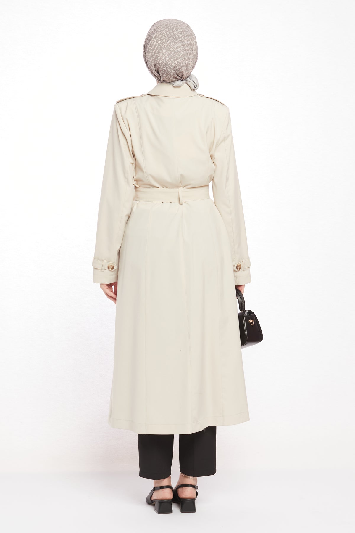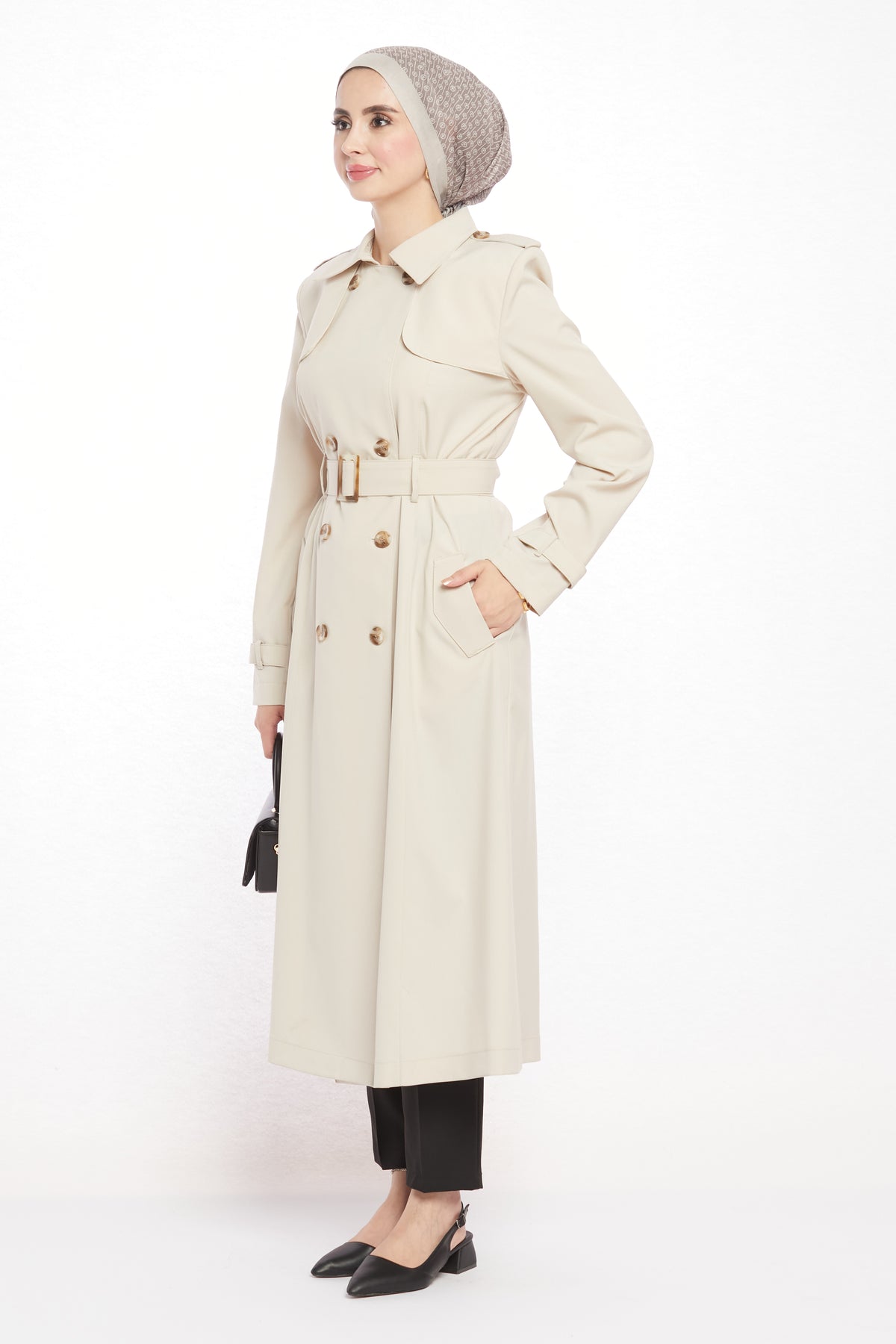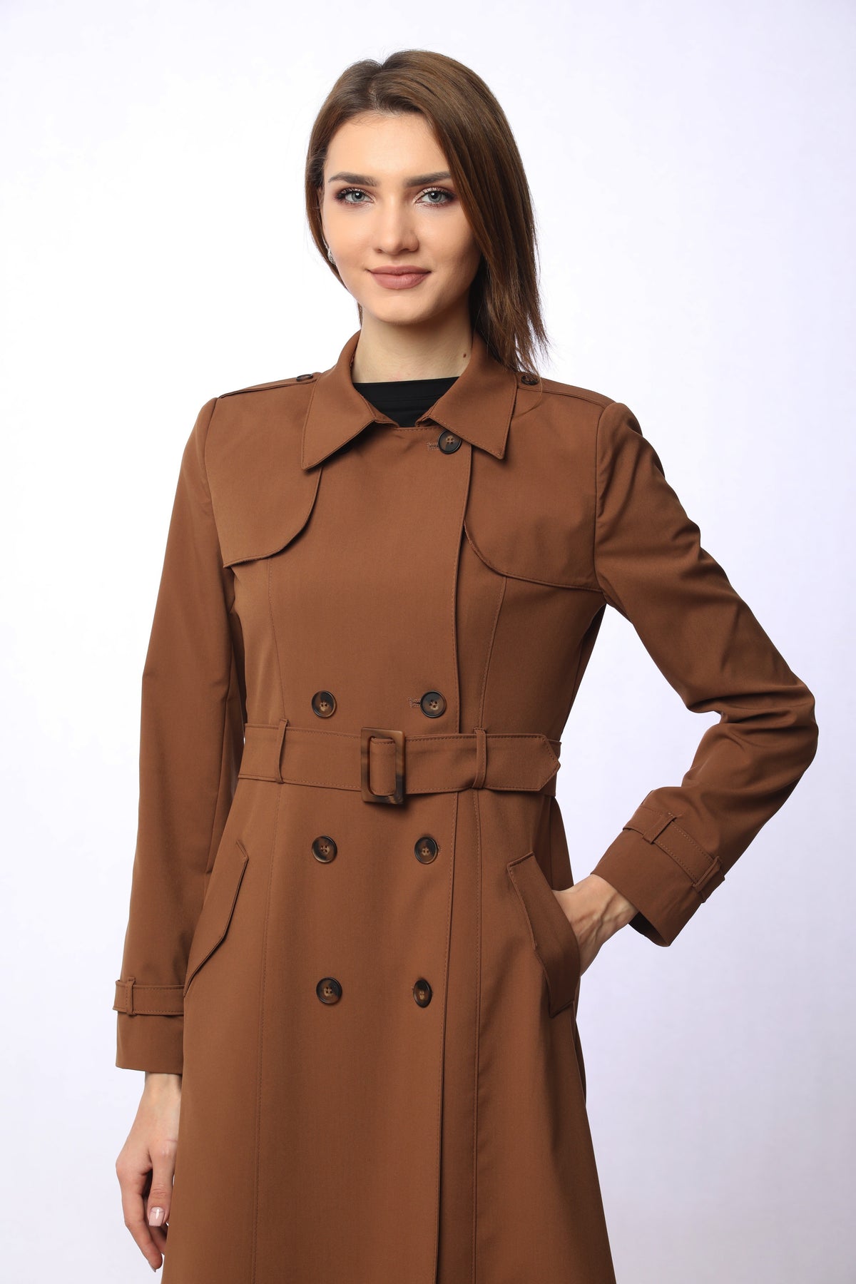 With its refined details and modern design, the polo collar trench coat with epaulet and belt details will be one of the standout pieces in your wardrobe. The polo collar gives it a classic touch, while the epaulet detail on the shoulders and the matching belt bring a contemporary edge. Featuring 8 asymmetric buttons on the front and 2 practical pockets, it is both stylish and functional. The belt buckle harmonizing with the buttons adds to its elegant appeal.