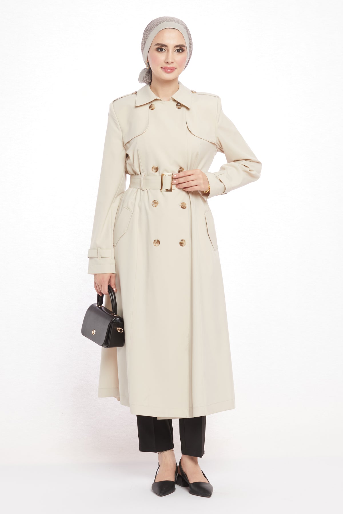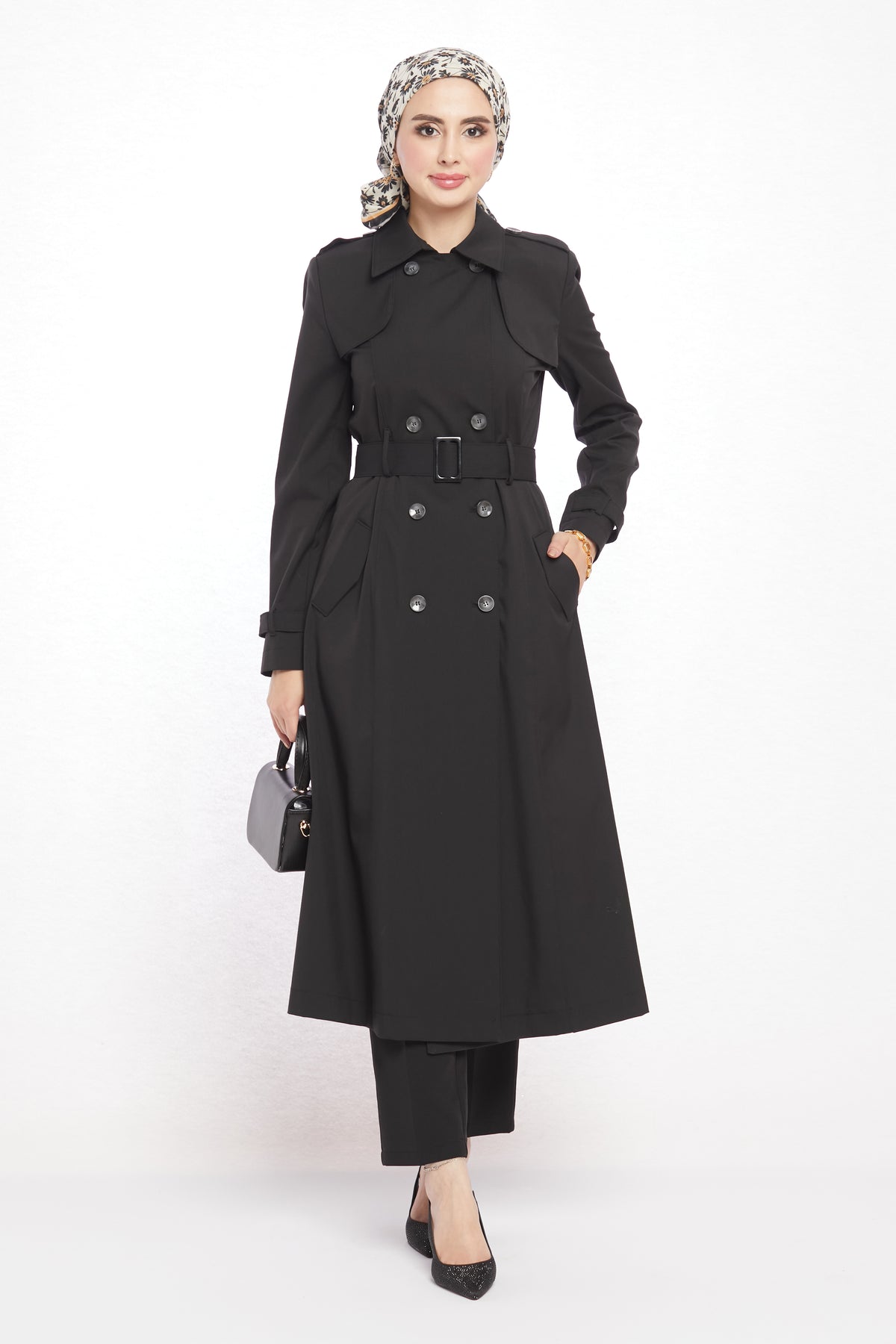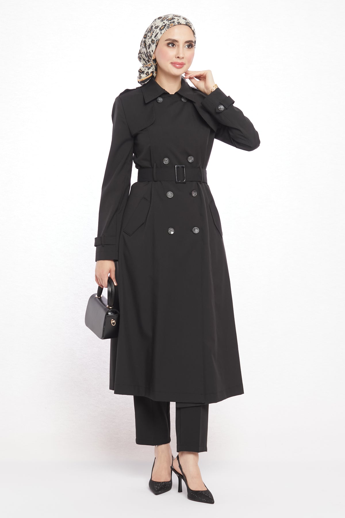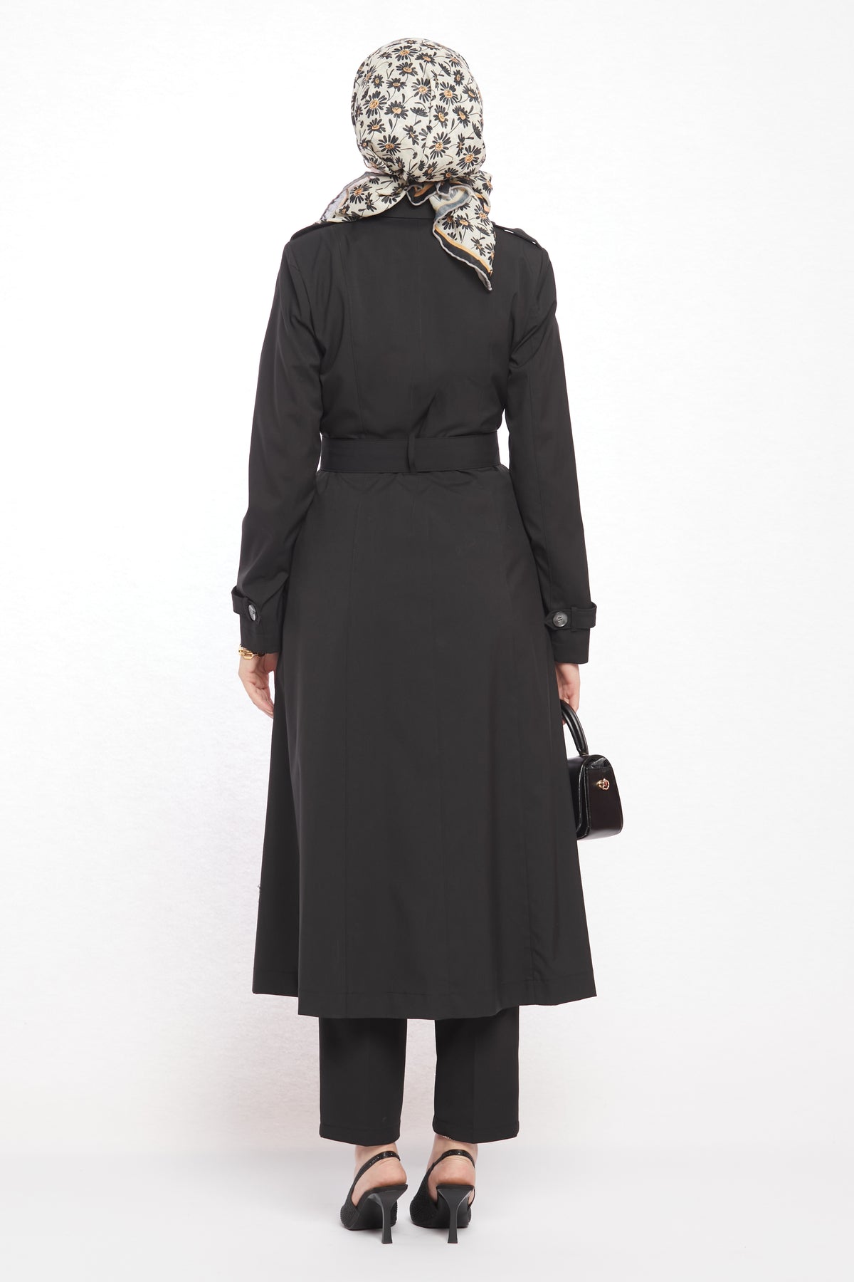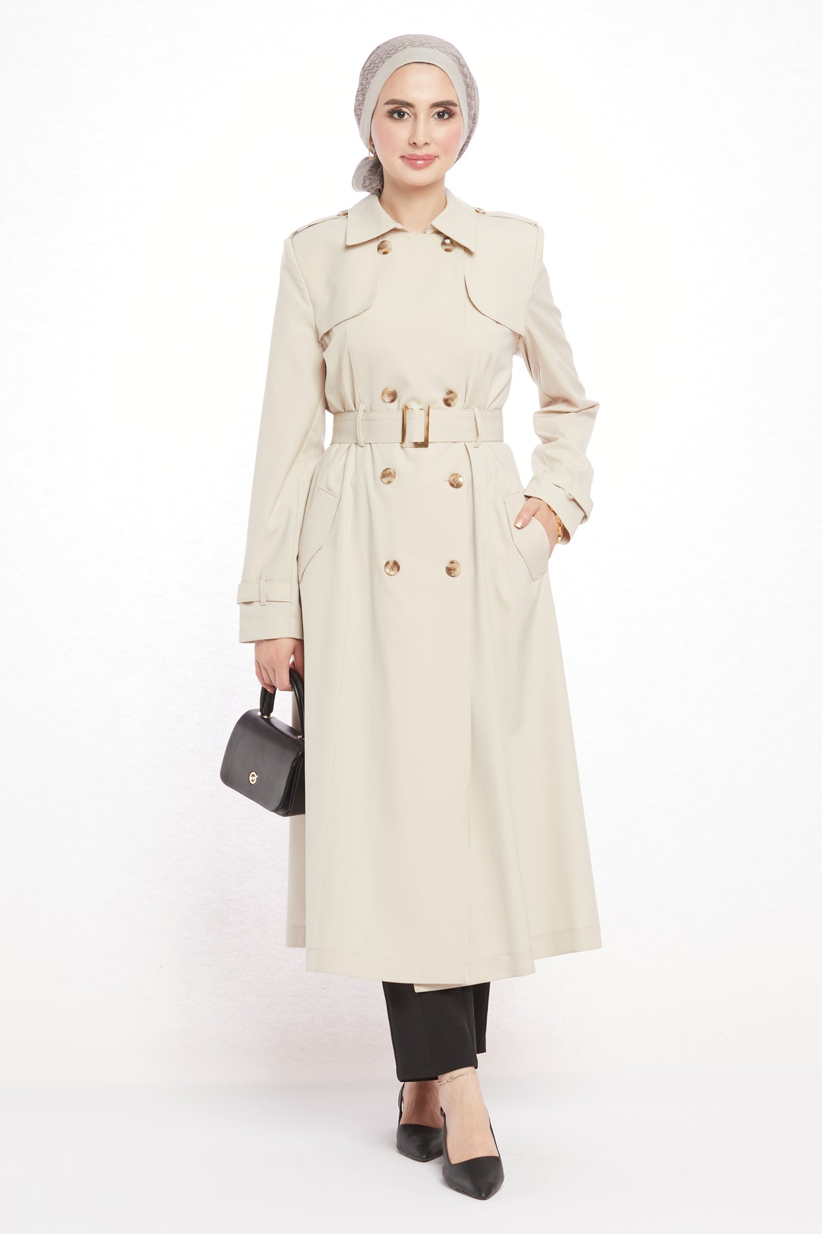 With its refined details and modern design, the polo collar trench coat with epaulet and belt details will be one of the standout pieces in your wardrobe. The polo collar gives it a classic touch, while the epaulet detail on the shoulders and the matching belt bring a contemporary edge. Featuring 8 asymmetric buttons on the front and 2 practical pockets, it is both stylish and functional. The belt buckle harmonizing with the buttons adds to its elegant appeal.
