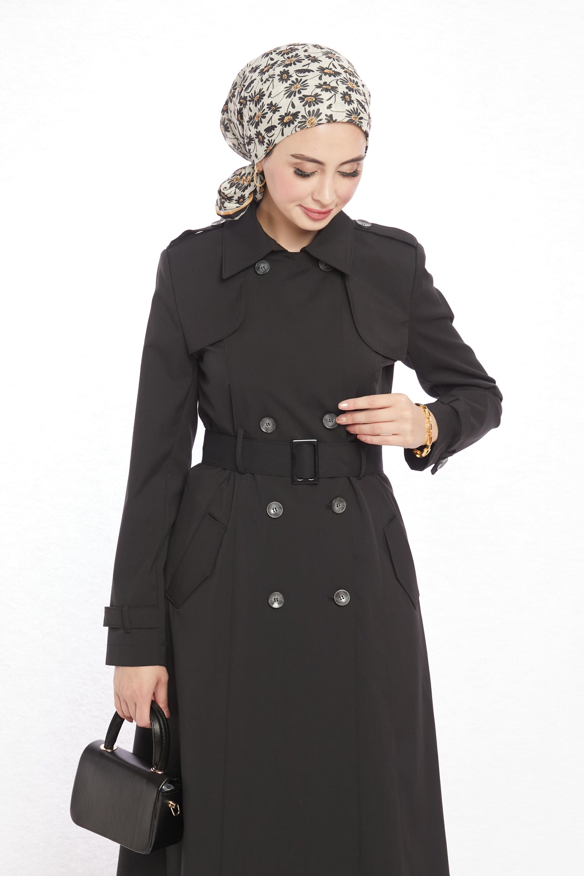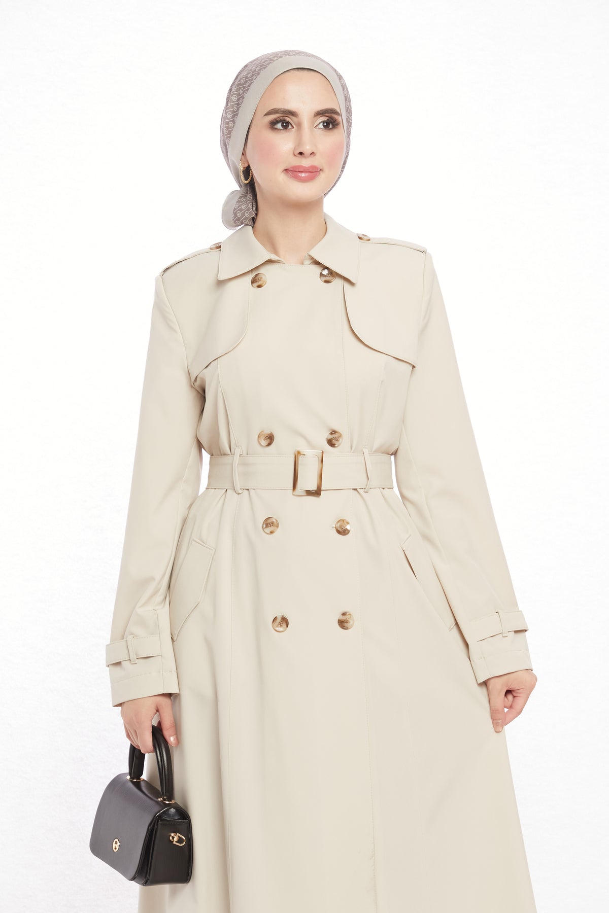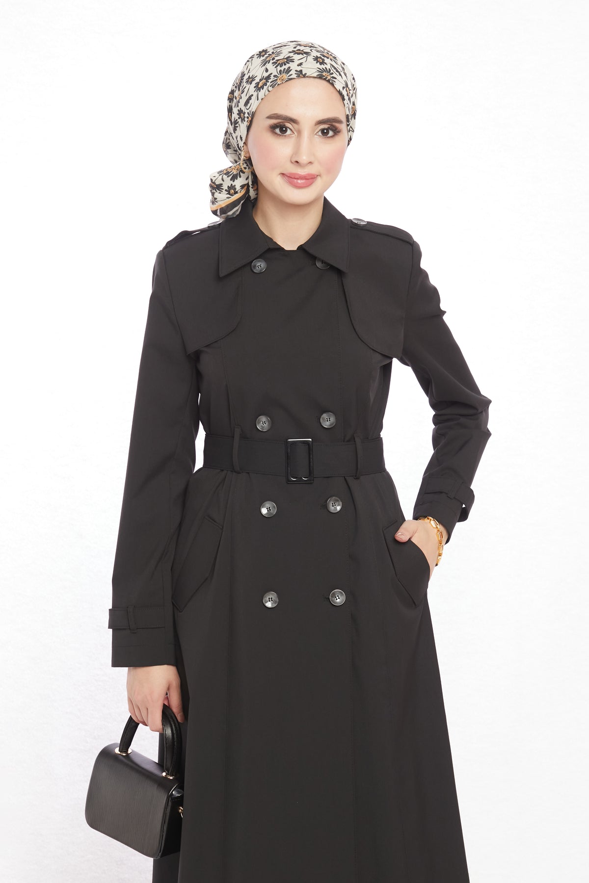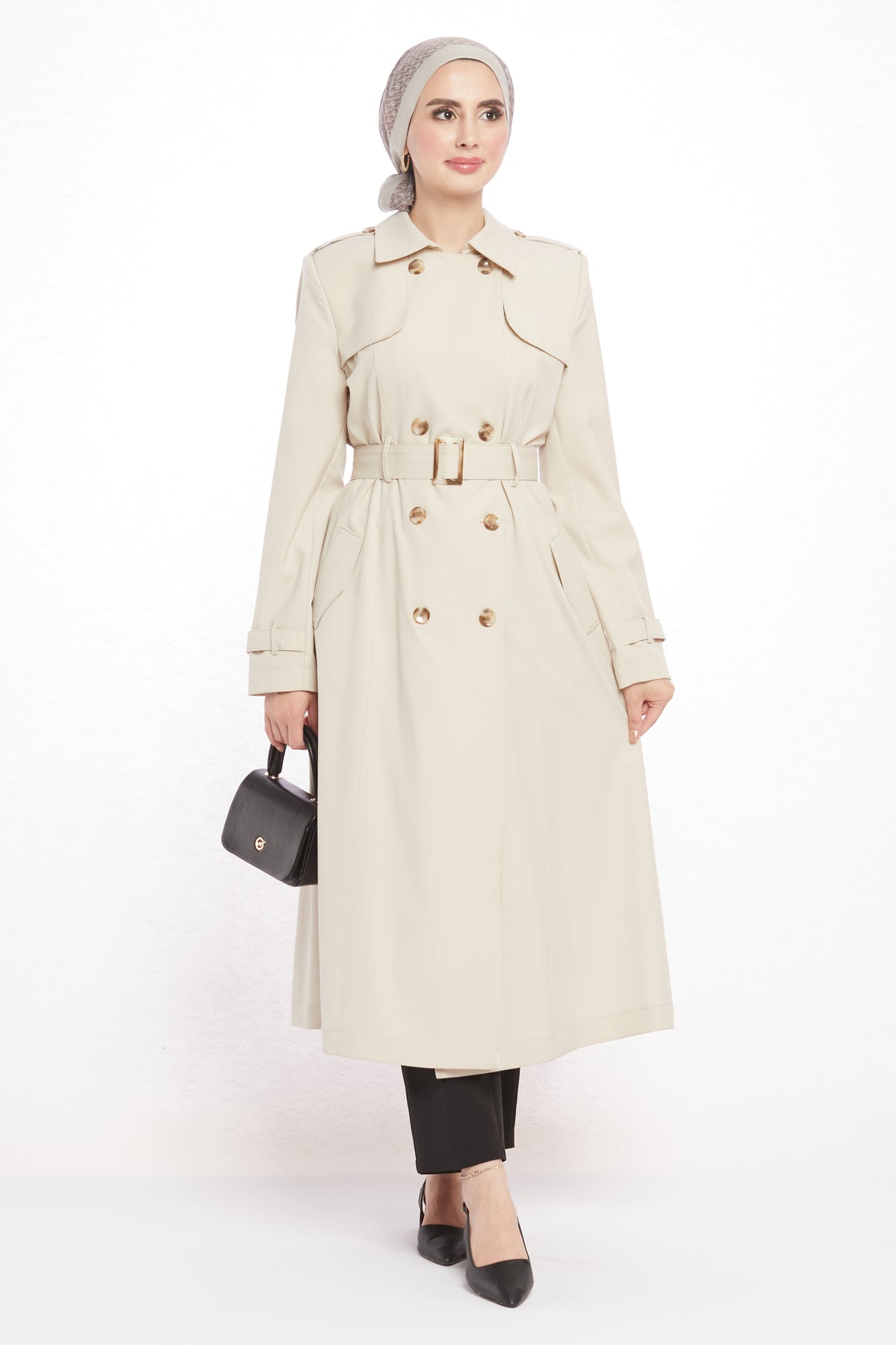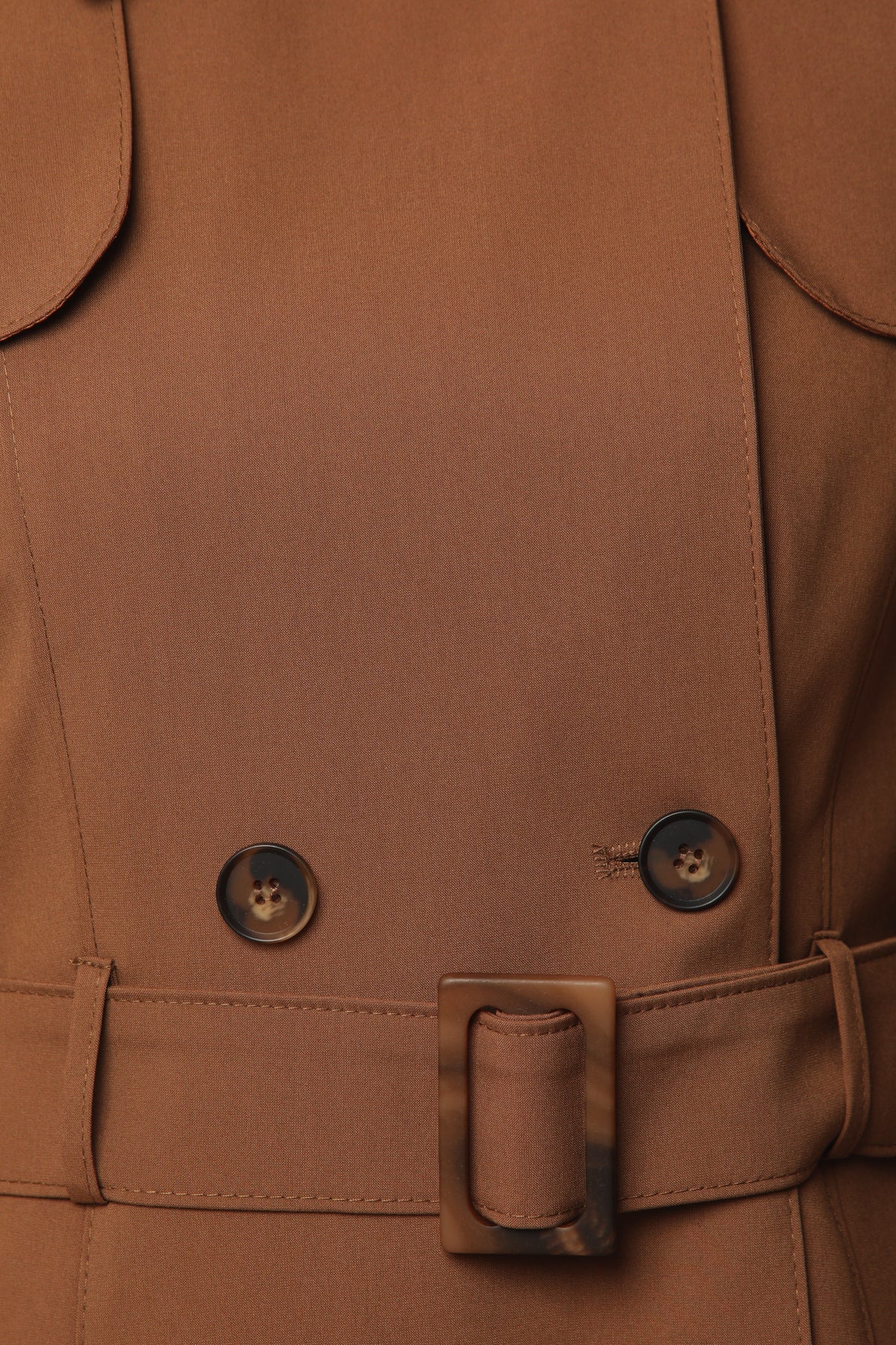 Detail: Epaulet shoulders, belt with matching buckle, 8 asymmetric buttons, 2 pockets
