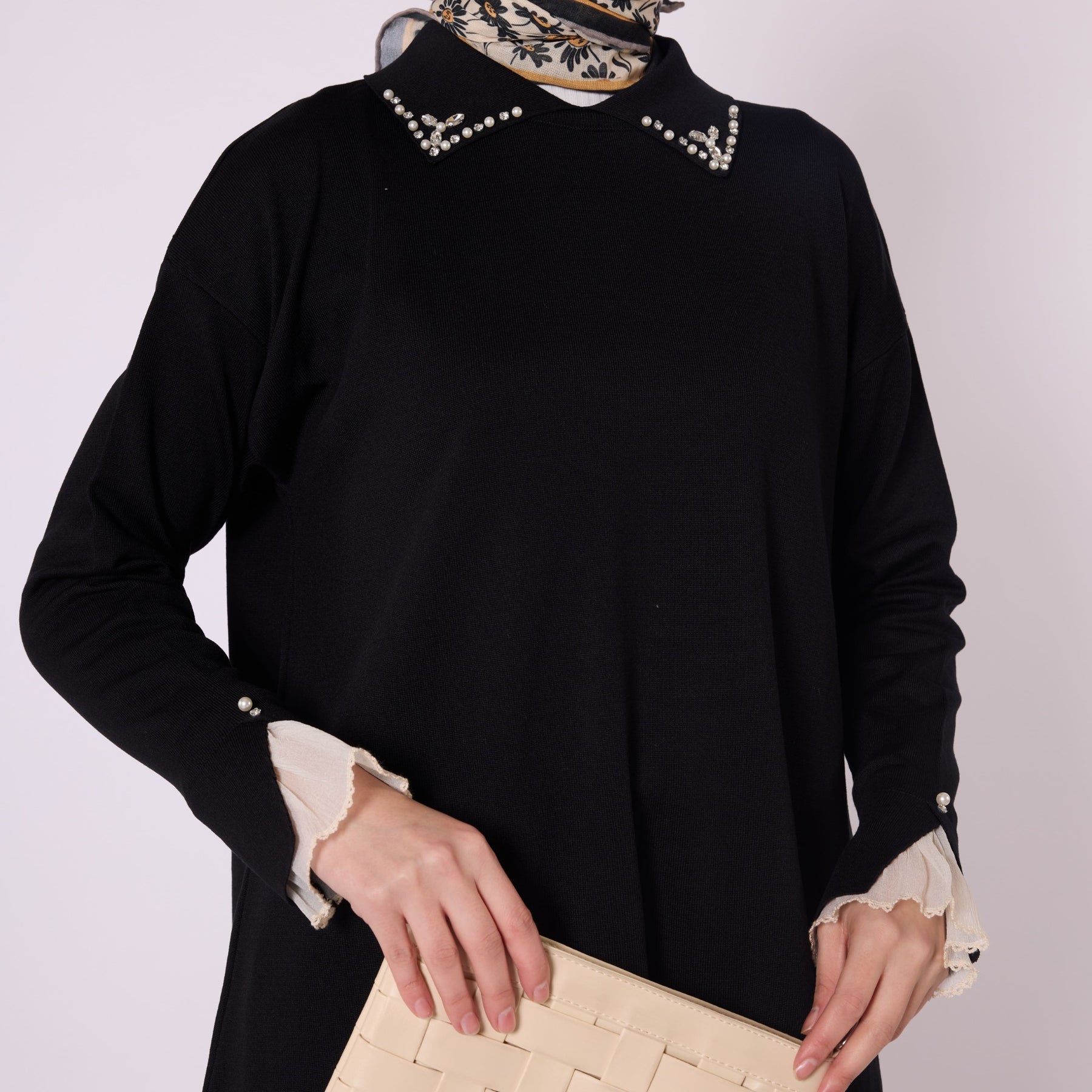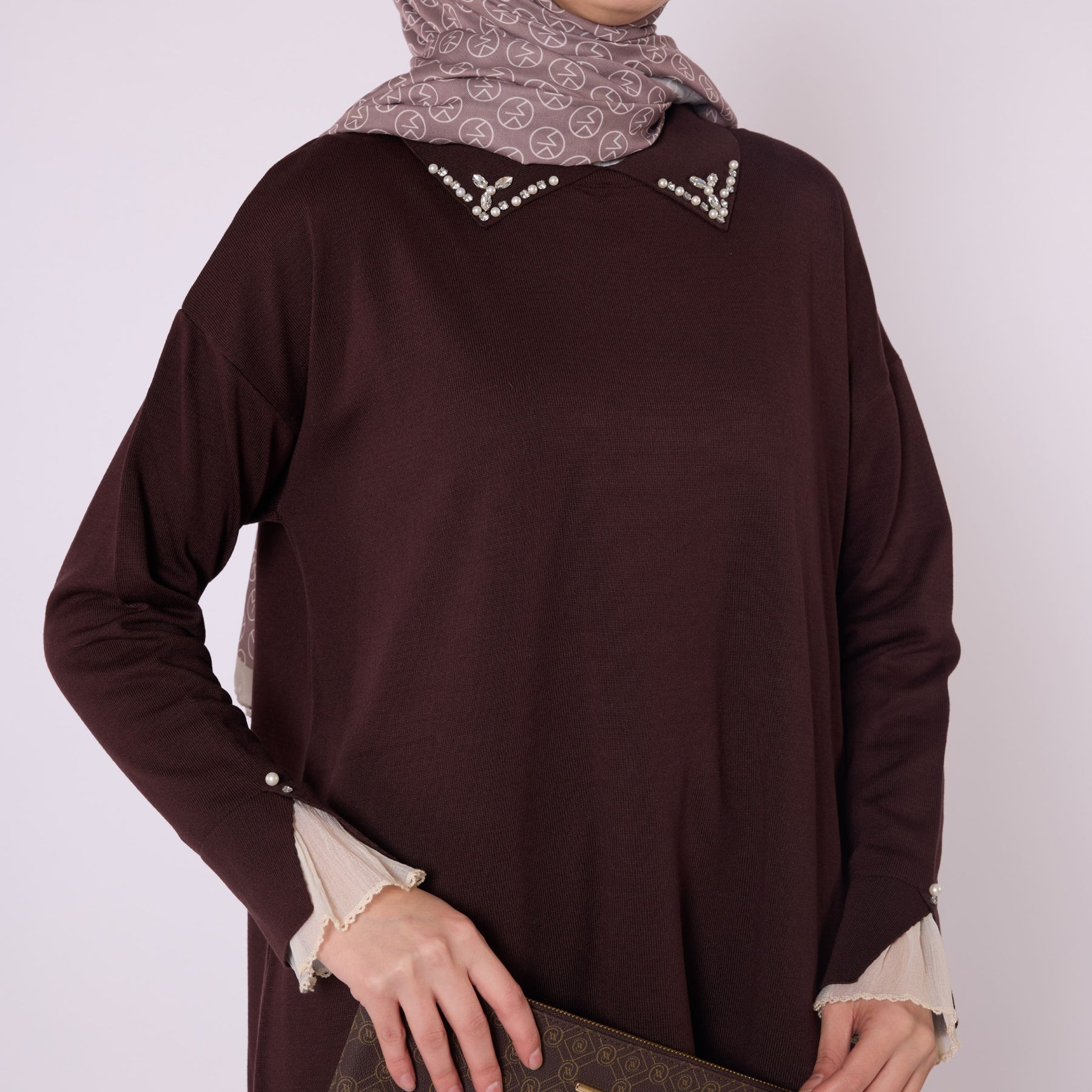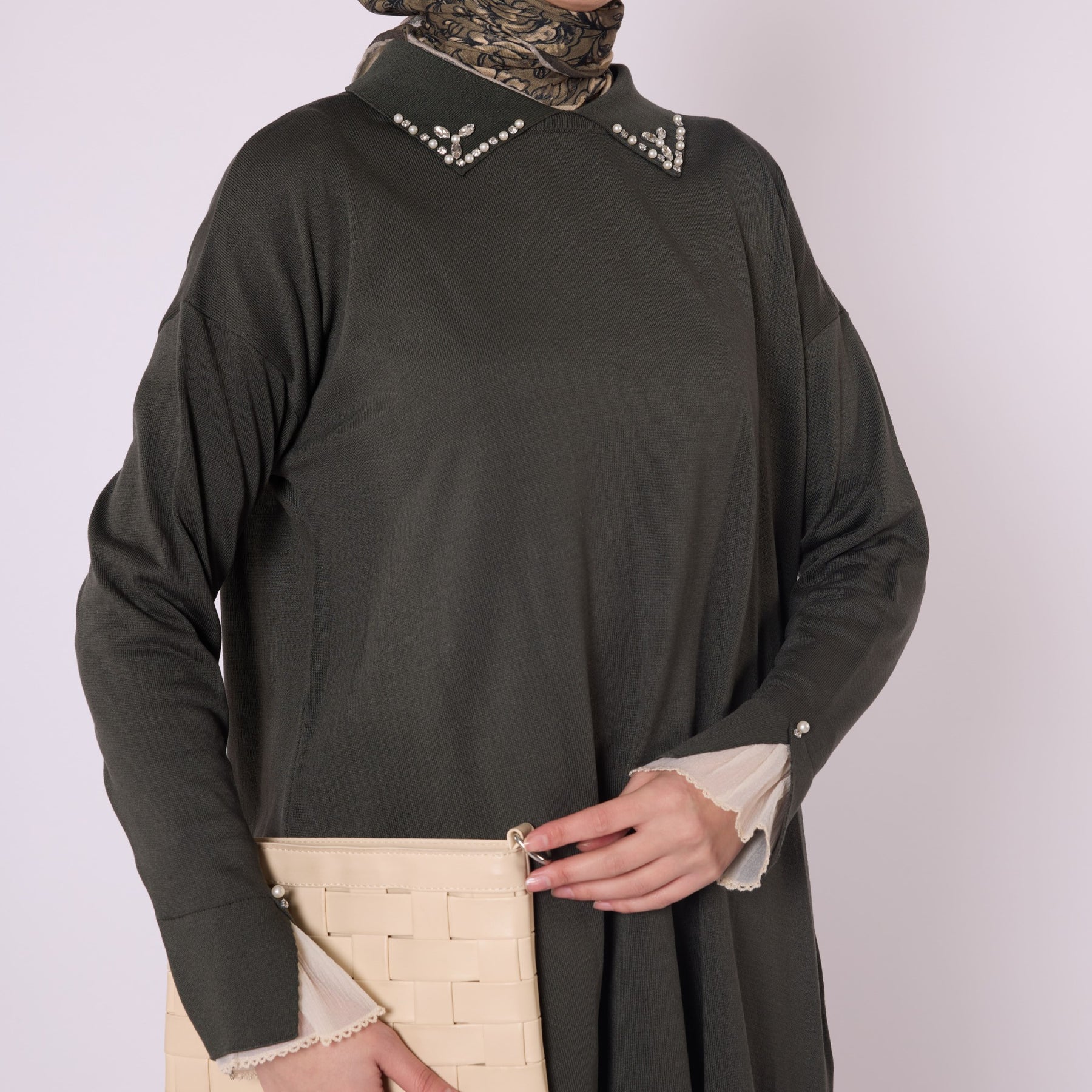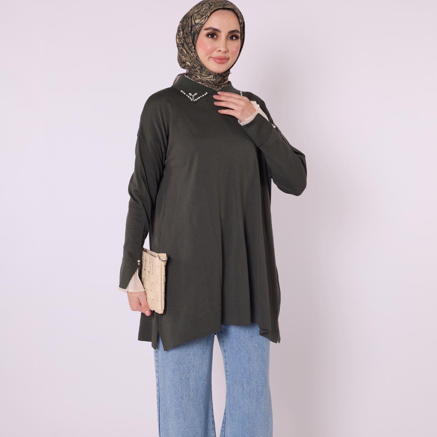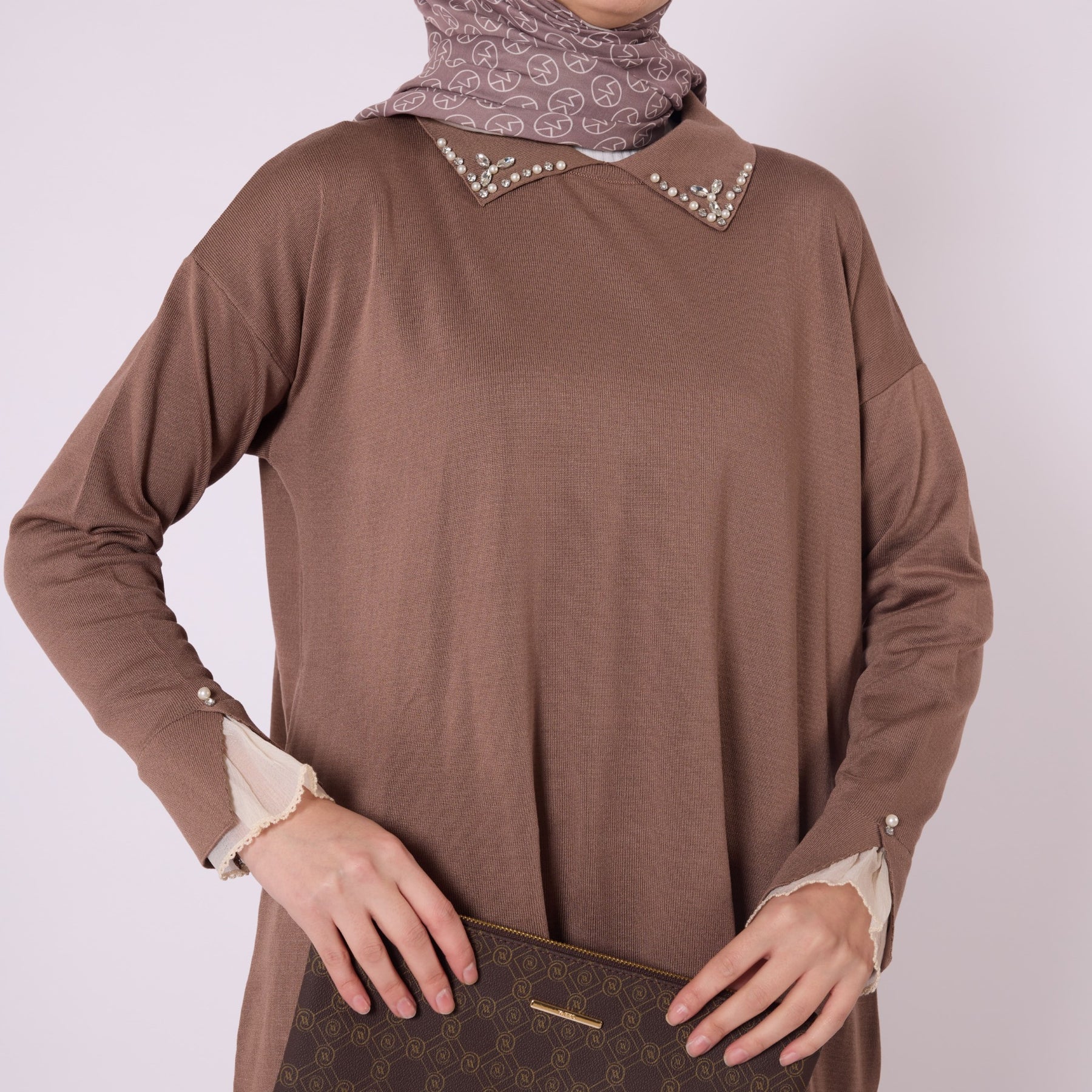 Featuring elegant stone and bead embellishments, this polo collar knit tunic offers a modern and refined look for everyday wear. Its soft-touch fabric, made from 90% viscose and 10% polyester, ensures comfort throughout the day. The slit and sheer tulle detail on the sleeve add a feminine and sophisticated touch. Available in versatile color options such as khaki, brown, navy, light brown and black, making it easy to pair with various bottoms.
