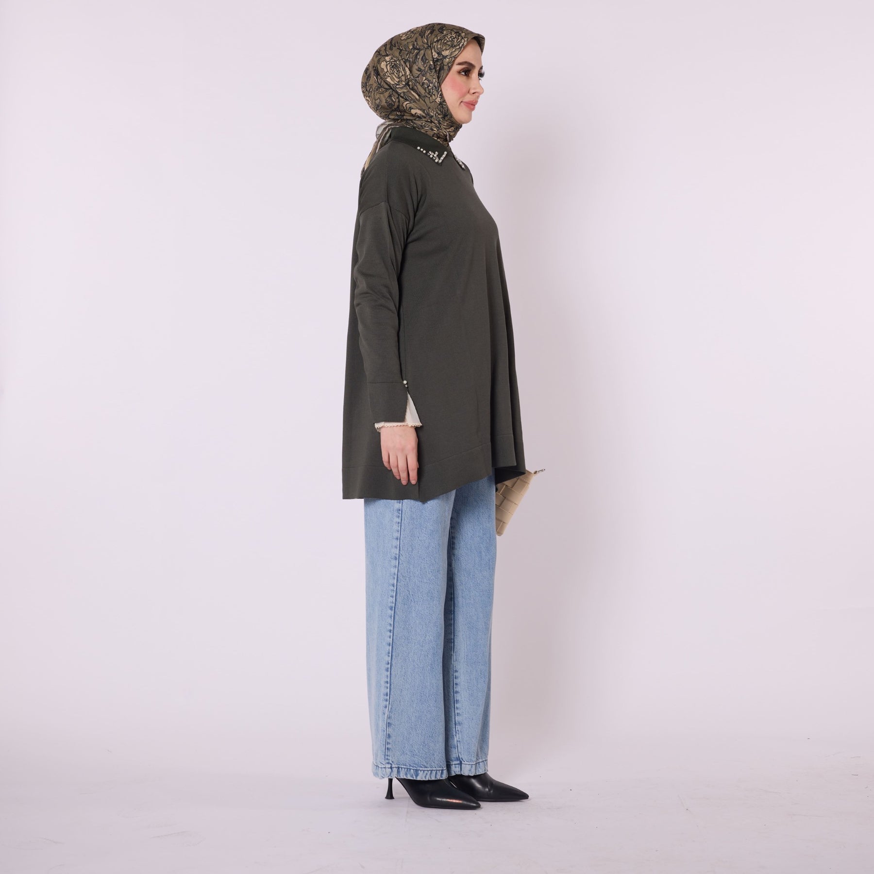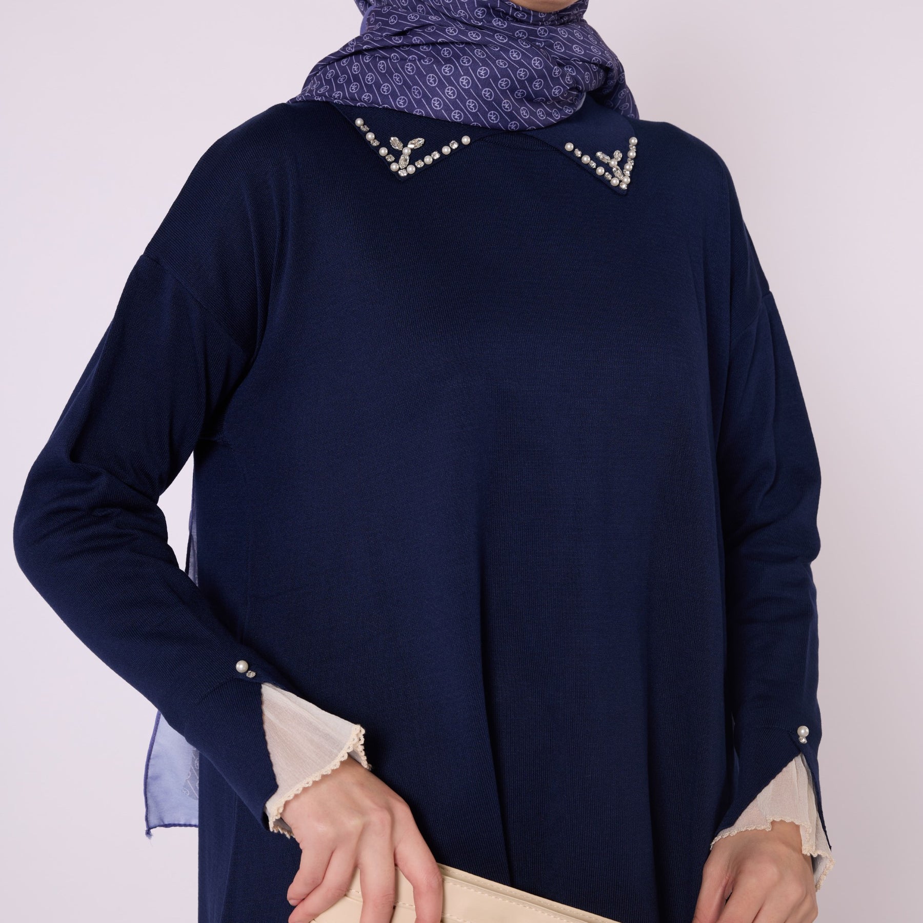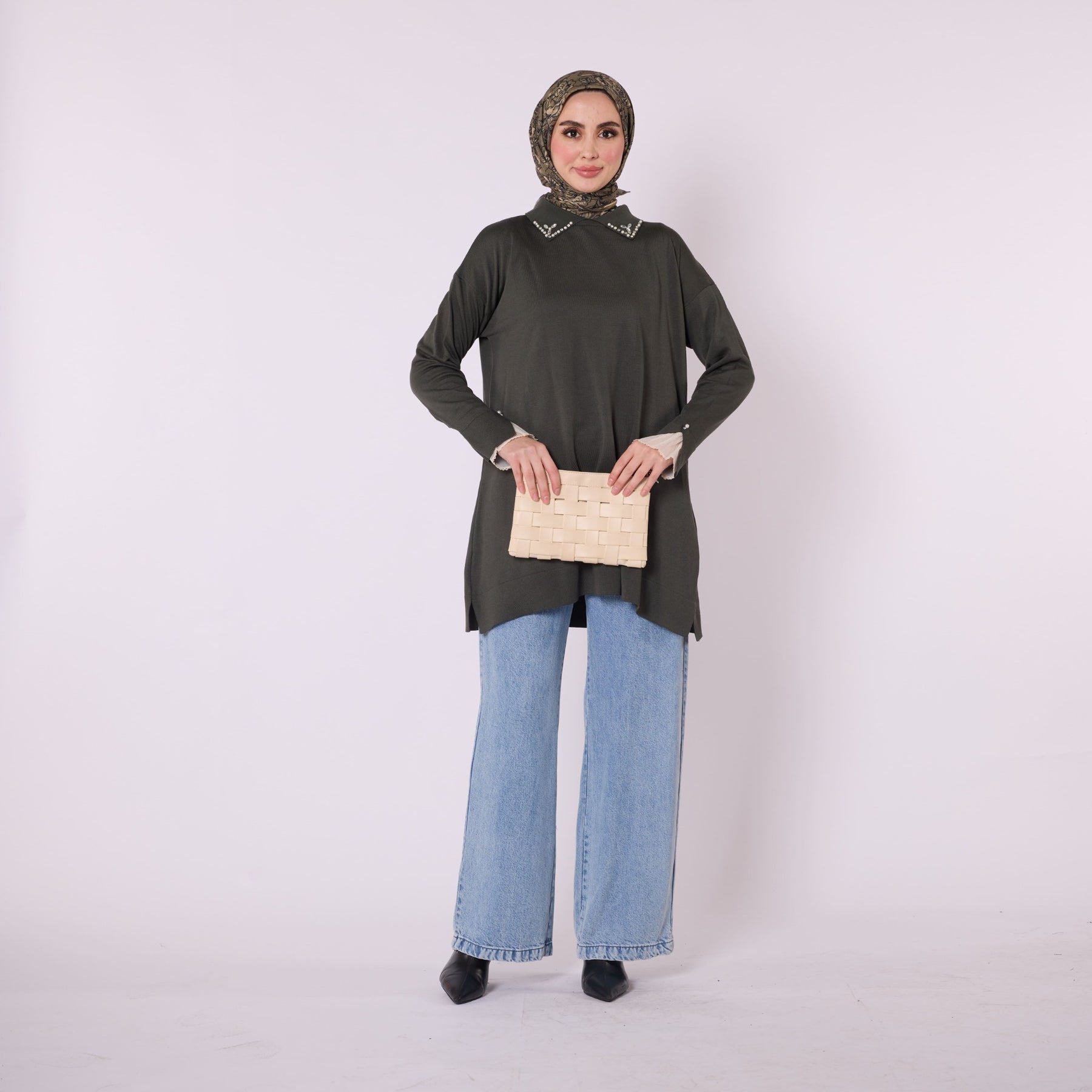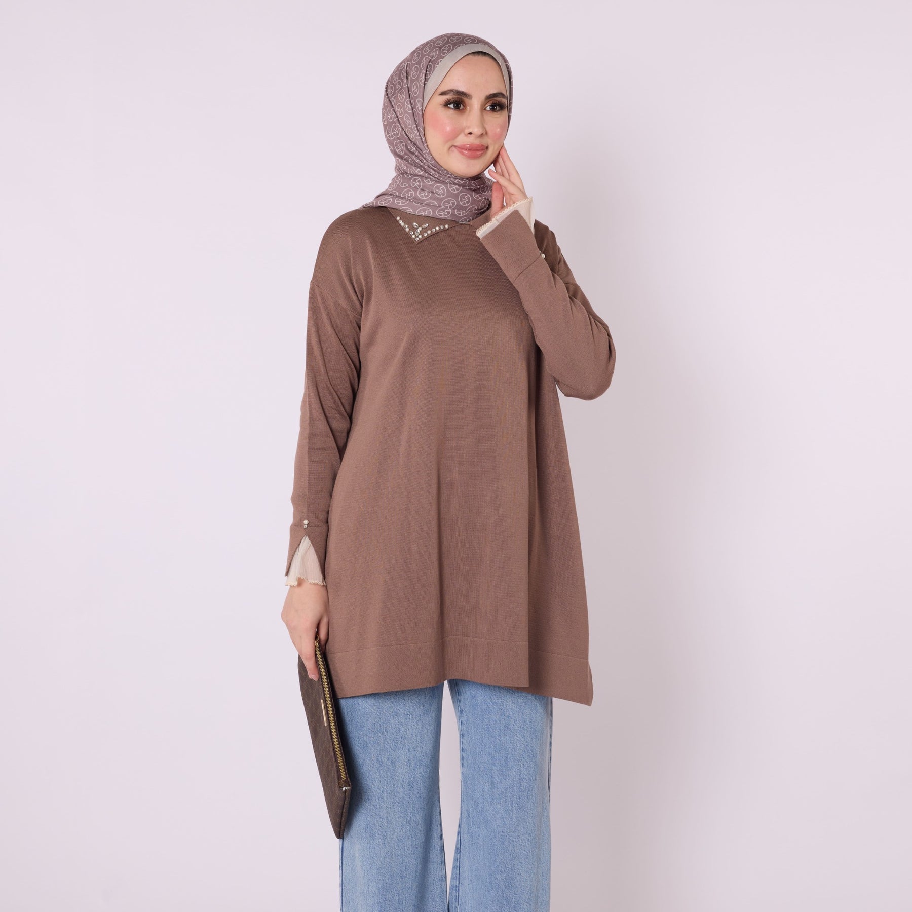 Featuring elegant stone and bead embellishments, this polo collar knit tunic offers a modern and refined look for everyday wear. Its soft-touch fabric, made from 90% viscose and 10% polyester, ensures comfort throughout the day. The slit and sheer tulle detail on the sleeve add a feminine and sophisticated touch. Available in versatile color options such as khaki, brown, navy, light brown and black, making it easy to pair with various bottoms.