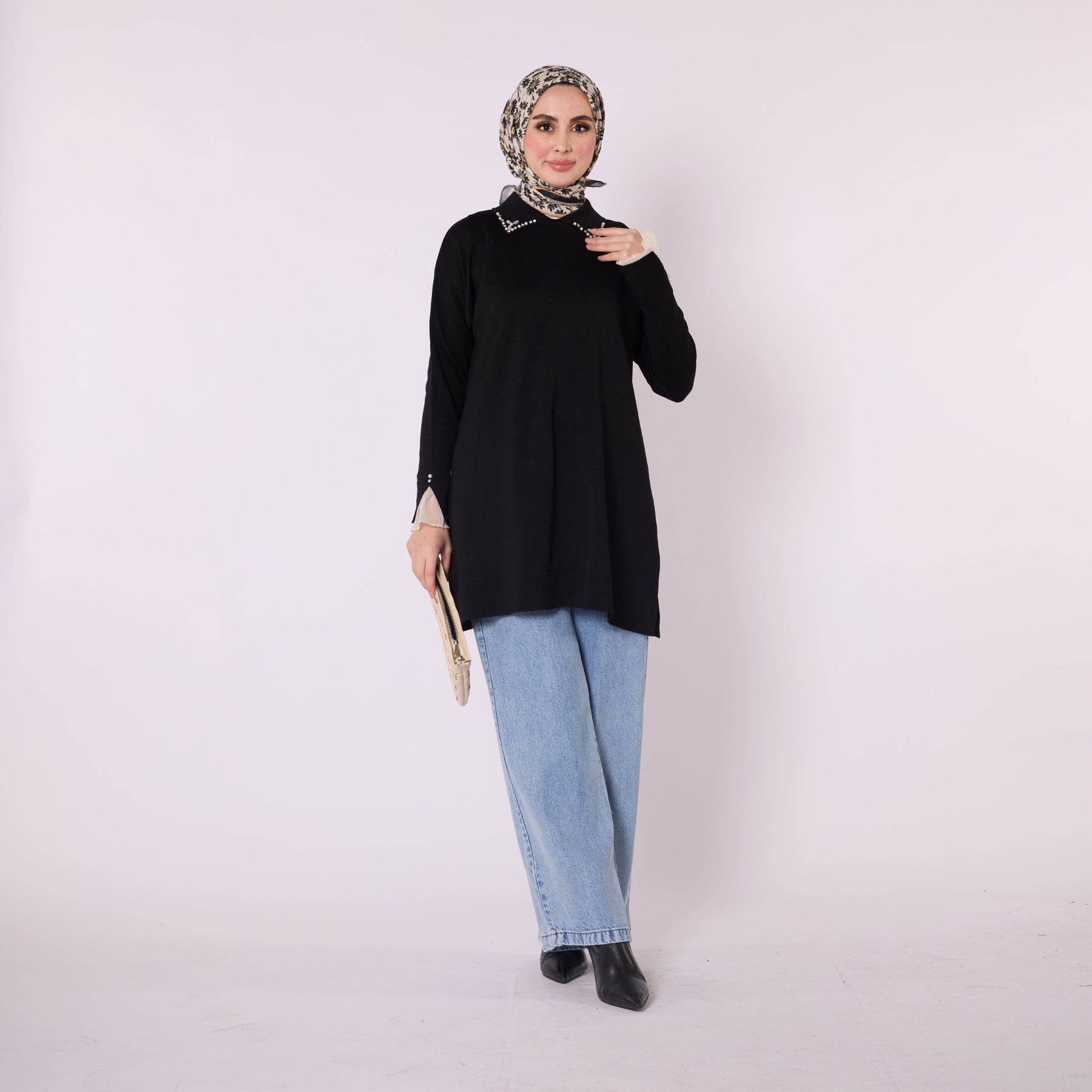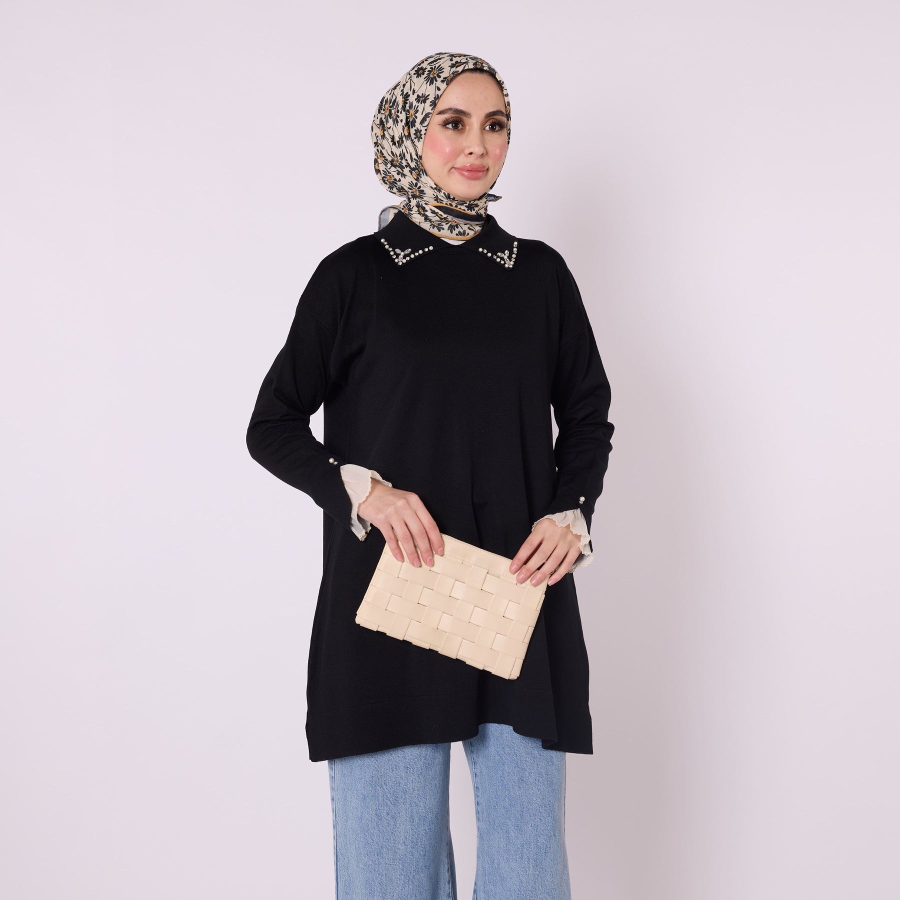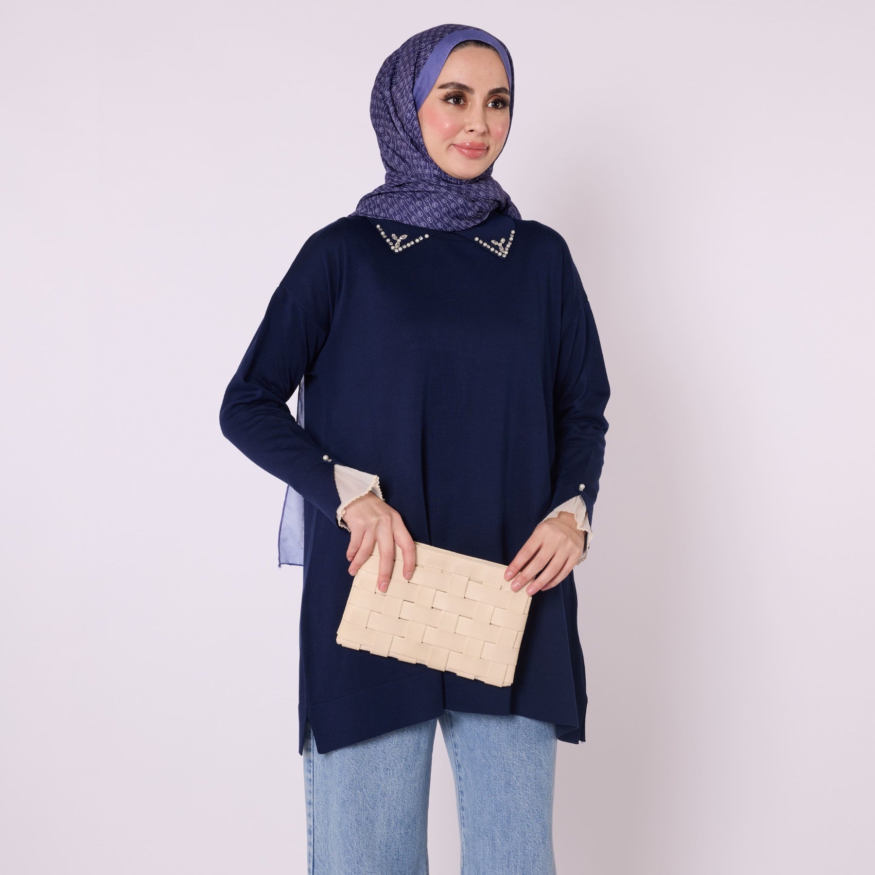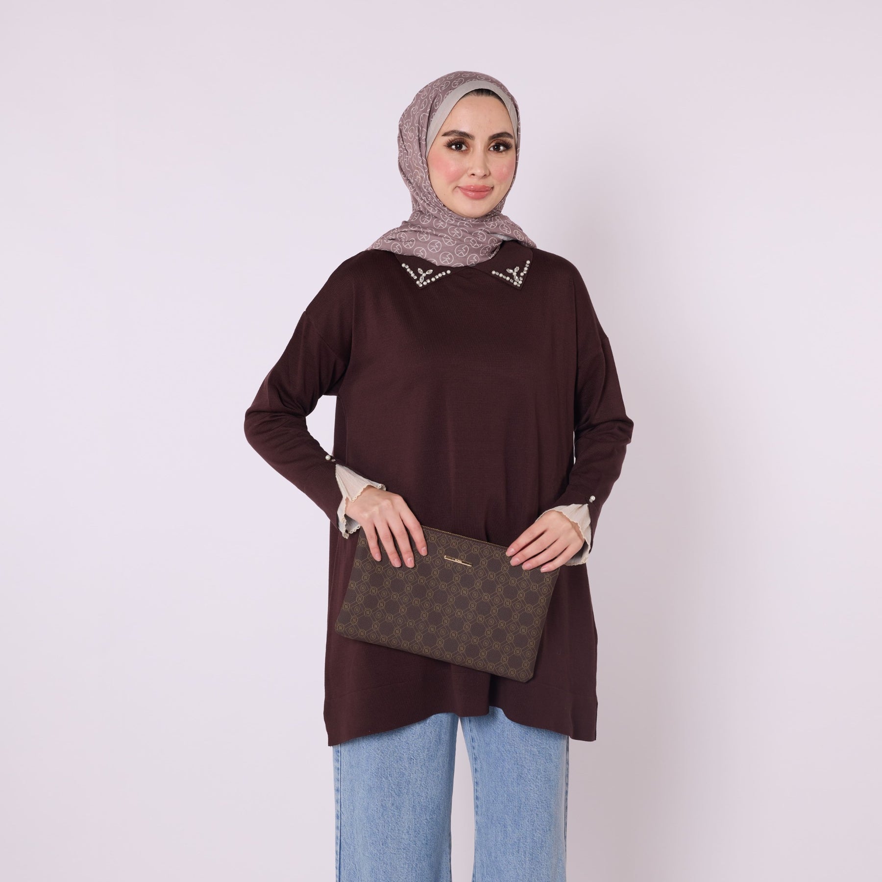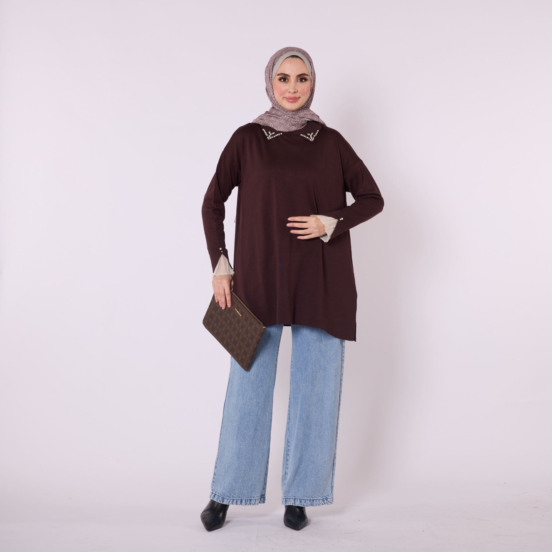 Featuring elegant stone and bead embellishments, this polo collar knit tunic offers a modern and refined look for everyday wear. Its soft-touch fabric, made from 90% viscose and 10% polyester, ensures comfort throughout the day. The slit and sheer tulle detail on the sleeve add a feminine and sophisticated touch. Available in versatile color options such as khaki, brown, navy, light brown and black, making it easy to pair with various bottoms.