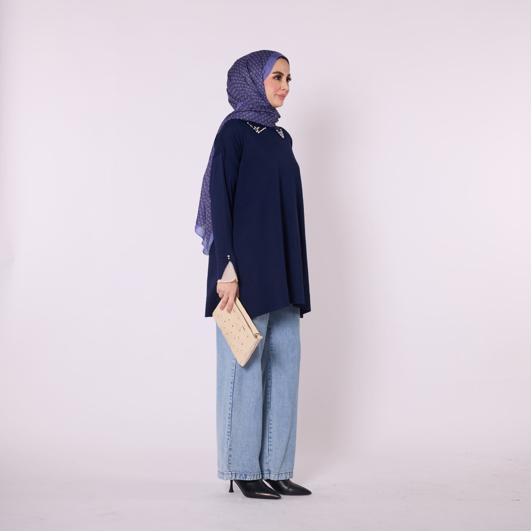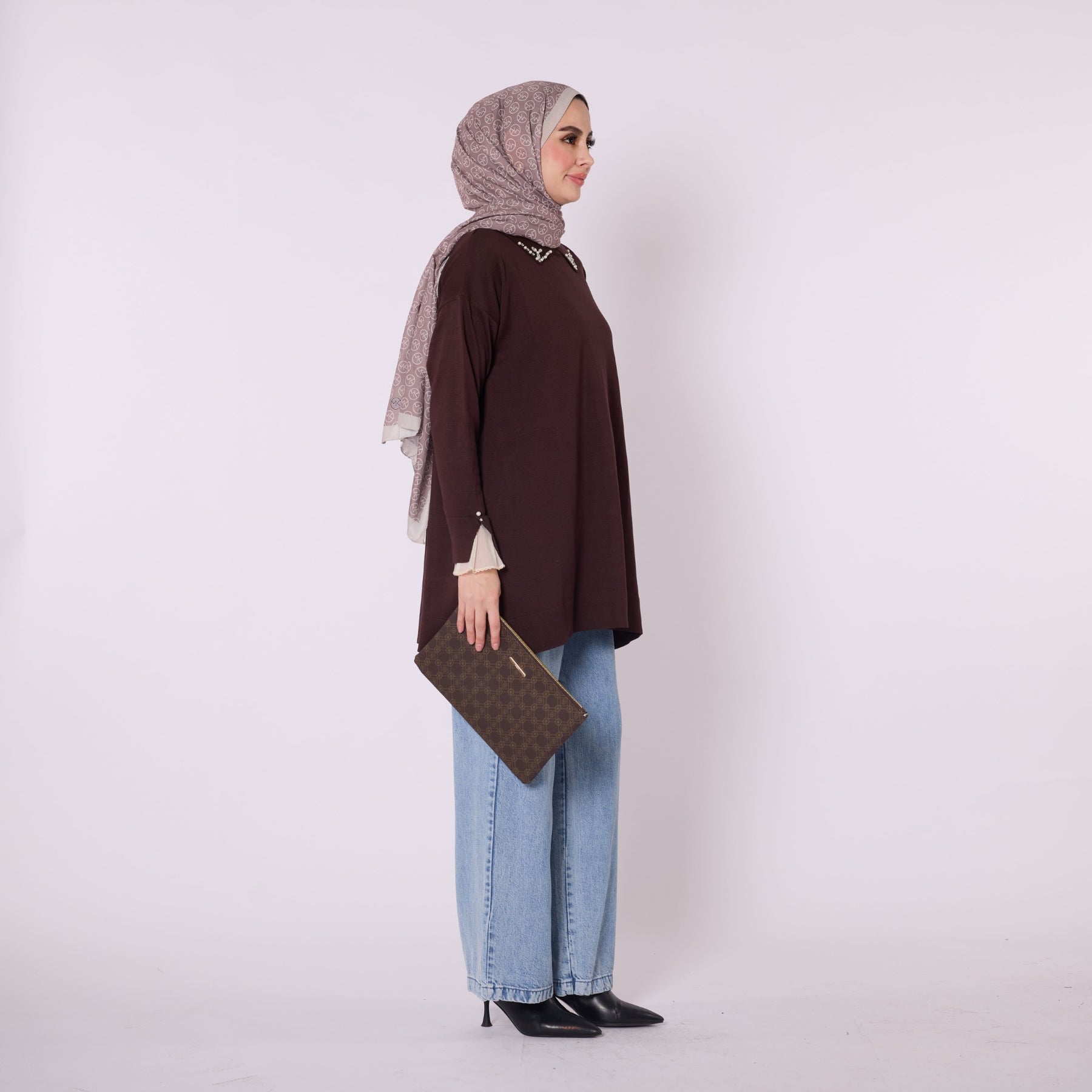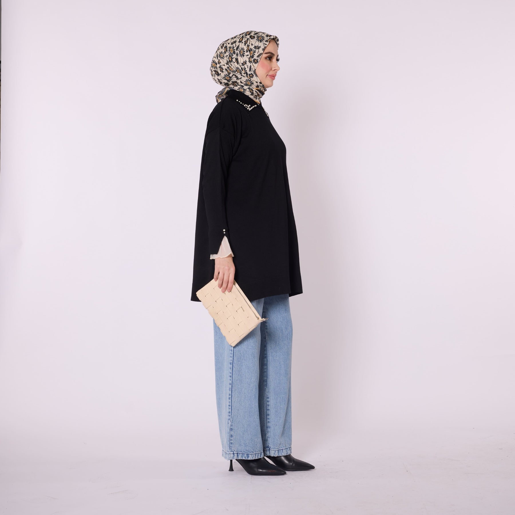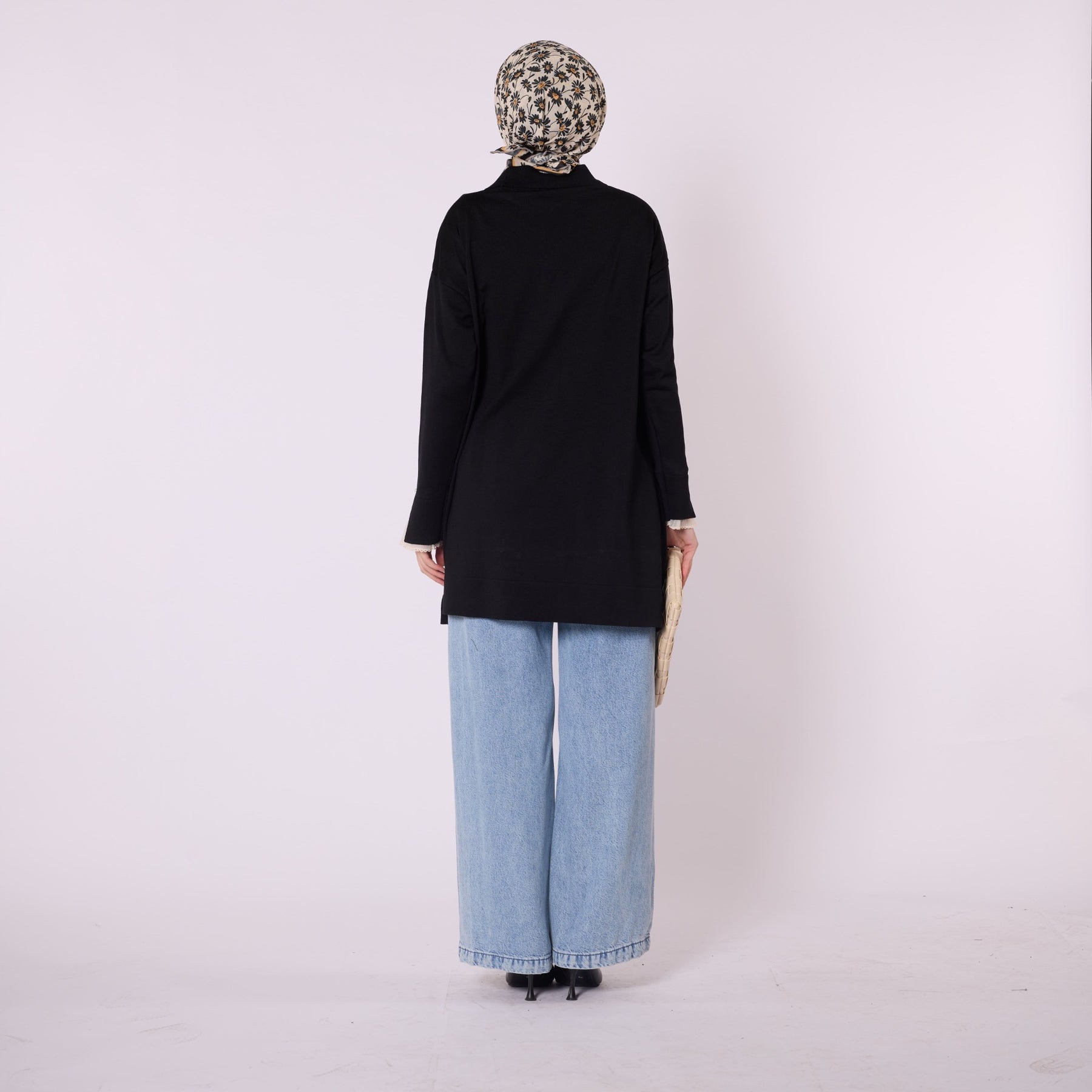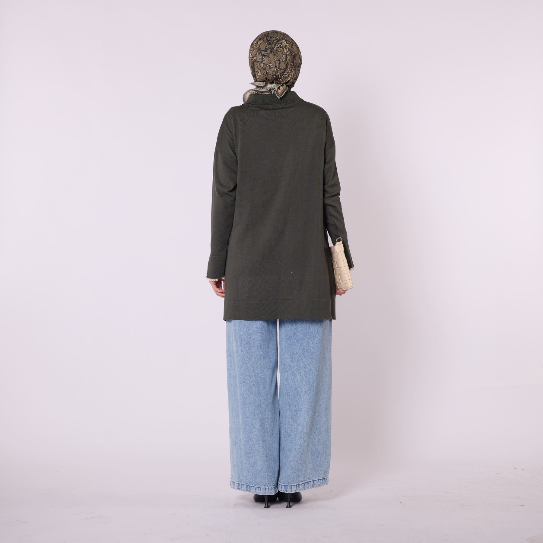 Featuring elegant stone and bead embellishments, this polo collar knit tunic offers a modern and refined look for everyday wear. Its soft-touch fabric, made from 90% viscose and 10% polyester, ensures comfort throughout the day. The slit and sheer tulle detail on the sleeve add a feminine and sophisticated touch. Available in versatile color options such as khaki, brown, navy, light brown and black, making it easy to pair with various bottoms.