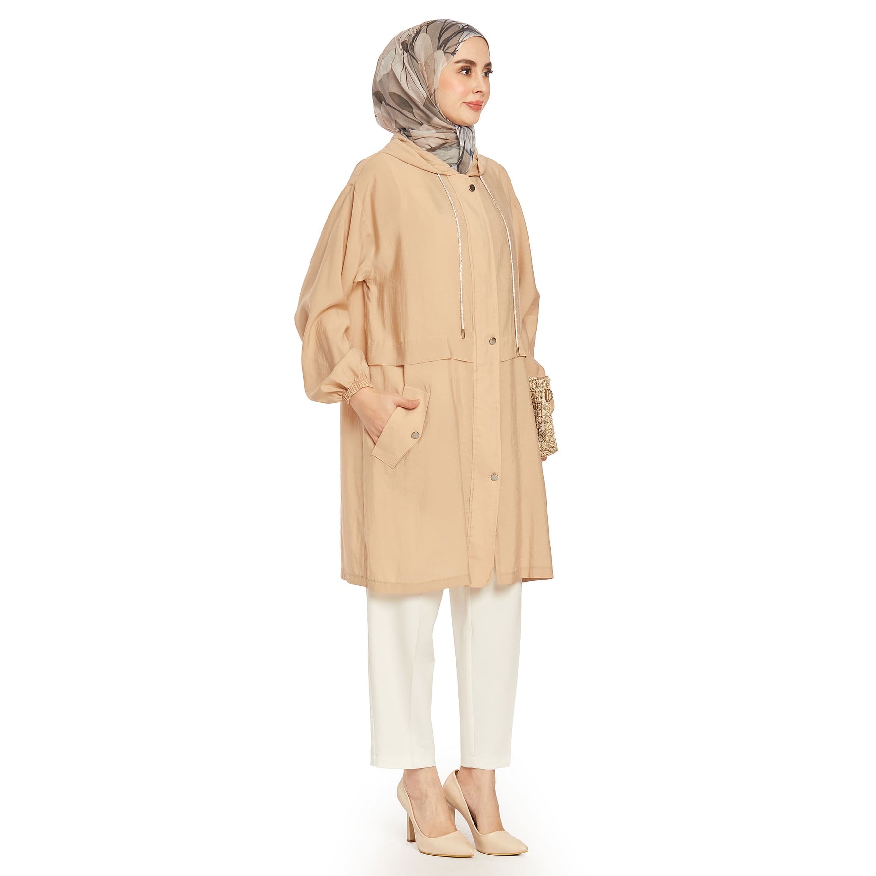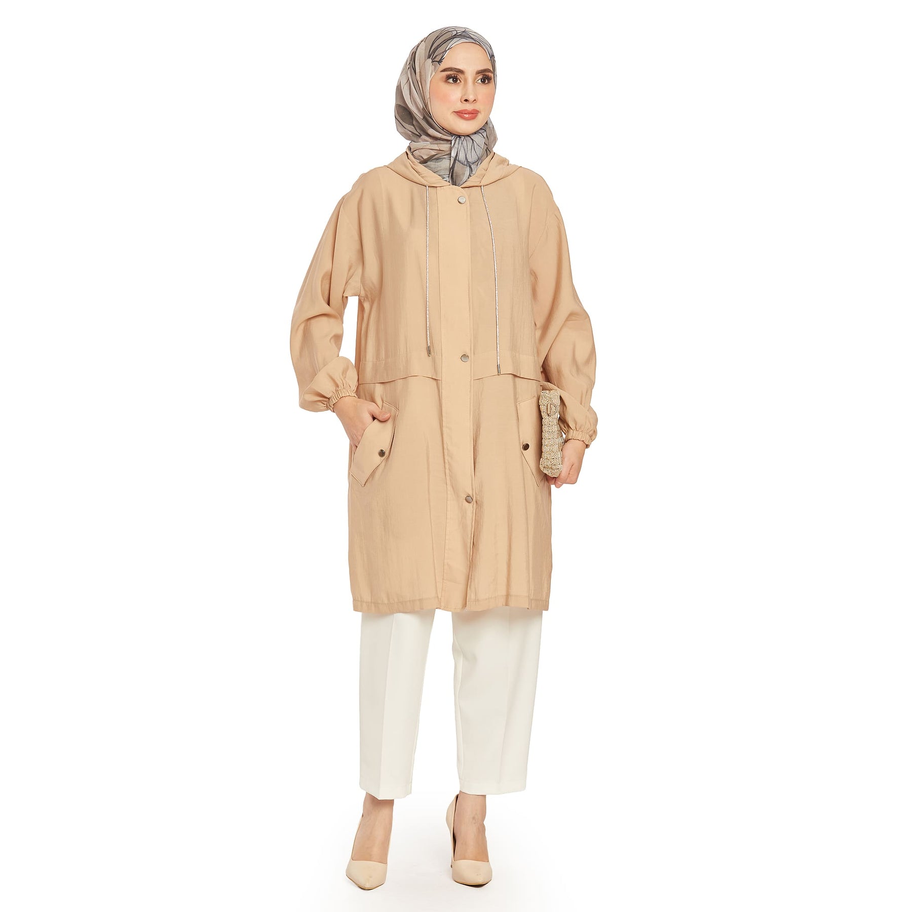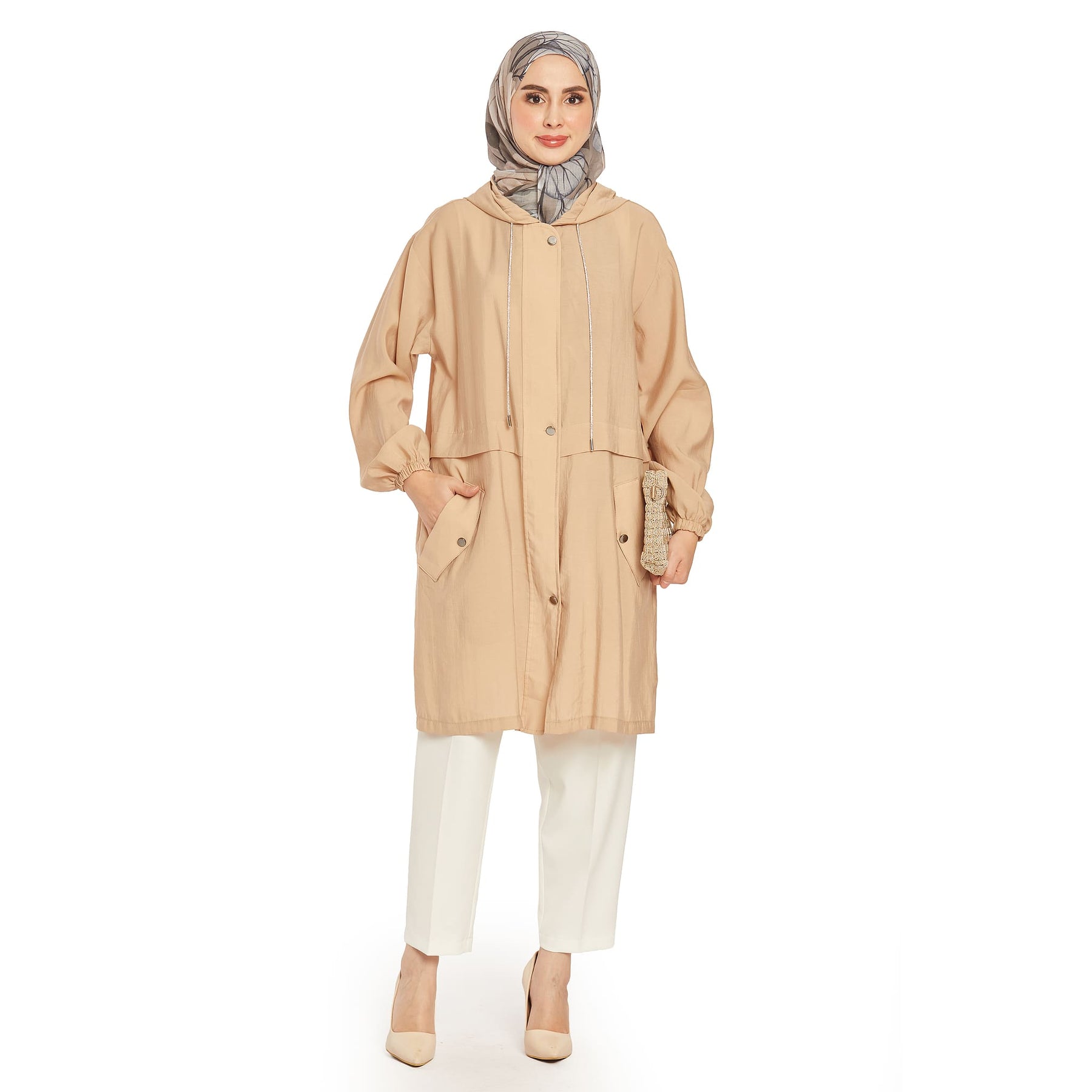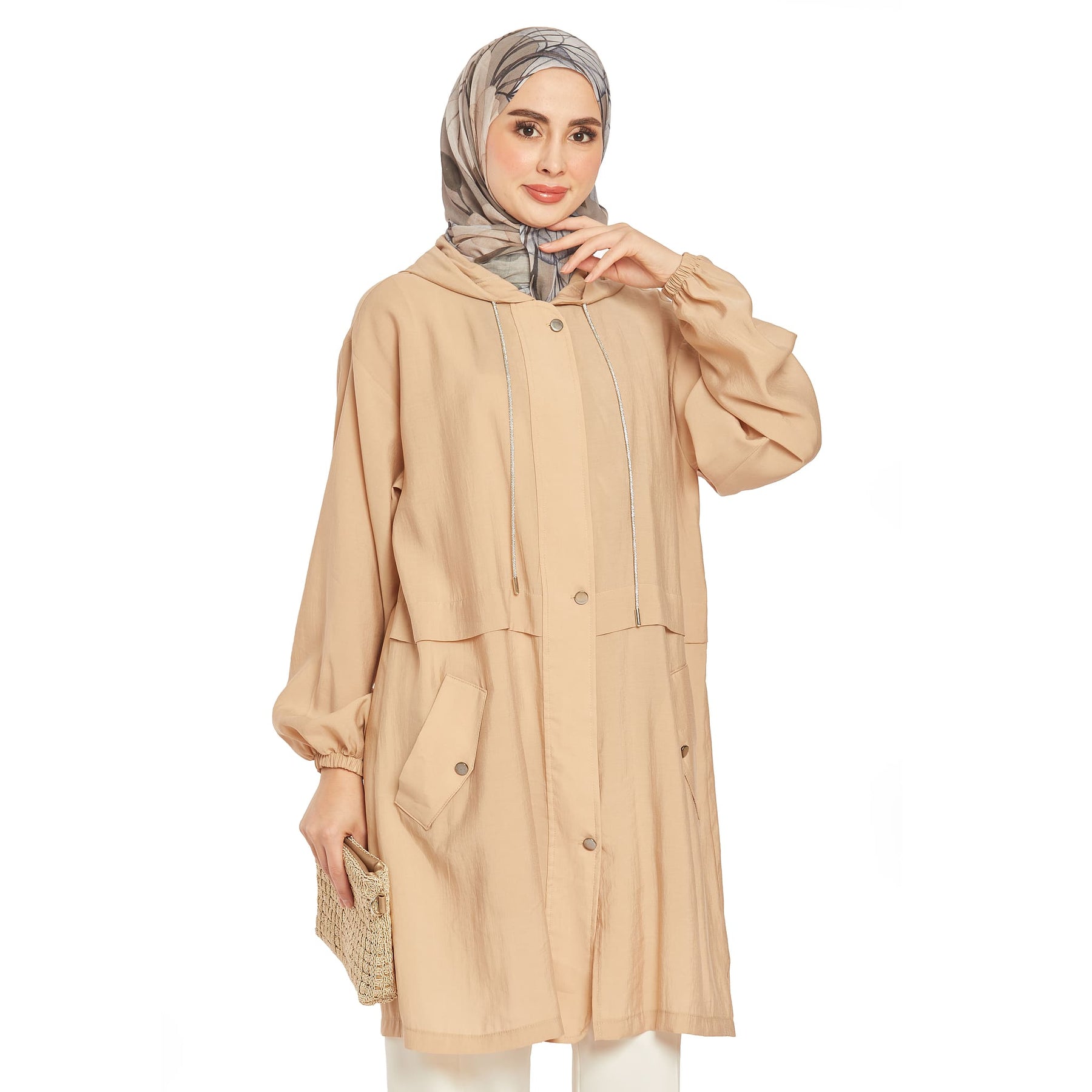 The hooded hidden placket summer coat features a lightweight and airy fabric, perfect for summer wear. The hood’s gathered elastic and stone details add a modern and stylish touch.