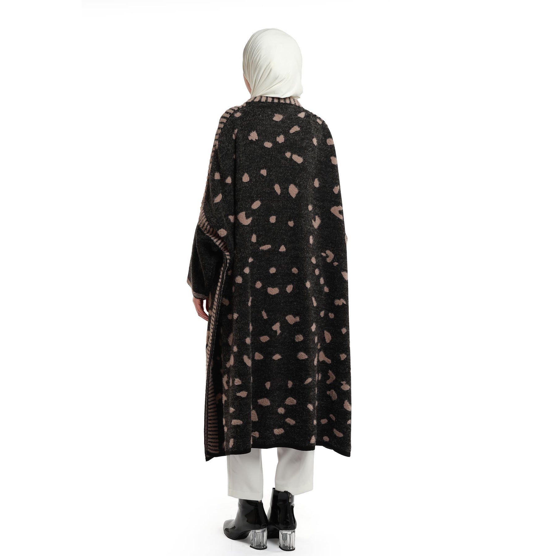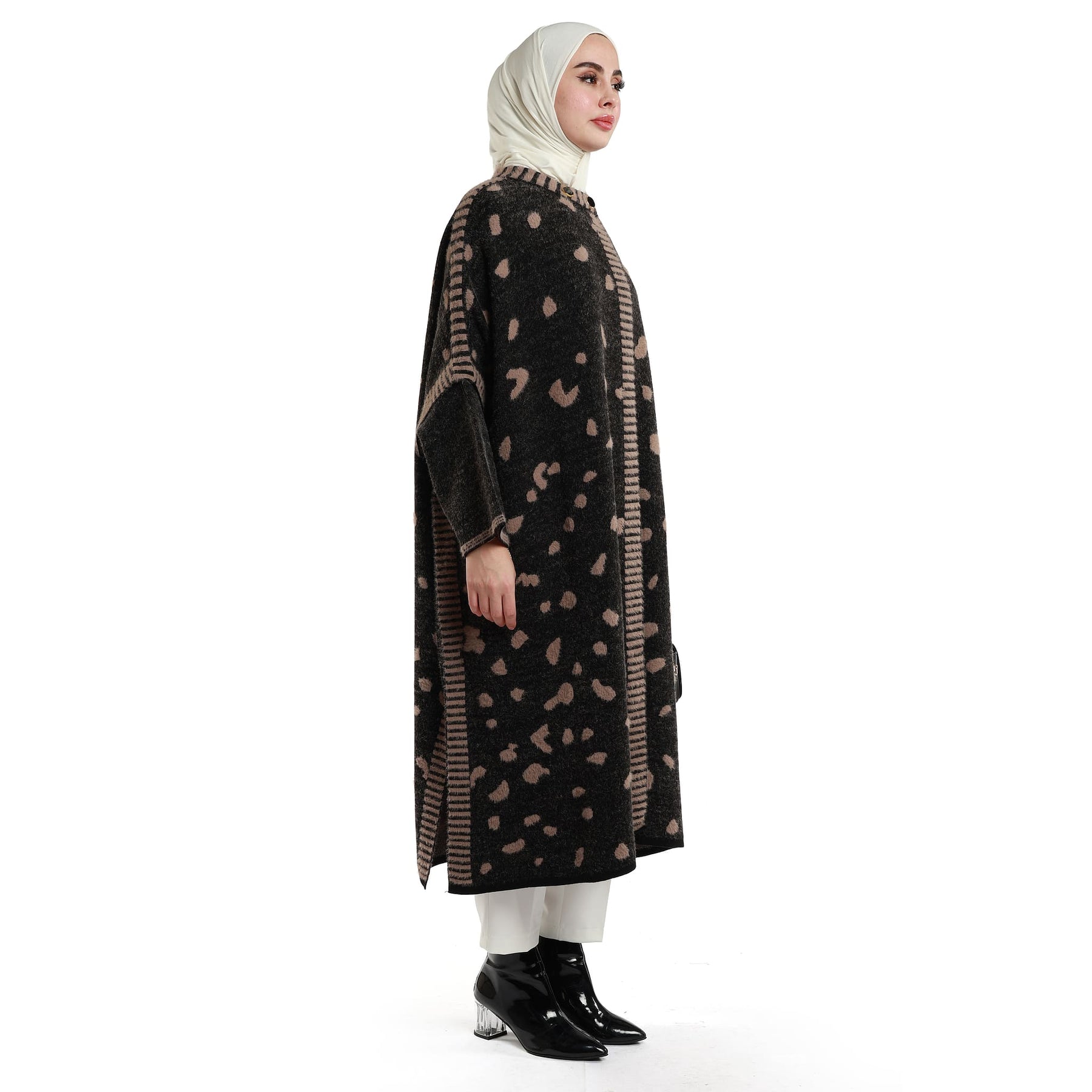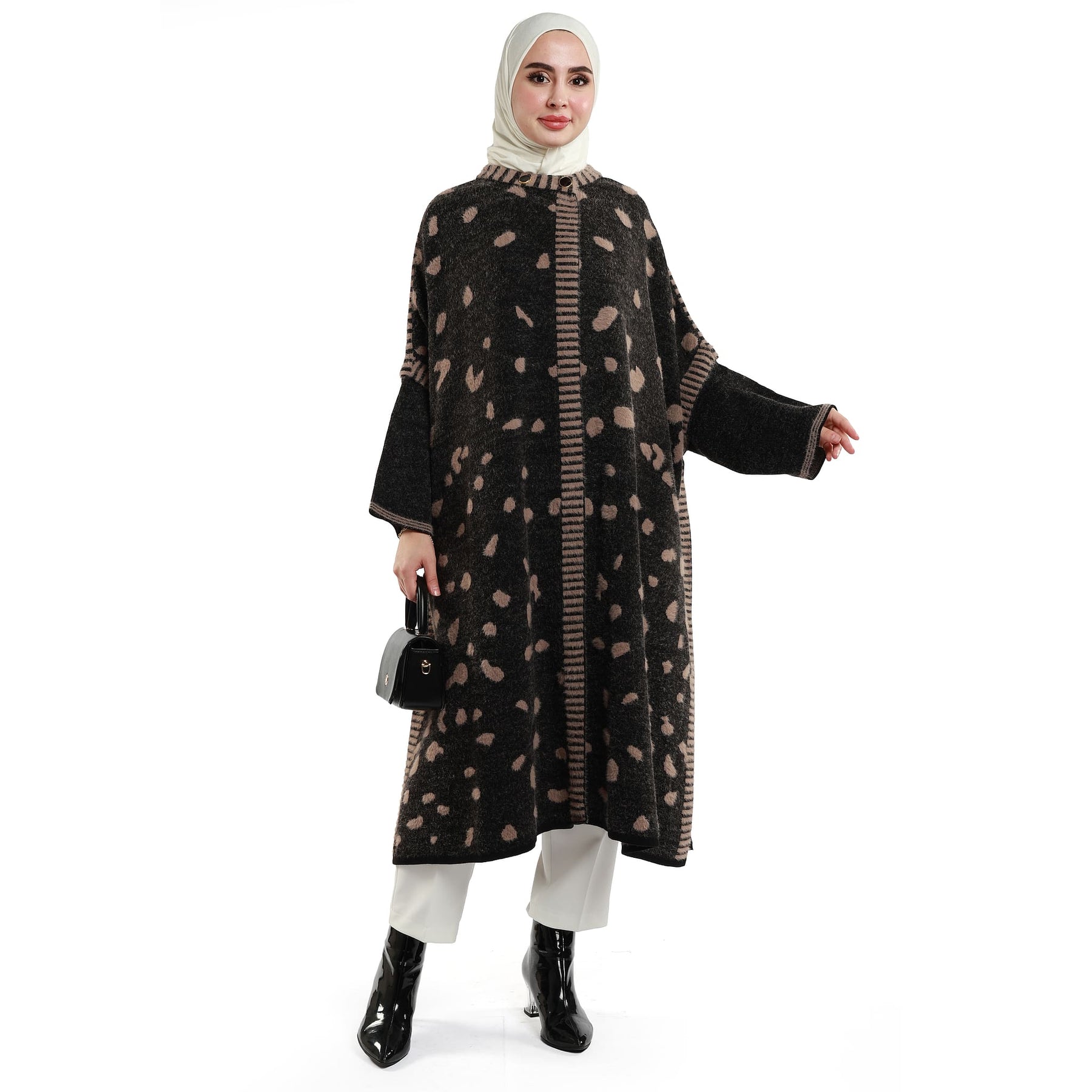 The mosaic pattern oversized long knit cardigan blends cosy warmth with a refined, modern look. Its wool-like textured fabric feels soft and insulating, while the relaxed, drapey cut falls loosely without clinging—perfect for effortless layering over dresses, knits or trousers. The elongated length adds polish and versatility, working seamlessly from workdays to weekend plans. Worn open, it delivers a clean, minimal line; add a slim belt to define the waist when you want a different silhouette. Offered in black-on-black and black-with-mink, the palette integrates easily into neutral wardrobes, creating understated yet eye-catching outfits. A reliable piece for transitional weather and colder days, it provides comfort, warmth and an instantly elevated finish.