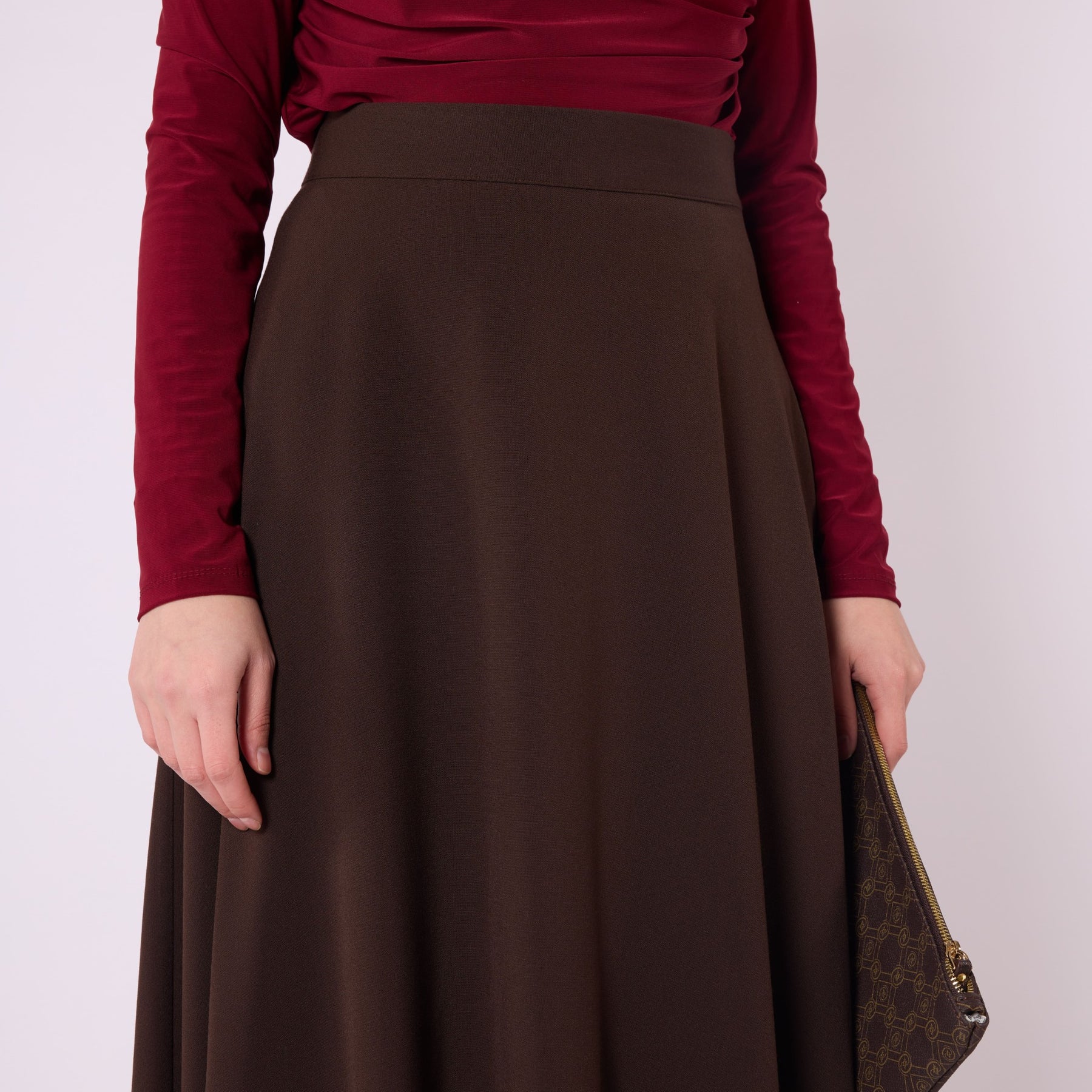 Designed with a relaxed flowing silhouette, this A-line long skirt combines comfort and elegance for both everyday use and office styling. The elastic waistband enhances ease of wear, while the winter-weight fabric provides warmth without compromising movement. Its unlined construction keeps the skirt lightweight, allowing effortless pairings with sweaters, blouses or long cardigans. Available in brown, light brown and black, it offers a timeless, versatile look suitable for modern wardrobes.