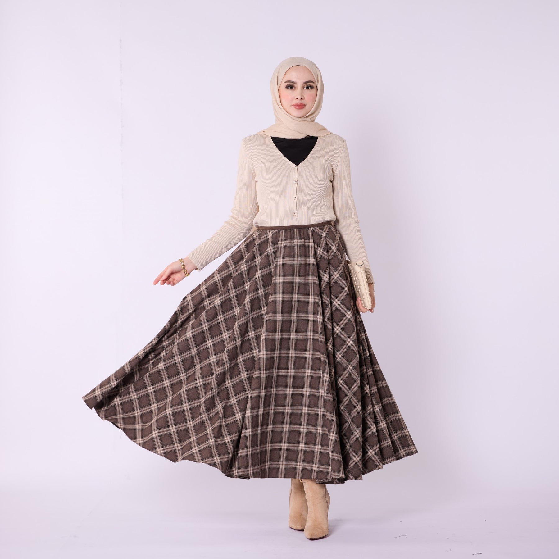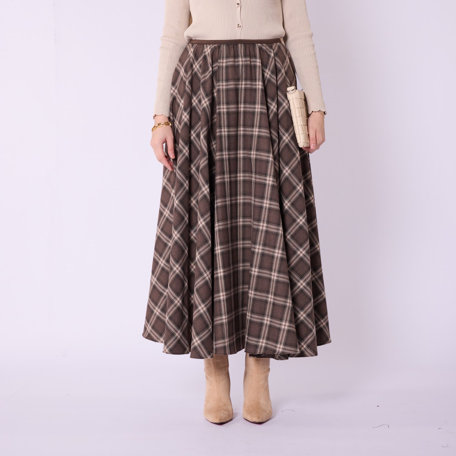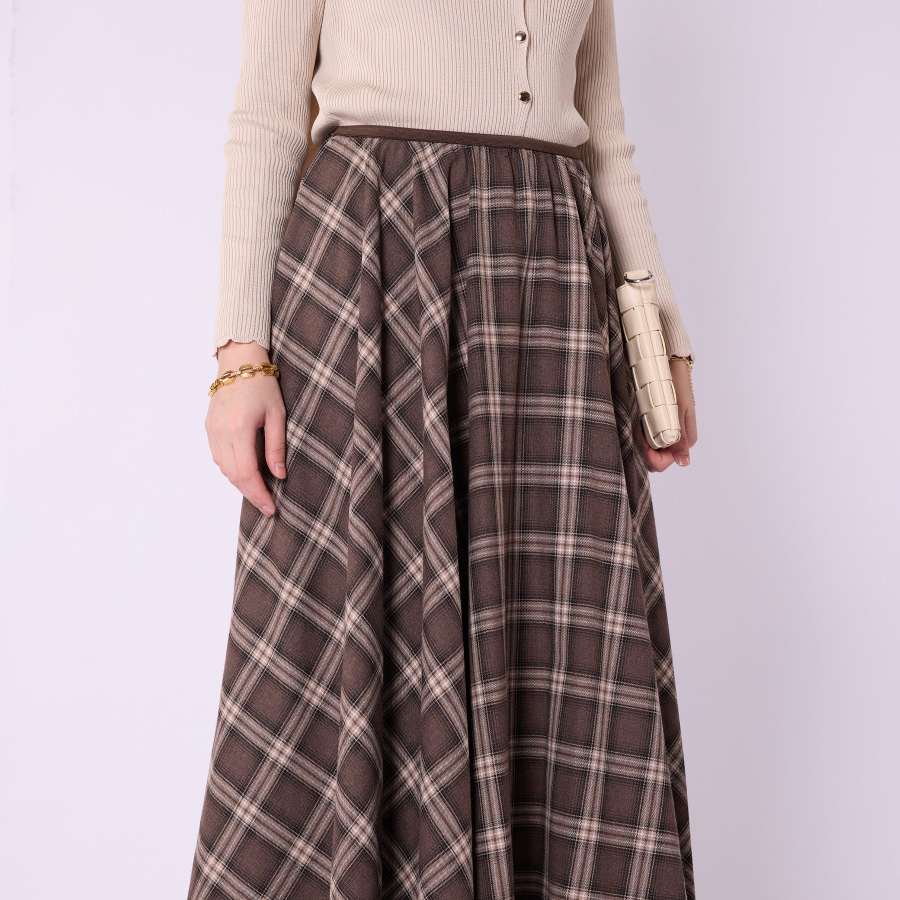 Combining the timeless charm of plaid with a modern silhouette, this elastic-waist pleated skirt is a comfortable and stylish choice for everyday wear. Crafted from lightweight 100% polyester fabric, it provides ease of movement throughout the day, while its unlined structure offers a free-flowing drape. Available in black and brown tones, it pairs effortlessly with sweaters, shirts, and boots for versatile winter outfits. The pleated design adds natural volume, and the elastic waistband comfortably adapts to different body shapes, making it a practical yet chic wardrobe essential.