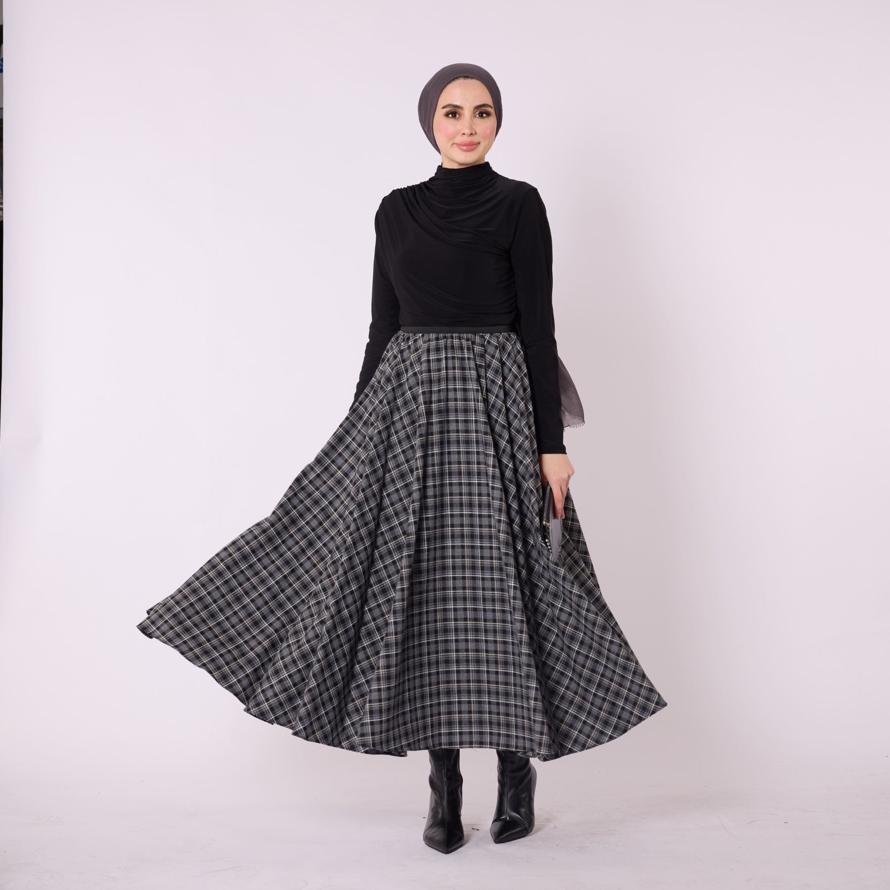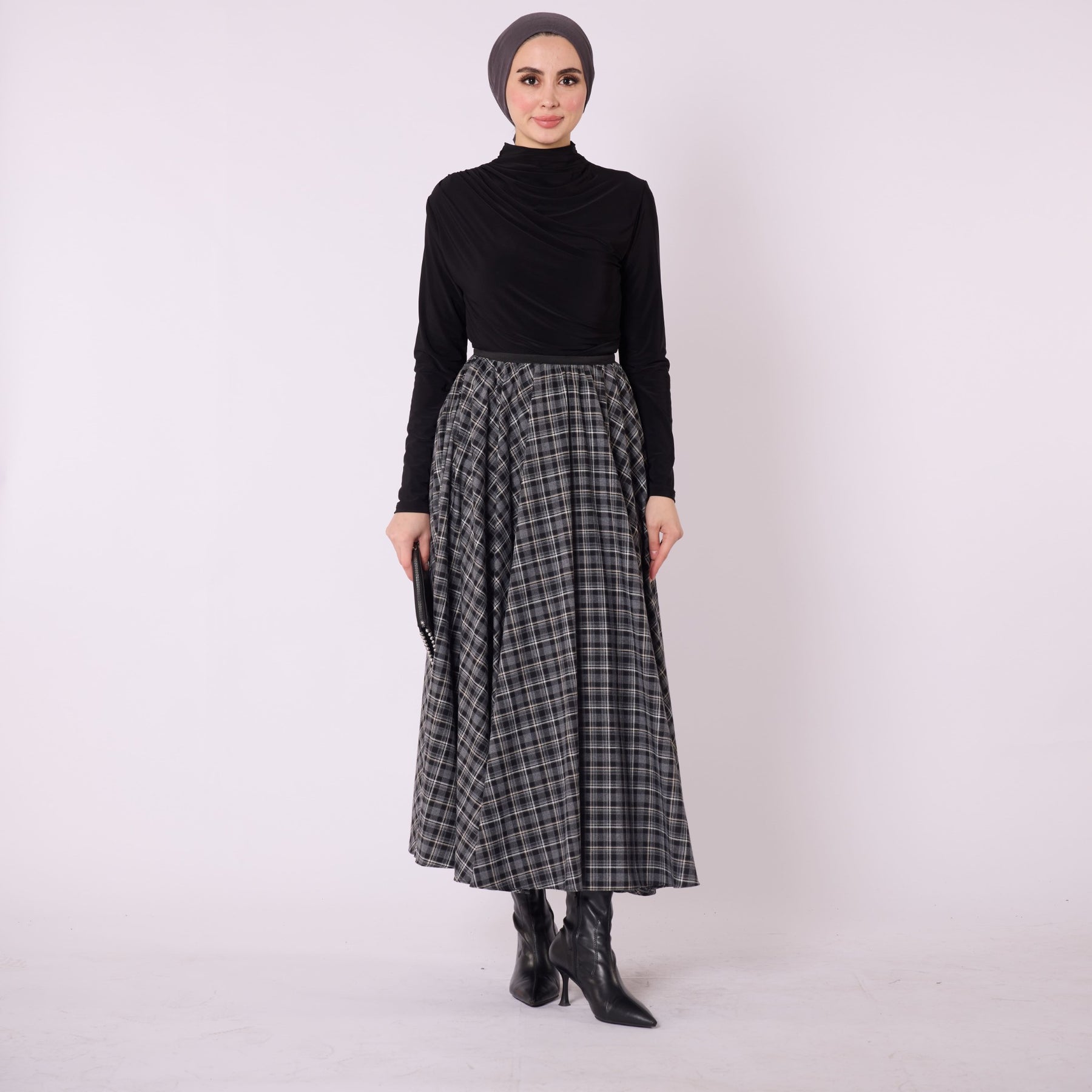 Designed with a timeless checkered pattern, this long skirt offers both comfort and style for winter. The elastic waistband provides an easy fit, while the soft drape and pleated details add movement and elegance to the silhouette. Made from 100% polyester winter-weight fabric, it keeps you comfortable throughout the day. Available in brown and black, it pairs effortlessly with sweaters, knitwear and boots for daily wear. Its unlined structure gives a lightweight and flexible feel.