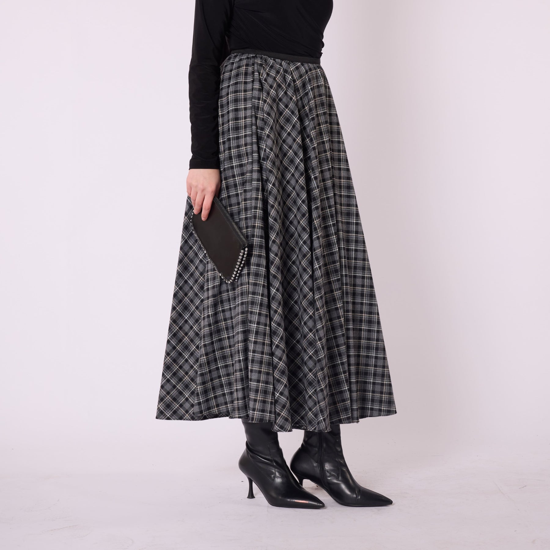 Model: Checkered long skirt with elastic waist