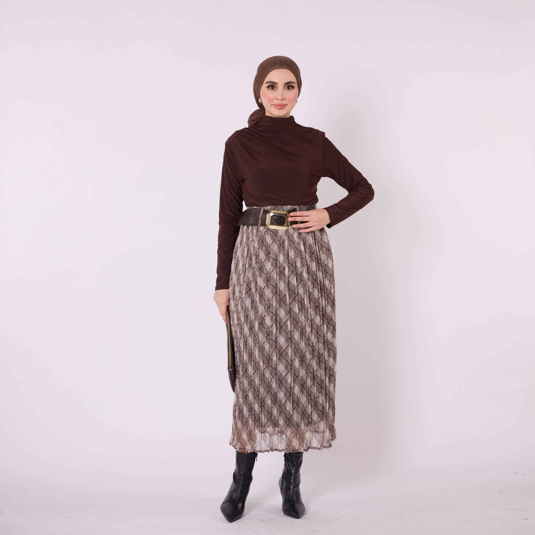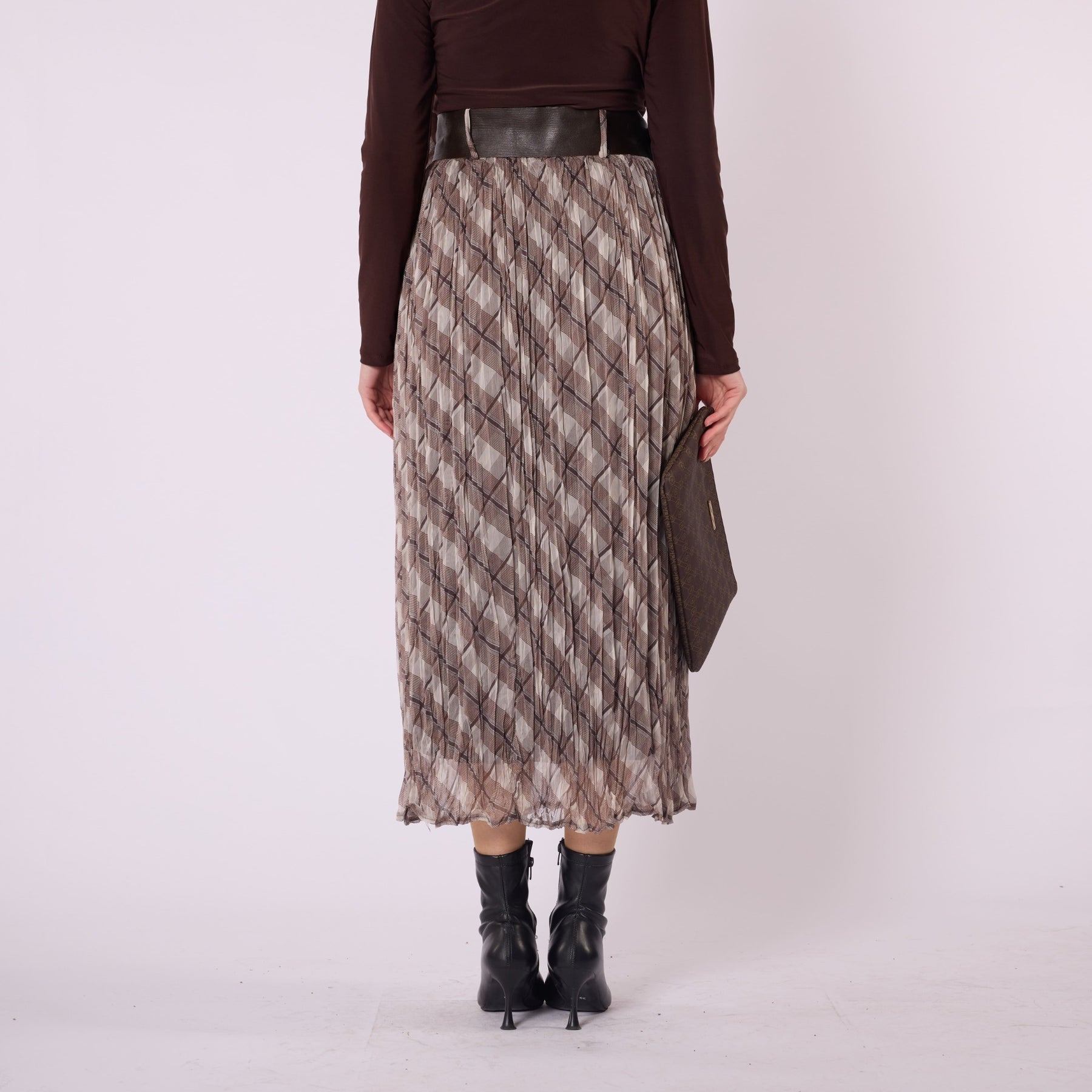 Featuring a refined plaid pattern and soft pleated structure, this belted skirt is a versatile piece suitable for both everyday wear and polished, elegant looks. The elastic waistband provides comfort throughout the day, while the belt detail shapes the silhouette and highlights the waist beautifully. Its lined construction adds warmth and comfort, making it ideal for cooler seasons. Designed in a timeless beige tone, the skirt pairs effortlessly with sweaters, blouses and long cardigans, creating stylish combinations with minimal effort. Perfect for office settings as well as casual city outfits, it adapts easily to different accessories and offers a balanced blend of comfort and sophistication.