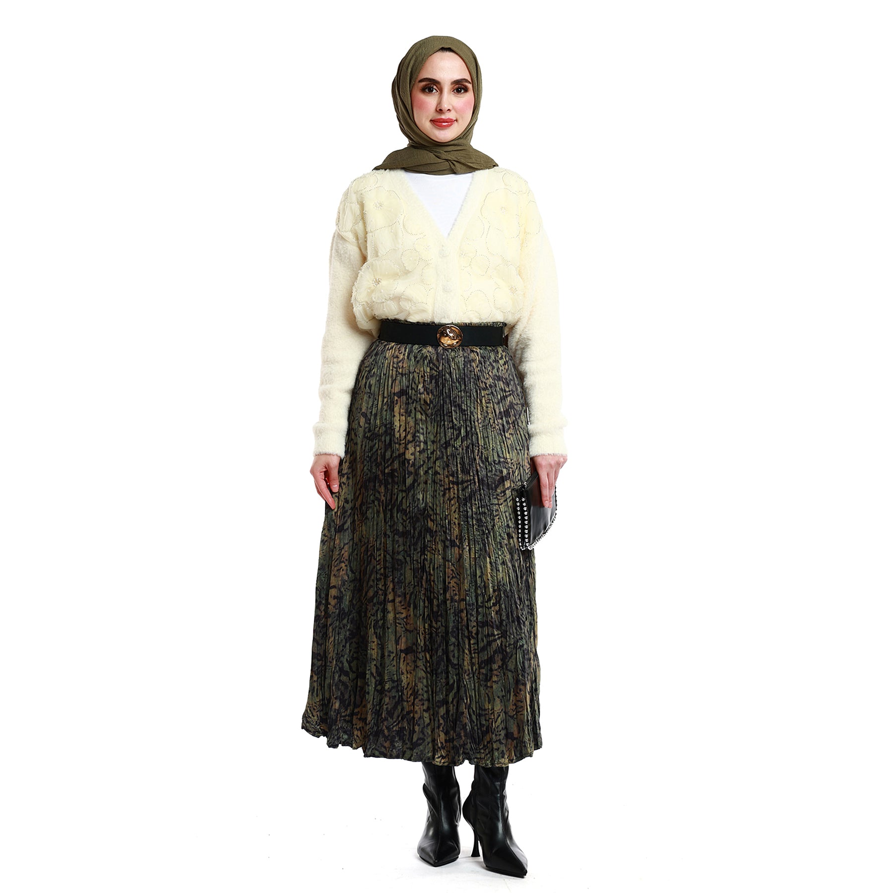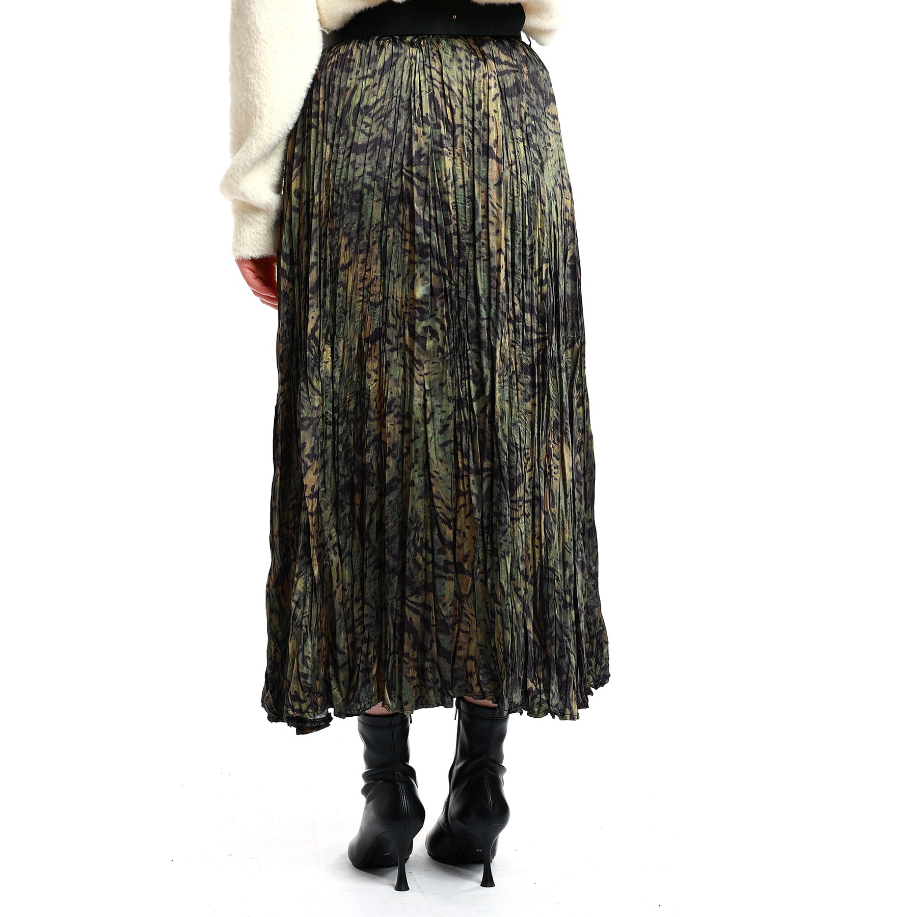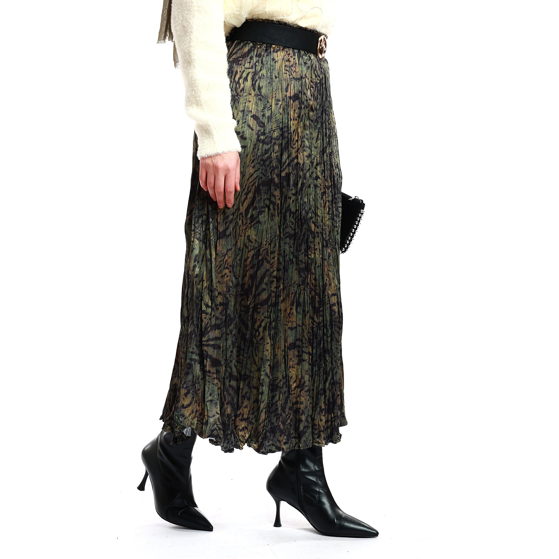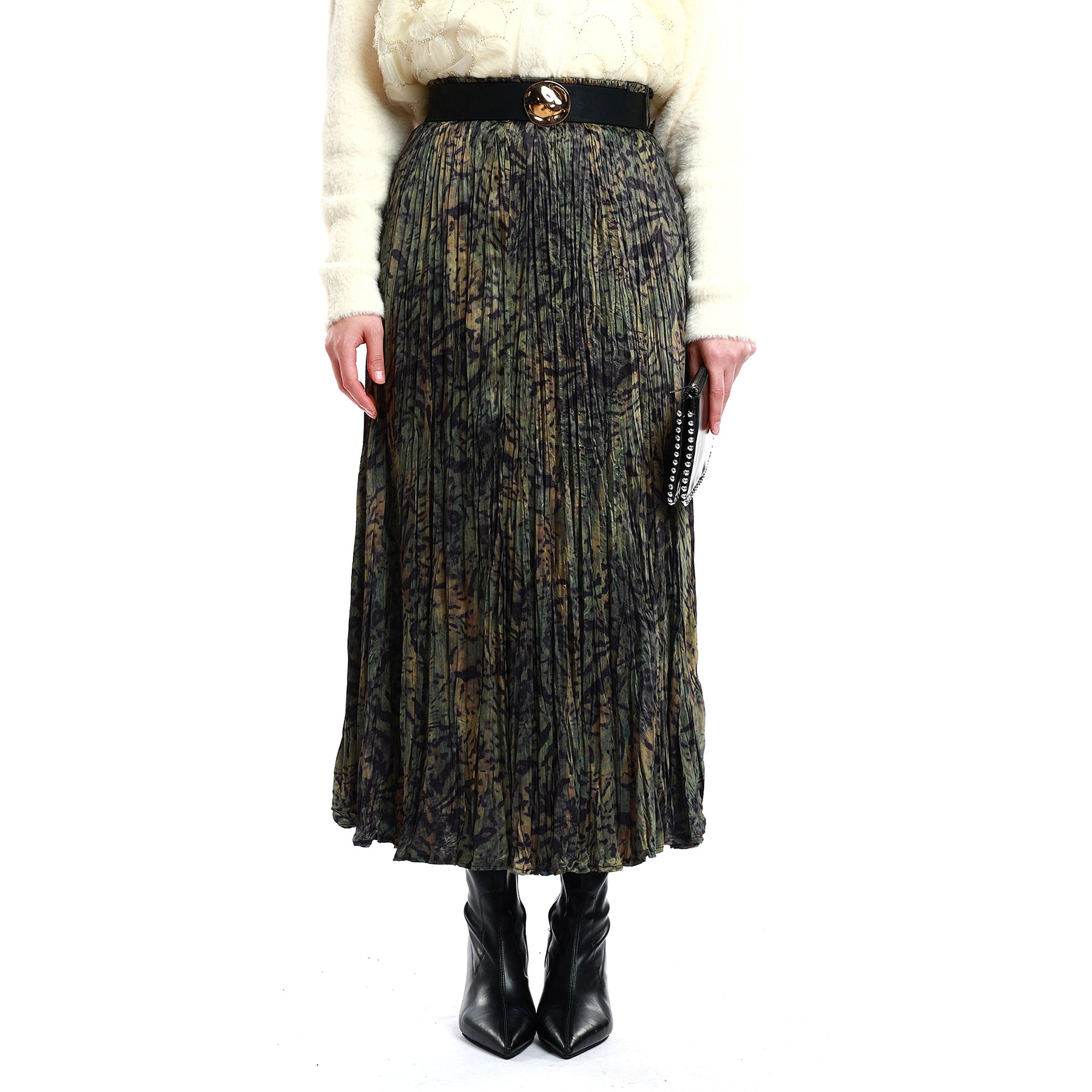 Designed with elegant pleats and a softly patterned surface, this skirt offers both comfort and sophistication for everyday styling. The elastic waistband provides ease of movement, while the gold-toned belt buckle adds a polished, modern touch. Its green-black gradient look pairs effortlessly with various tops, making it a versatile winter wardrobe essential. Lightweight yet structured, it is suitable for both office and daily wear.