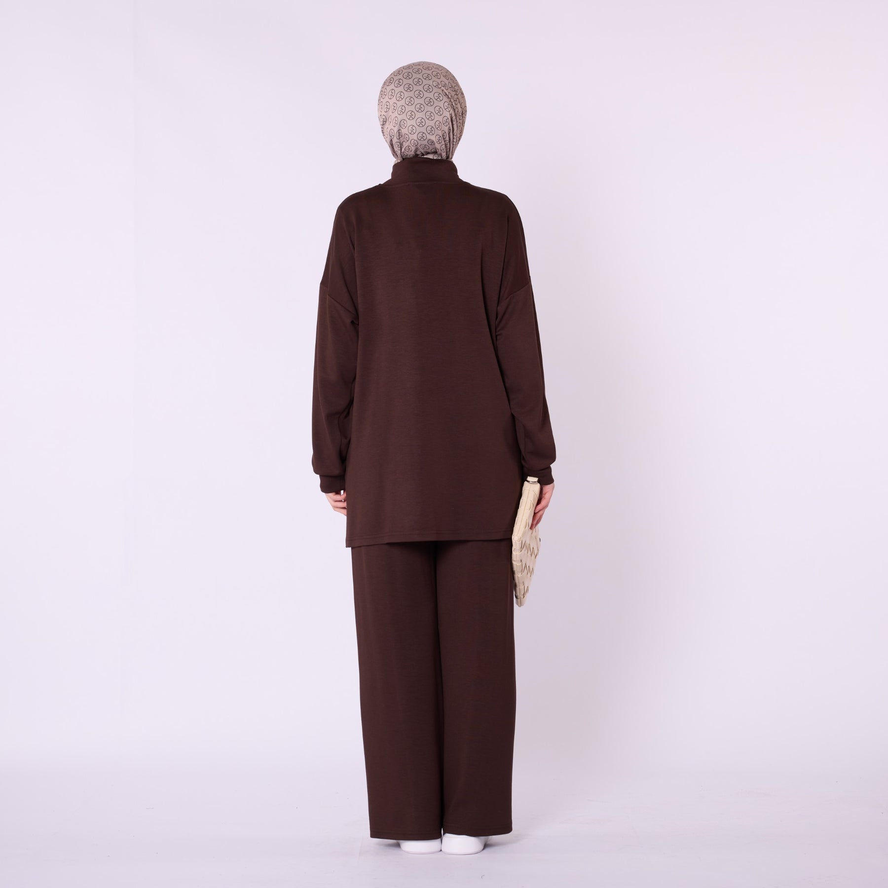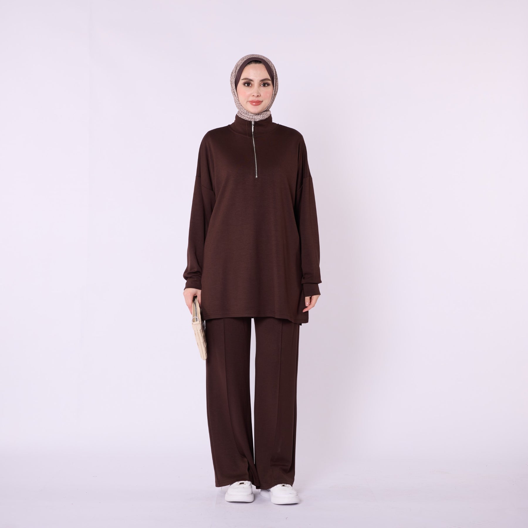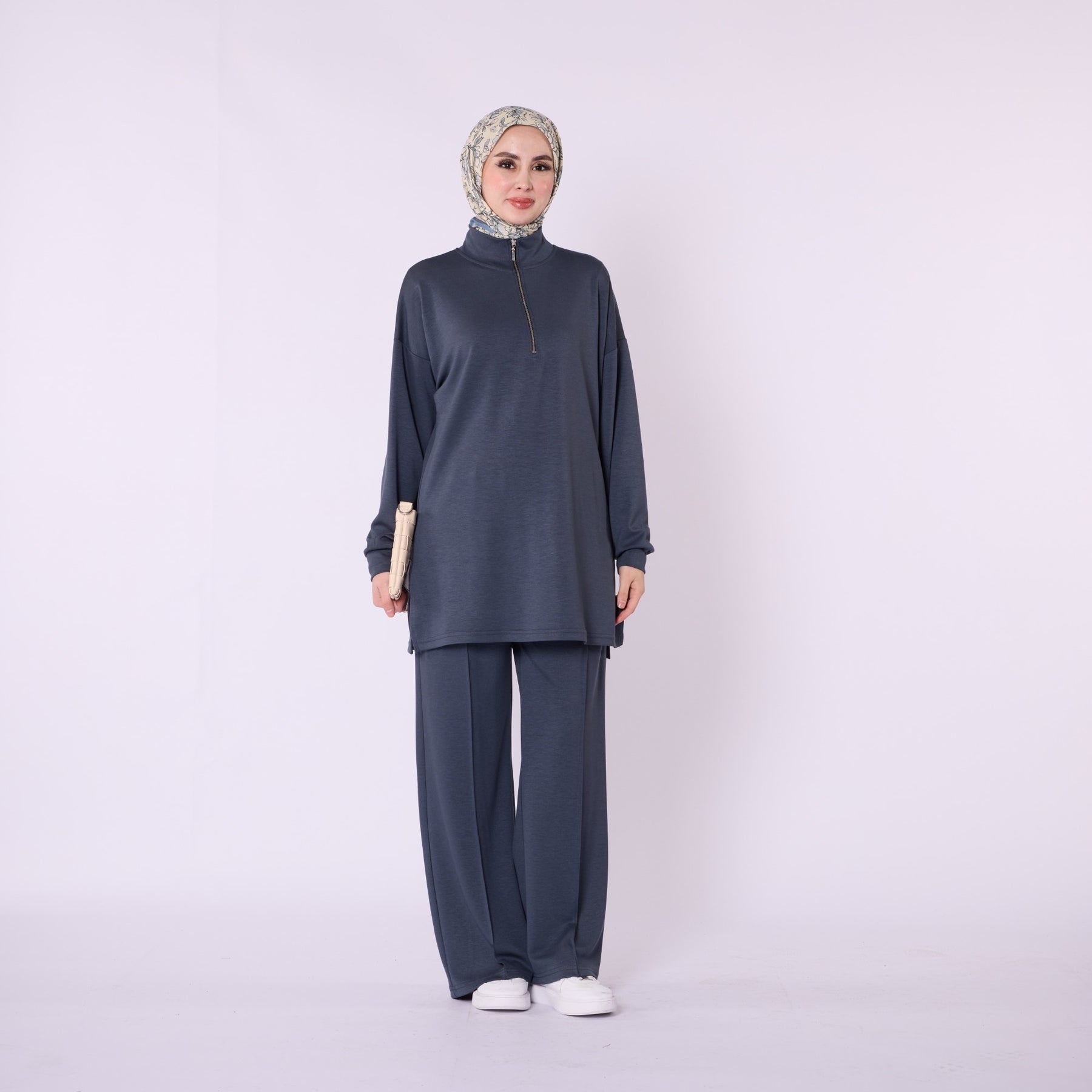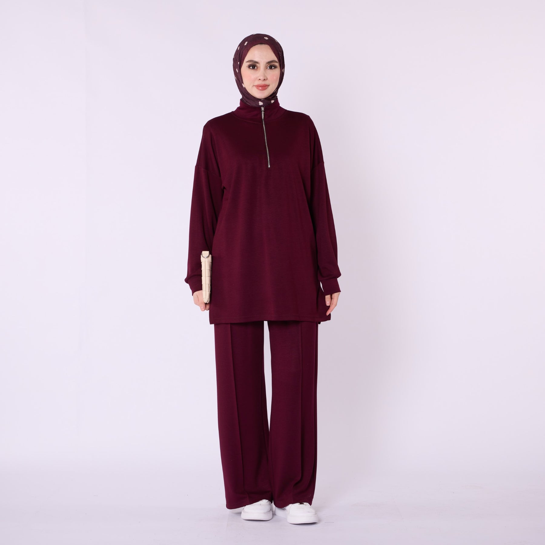 Designed for effortless everyday comfort, this two-piece set features a soft cotton-blend fabric that provides flexibility and ease of movement. The high-neck top with a half-zip offers warmth and a clean, structured look, while the trousers stand out with distinct seam detailing that highlights the crease line for a modern touch. The wide-leg silhouette enhances comfort, making the set ideal for daily wear. Available in a versatile color range including burgundy, charcoal, grey, brown, navy and black.