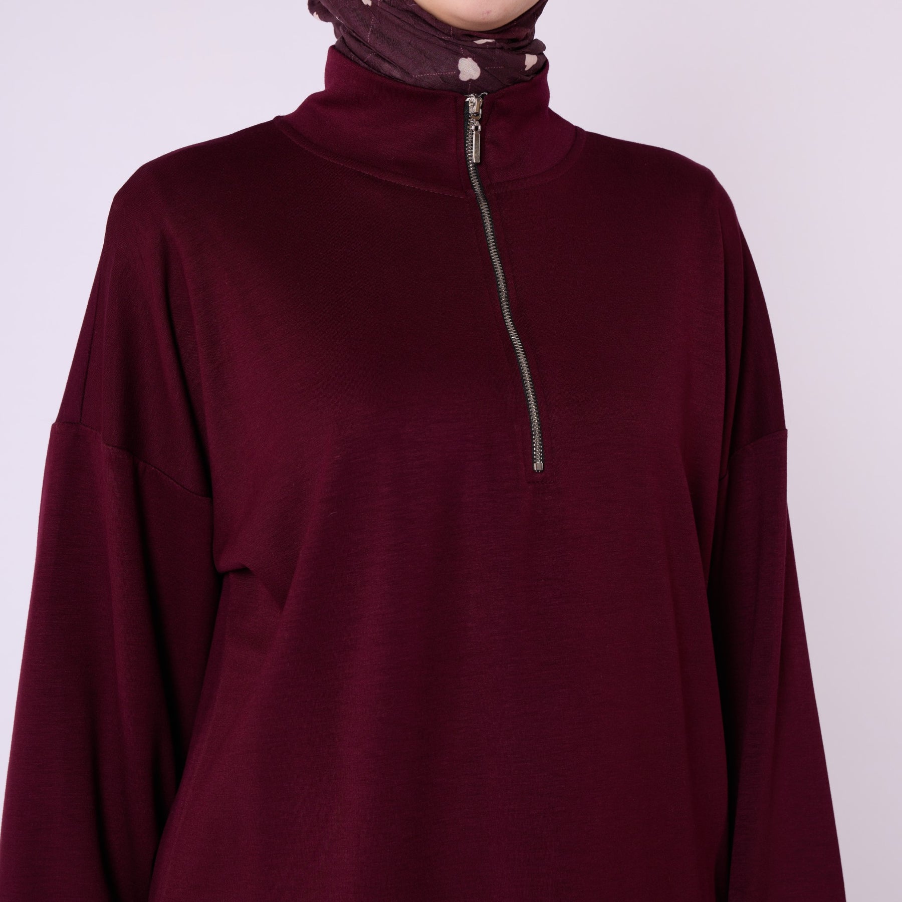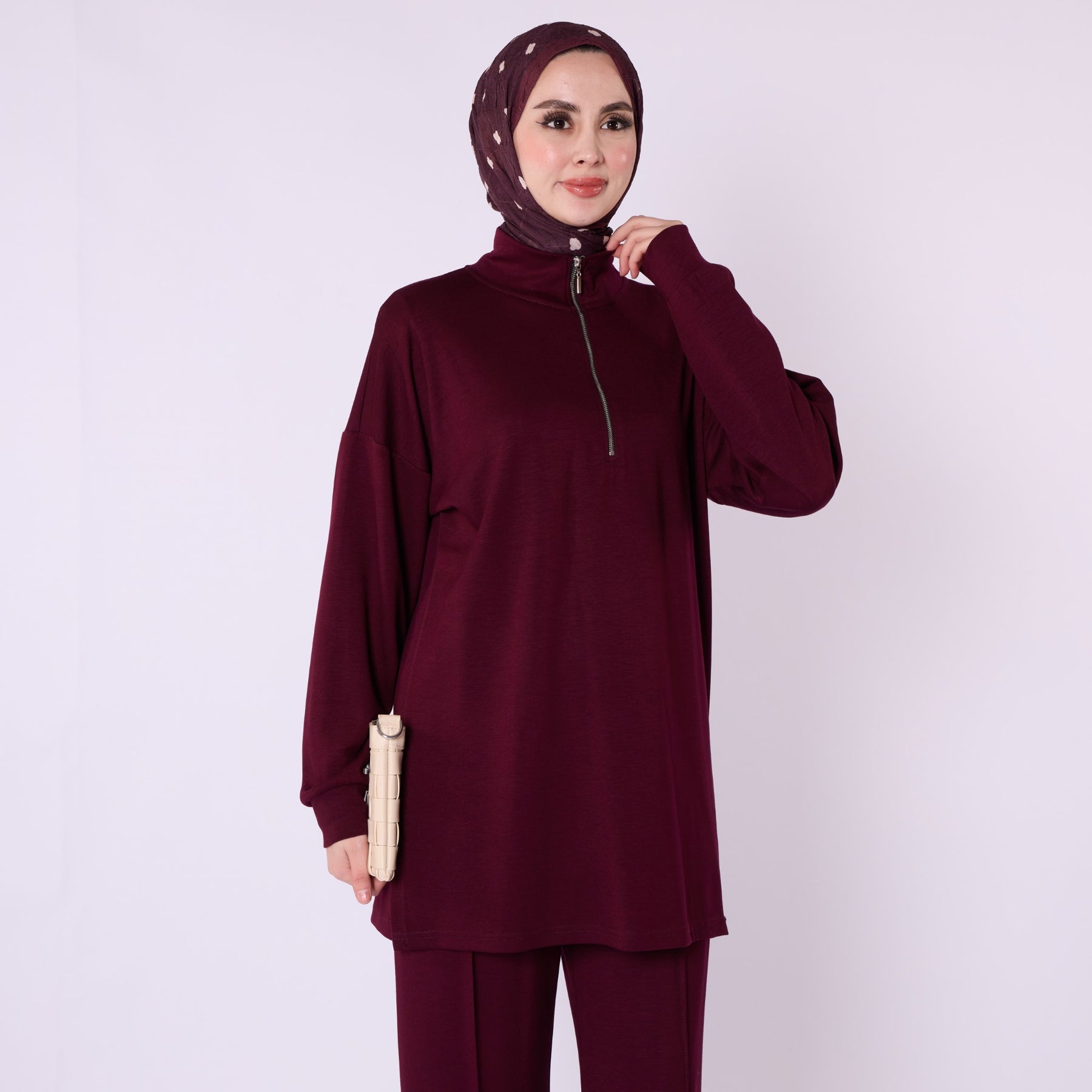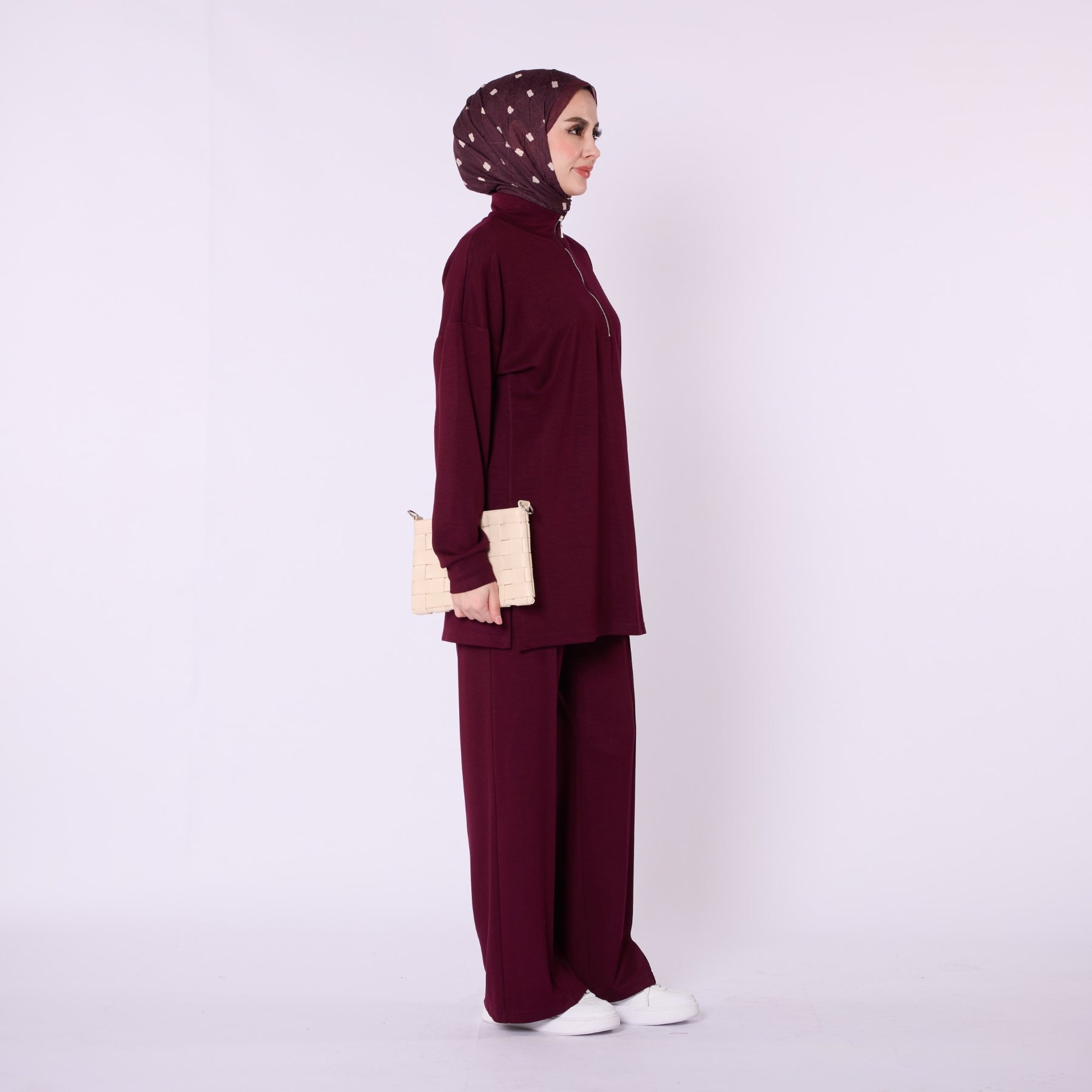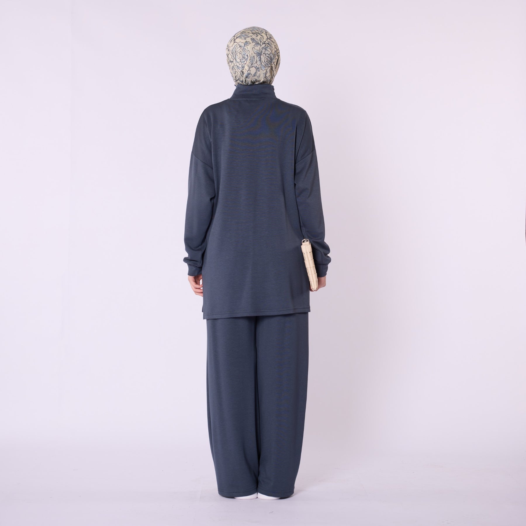 Designed for effortless everyday comfort, this two-piece set features a soft cotton-blend fabric that provides flexibility and ease of movement. The high-neck top with a half-zip offers warmth and a clean, structured look, while the trousers stand out with distinct seam detailing that highlights the crease line for a modern touch. The wide-leg silhouette enhances comfort, making the set ideal for daily wear. Available in a versatile color range including burgundy, charcoal, grey, brown, navy and black.