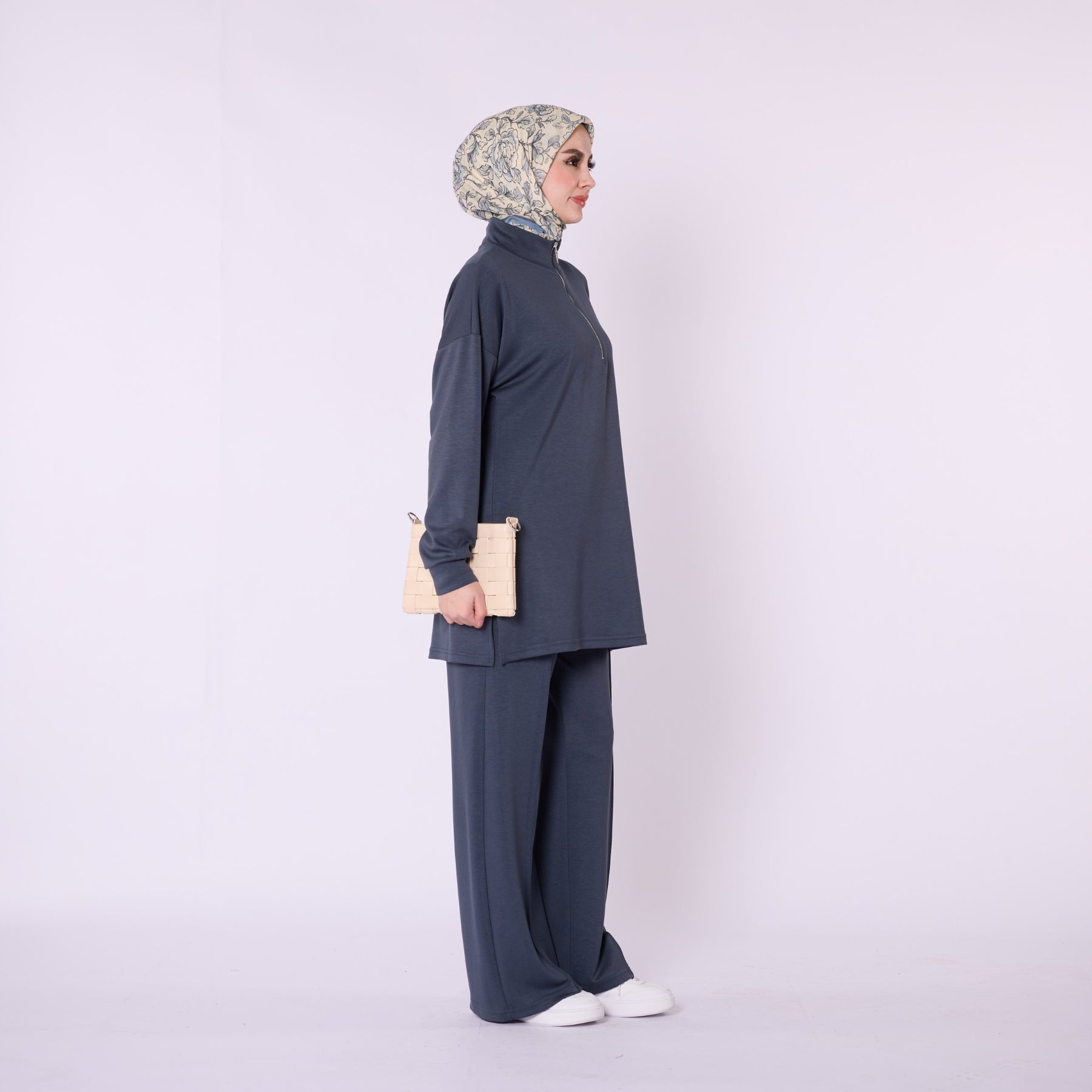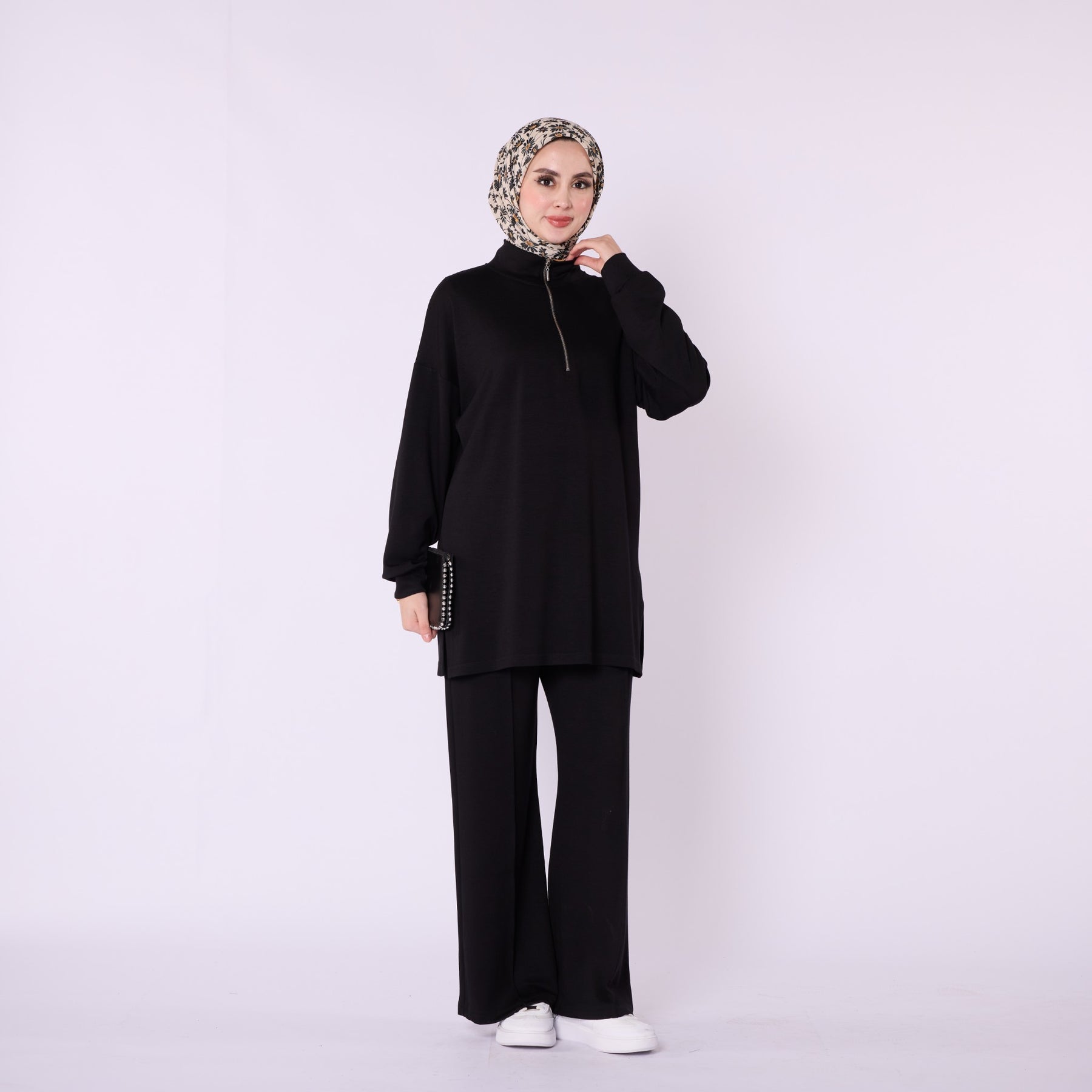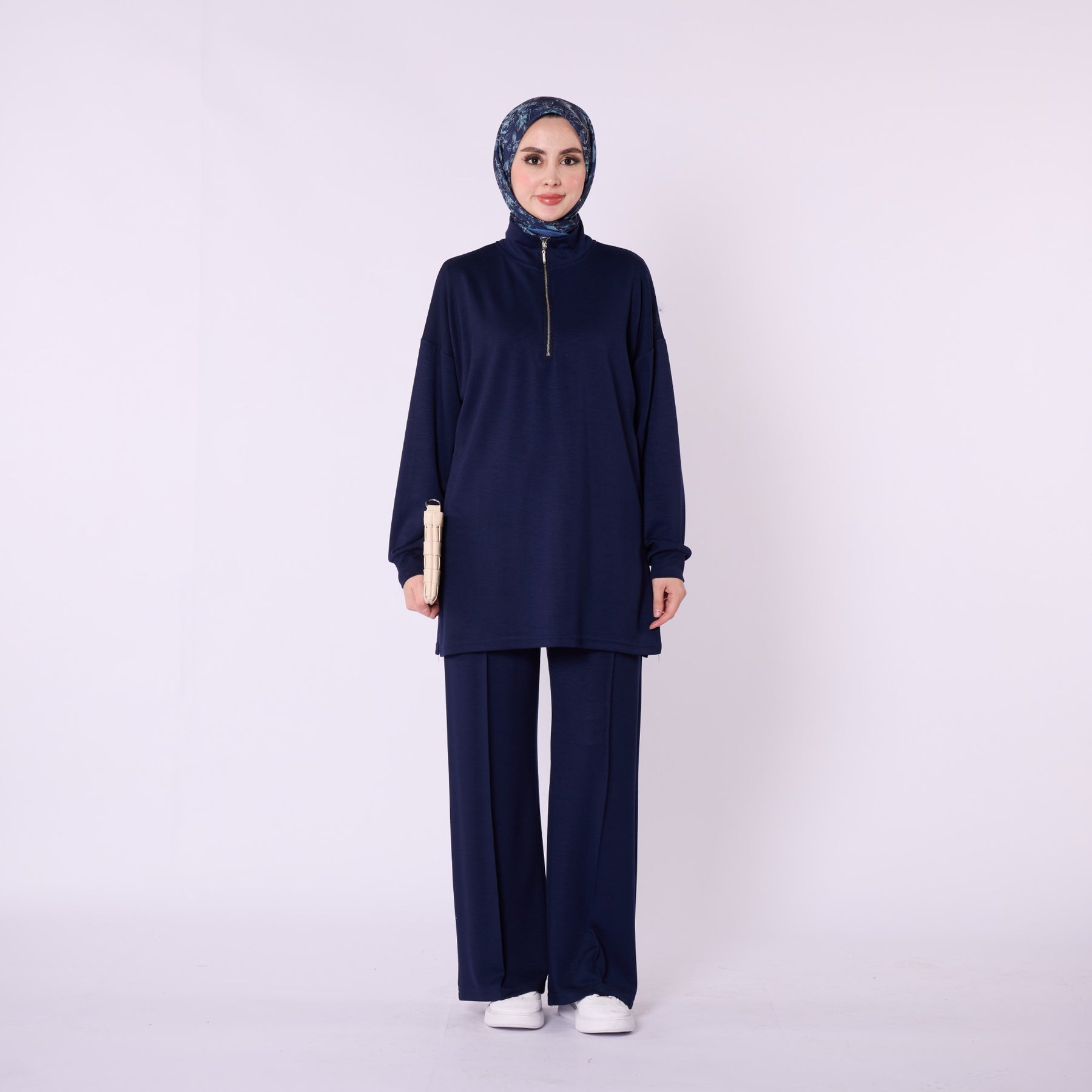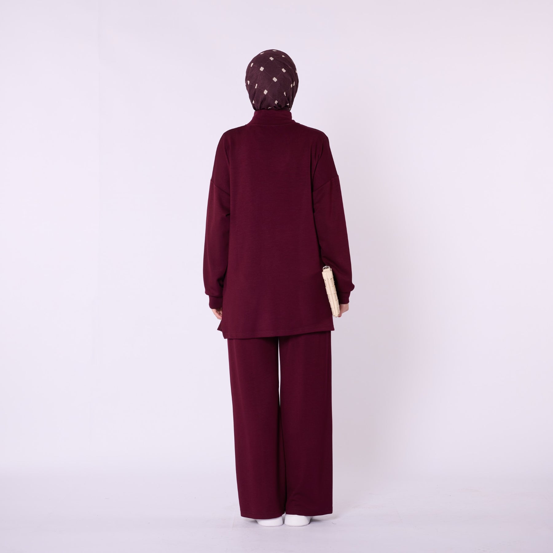 Designed for effortless everyday comfort, this two-piece set features a soft cotton-blend fabric that provides flexibility and ease of movement. The high-neck top with a half-zip offers warmth and a clean, structured look, while the trousers stand out with distinct seam detailing that highlights the crease line for a modern touch. The wide-leg silhouette enhances comfort, making the set ideal for daily wear. Available in a versatile color range including burgundy, charcoal, grey, brown, navy and black.