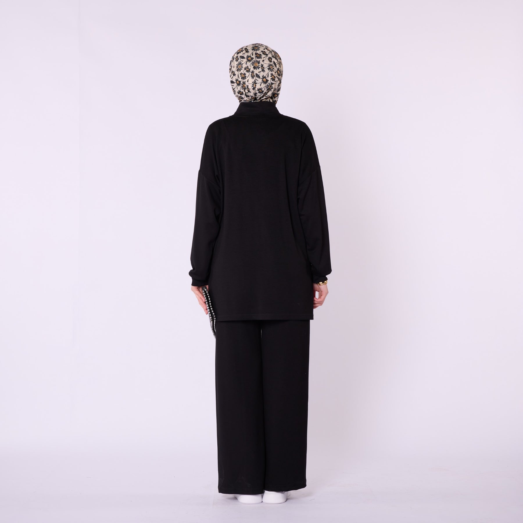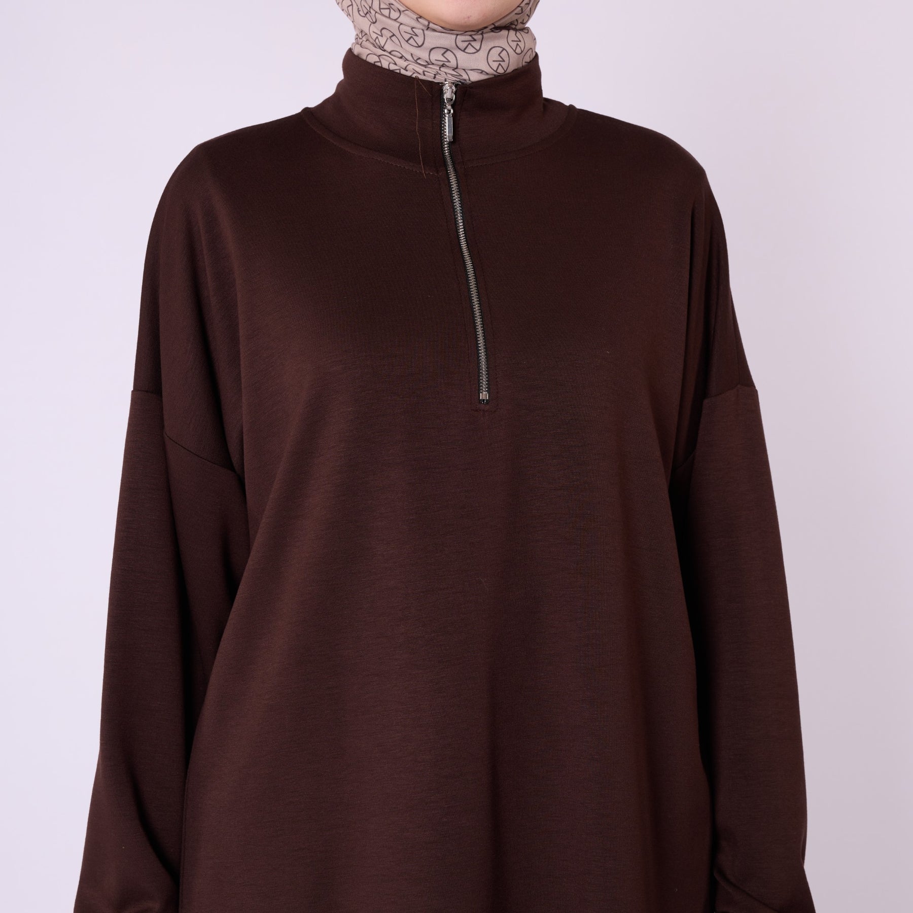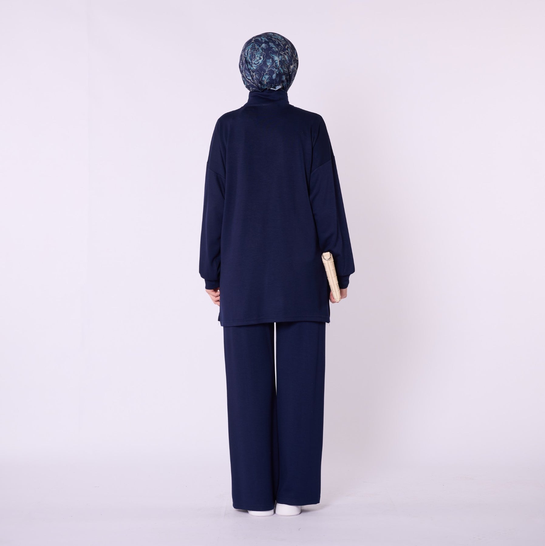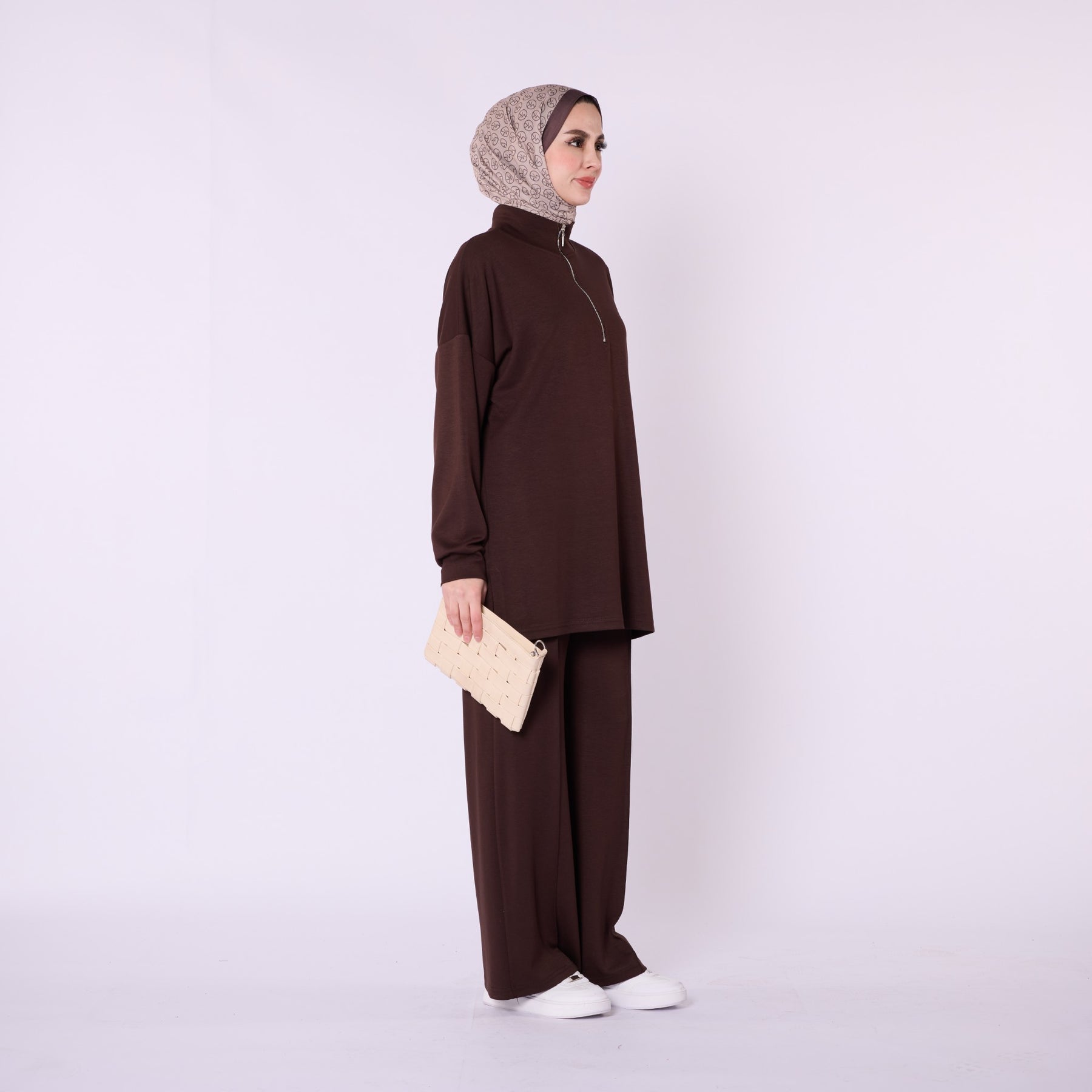 Designed for effortless everyday comfort, this two-piece set features a soft cotton-blend fabric that provides flexibility and ease of movement. The high-neck top with a half-zip offers warmth and a clean, structured look, while the trousers stand out with distinct seam detailing that highlights the crease line for a modern touch. The wide-leg silhouette enhances comfort, making the set ideal for daily wear. Available in a versatile color range including burgundy, charcoal, grey, brown, navy and black.