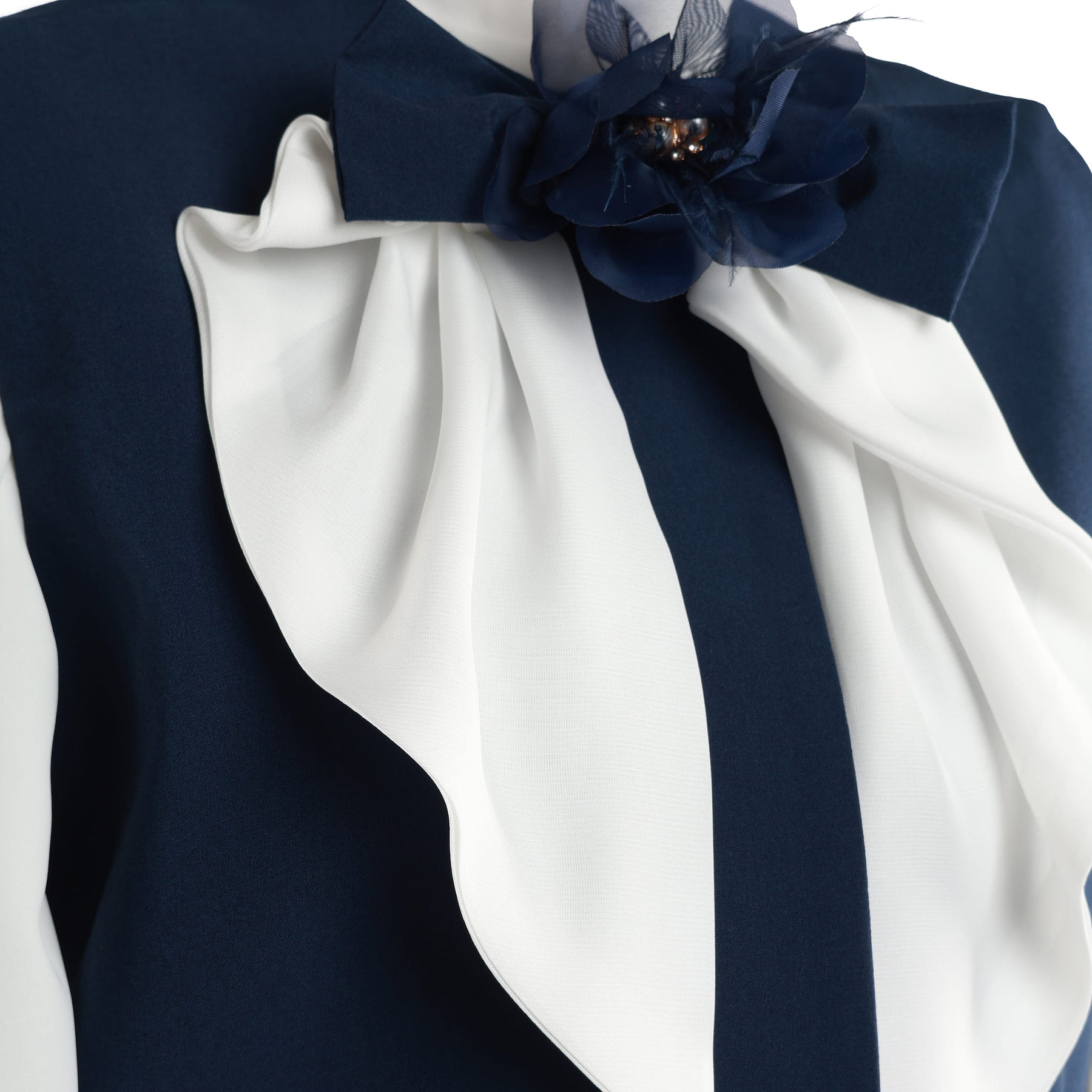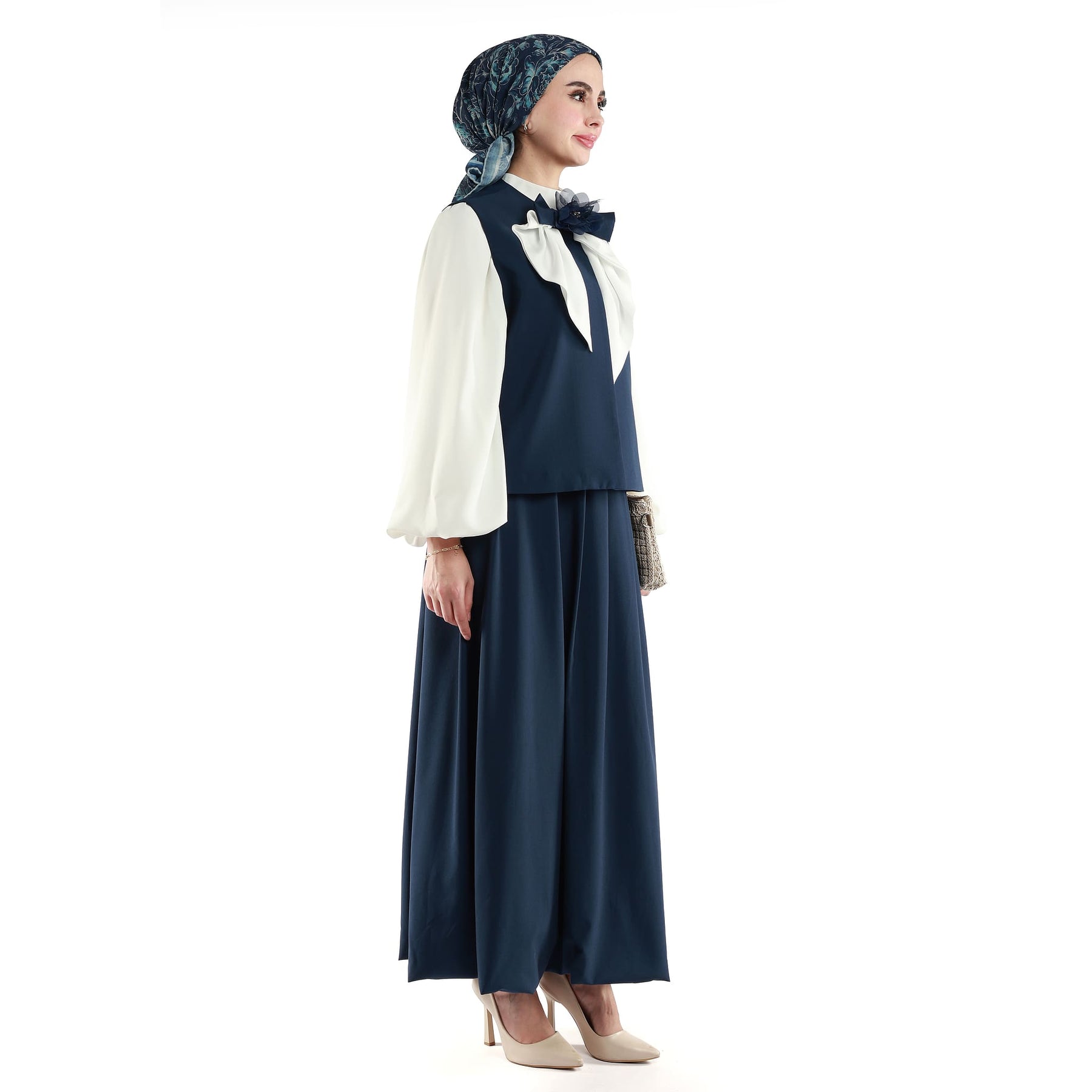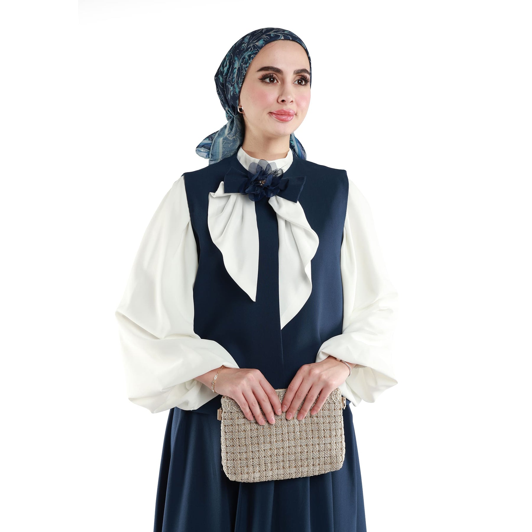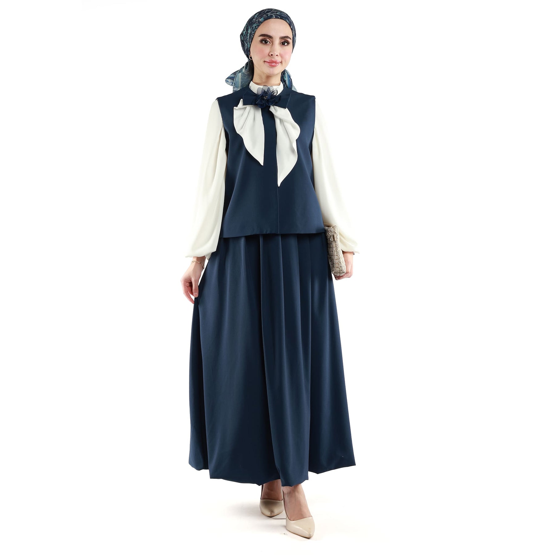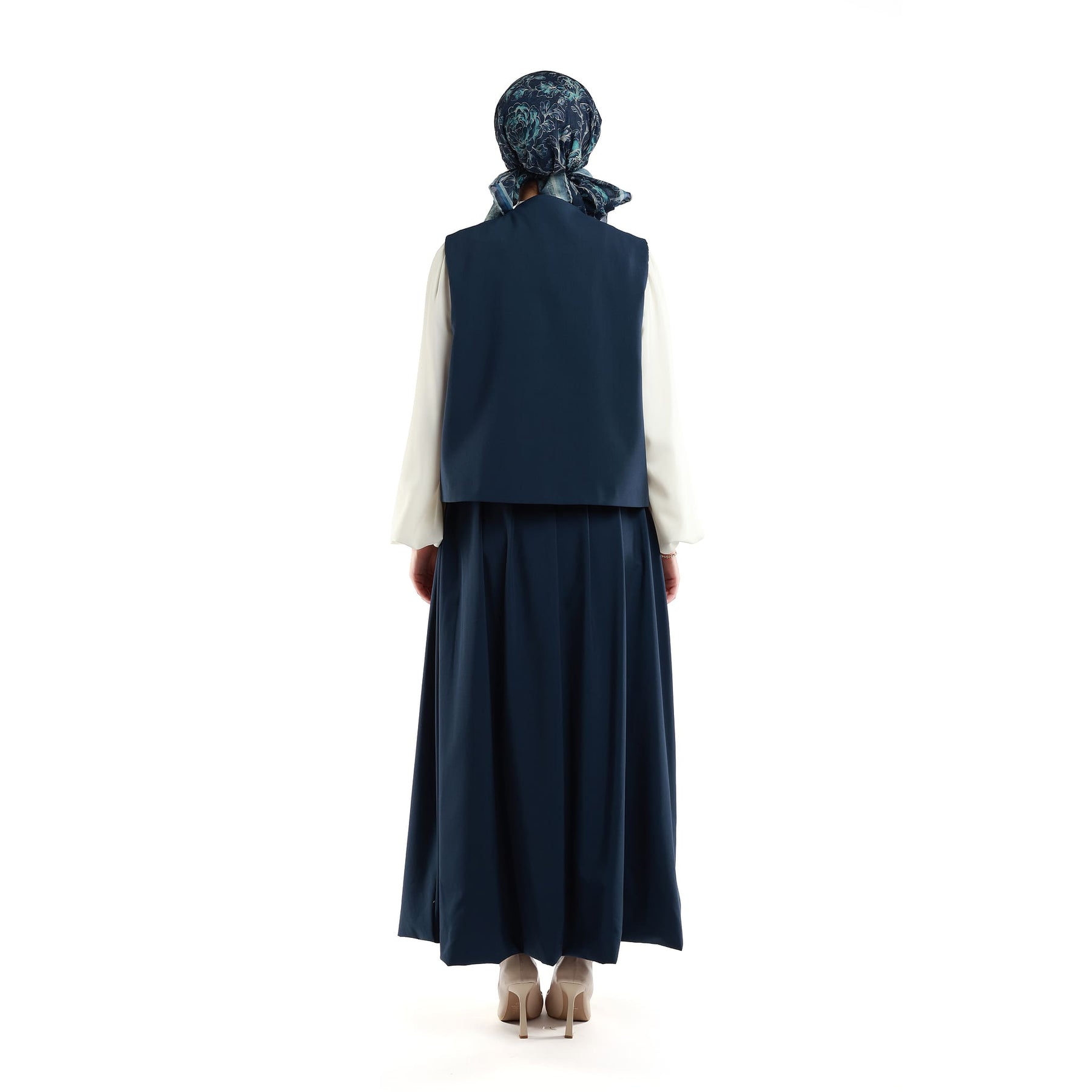 This scarf detailed vest & skirt set features a lightweight, summery design. The skirt is pleated and comes with a zipper. The vest has 2 hidden buttons at the top; there are no buttons at the bottom. Suitable for daily wear, special occasions, or office outfits.