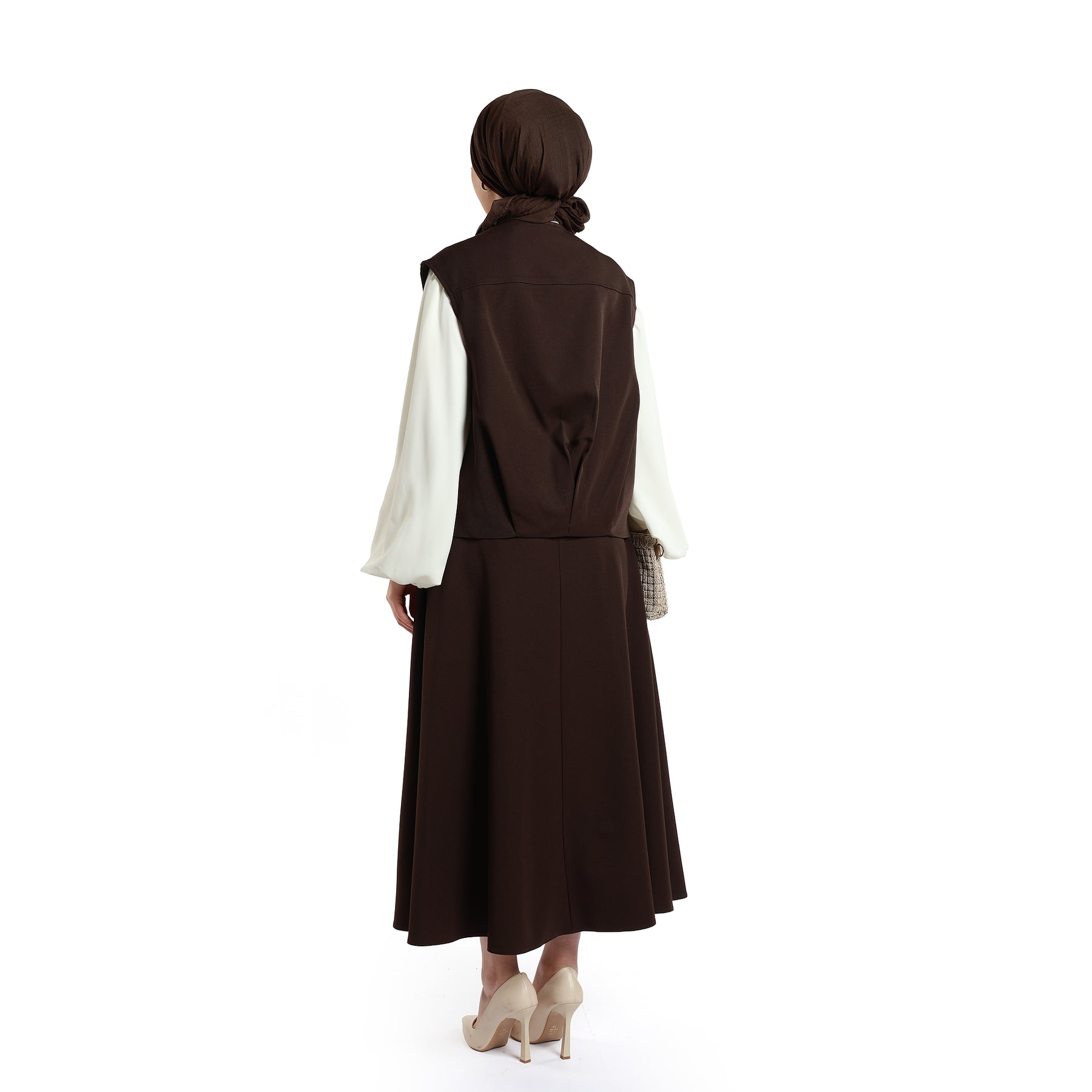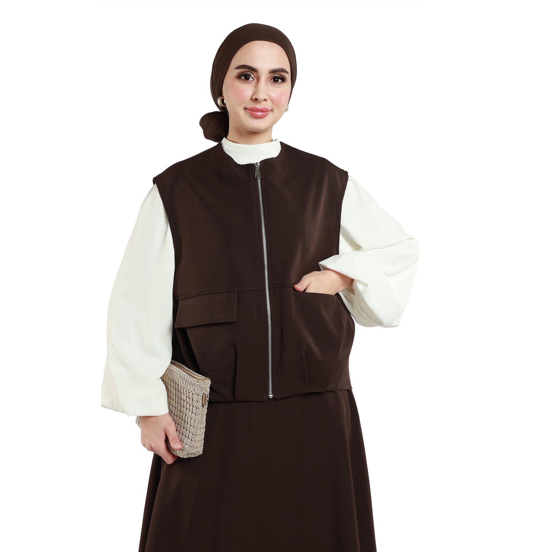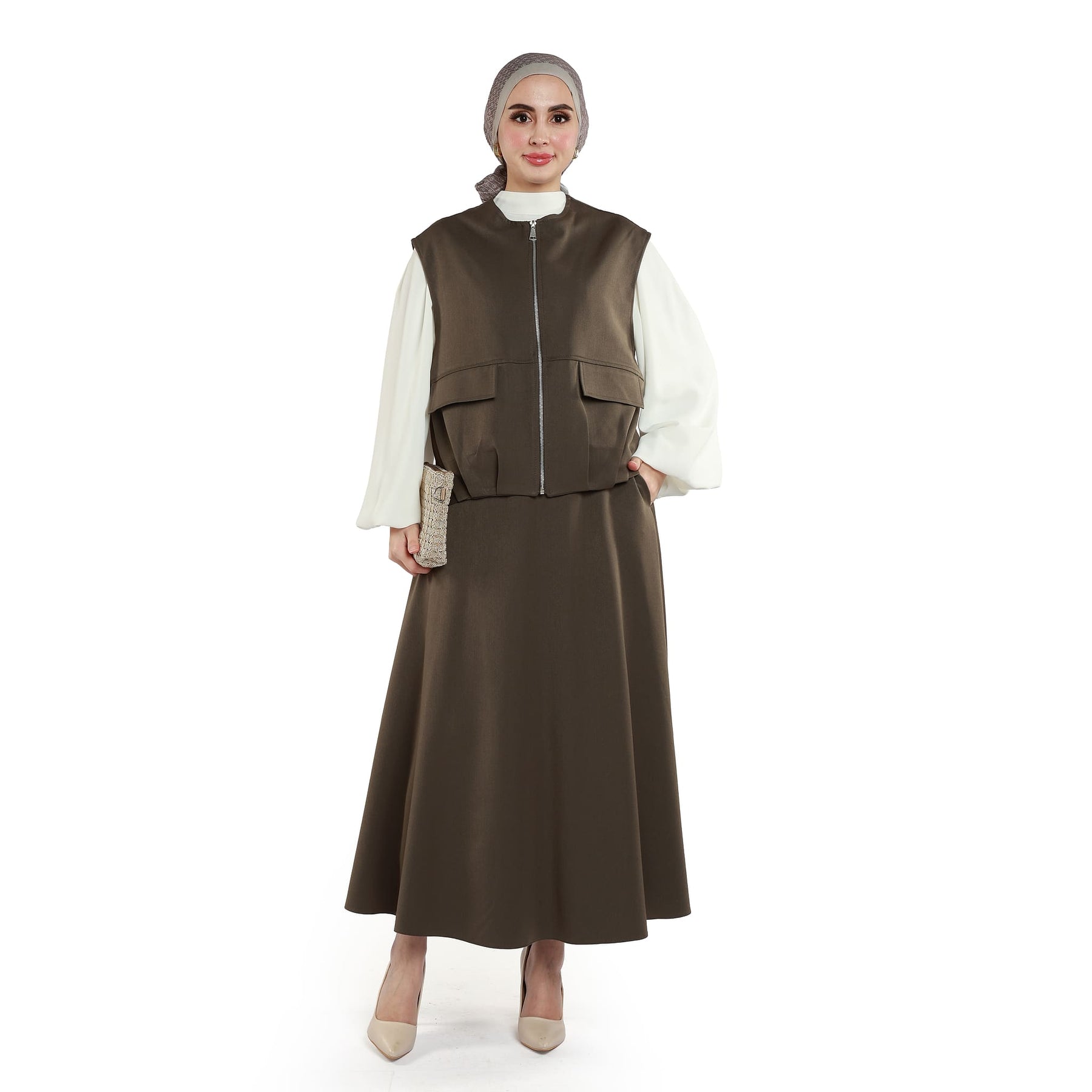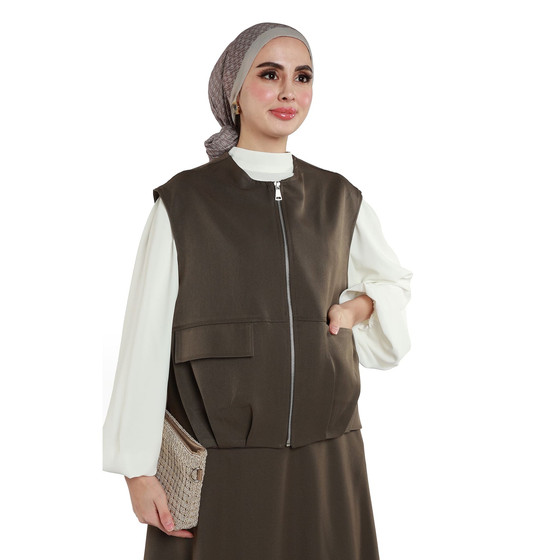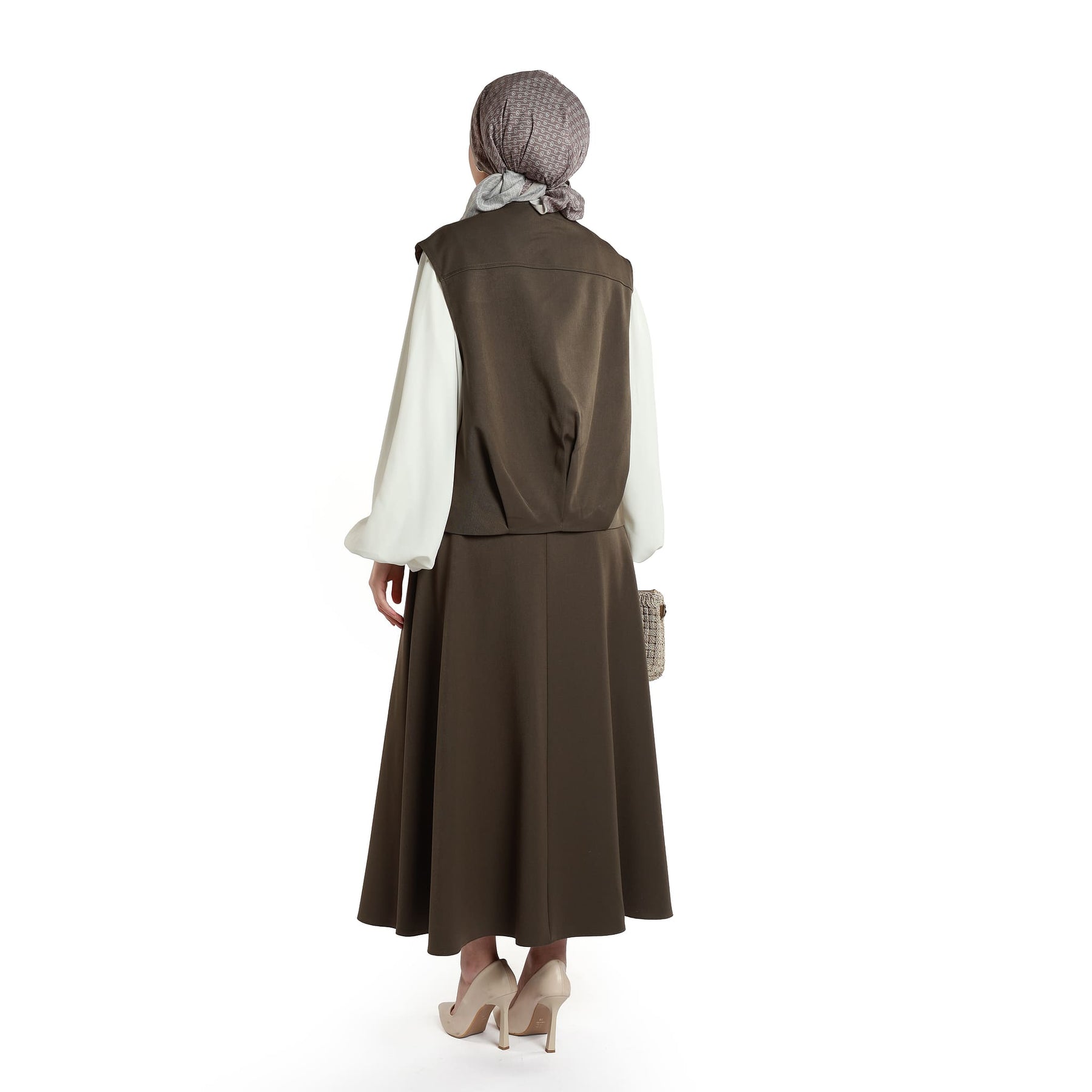This zip-front skirt set offers a clean and elegant look for everyday wear or the office. Available in khaki, brown and black, it’s easy to style with different blouses and scarves. Pleat details on both the vest and skirt add a subtle touch of movement.
