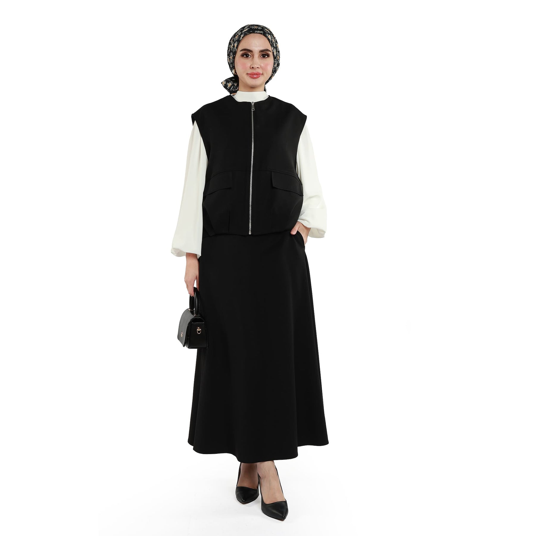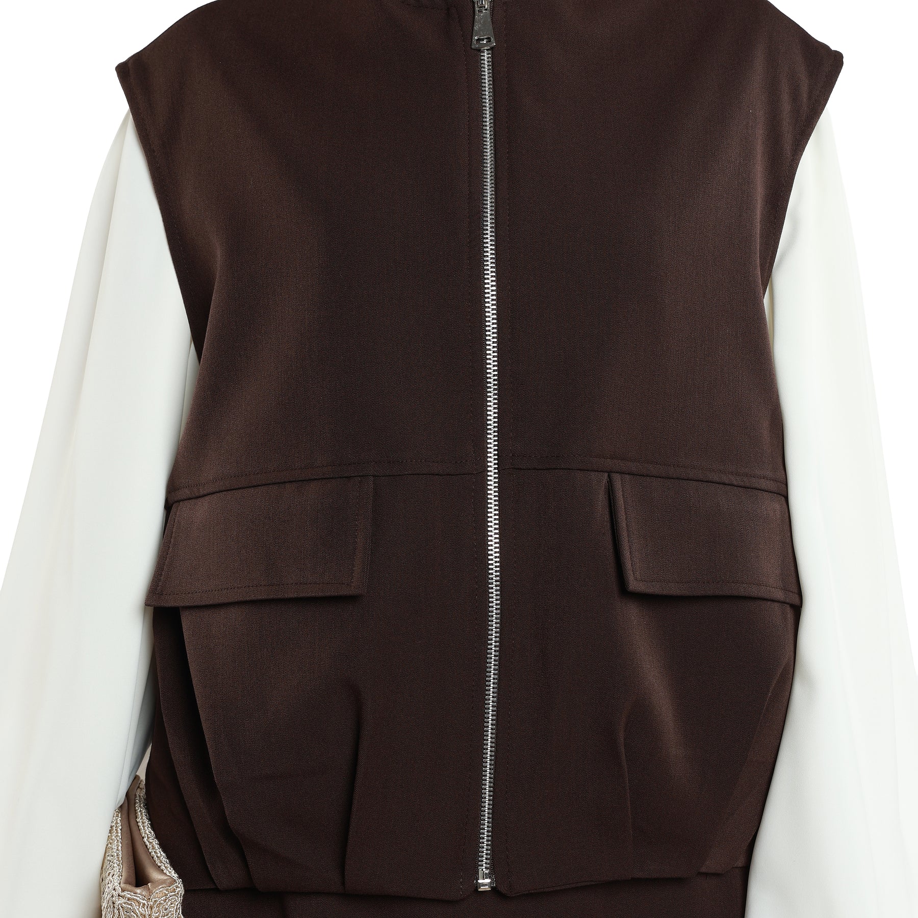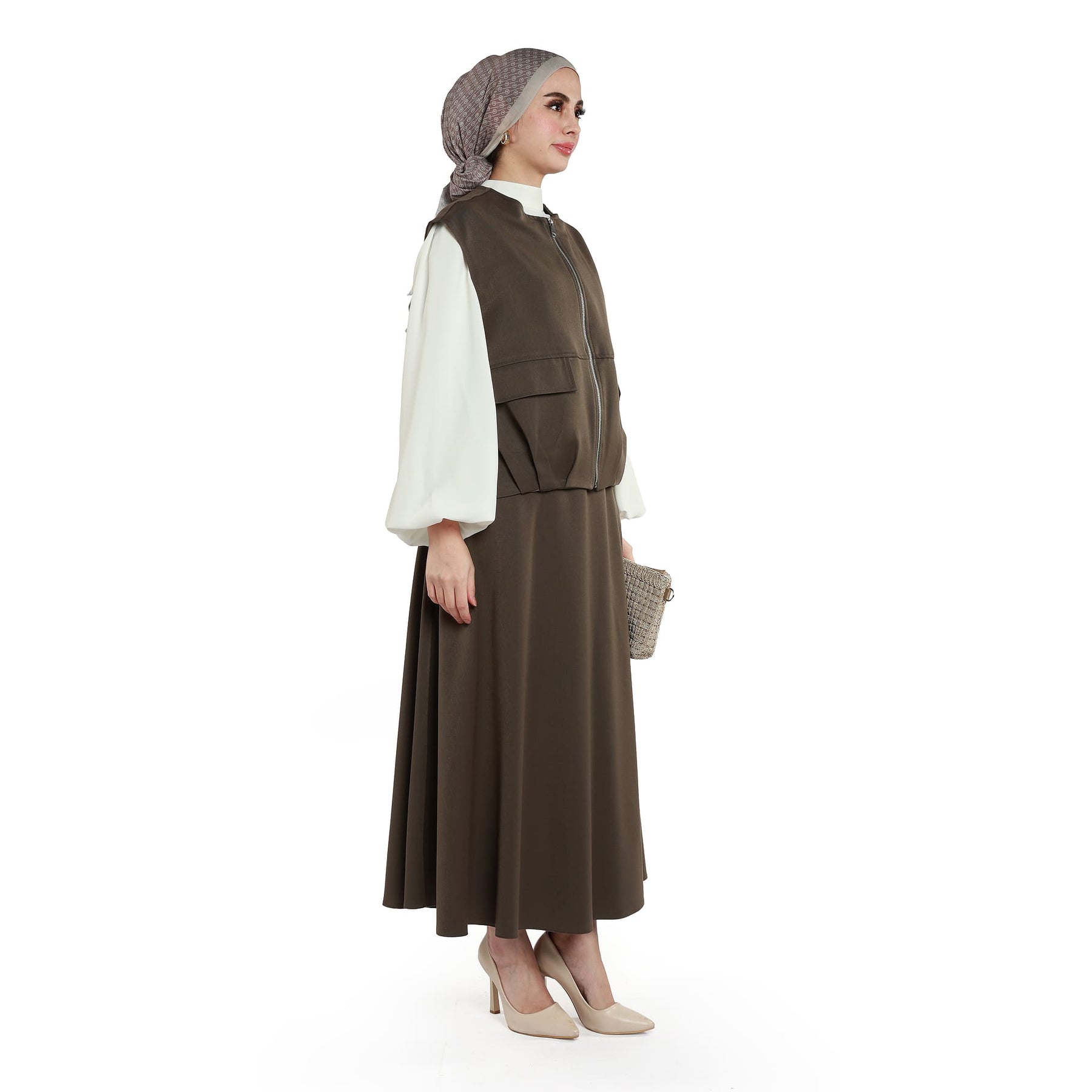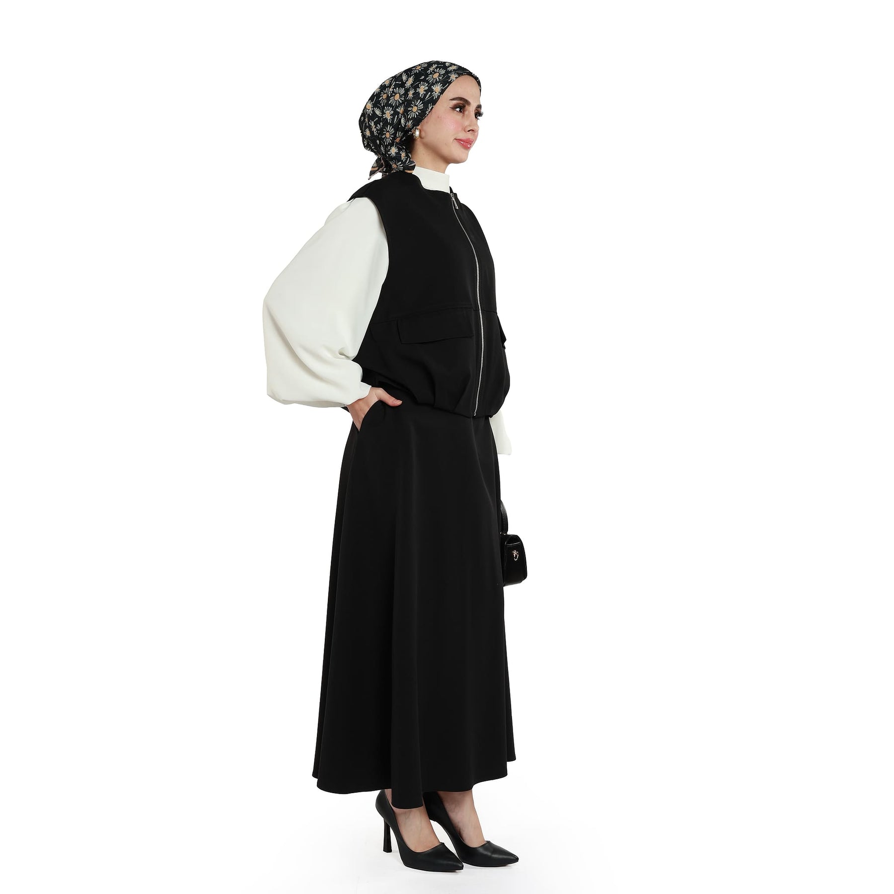 This zip-front skirt set offers a clean and elegant look for everyday wear or the office. Available in khaki, brown and black, it’s easy to style with different blouses and scarves. Pleat details on both the vest and skirt add a subtle touch of movement.