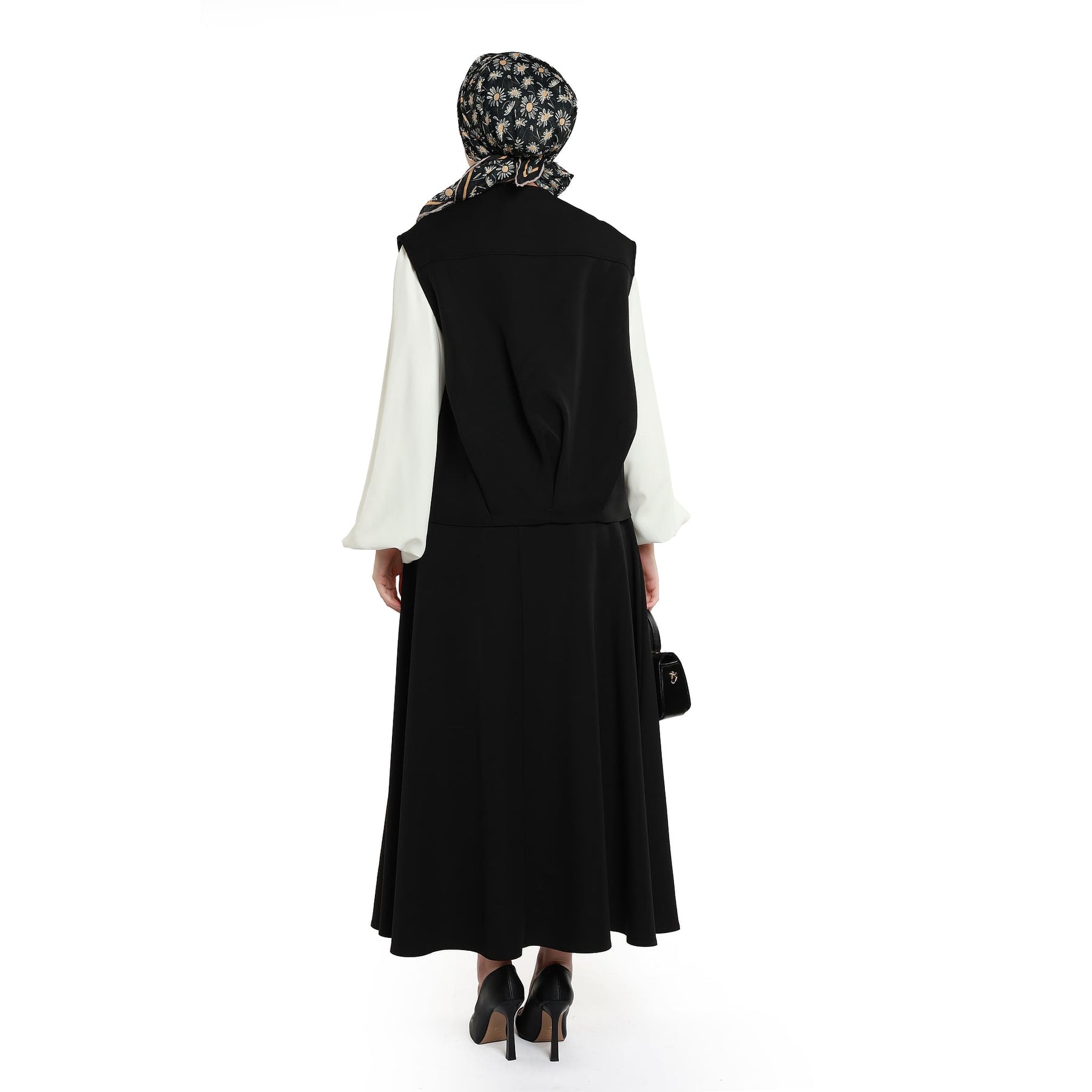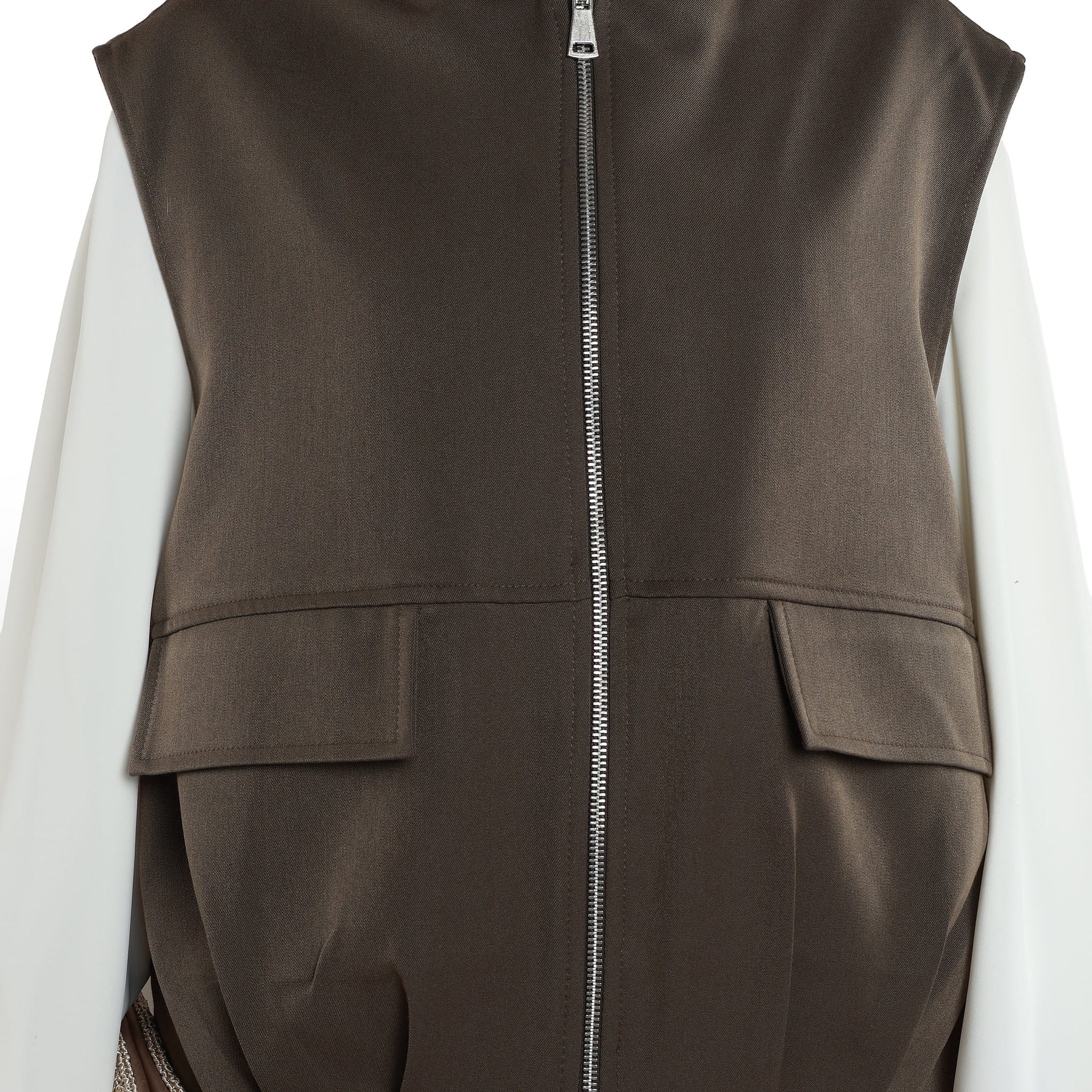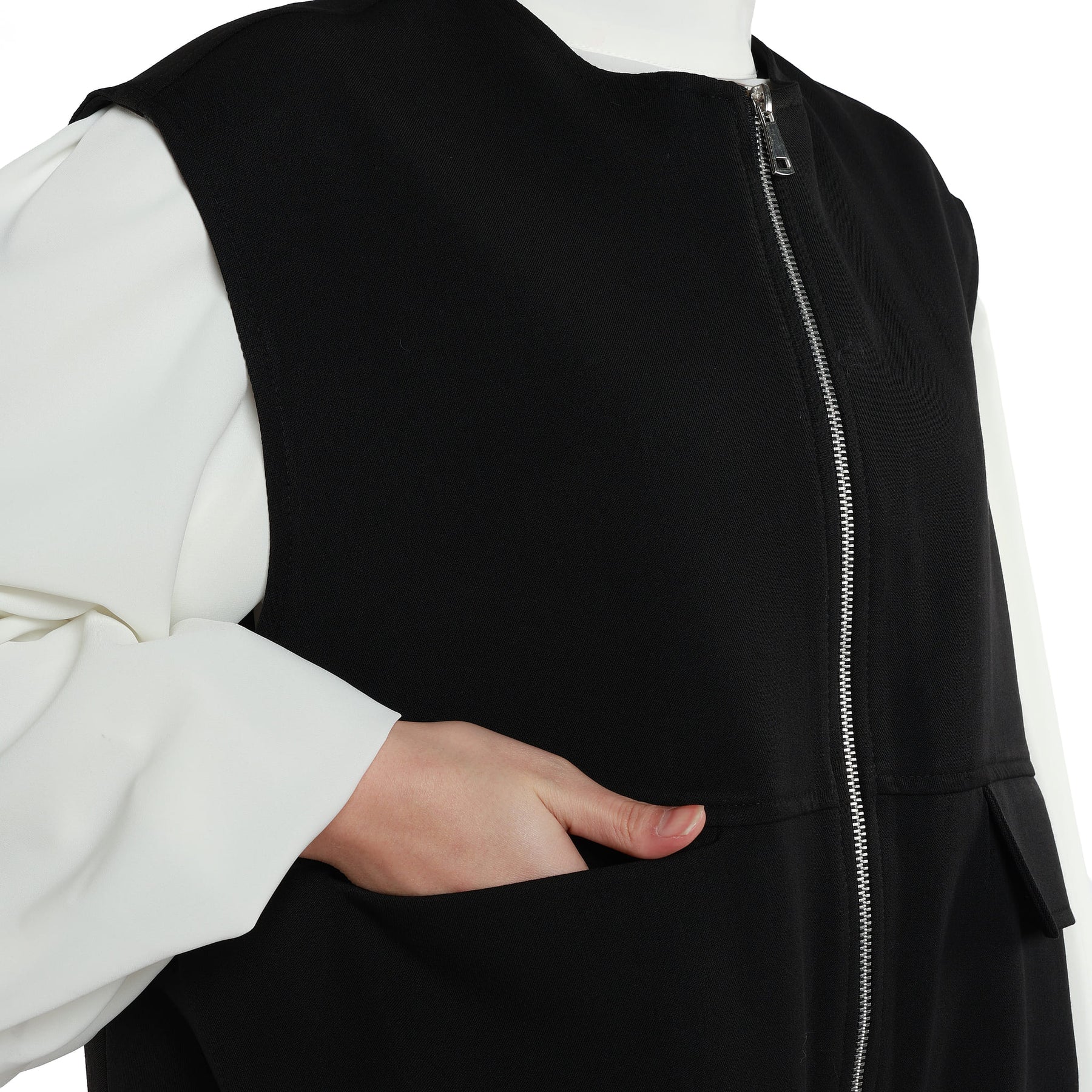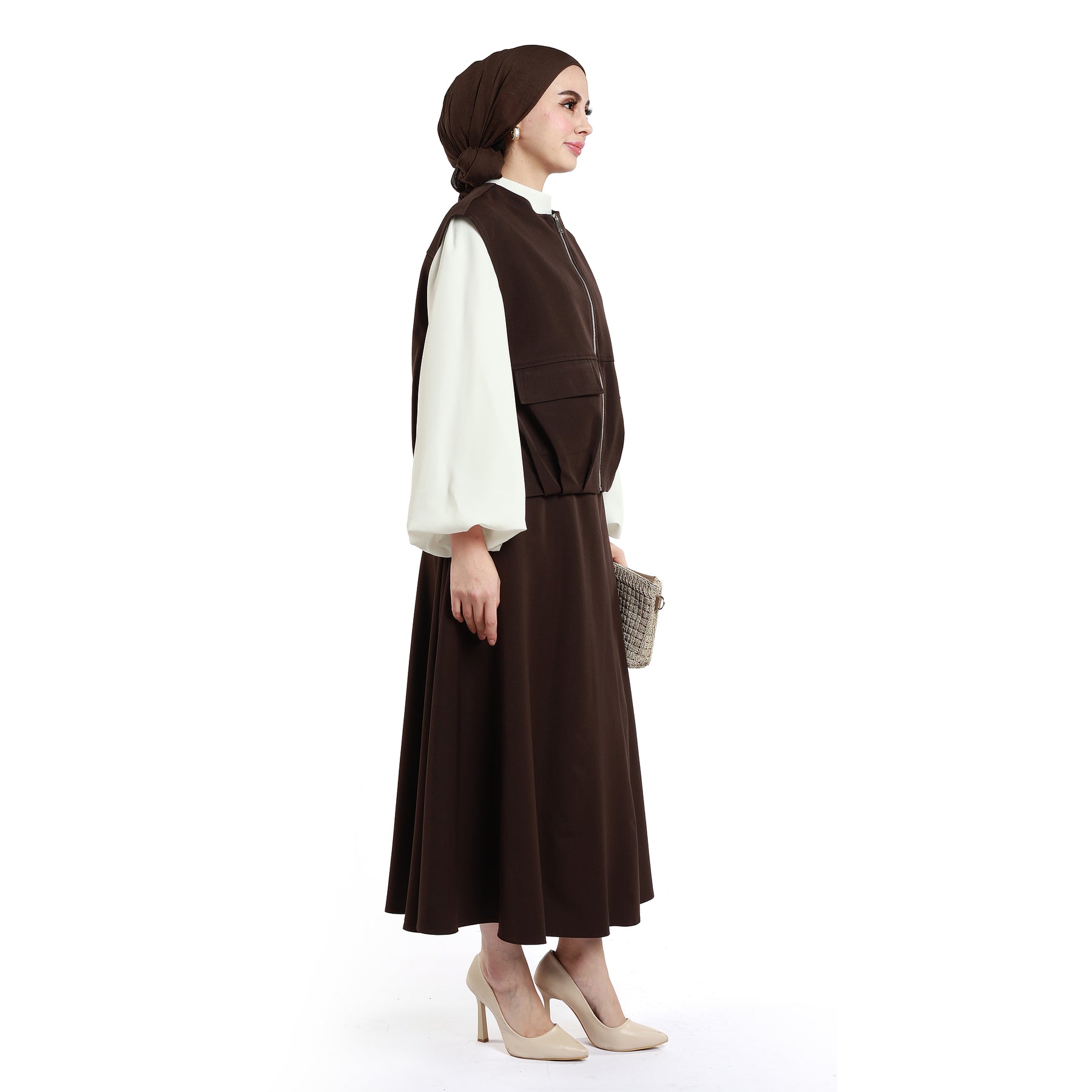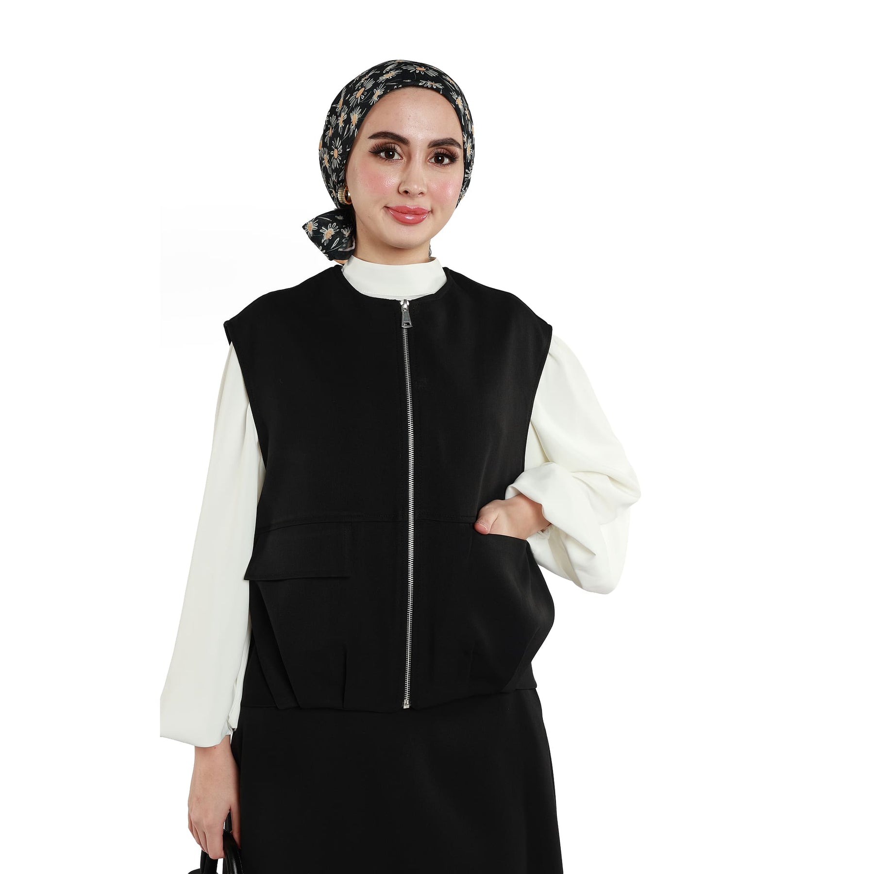This zip-front skirt set offers a clean and elegant look for everyday wear or the office. Available in khaki, brown and black, it’s easy to style with different blouses and scarves. Pleat details on both the vest and skirt add a subtle touch of movement.