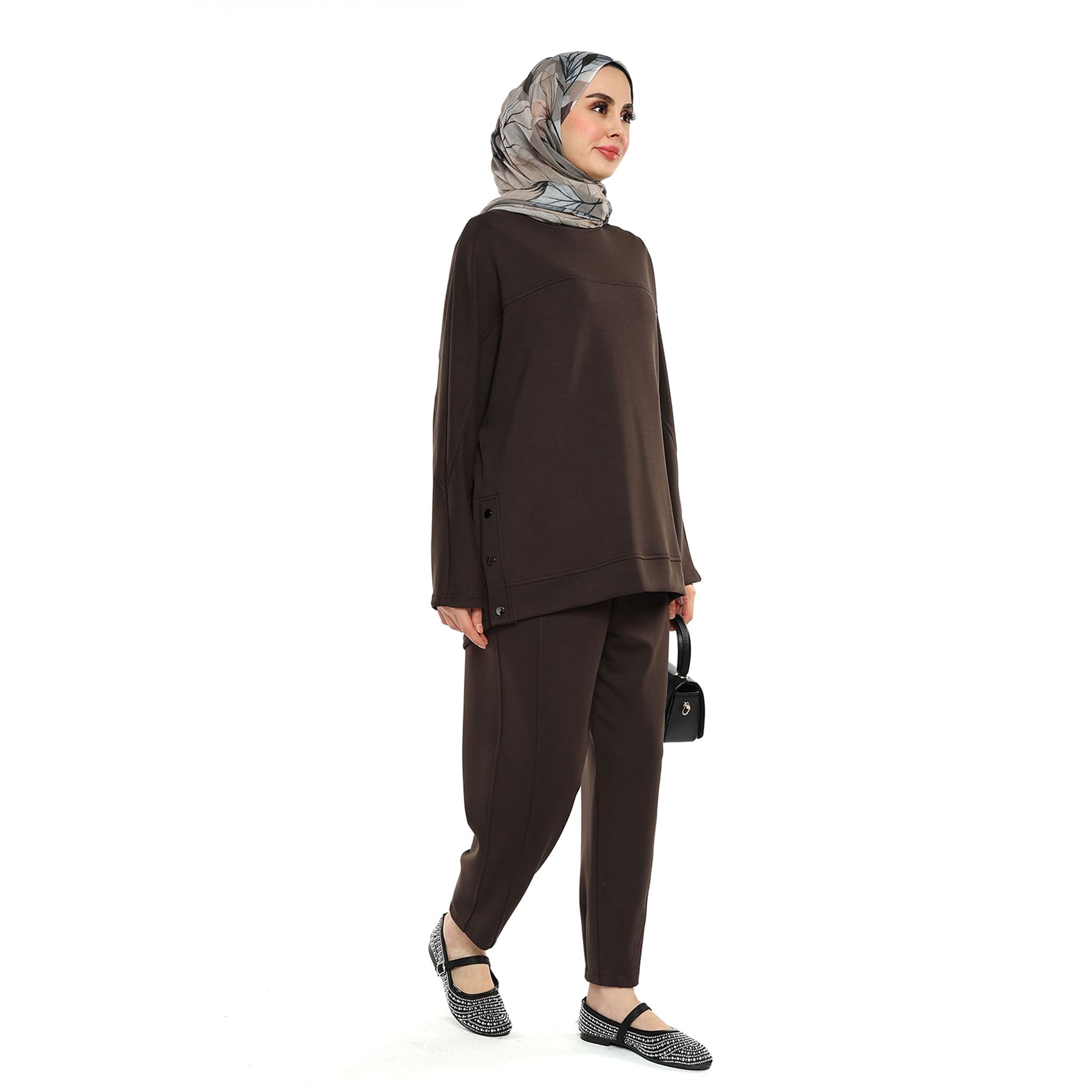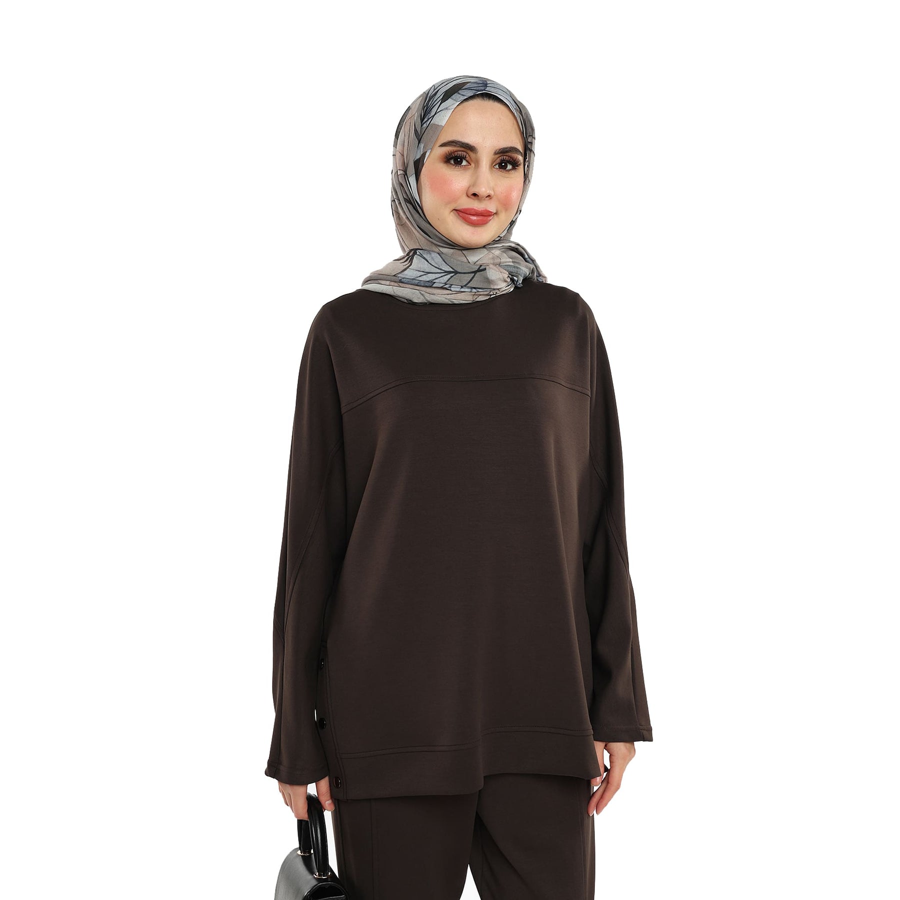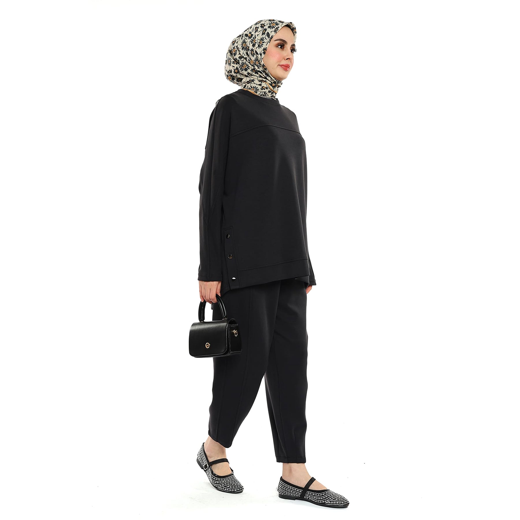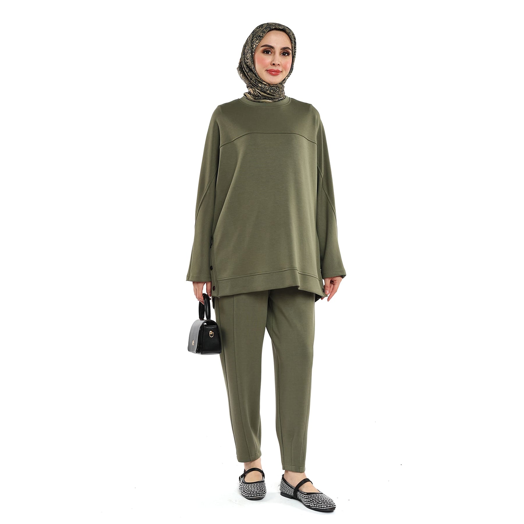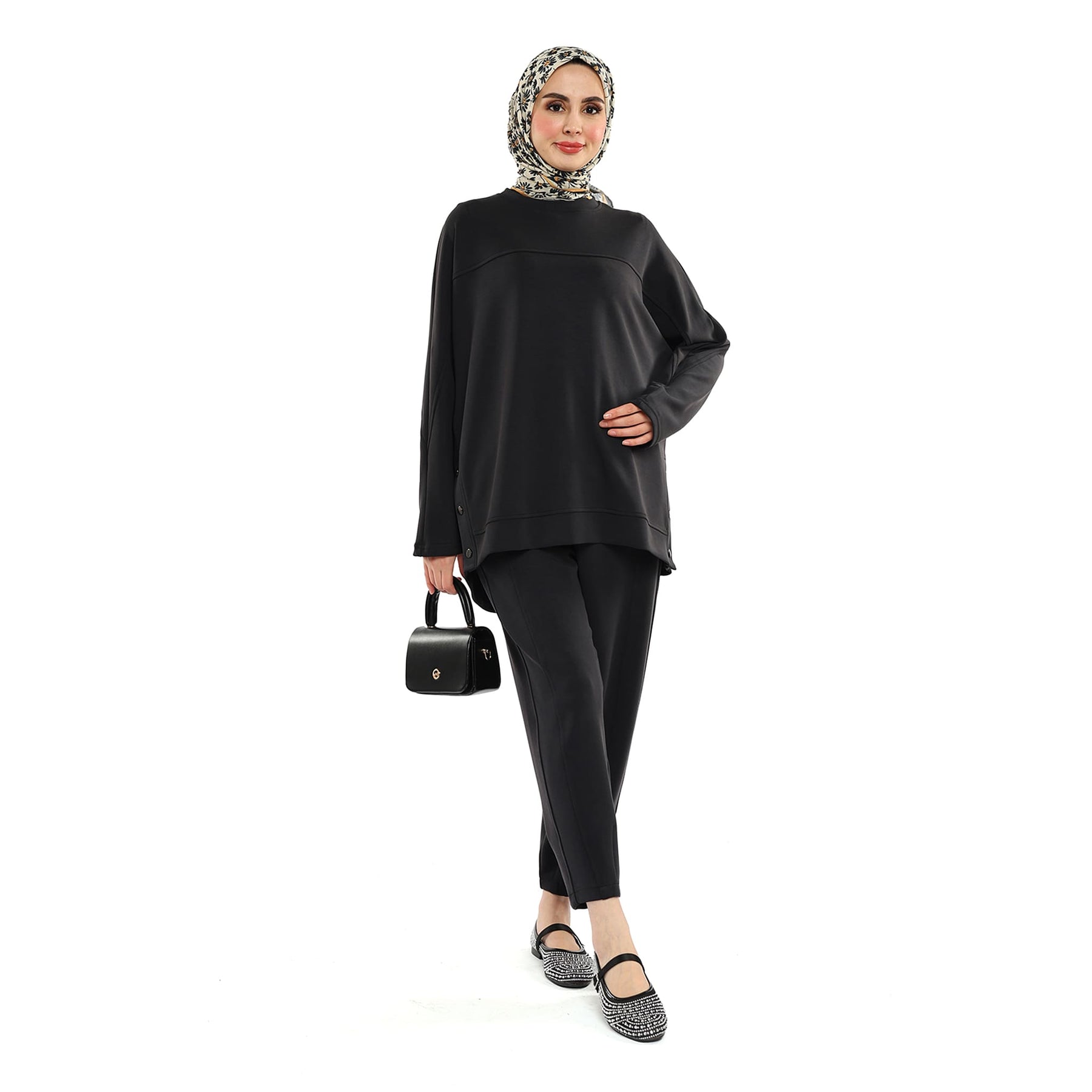 Blending a soft modal touch with a clean, relaxed silhouette, this two-piece set is built for all-day comfort. The top features batwing sleeves for an easy drape, button accents at the front and side slits that add movement and make layering effortless. The matching bottoms come with a comfortable elastic waist and a fluid cut that completes the look without restricting movement. Thanks to its modal-rich composition, the fabric feels breathable and smooth against the skin—ideal for busy days when comfort matters.