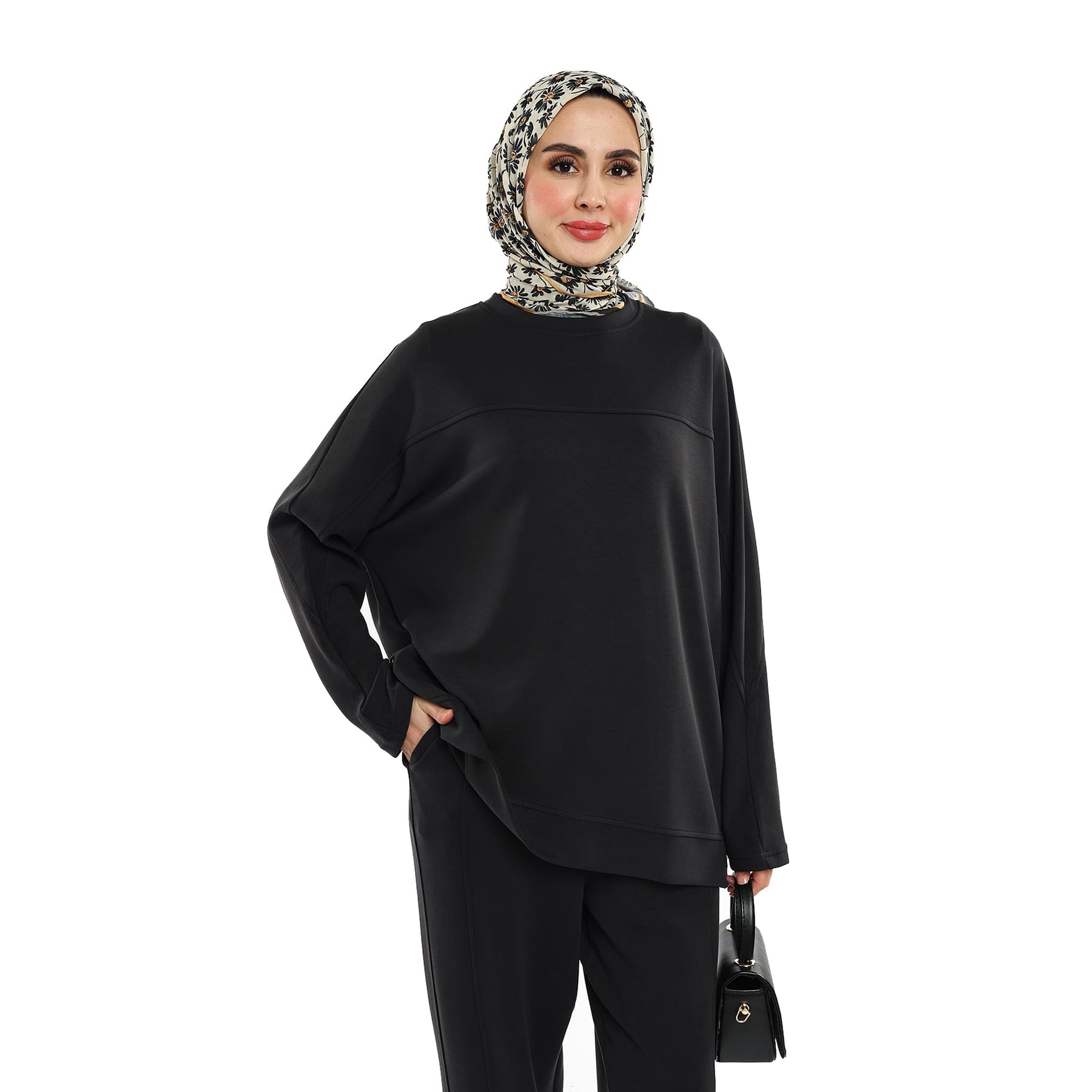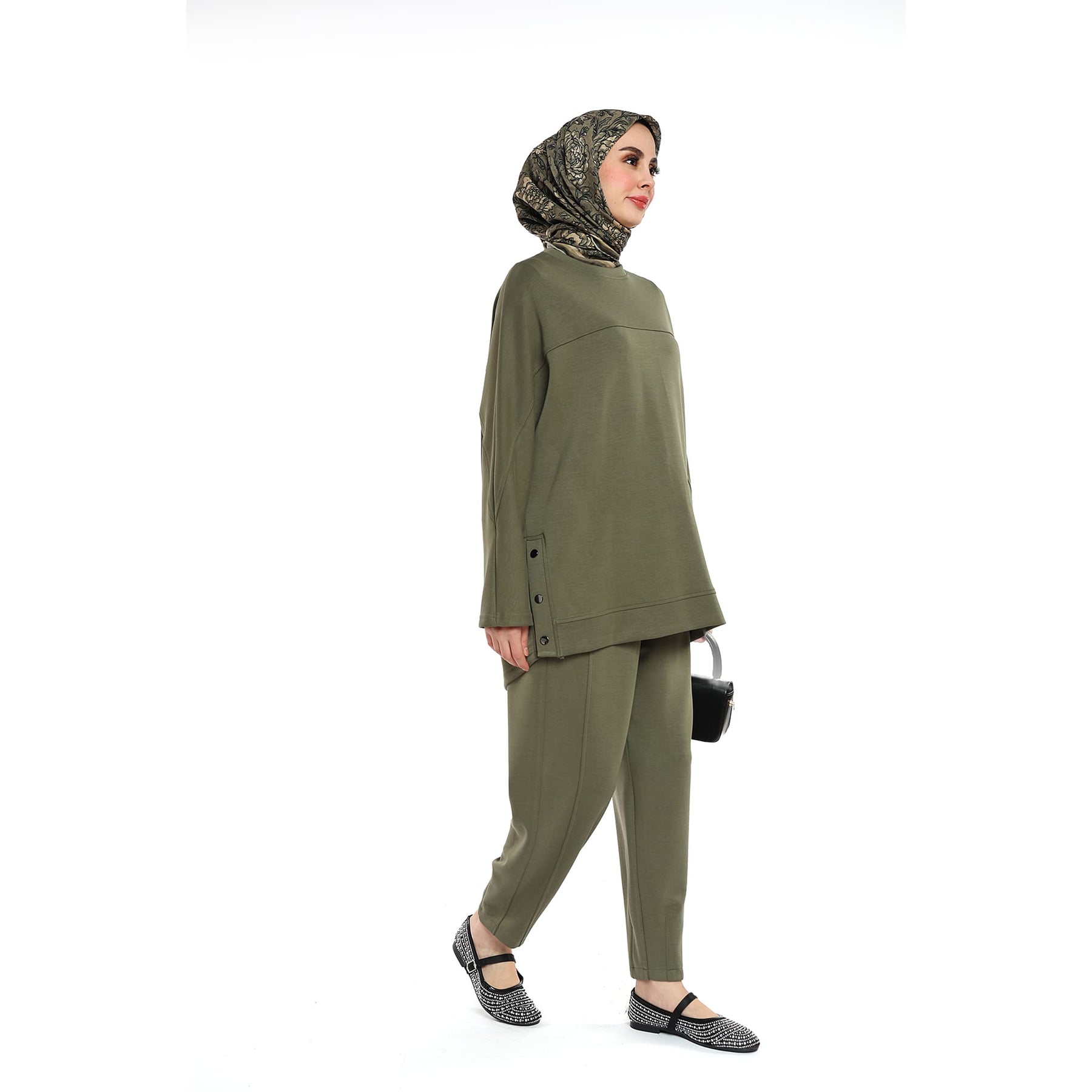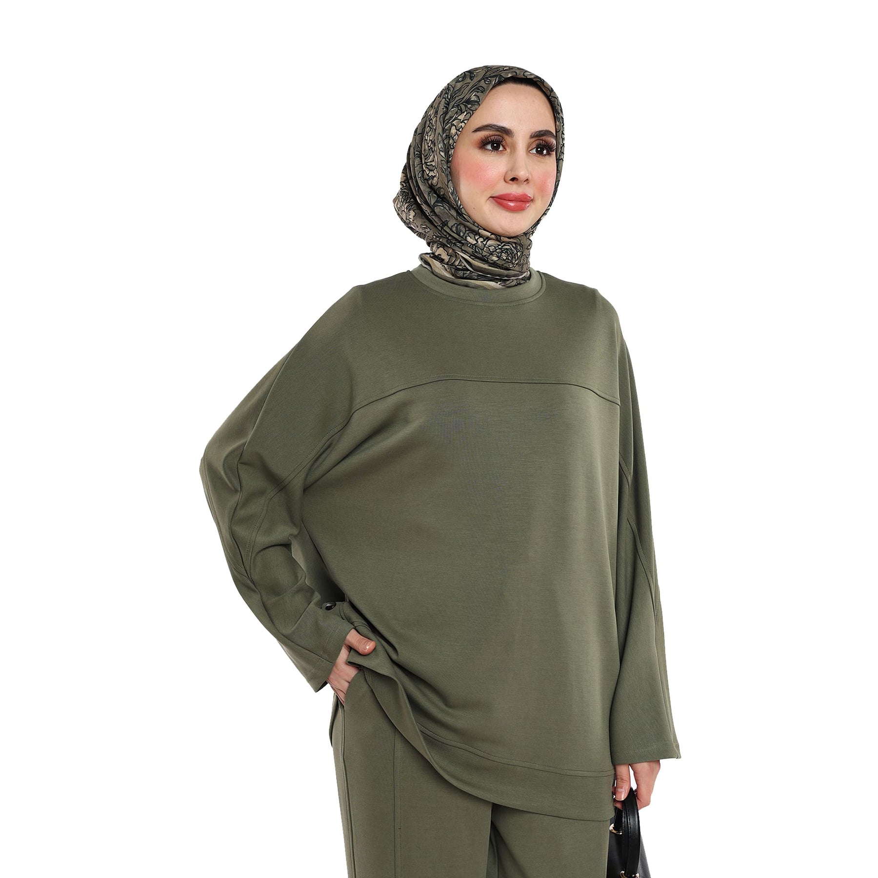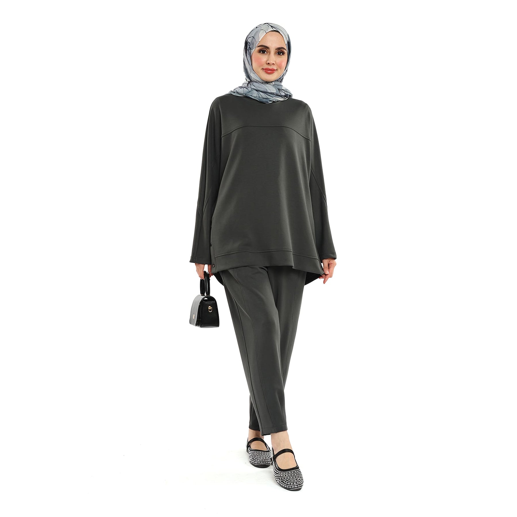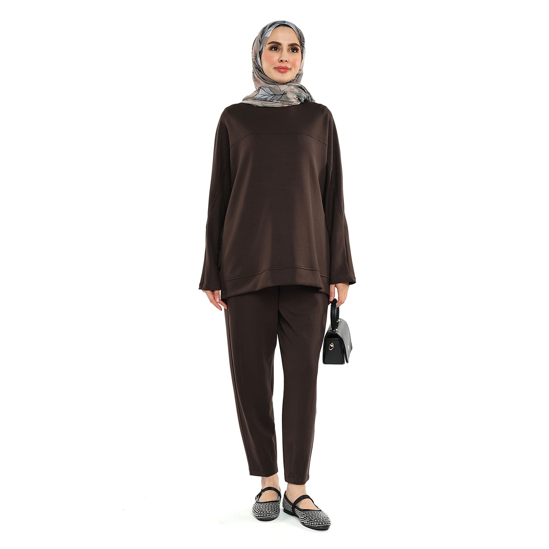 Blending a soft modal touch with a clean, relaxed silhouette, this two-piece set is built for all-day comfort. The top features batwing sleeves for an easy drape, button accents at the front and side slits that add movement and make layering effortless. The matching bottoms come with a comfortable elastic waist and a fluid cut that completes the look without restricting movement. Thanks to its modal-rich composition, the fabric feels breathable and smooth against the skin—ideal for busy days when comfort matters.