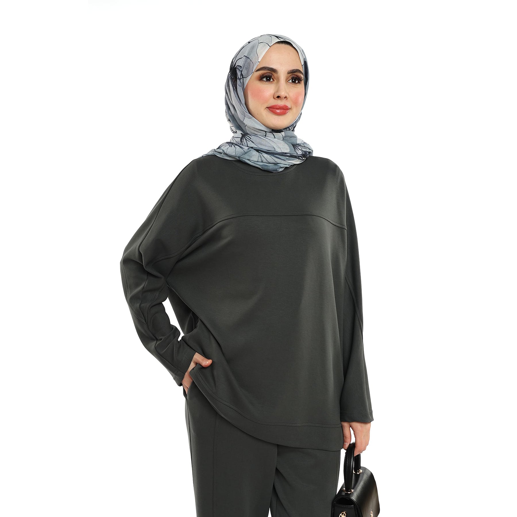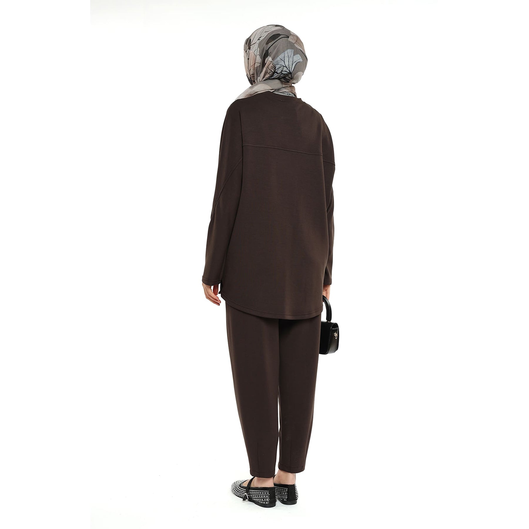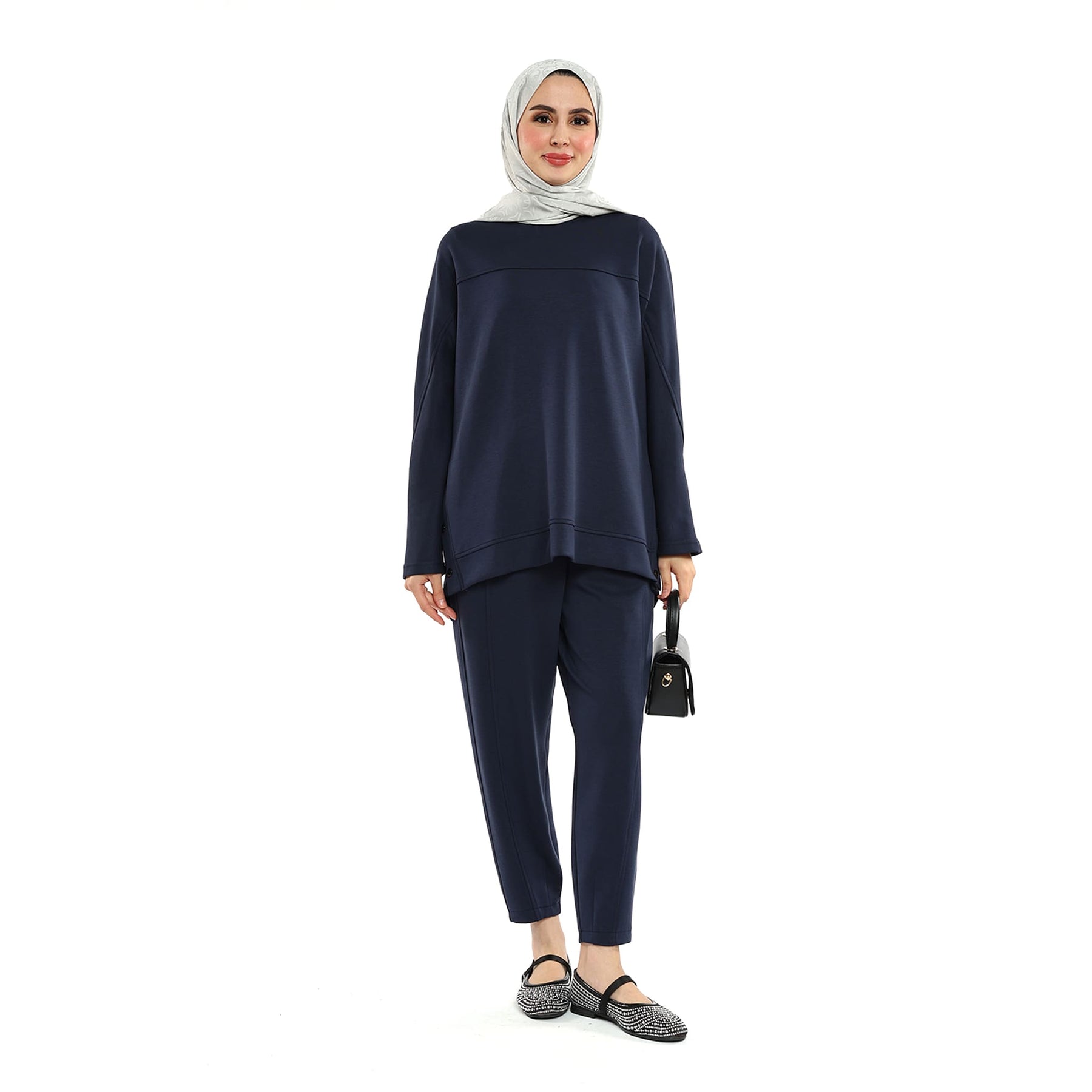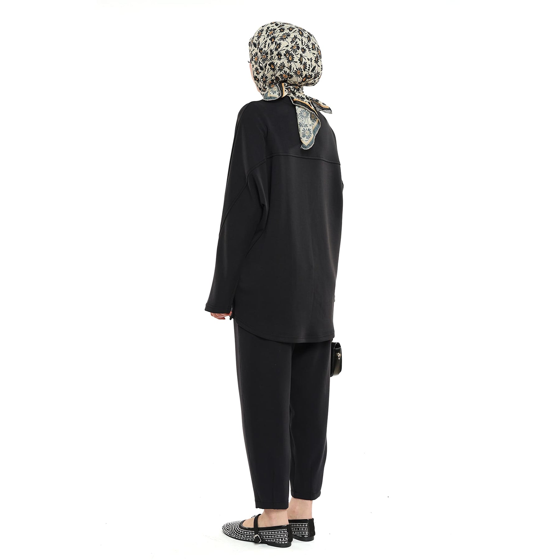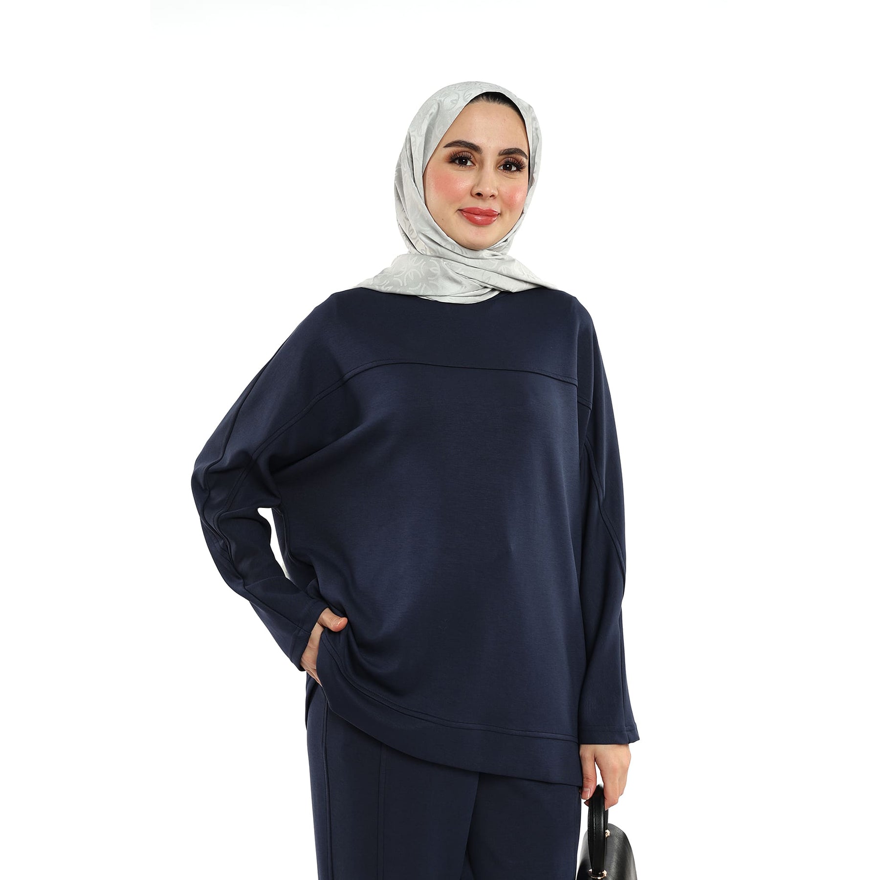 Blending a soft modal touch with a clean, relaxed silhouette, this two-piece set is built for all-day comfort. The top features batwing sleeves for an easy drape, button accents at the front and side slits that add movement and make layering effortless. The matching bottoms come with a comfortable elastic waist and a fluid cut that completes the look without restricting movement. Thanks to its modal-rich composition, the fabric feels breathable and smooth against the skin—ideal for busy days when comfort matters.