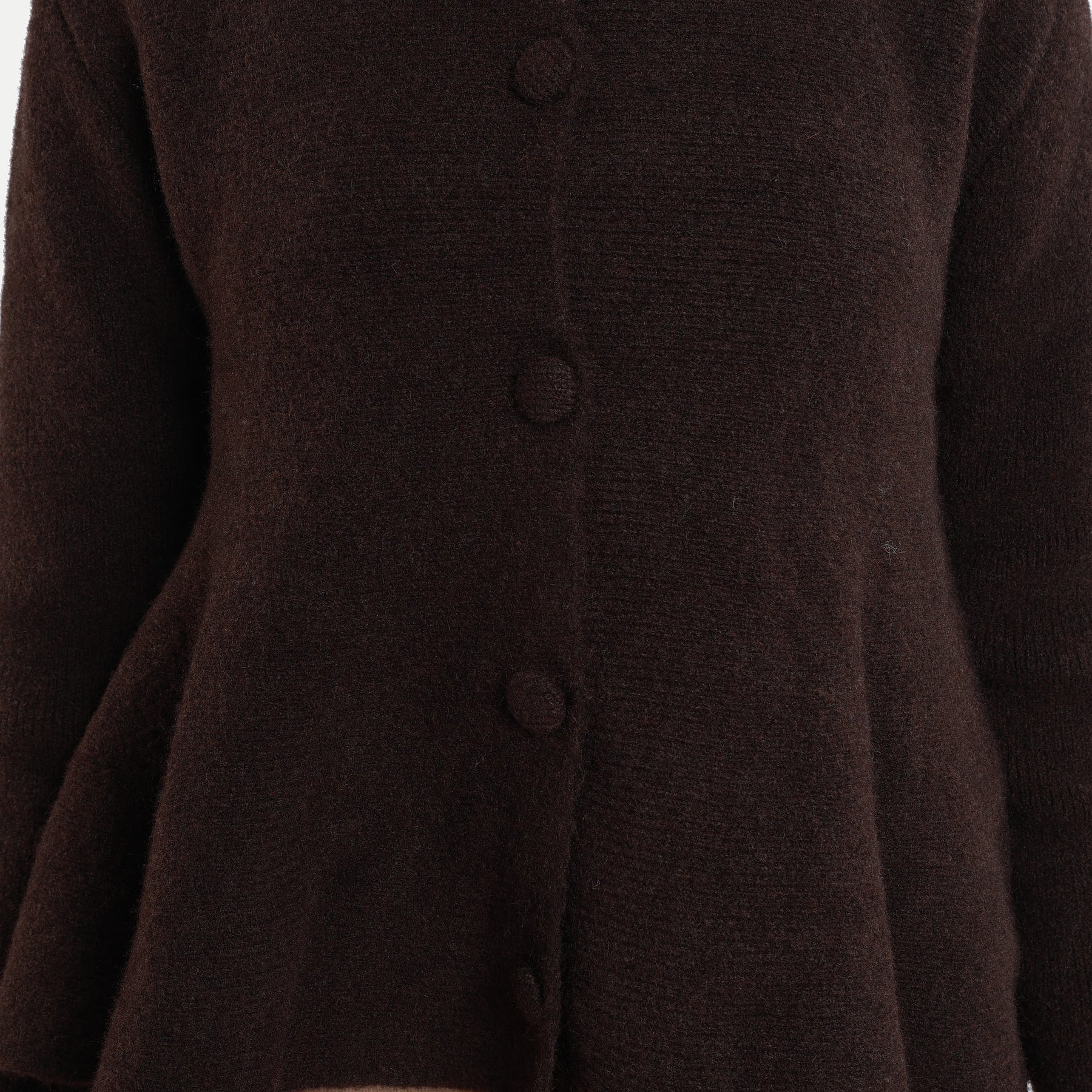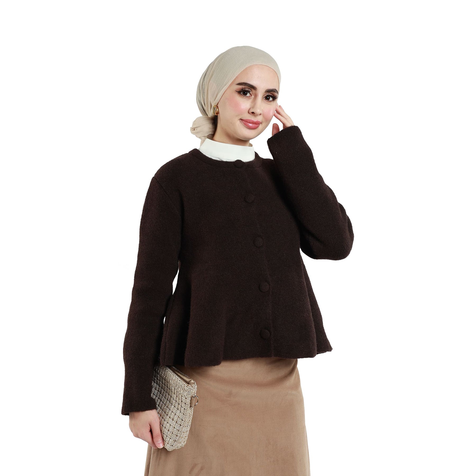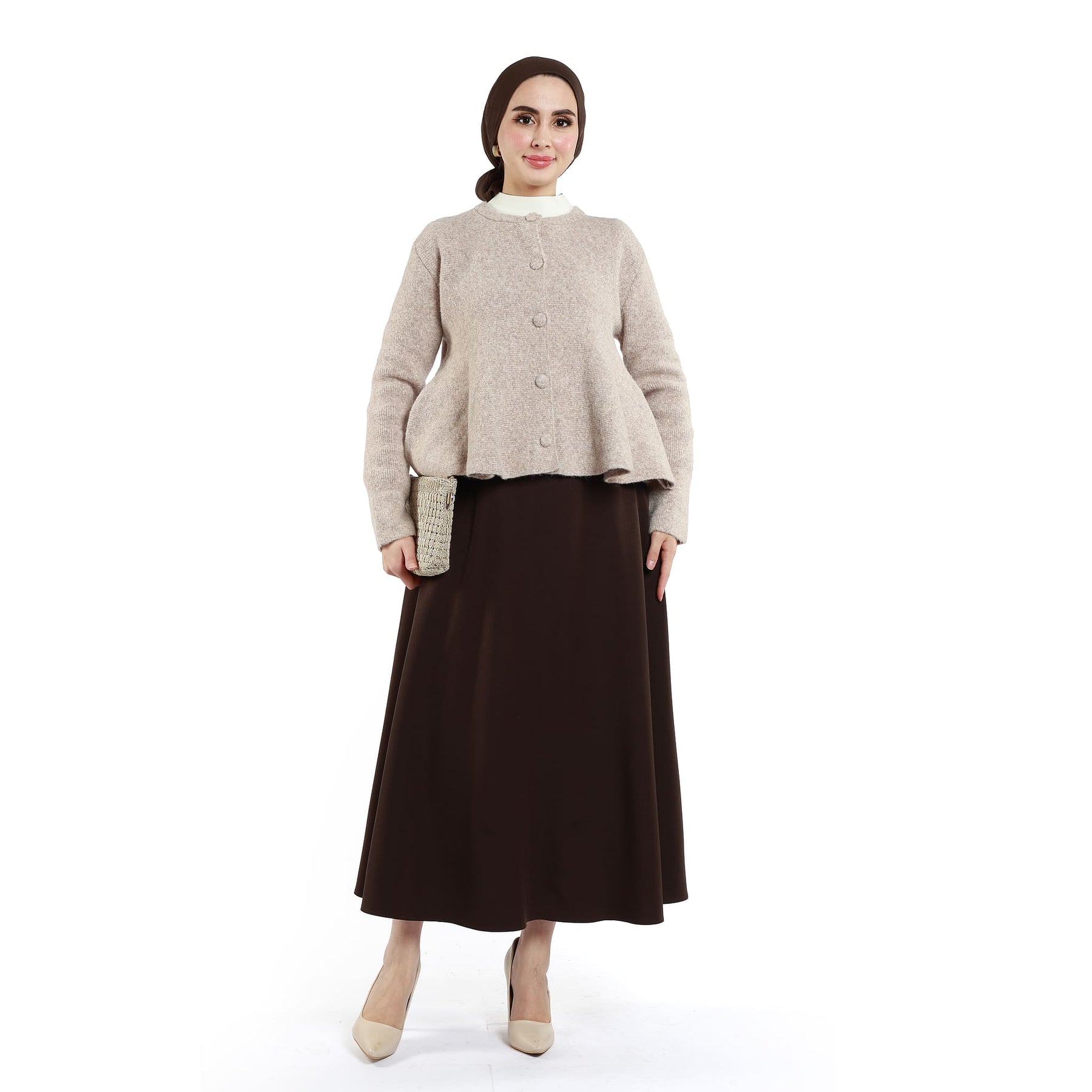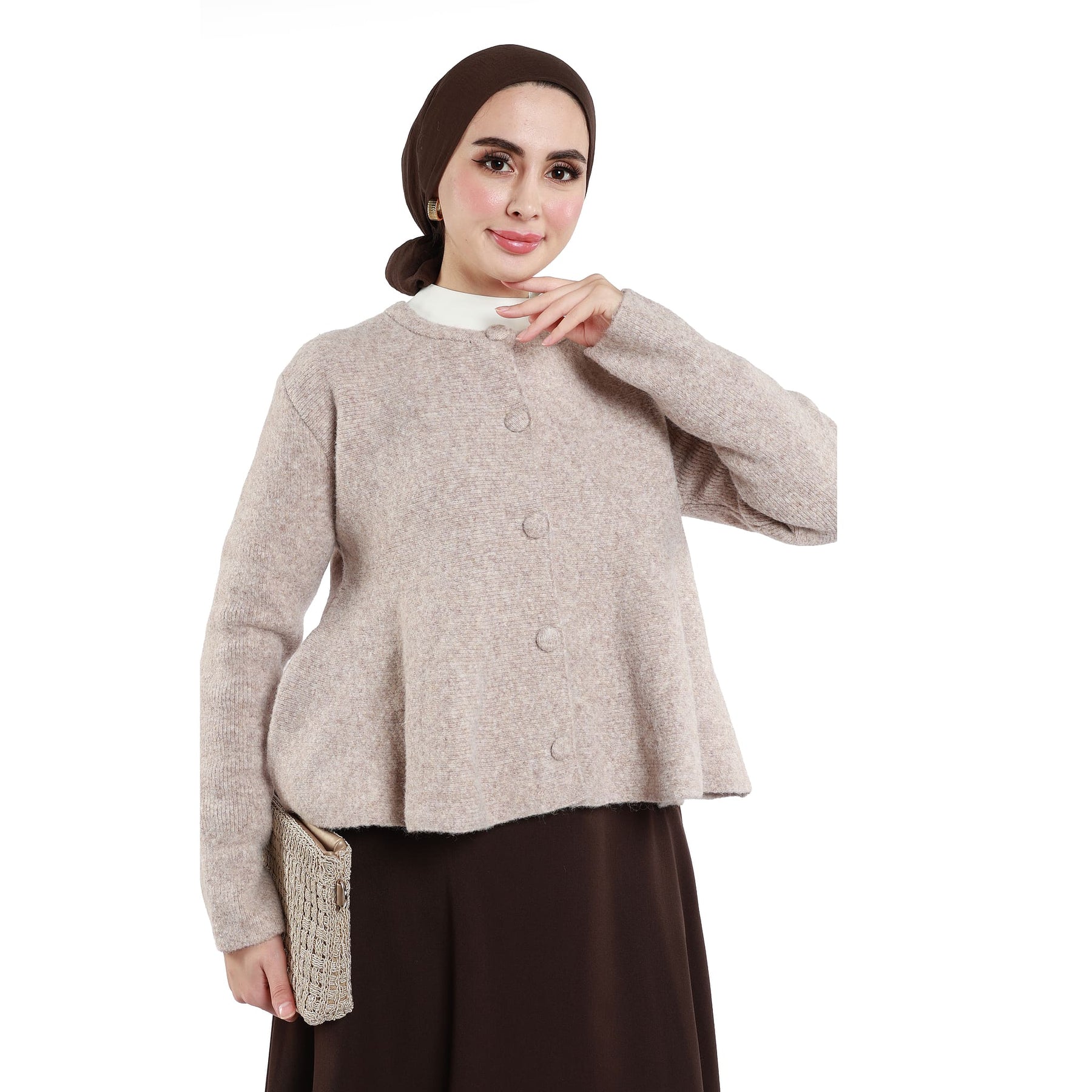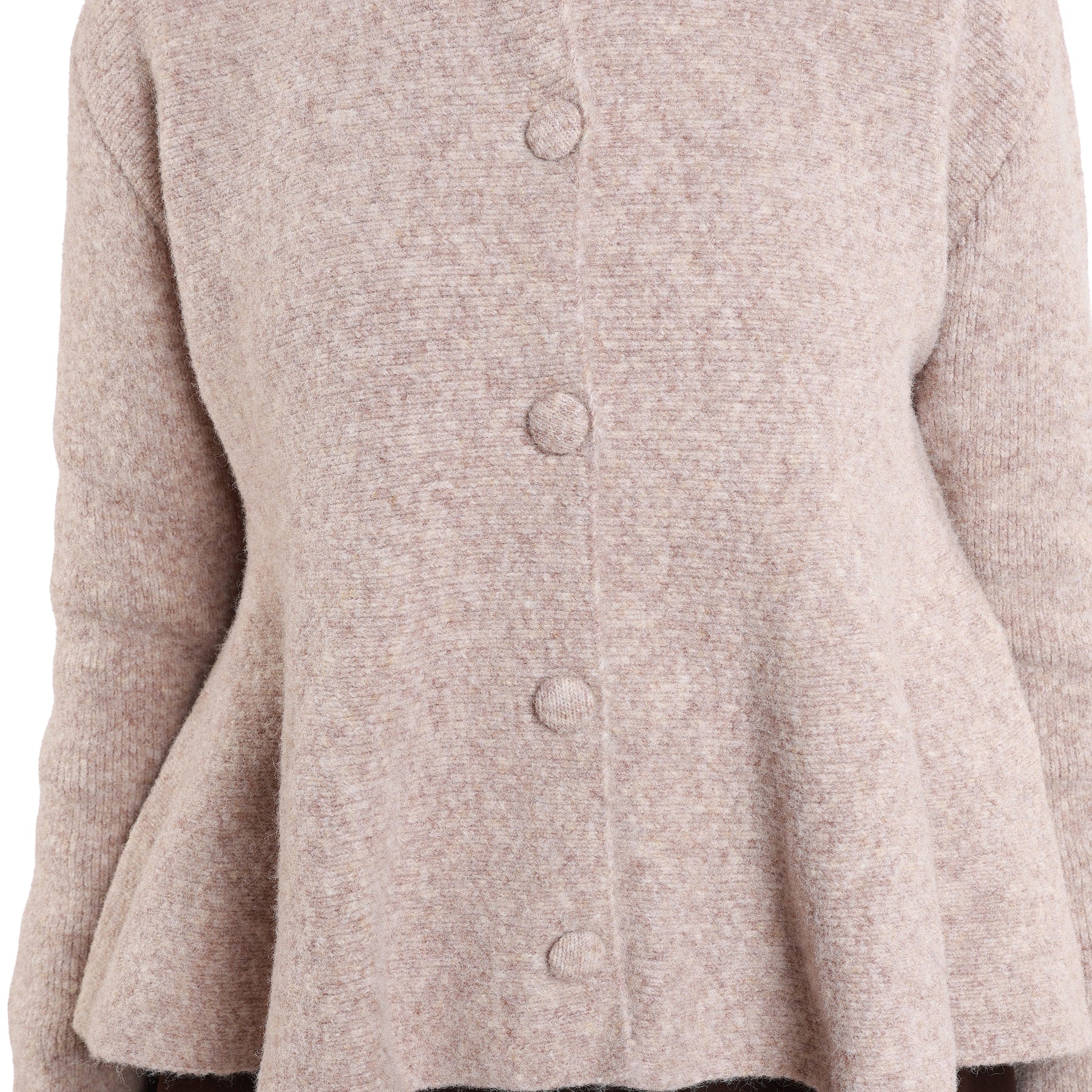 This knit cardigan adds a soft, feminine touch to everyday outfits with its ruffled hem and fabric-covered buttons. Available in beige, grey and brown, it’s easy to style with jeans or tailored trousers and ideal for winter days.