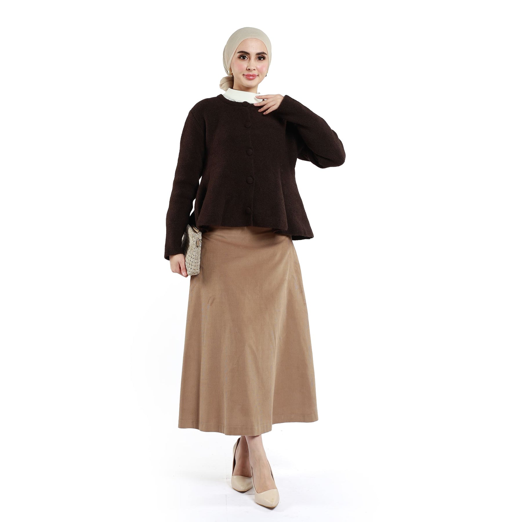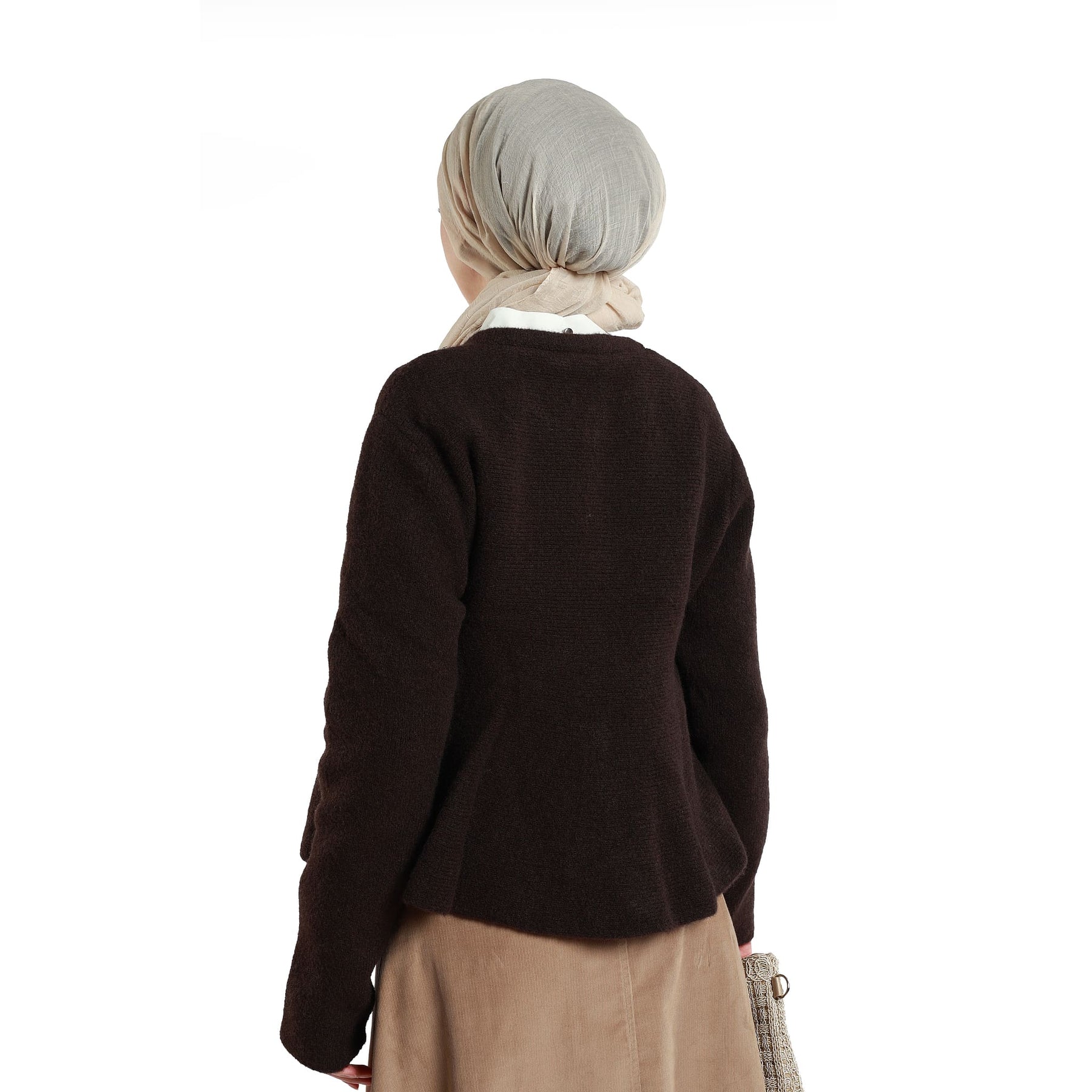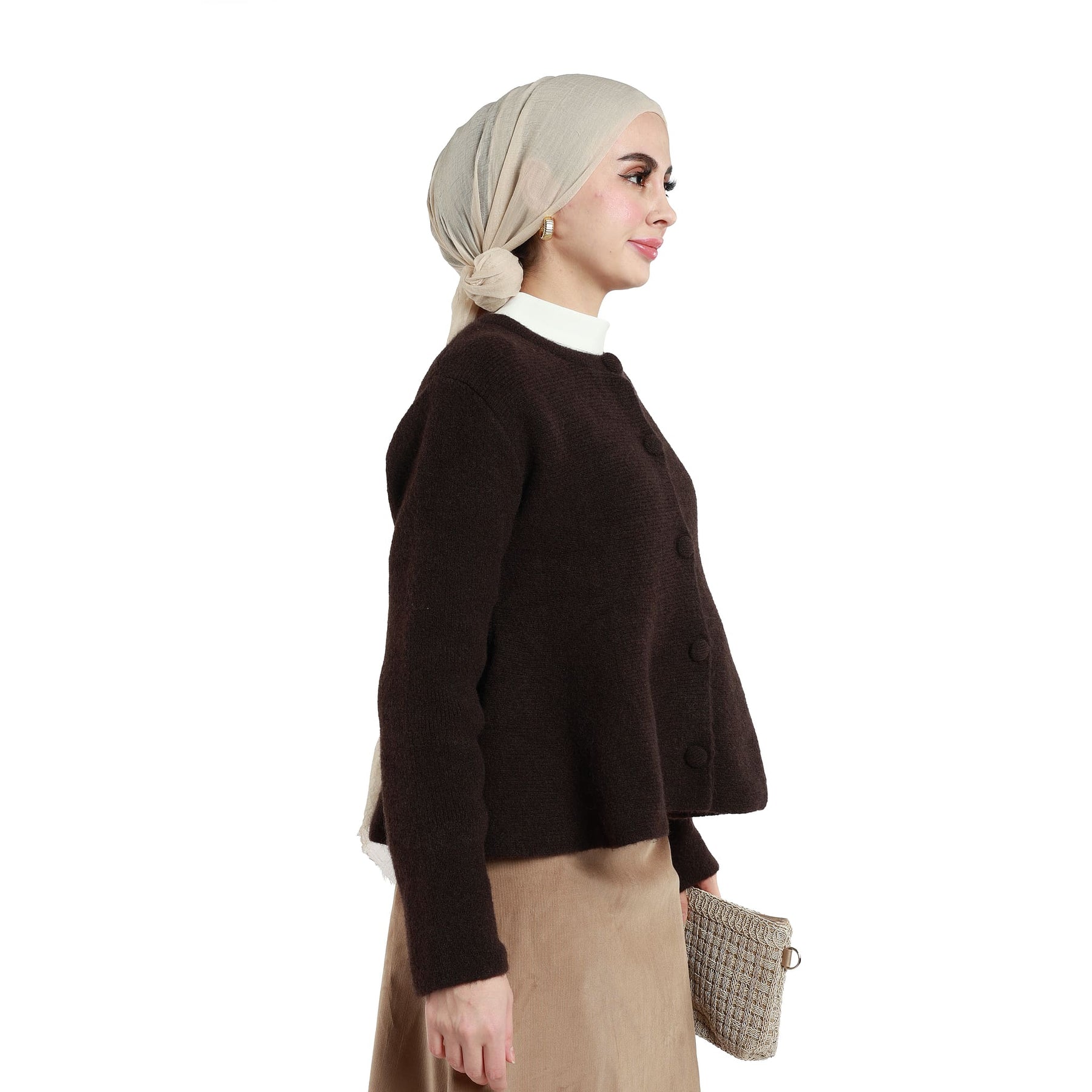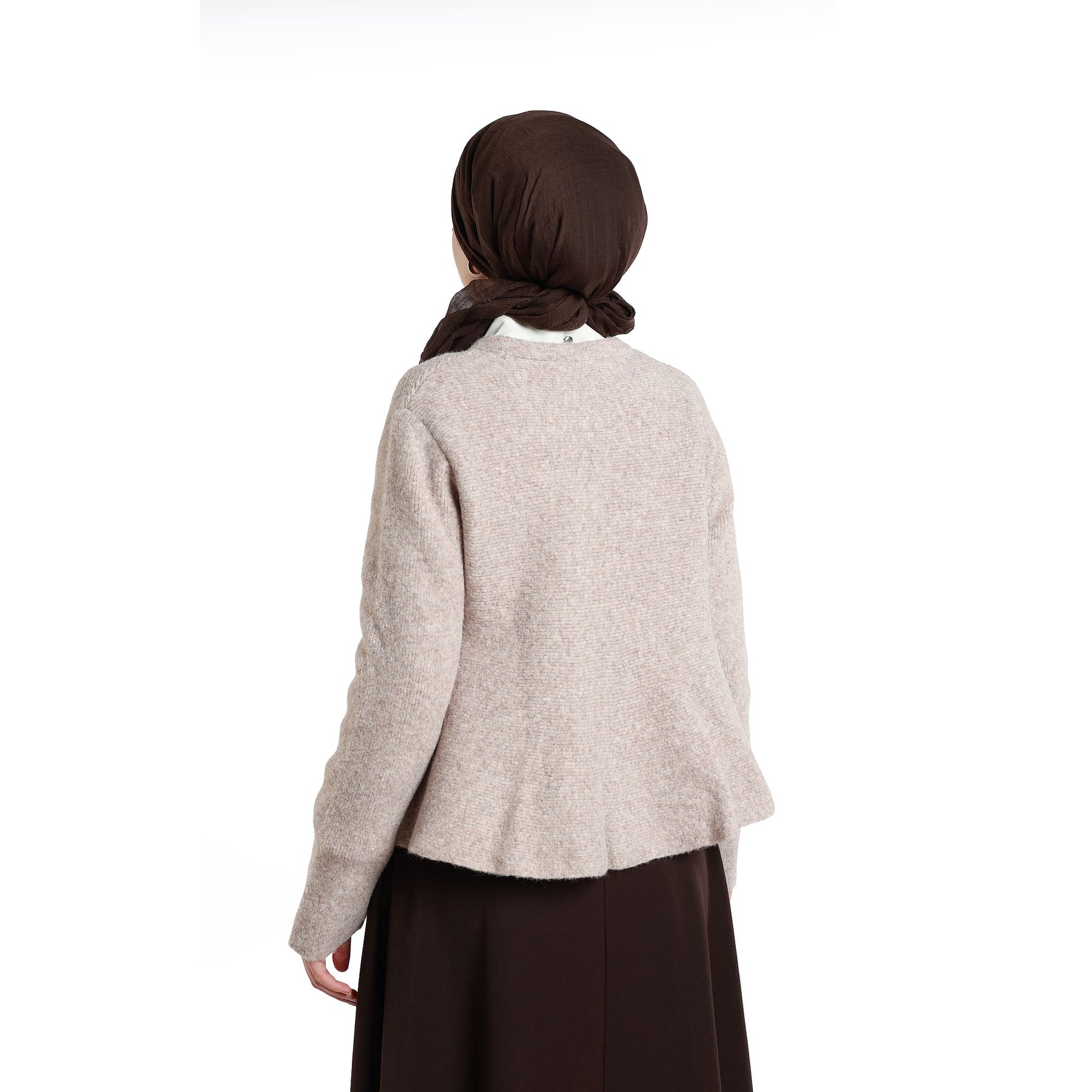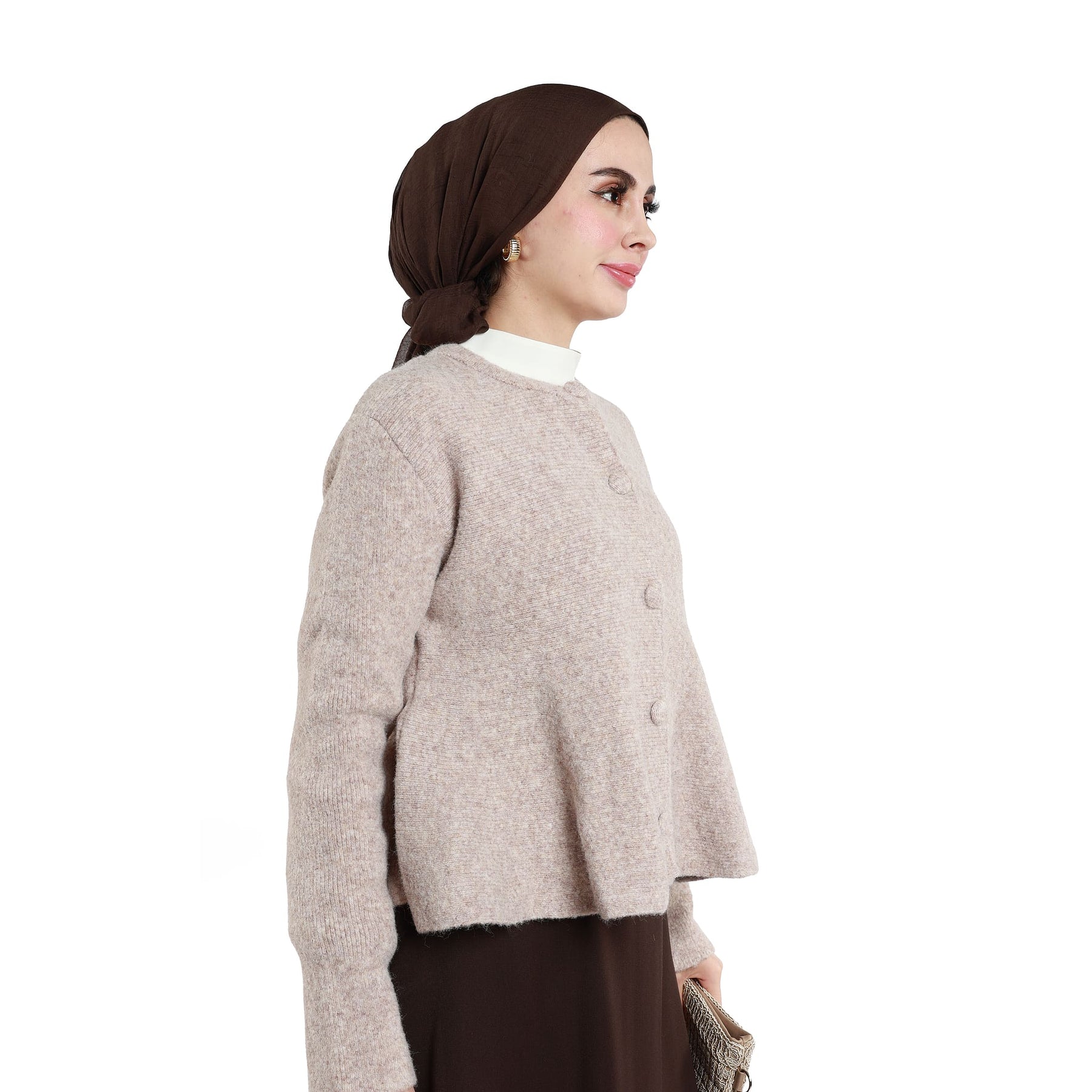 This knit cardigan adds a soft, feminine touch to everyday outfits with its ruffled hem and fabric-covered buttons. Available in beige, grey and brown, it’s easy to style with jeans or tailored trousers and ideal for winter days.