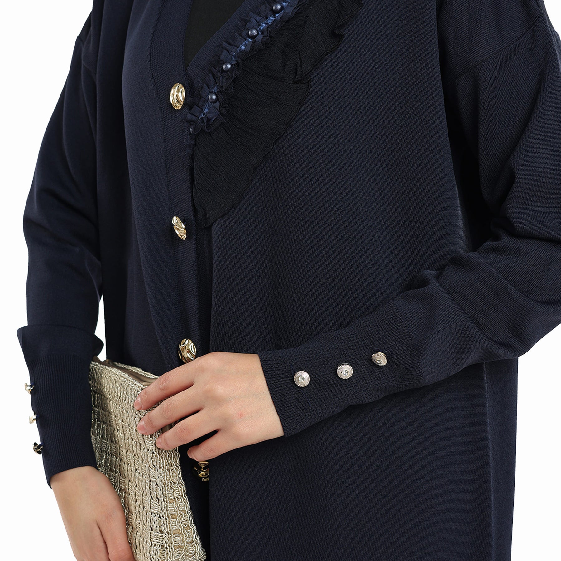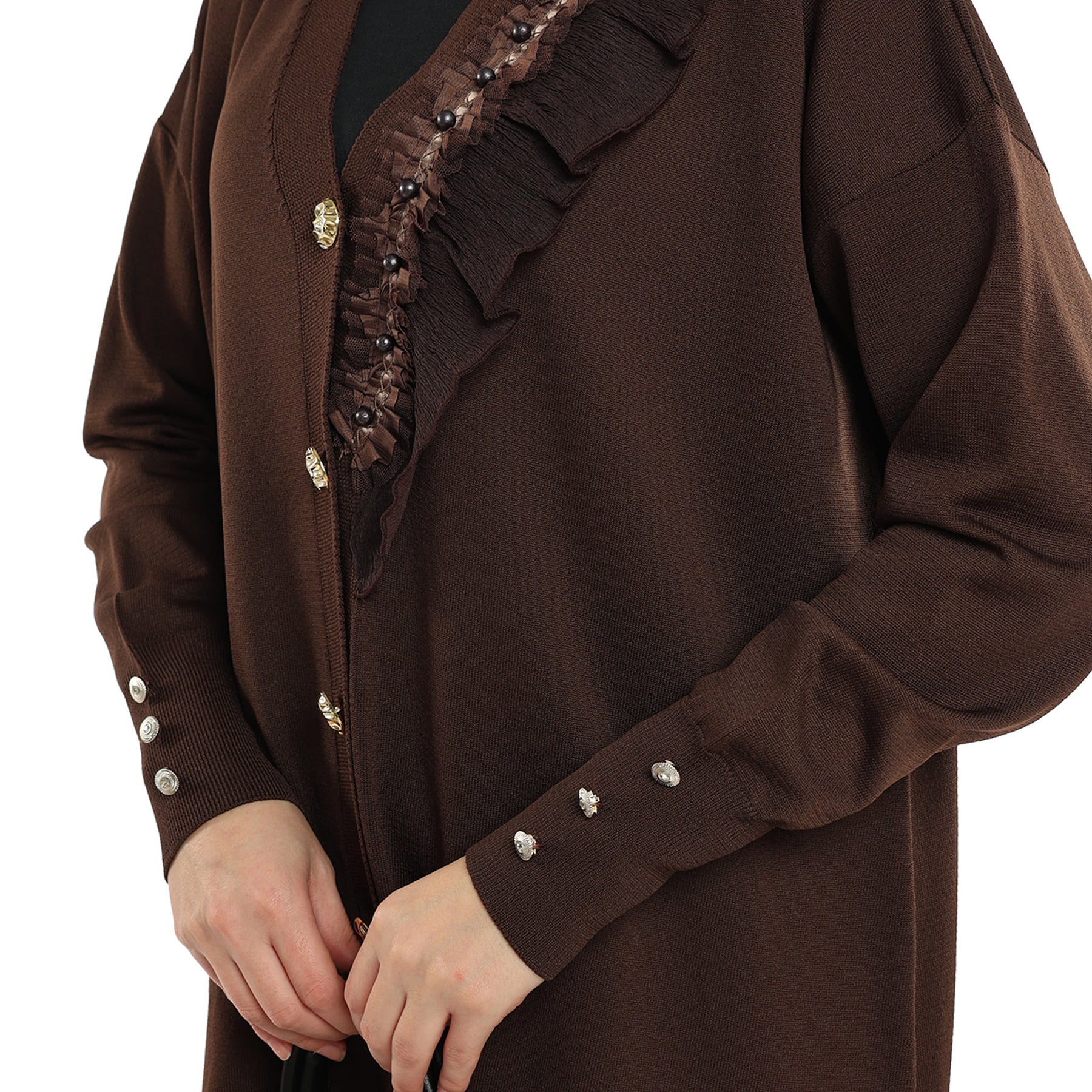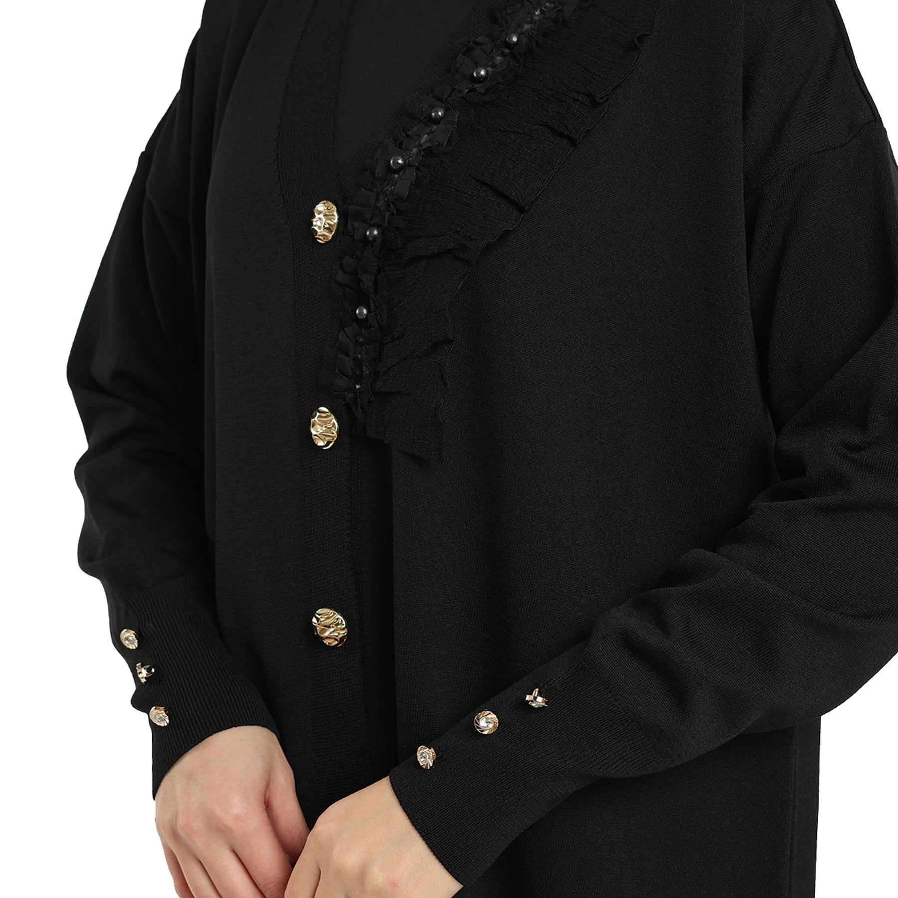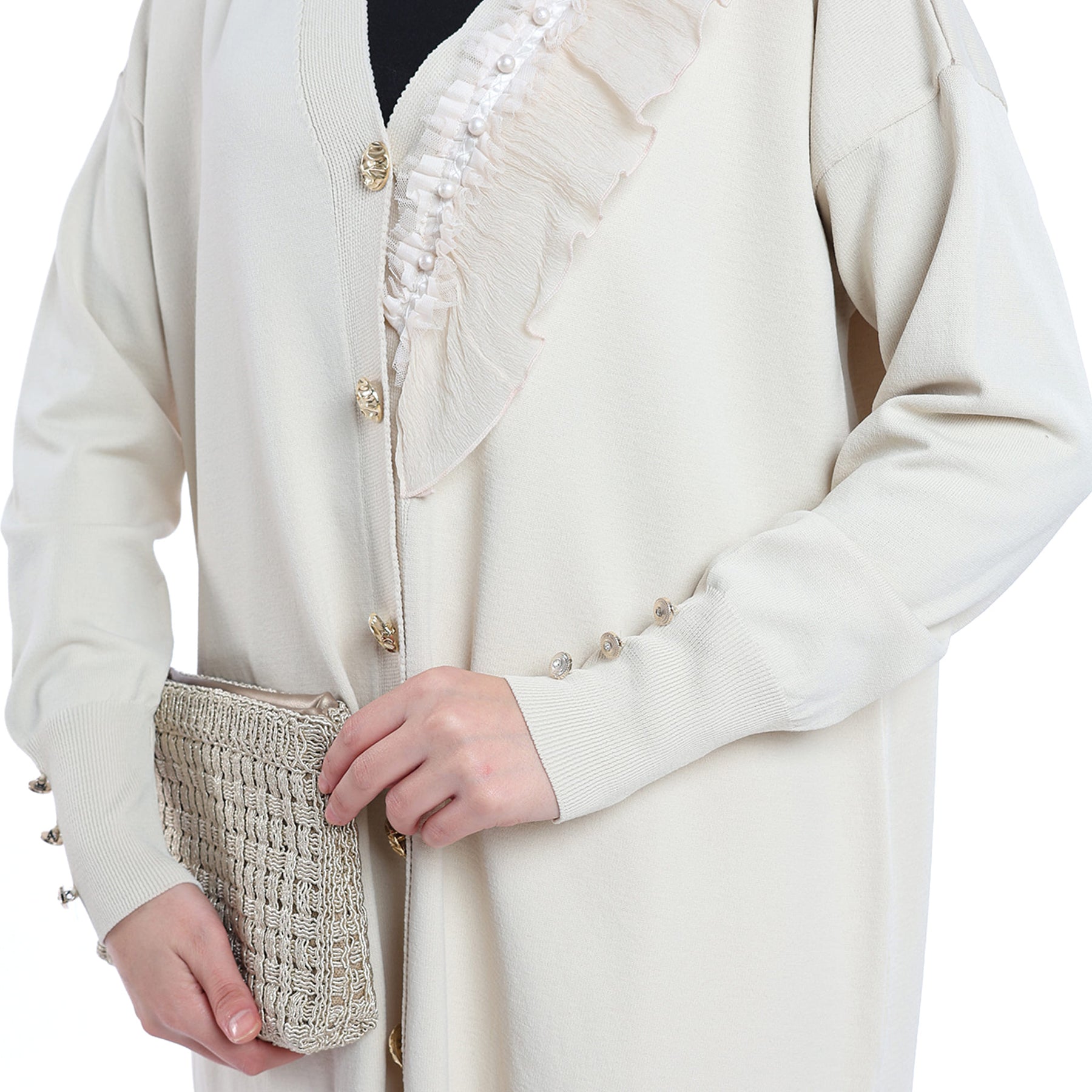 Model: Gold-button cardigan with pearl ruffle trim