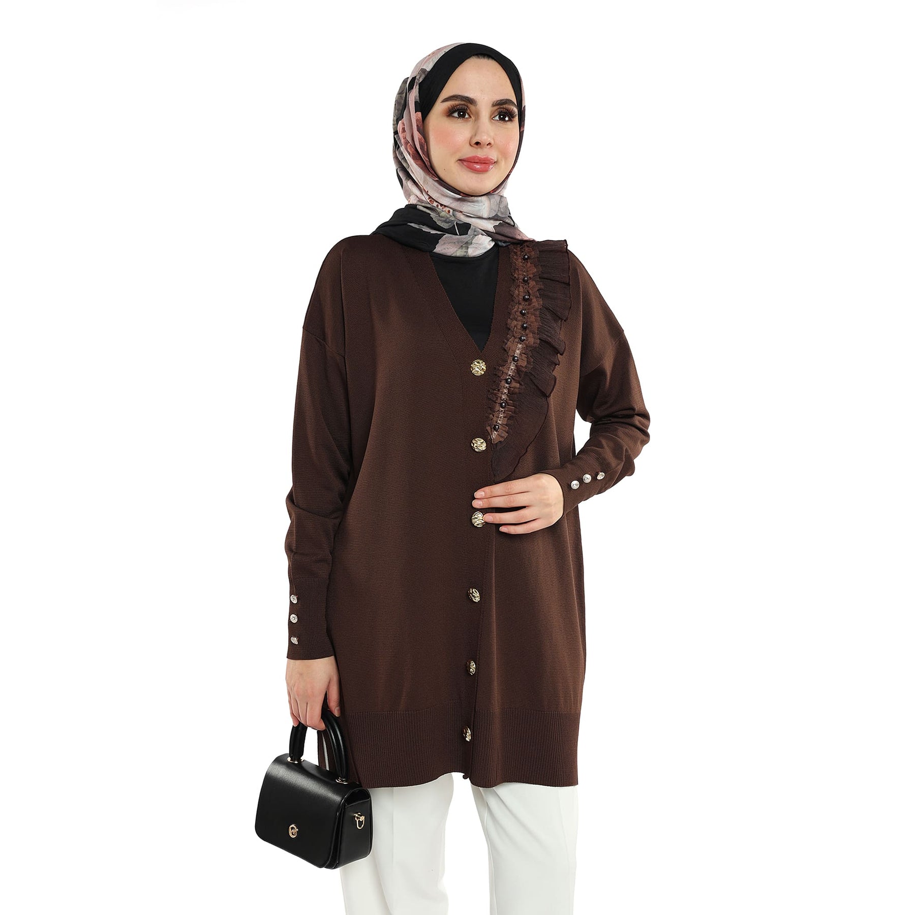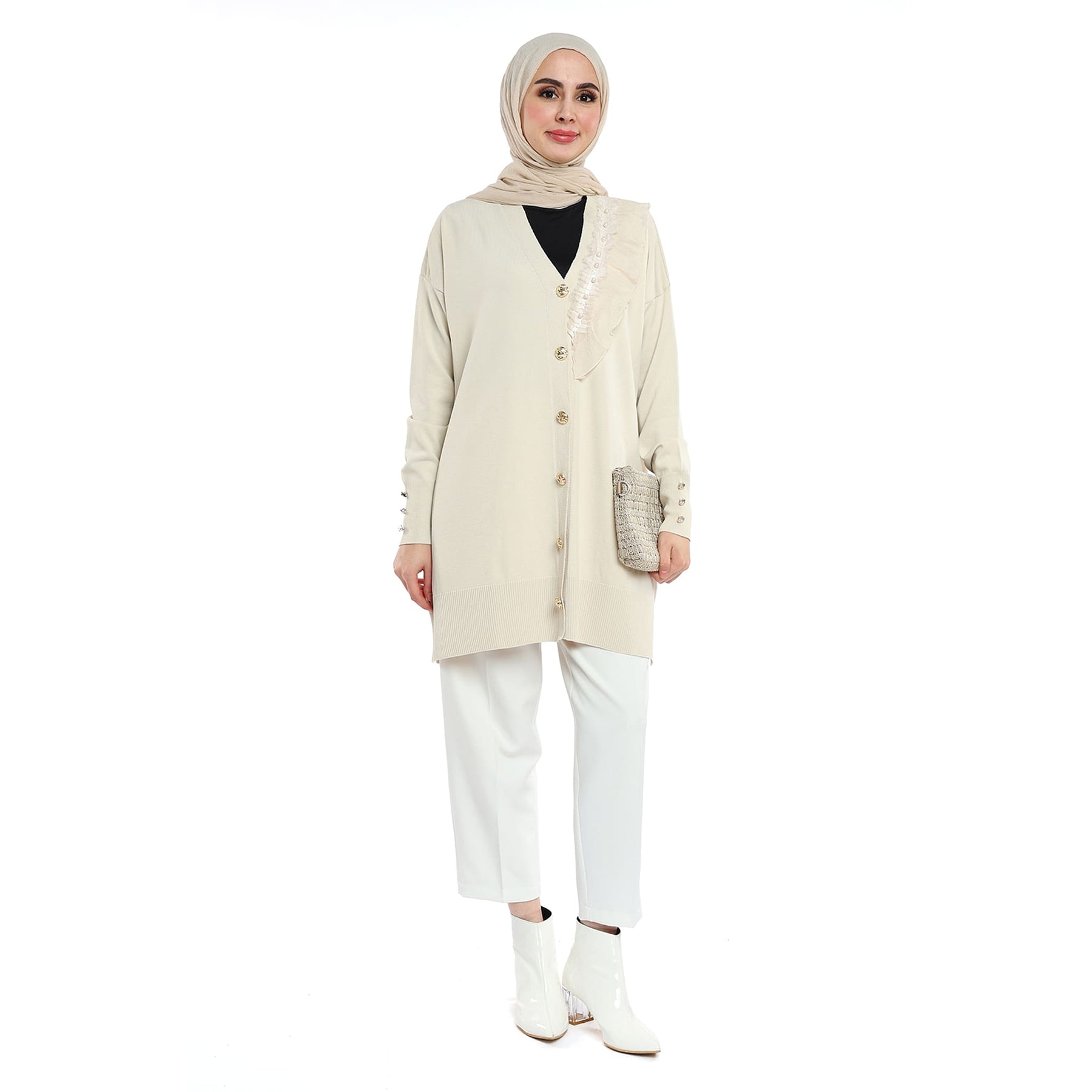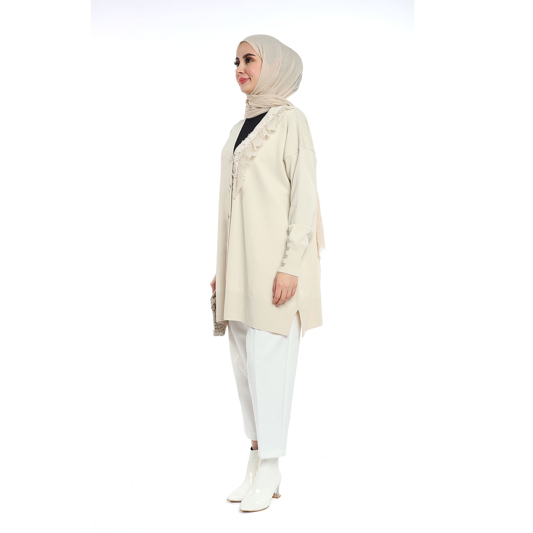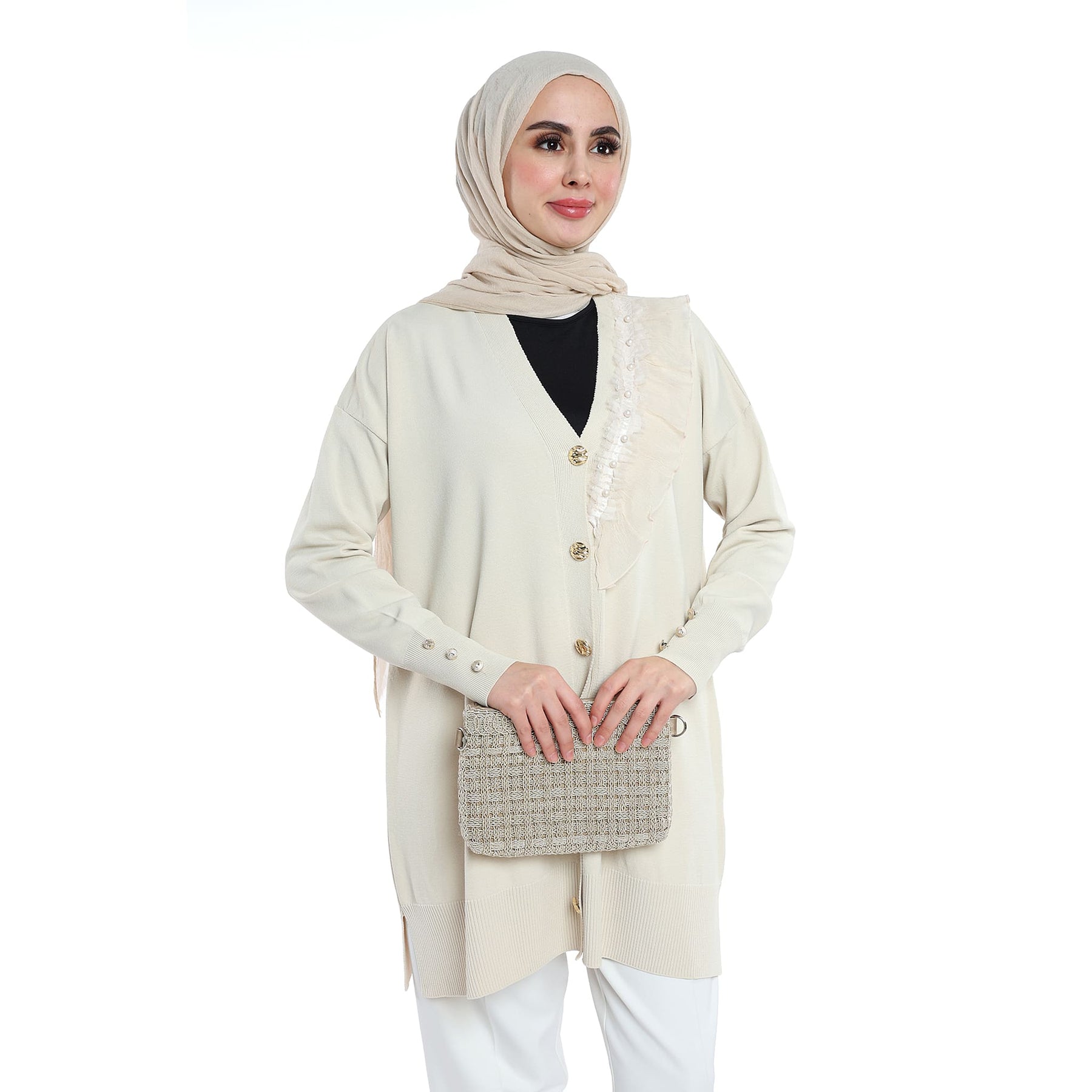 Model: Gold-button cardigan with pearl ruffle trim