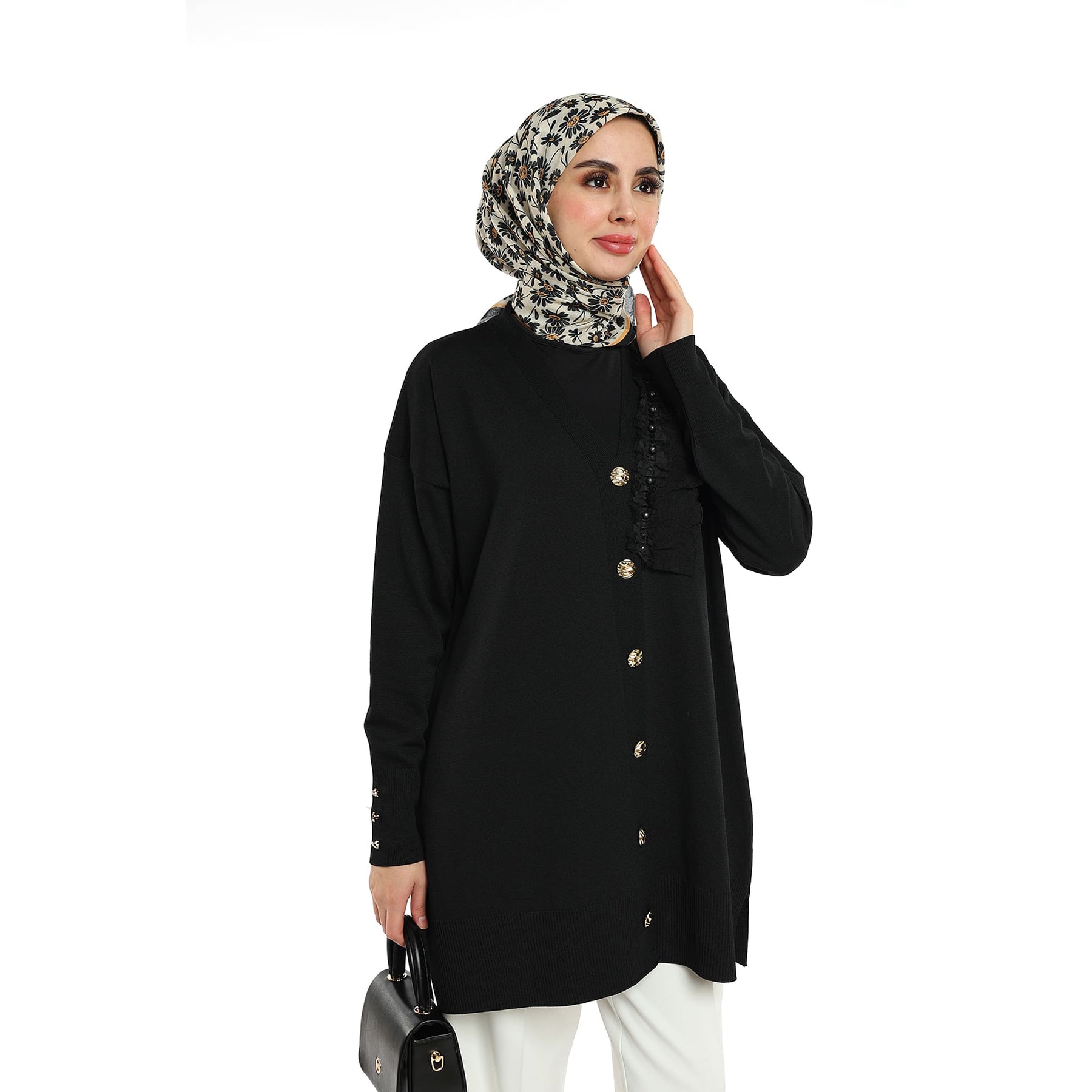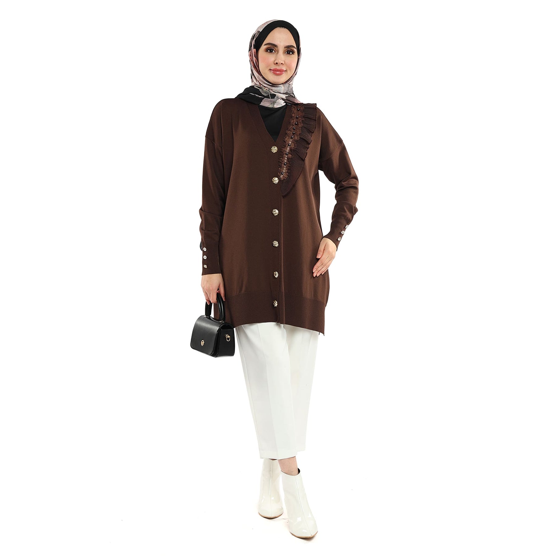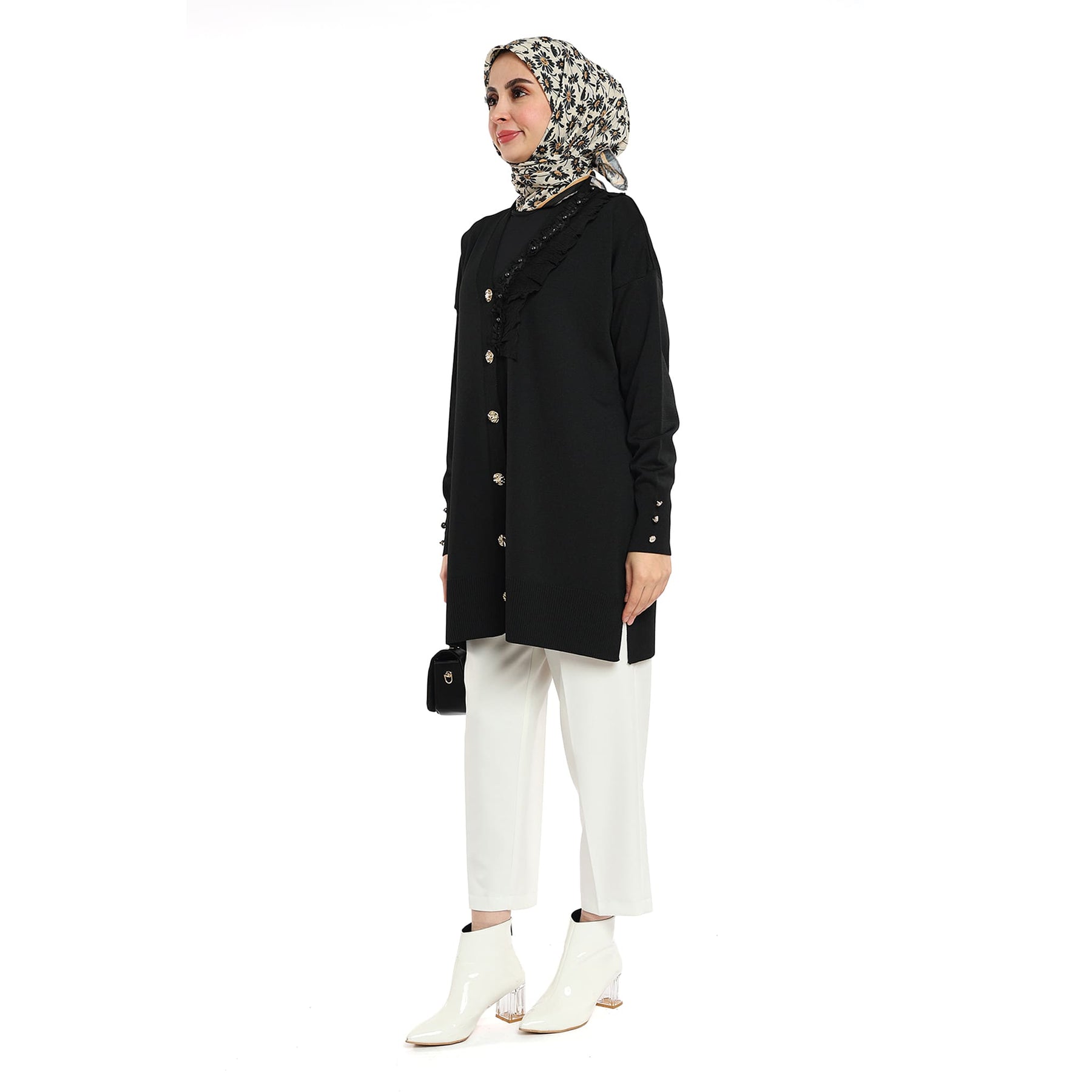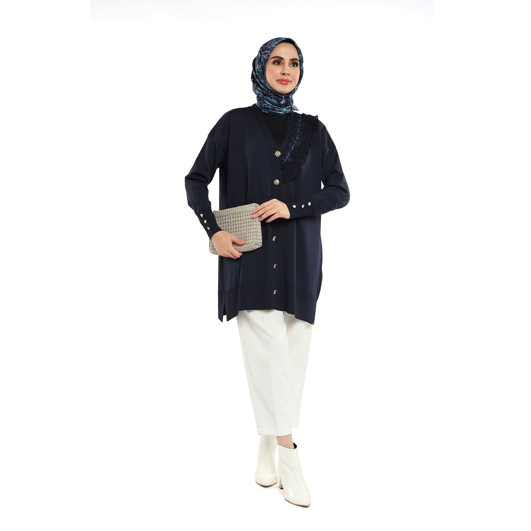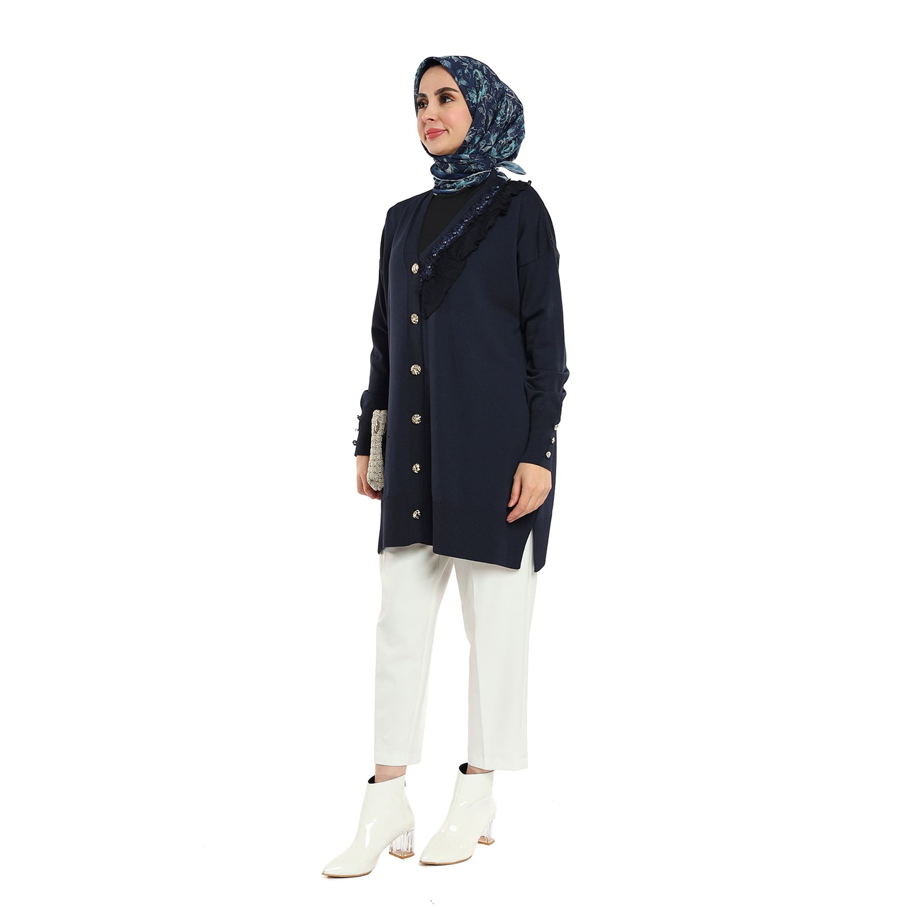 Model: Gold-button cardigan with pearl ruffle trim