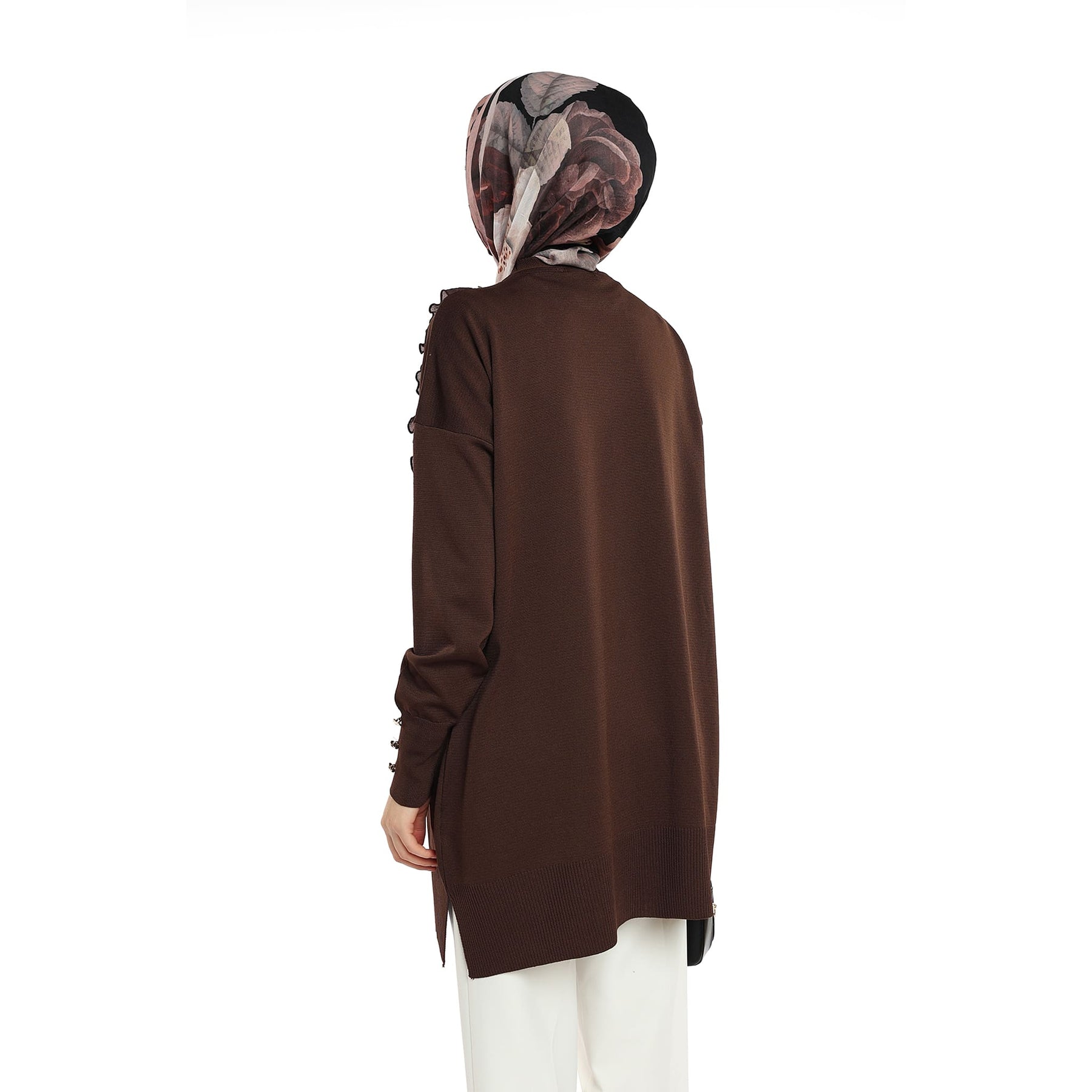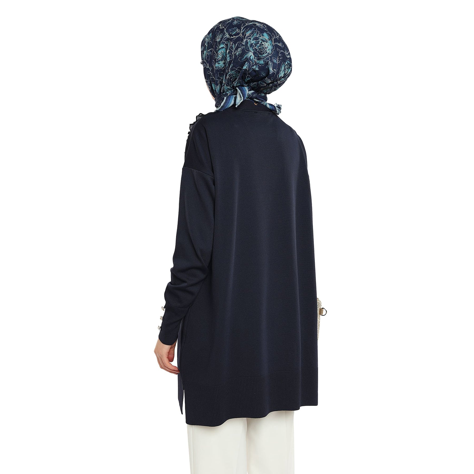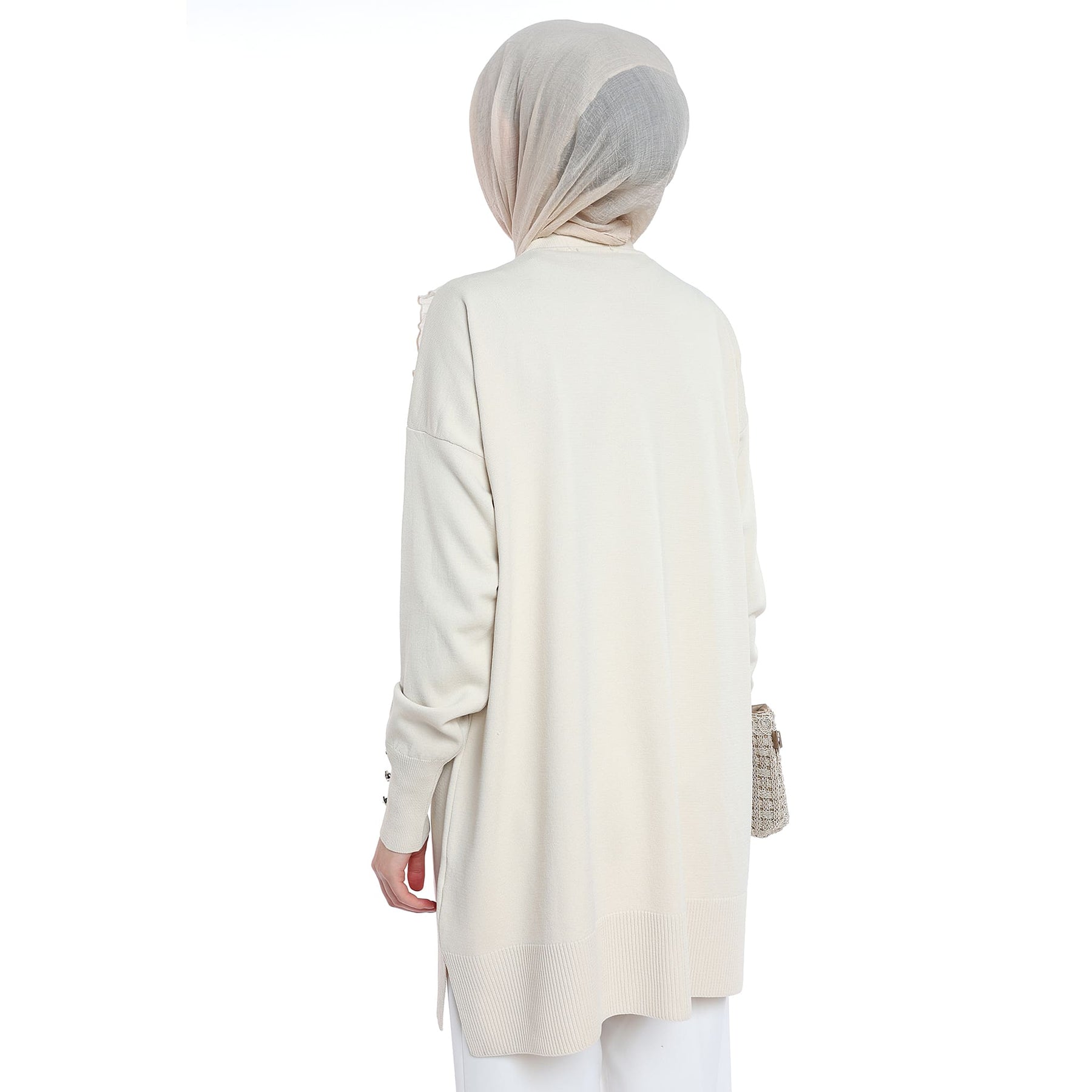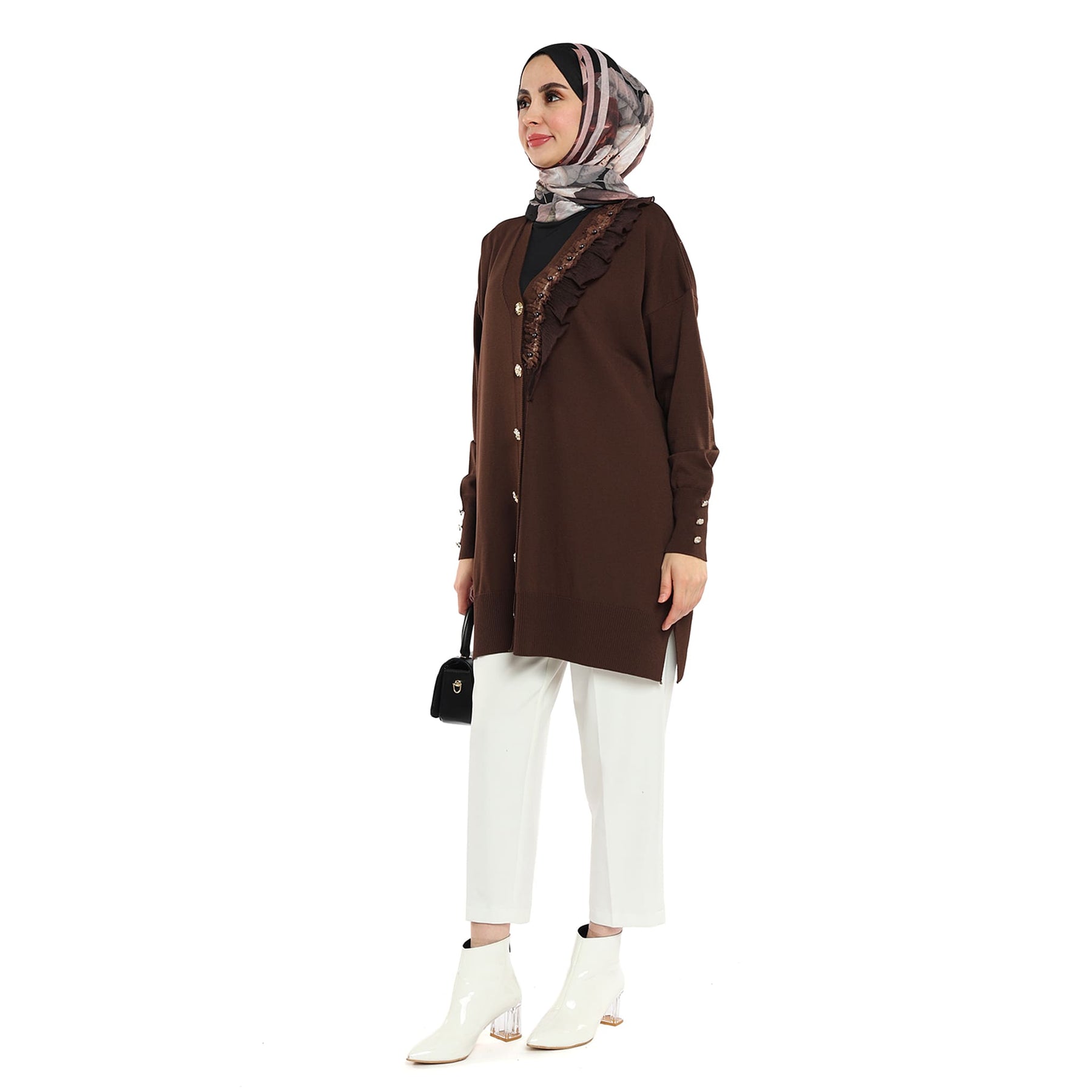 Model: Gold-button cardigan with pearl ruffle trim