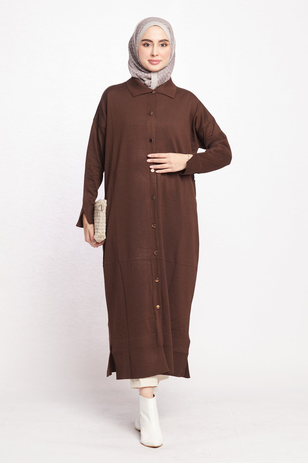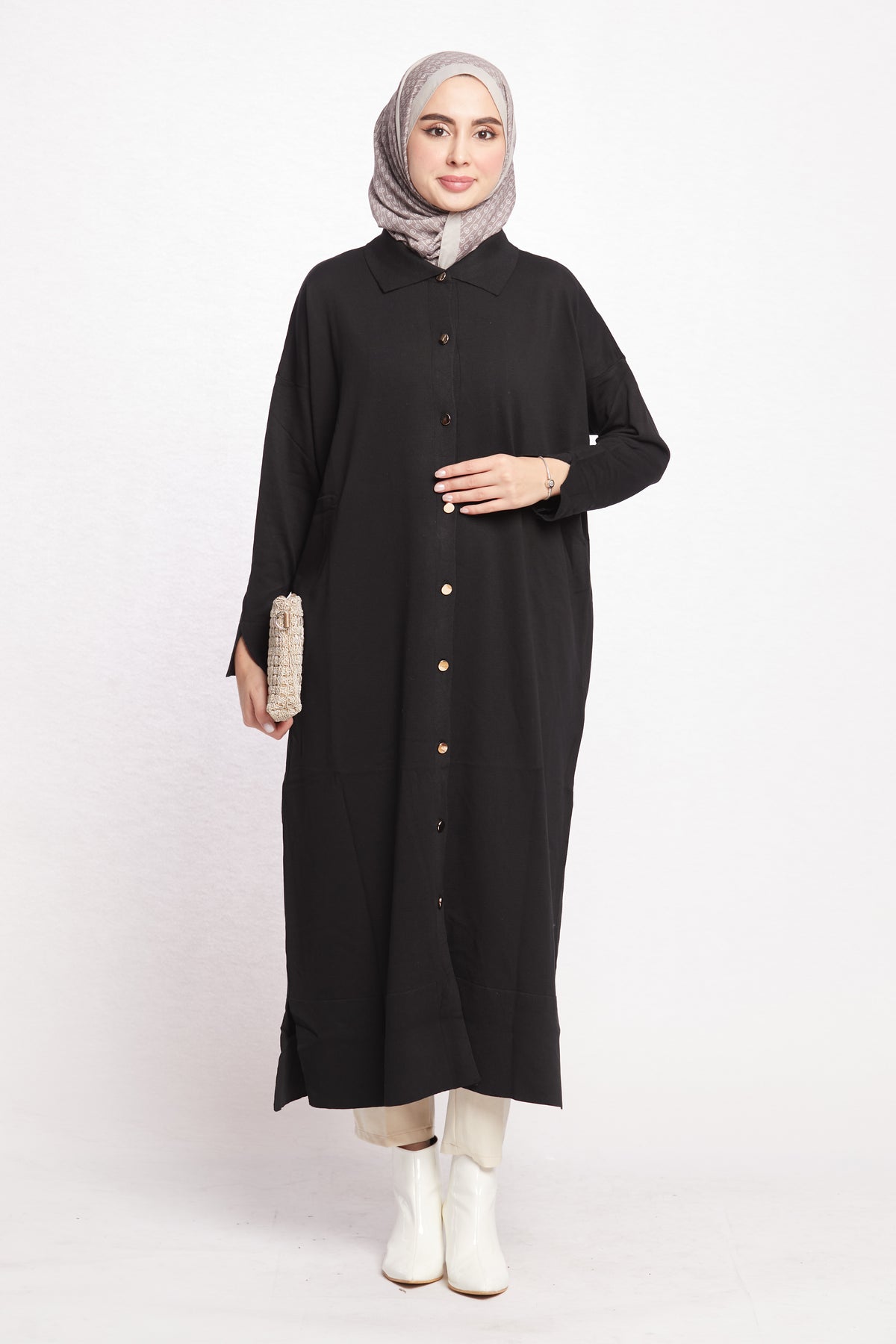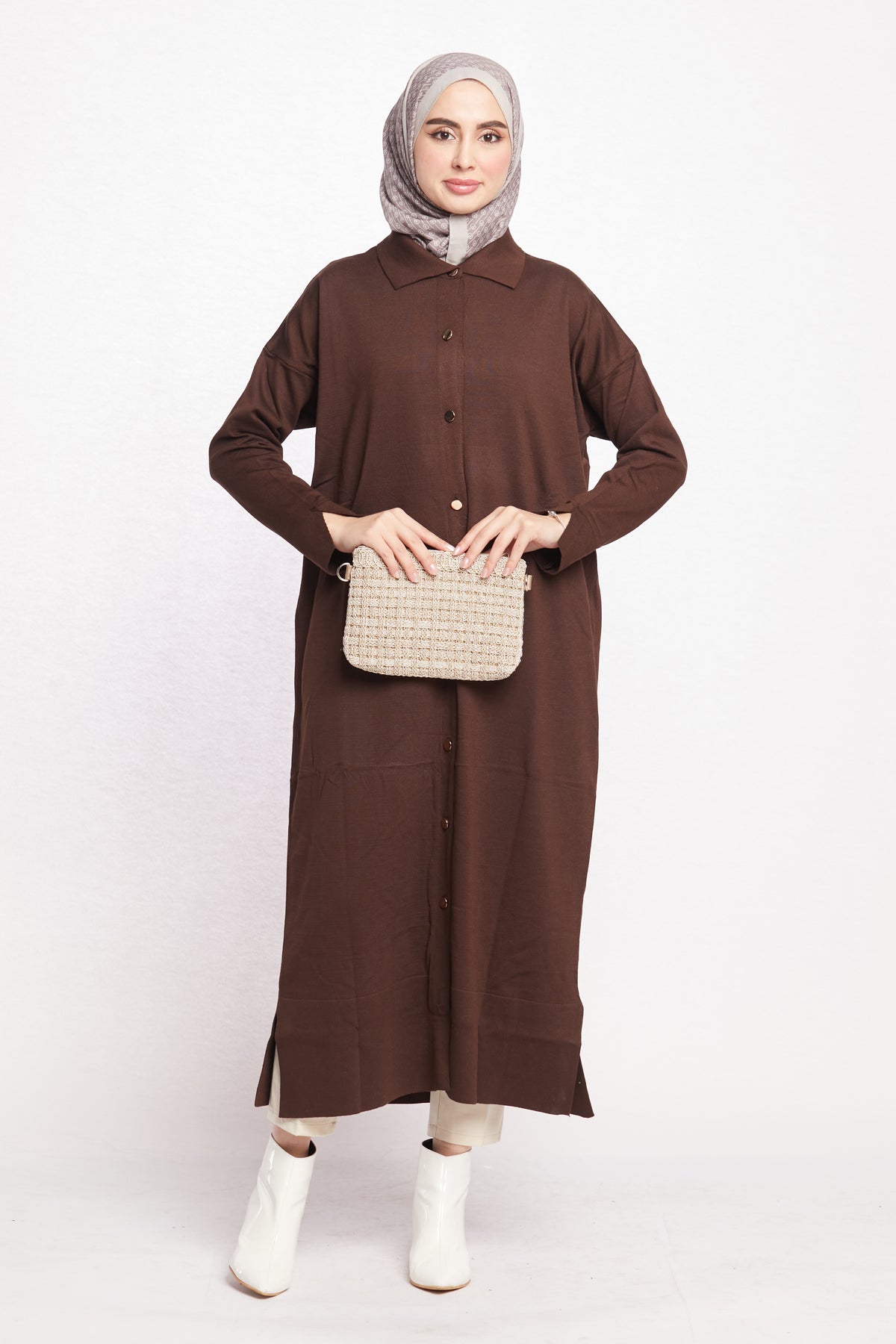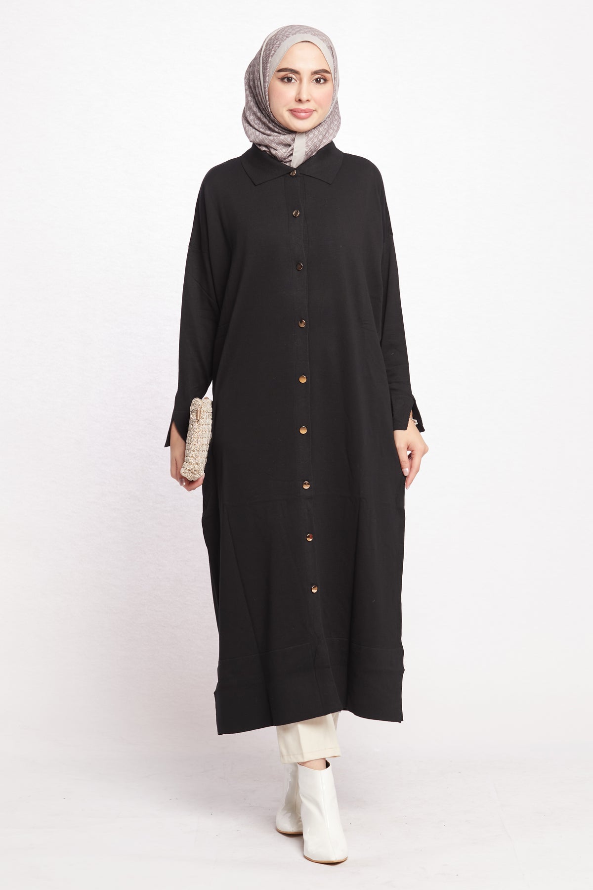 Combining classic and modern lines, this shirt-collar long cardigan completes its elegance with gold button details. Thanks to its long and elegant cut, it can be easily preferred for both office elegance and daily use. While the shirt collar detail offers an ideal option for classic style lovers, gold buttons add a sophisticated touch to the cardigan.