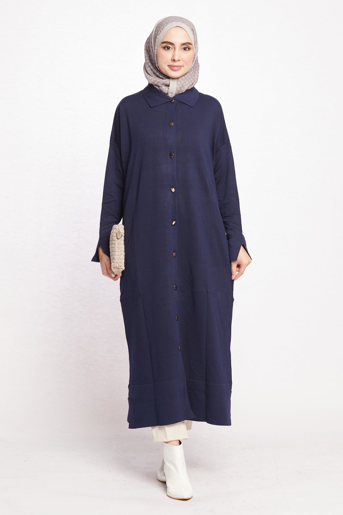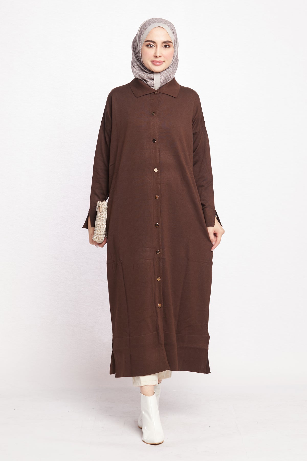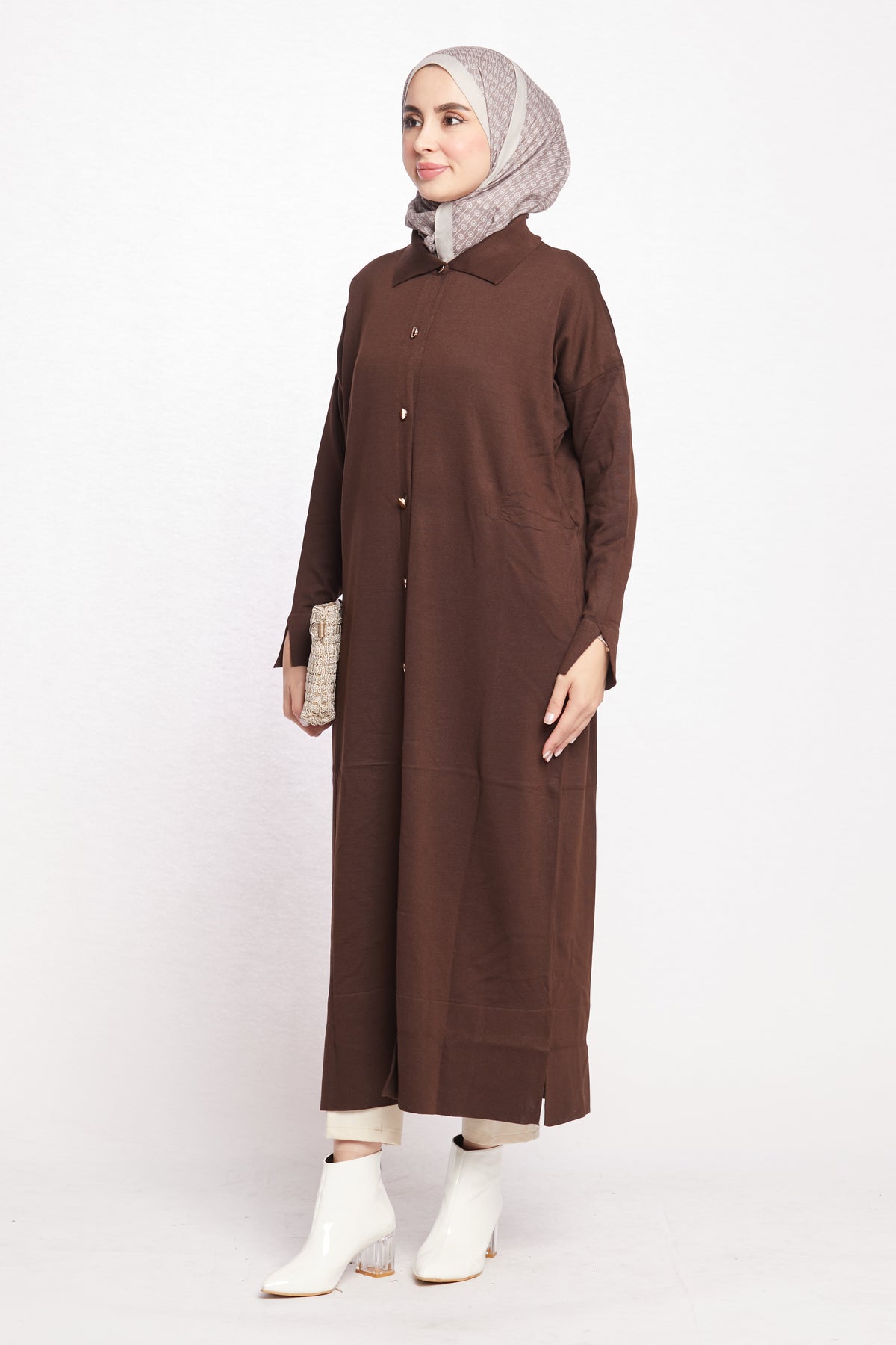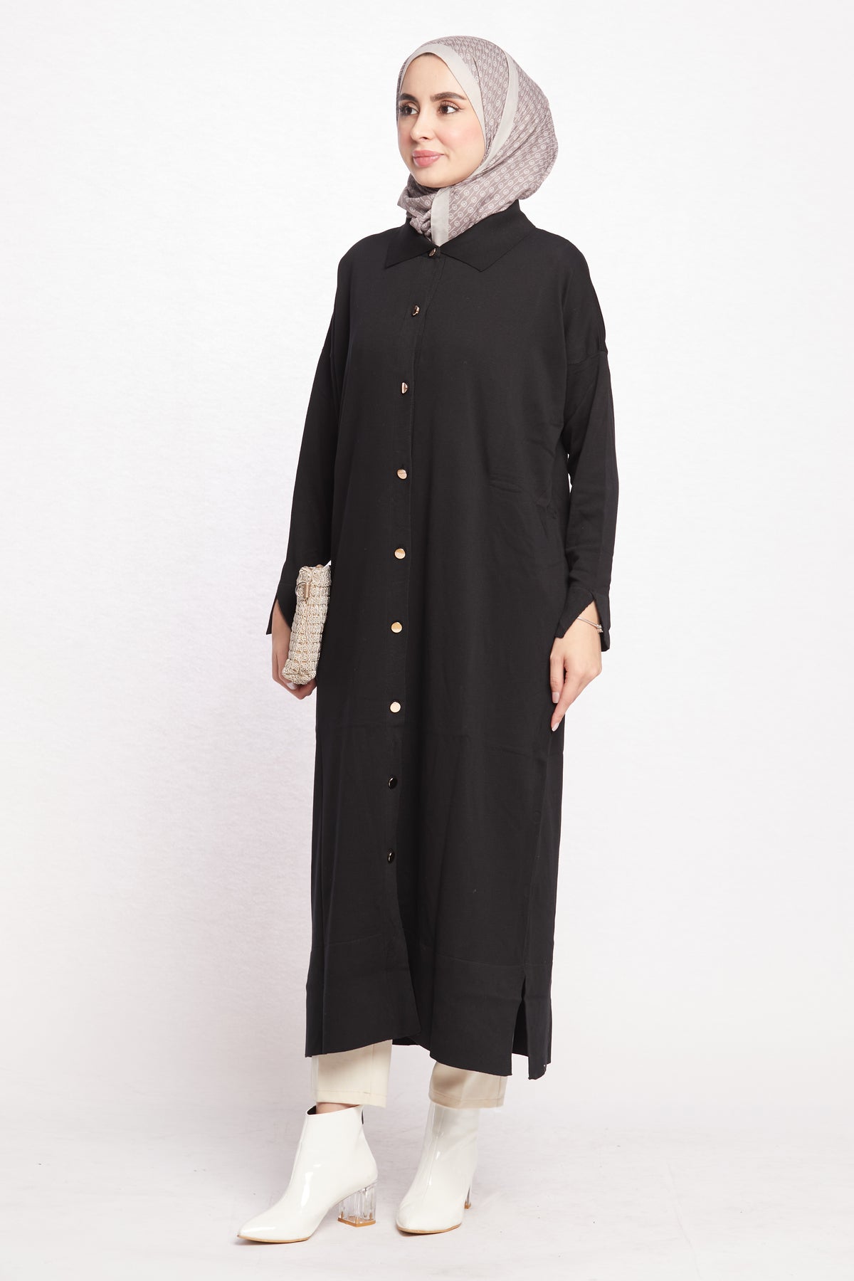 Combining classic and modern lines, this shirt-collar long cardigan completes its elegance with gold button details. Thanks to its long and elegant cut, it can be easily preferred for both office elegance and daily use. While the shirt collar detail offers an ideal option for classic style lovers, gold buttons add a sophisticated touch to the cardigan.