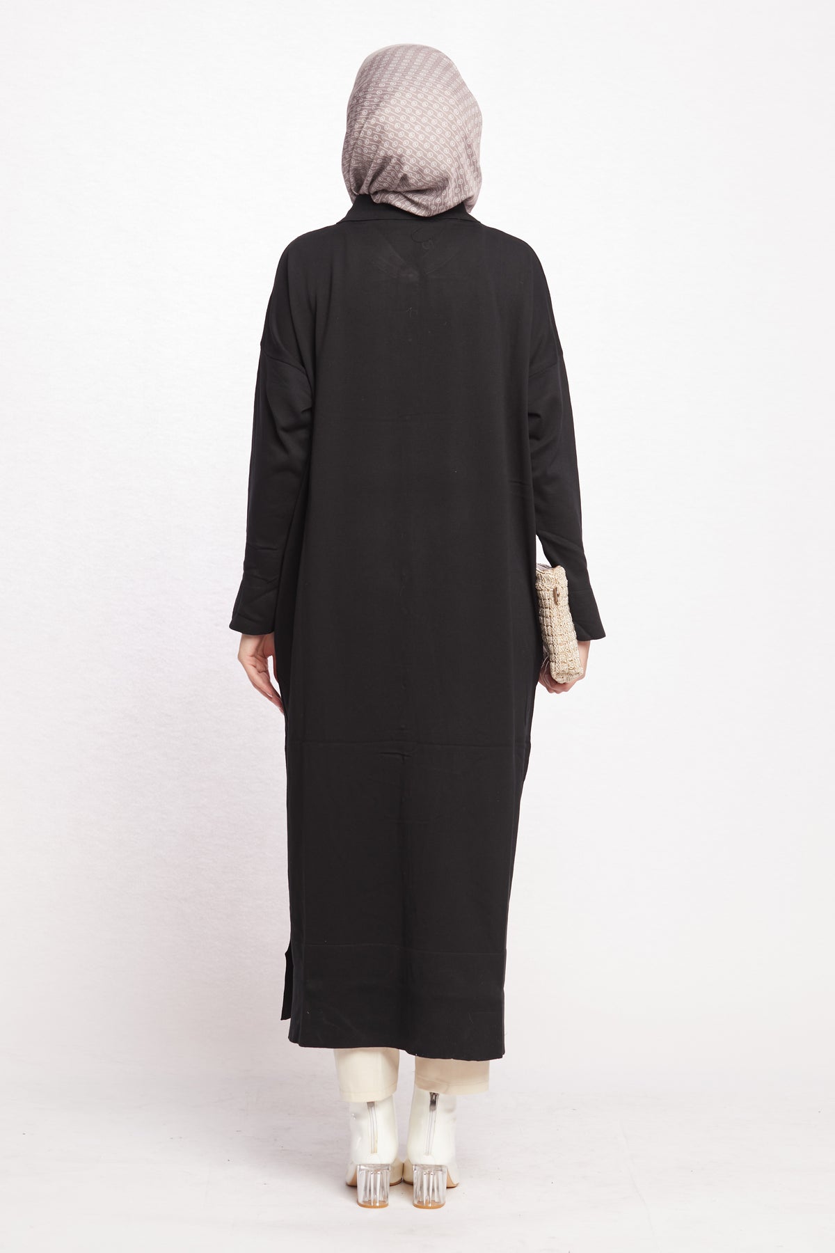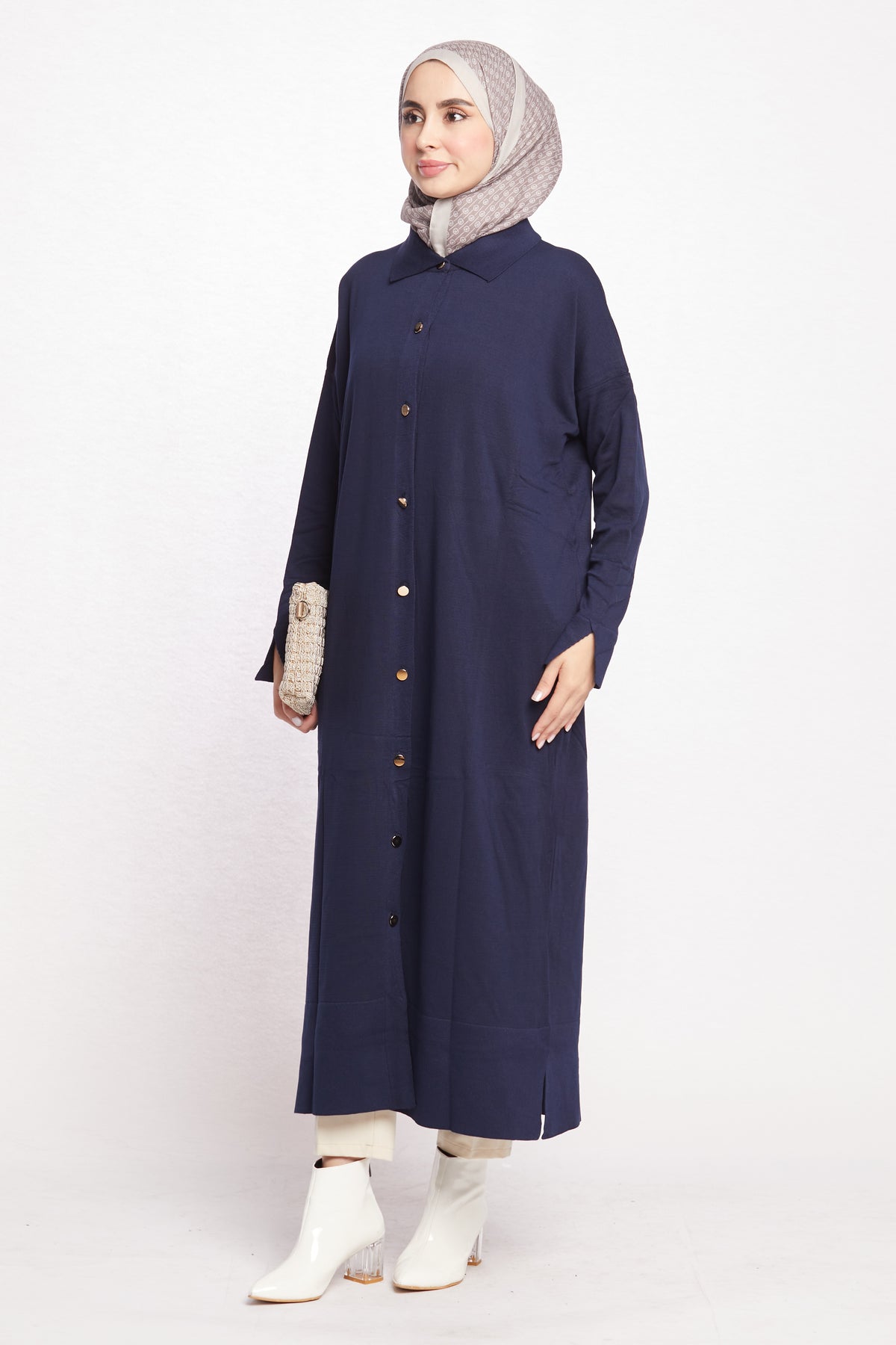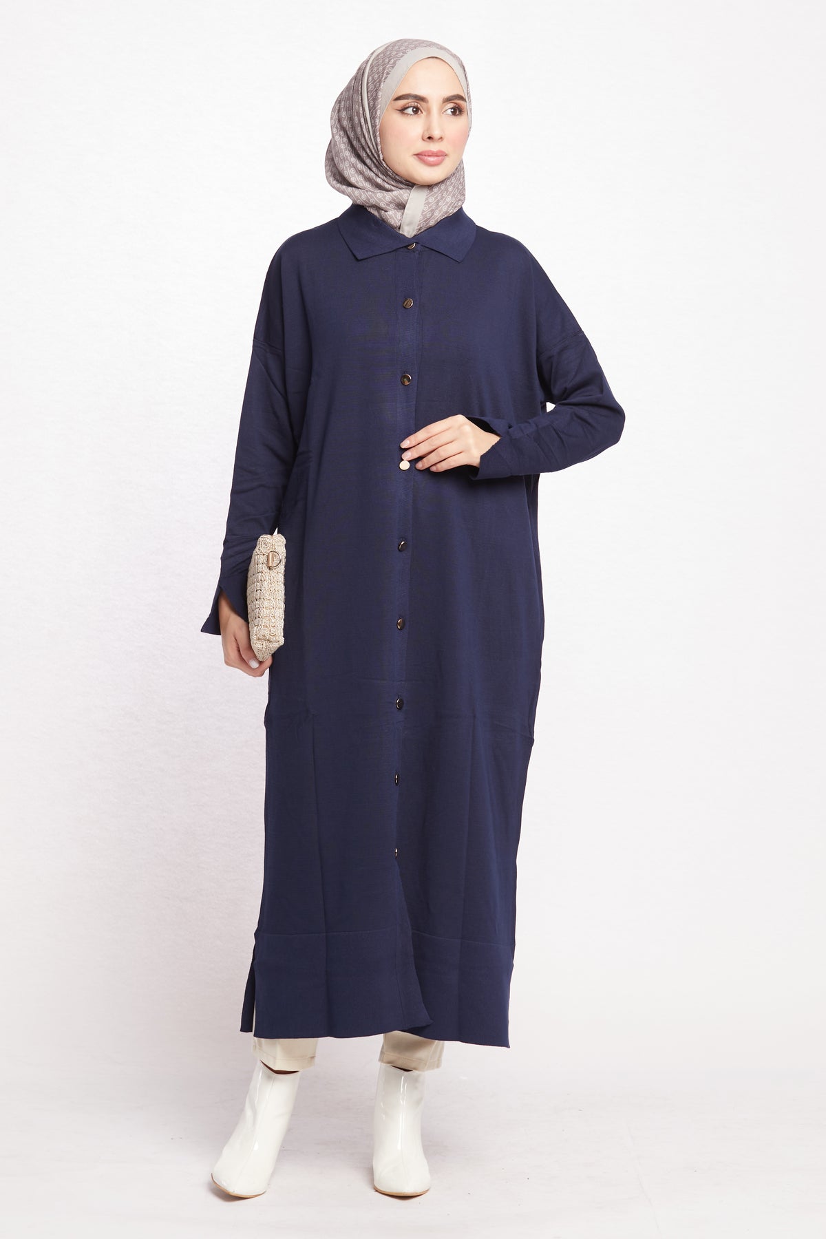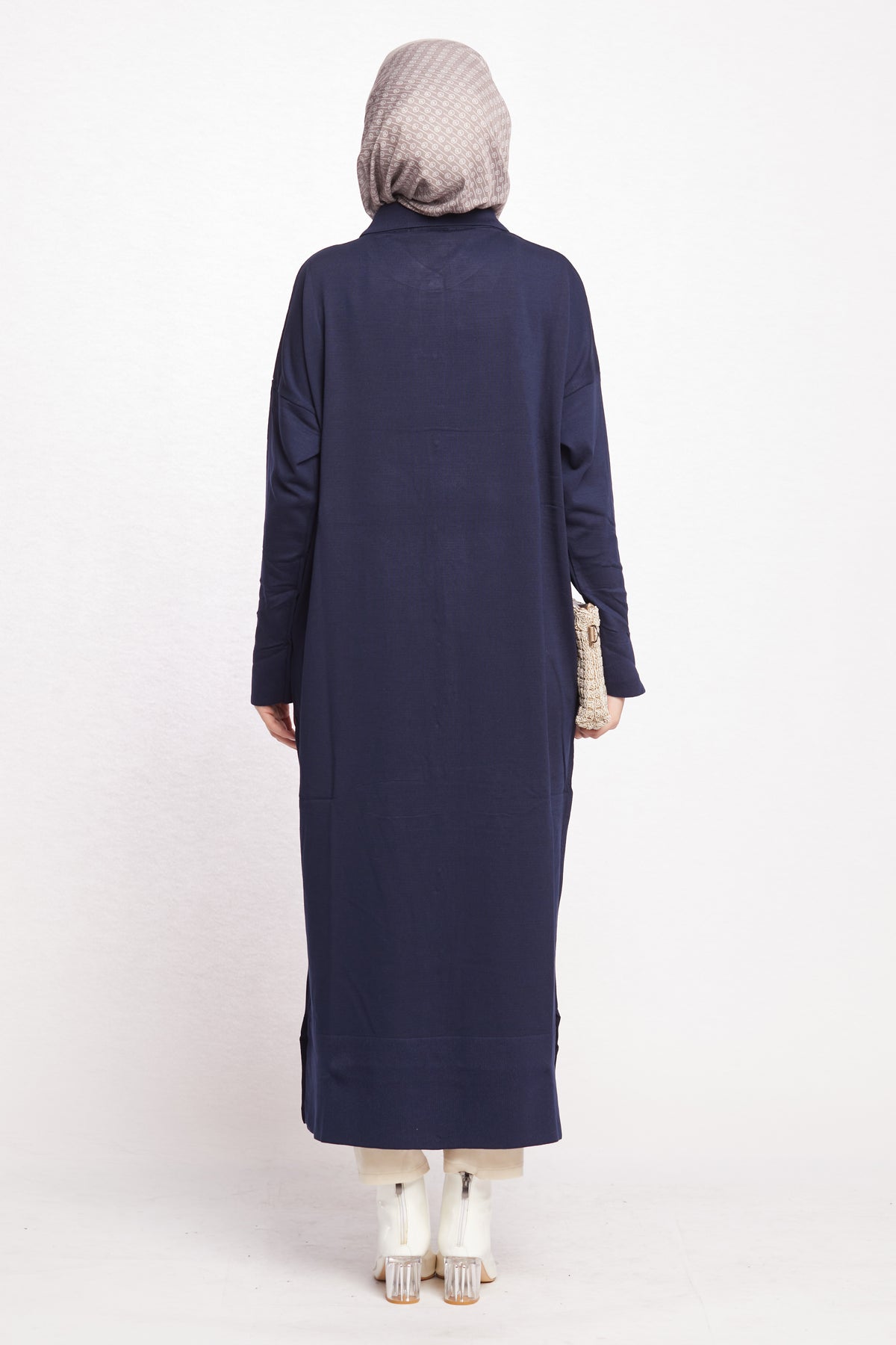 Combining classic and modern lines, this shirt-collar long cardigan completes its elegance with gold button details. Thanks to its long and elegant cut, it can be easily preferred for both office elegance and daily use. While the shirt collar detail offers an ideal option for classic style lovers, gold buttons add a sophisticated touch to the cardigan.
