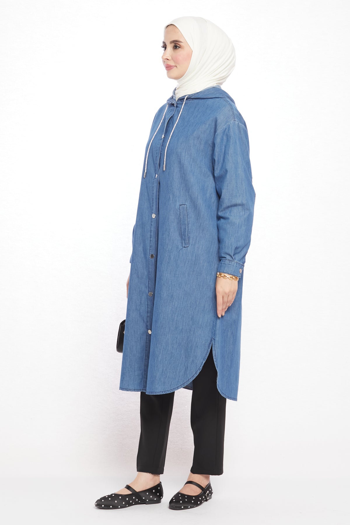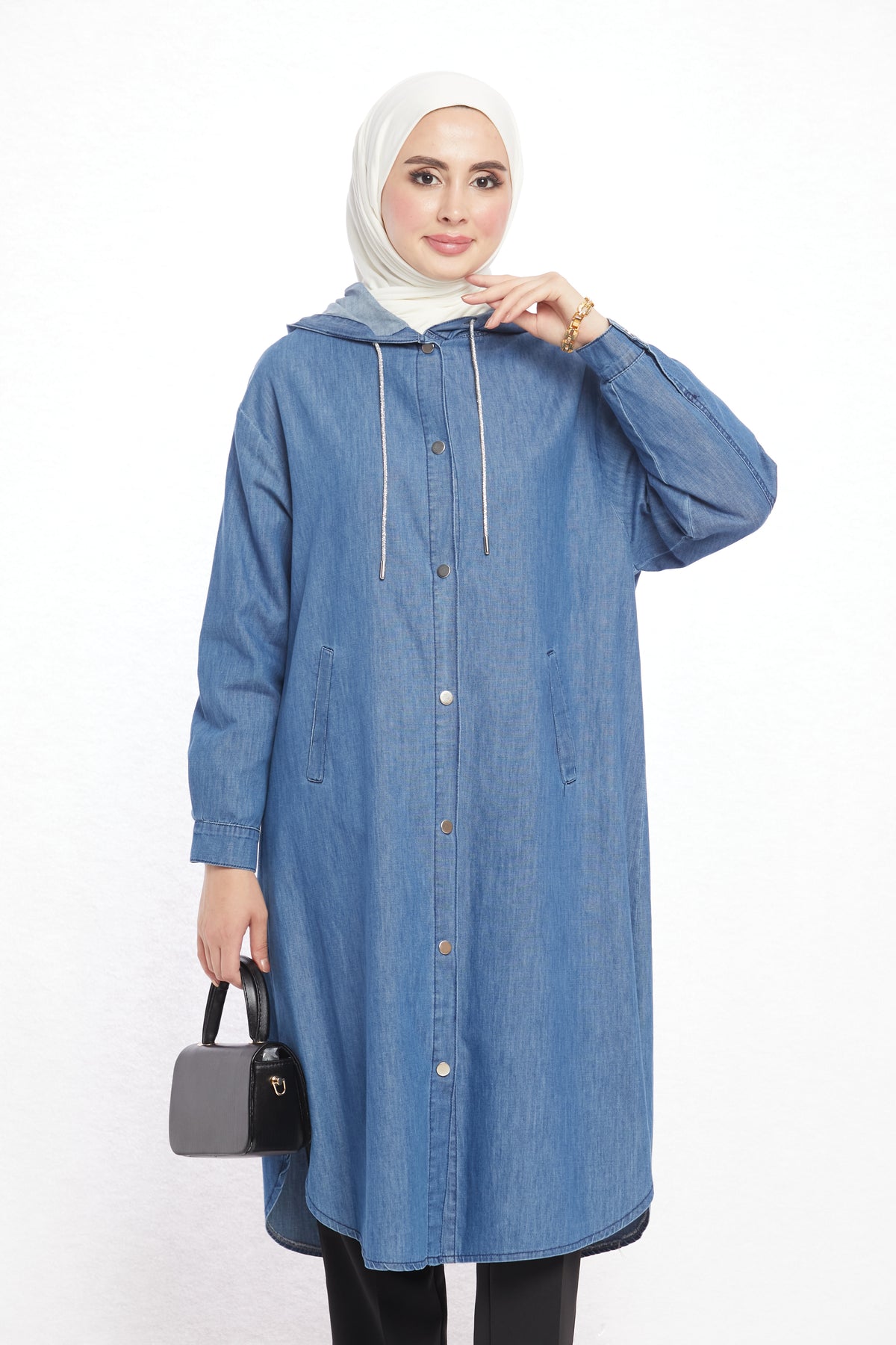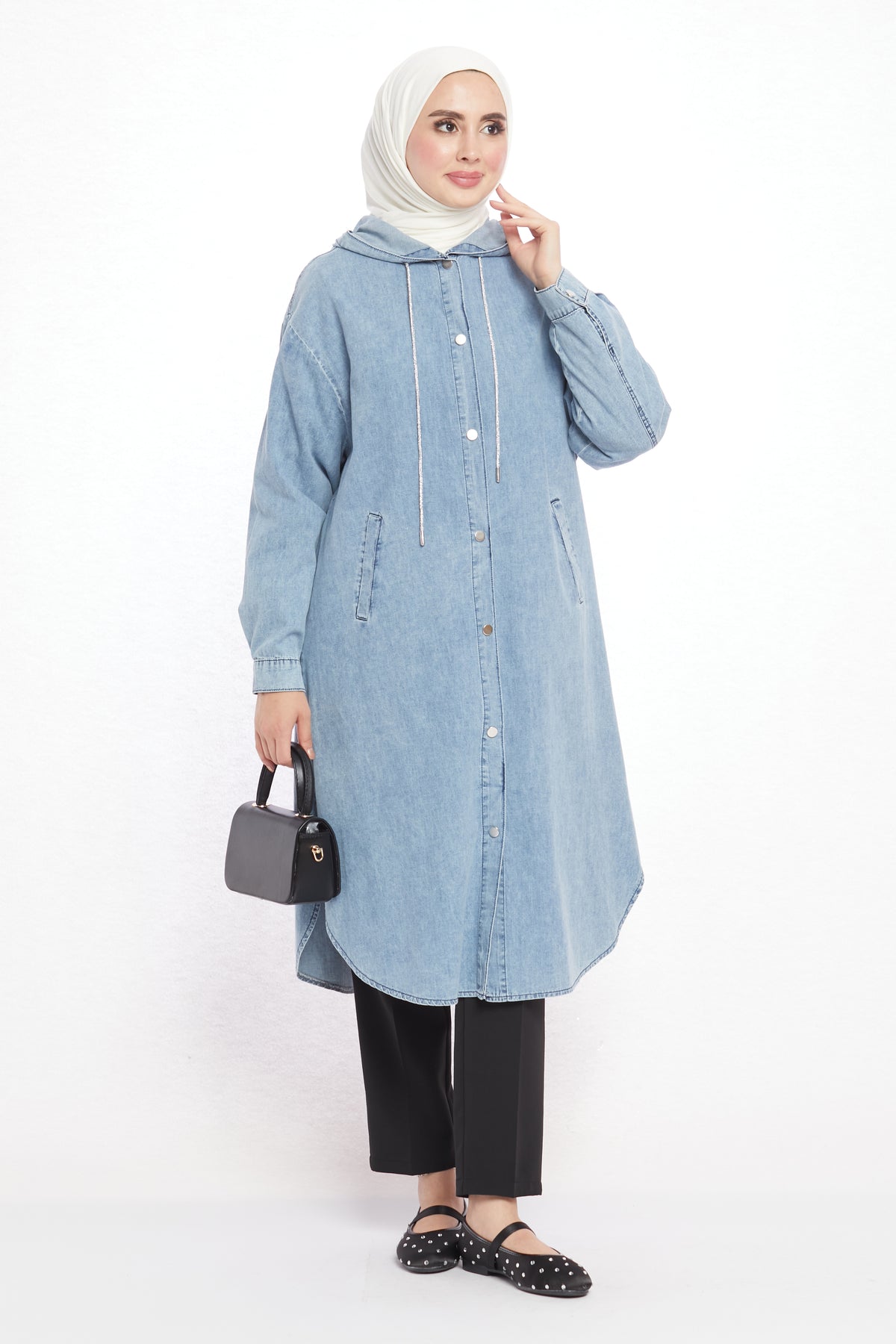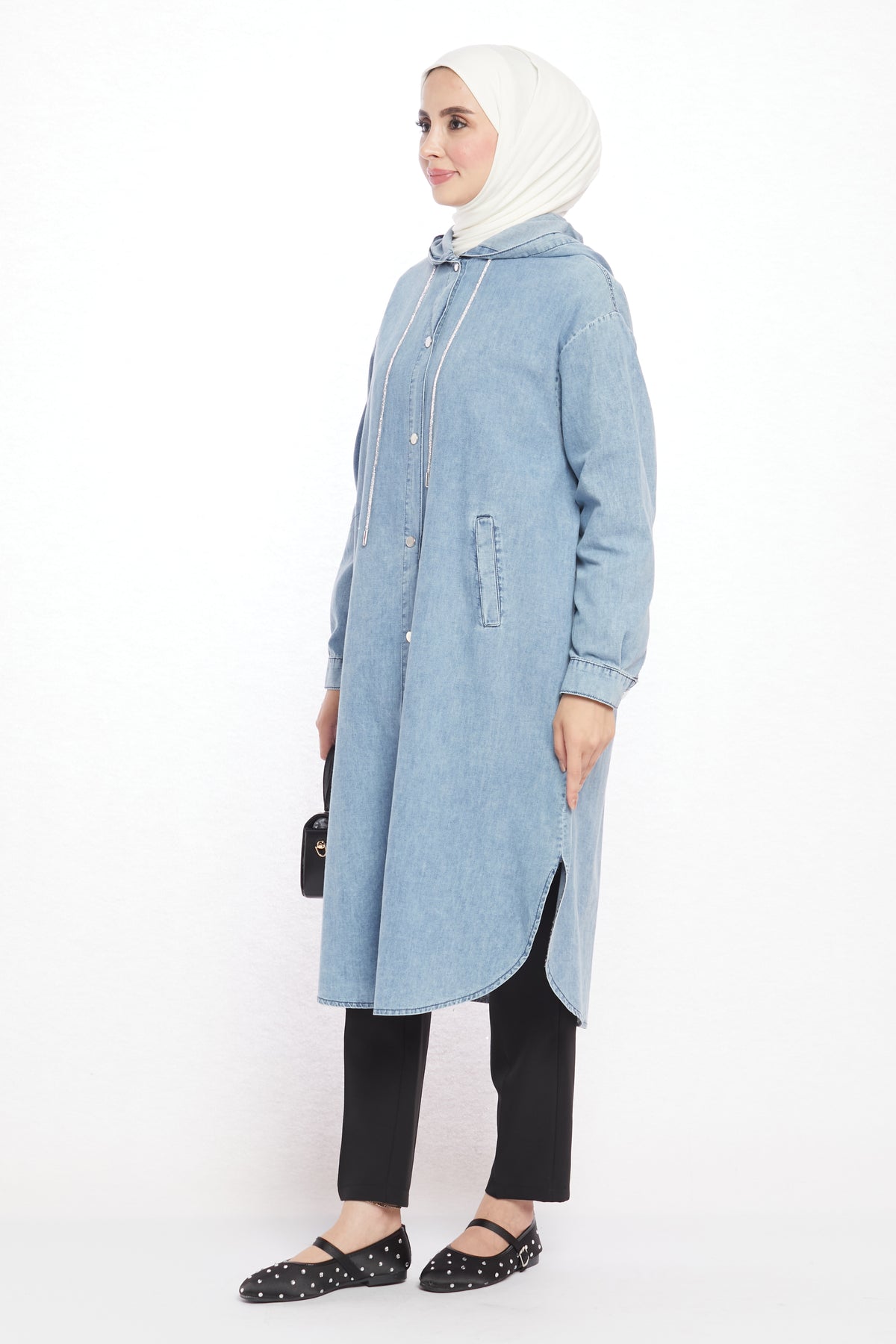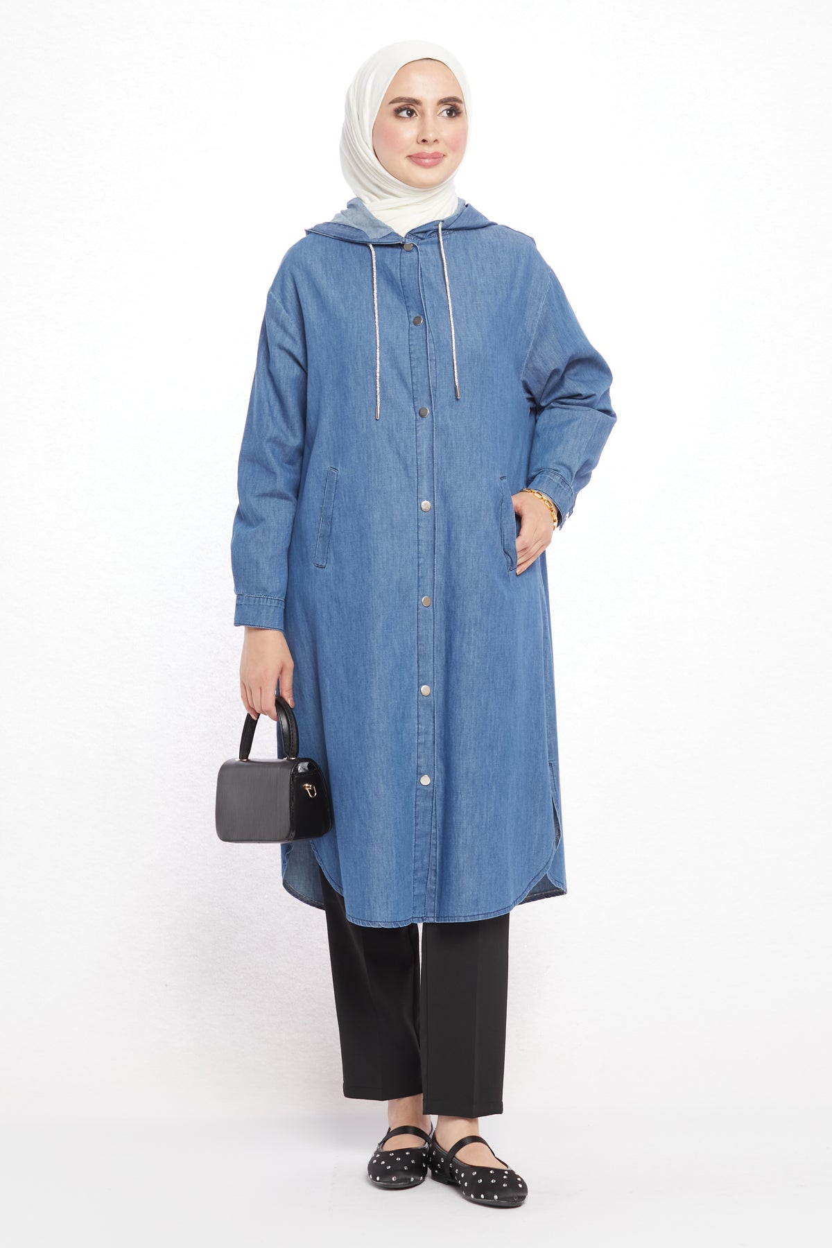 Combining comfort with sporty elegance, the denim-look hooded tunic offers day-long ease with its soft texture. Crafted from a blend of 97% cotton and 3% elastane, it is breathable and provides freedom of movement. Featuring two practical side pockets, it adds functionality and a casual touch to everyday outfits. The hood detail enhances its modern and dynamic appeal.