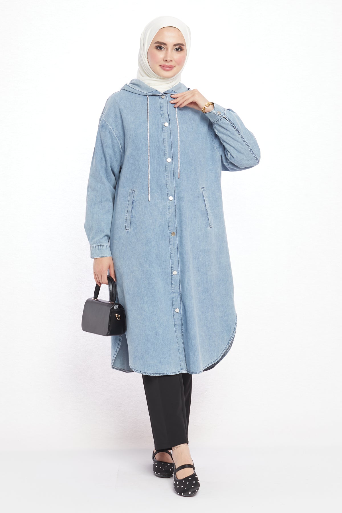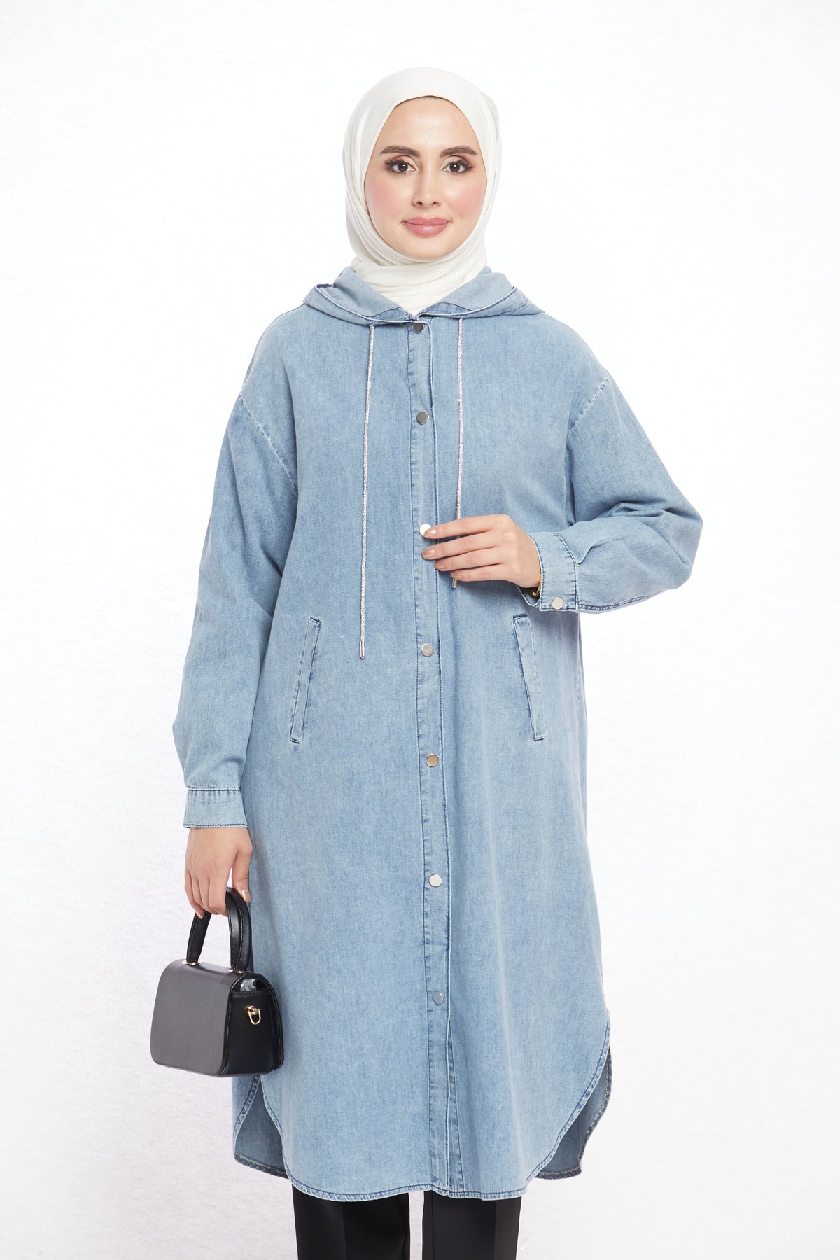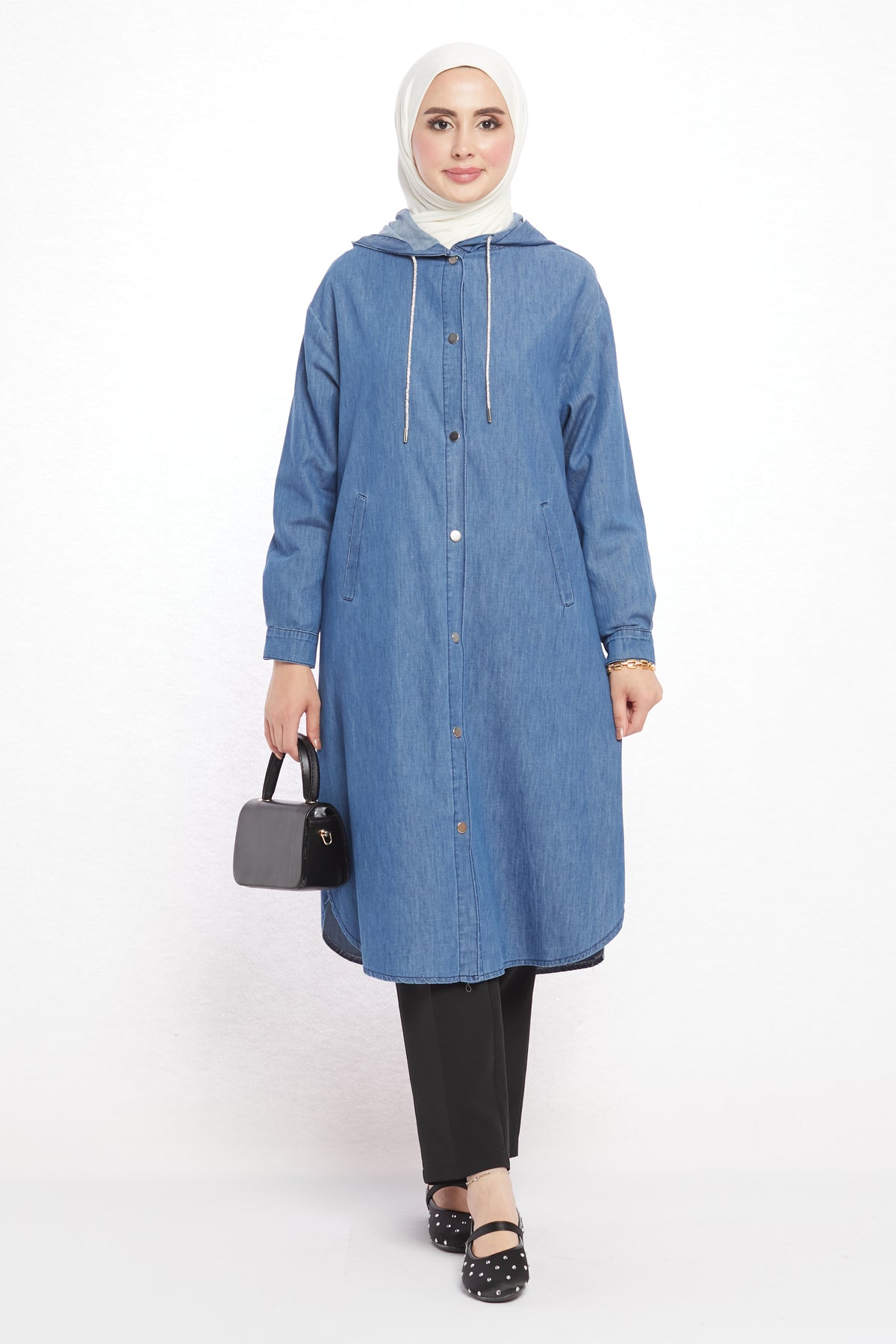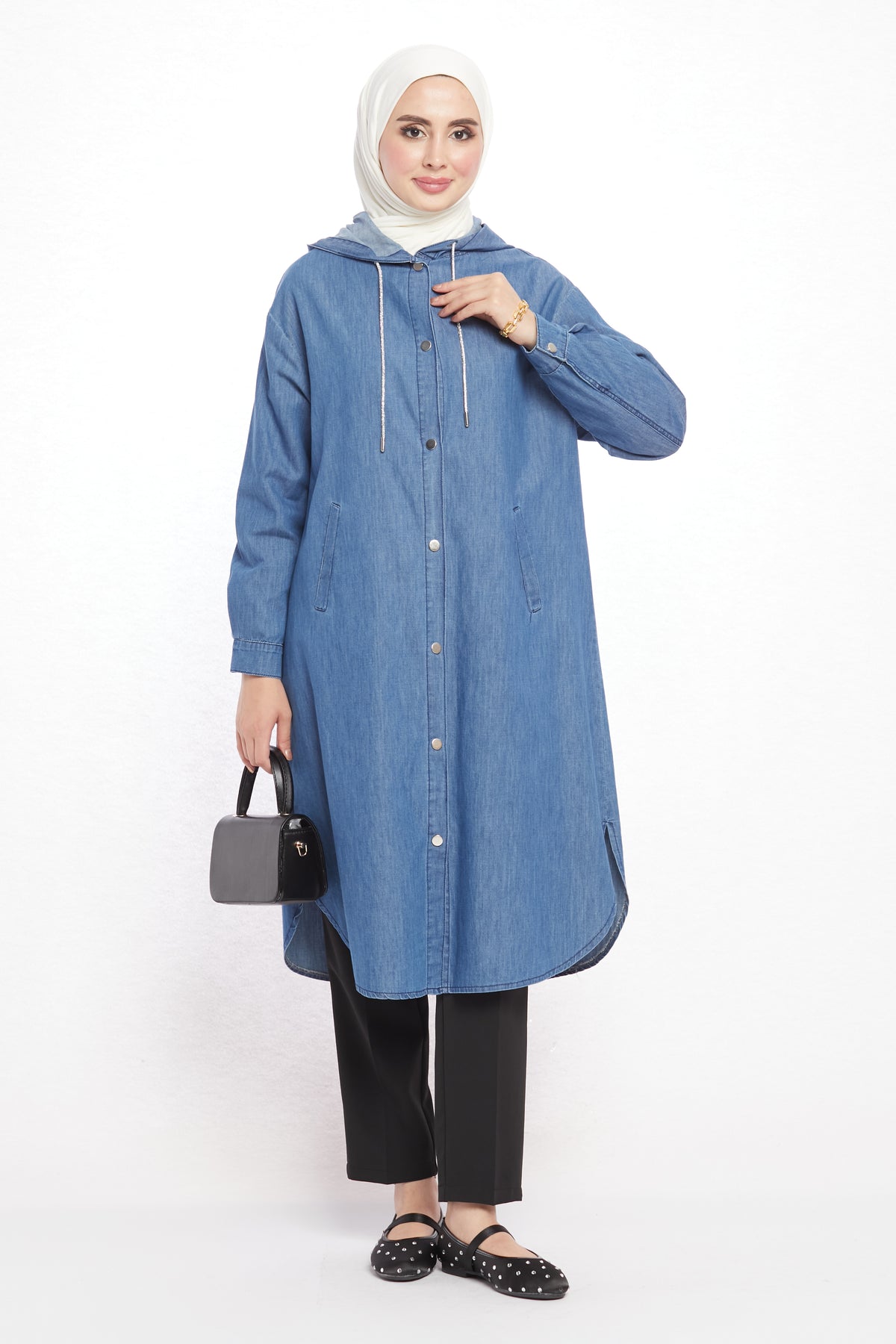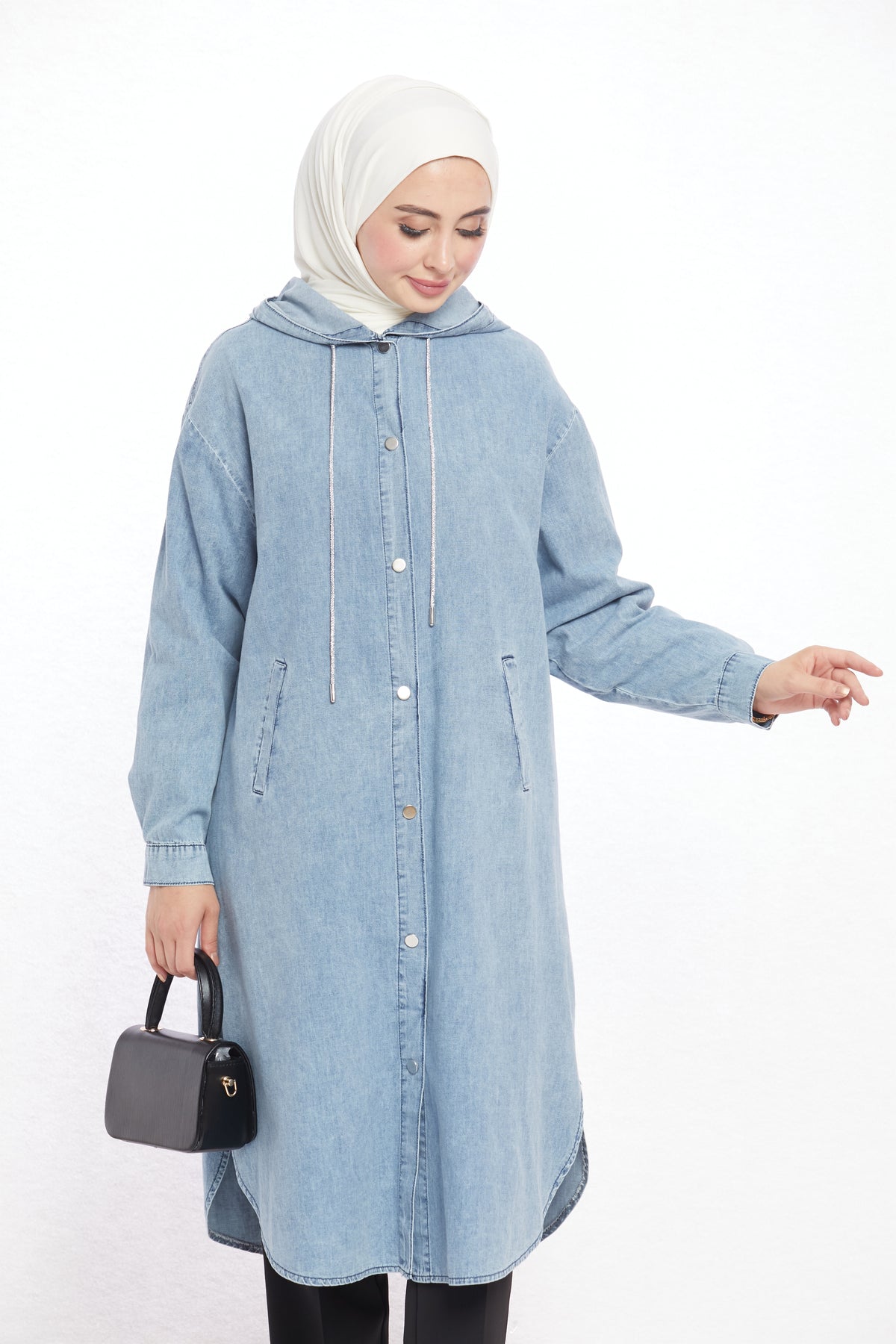 Combining comfort with sporty elegance, the denim-look hooded tunic offers day-long ease with its soft texture. Crafted from a blend of 97% cotton and 3% elastane, it is breathable and provides freedom of movement. Featuring two practical side pockets, it adds functionality and a casual touch to everyday outfits. The hood detail enhances its modern and dynamic appeal.