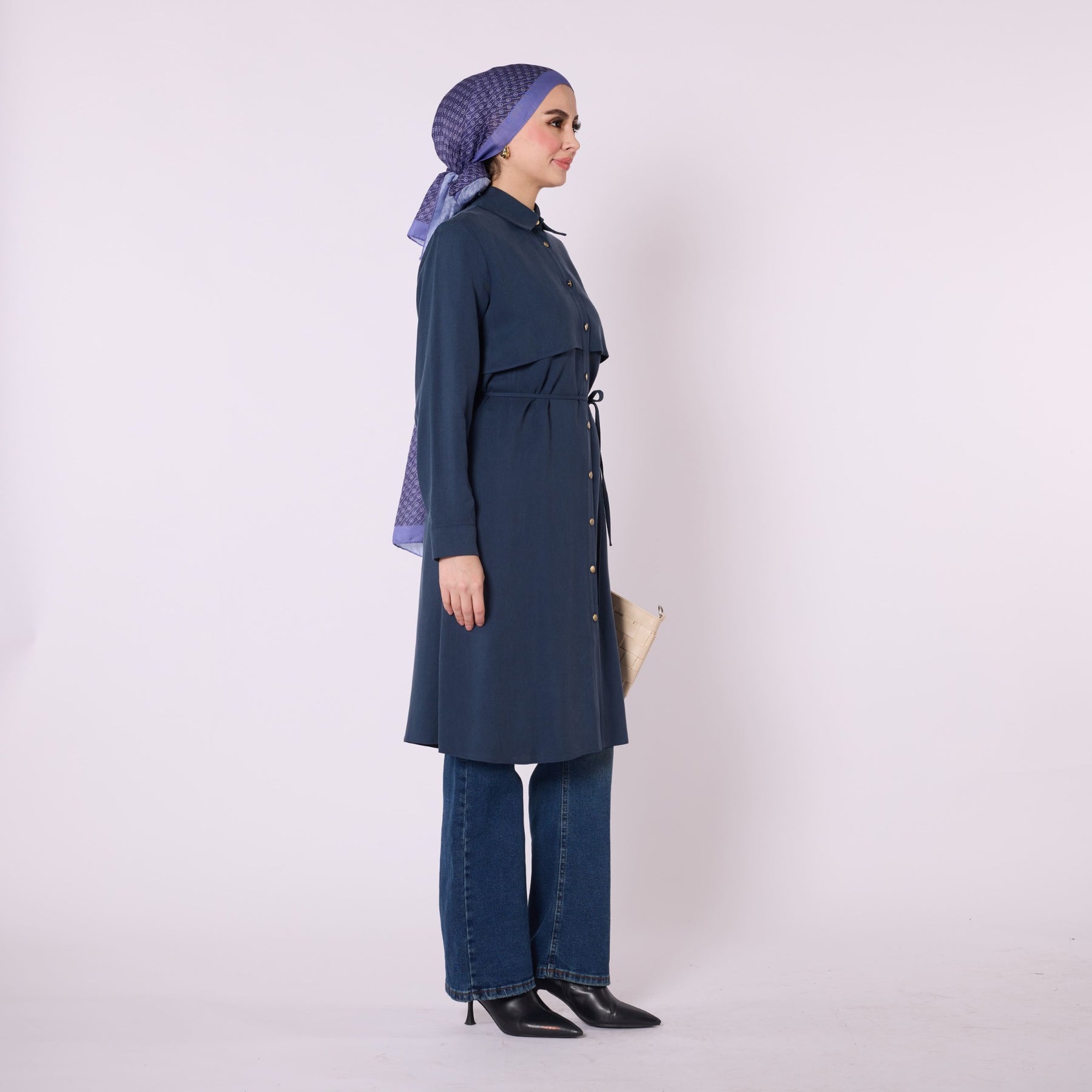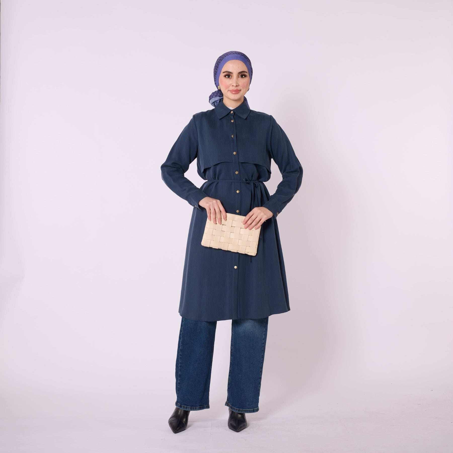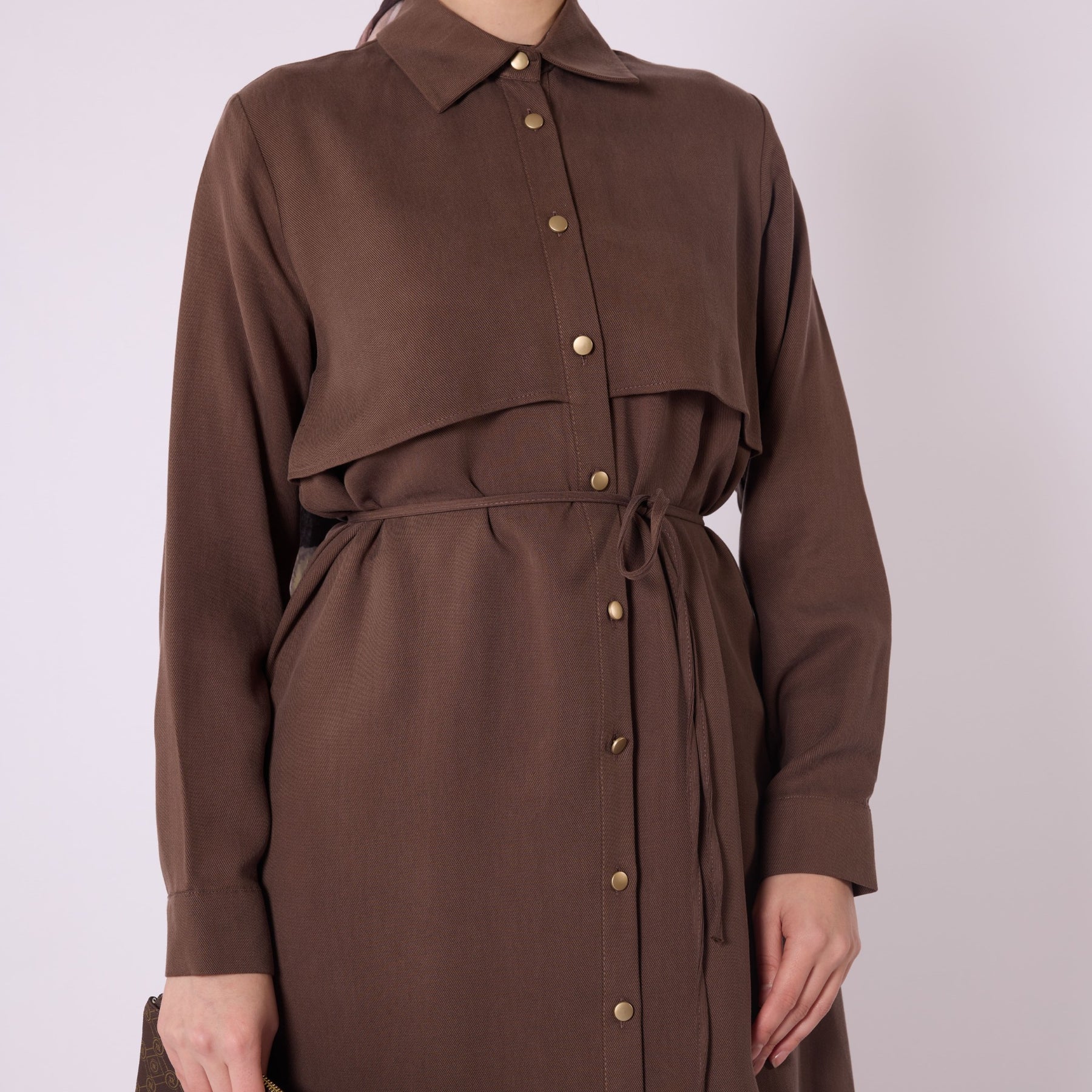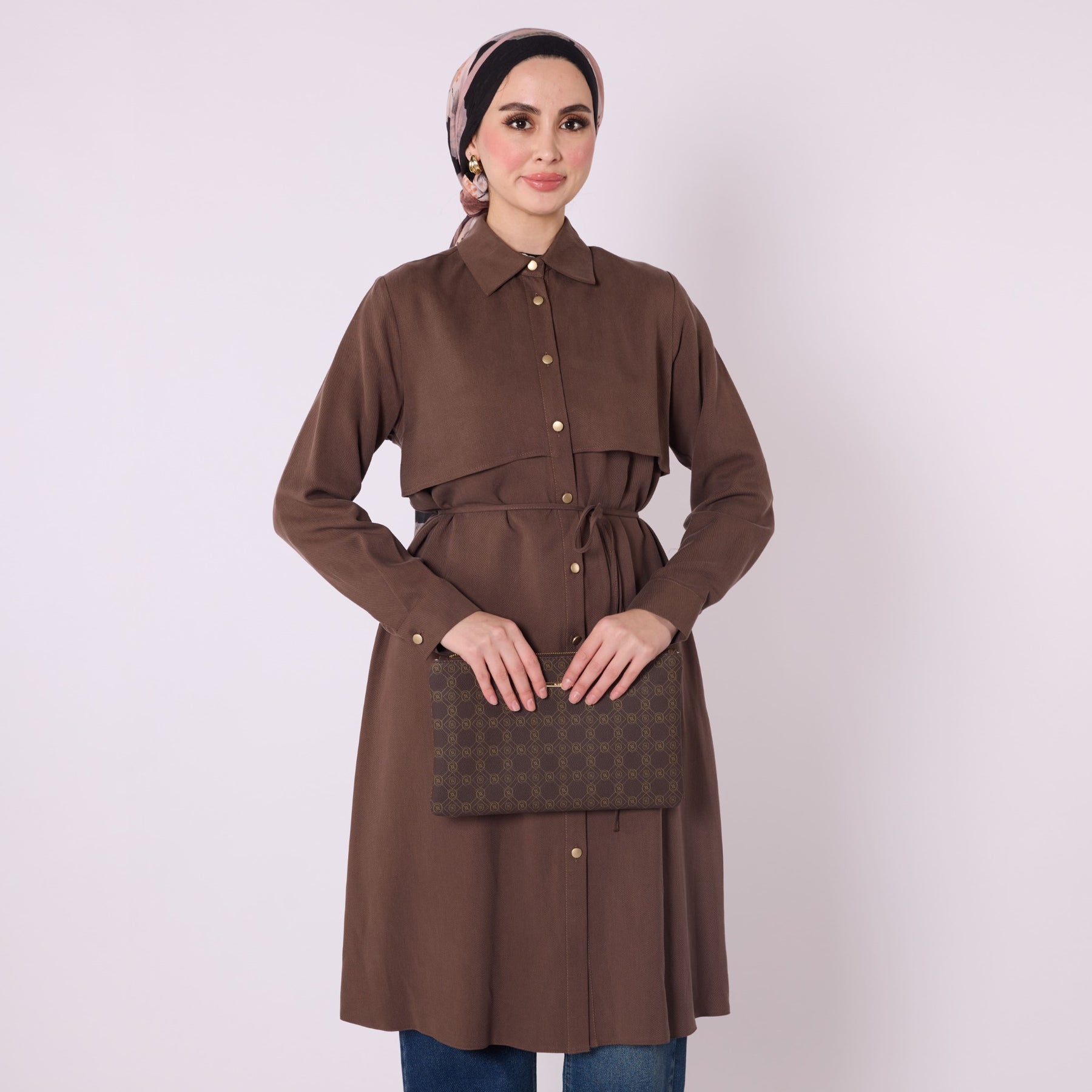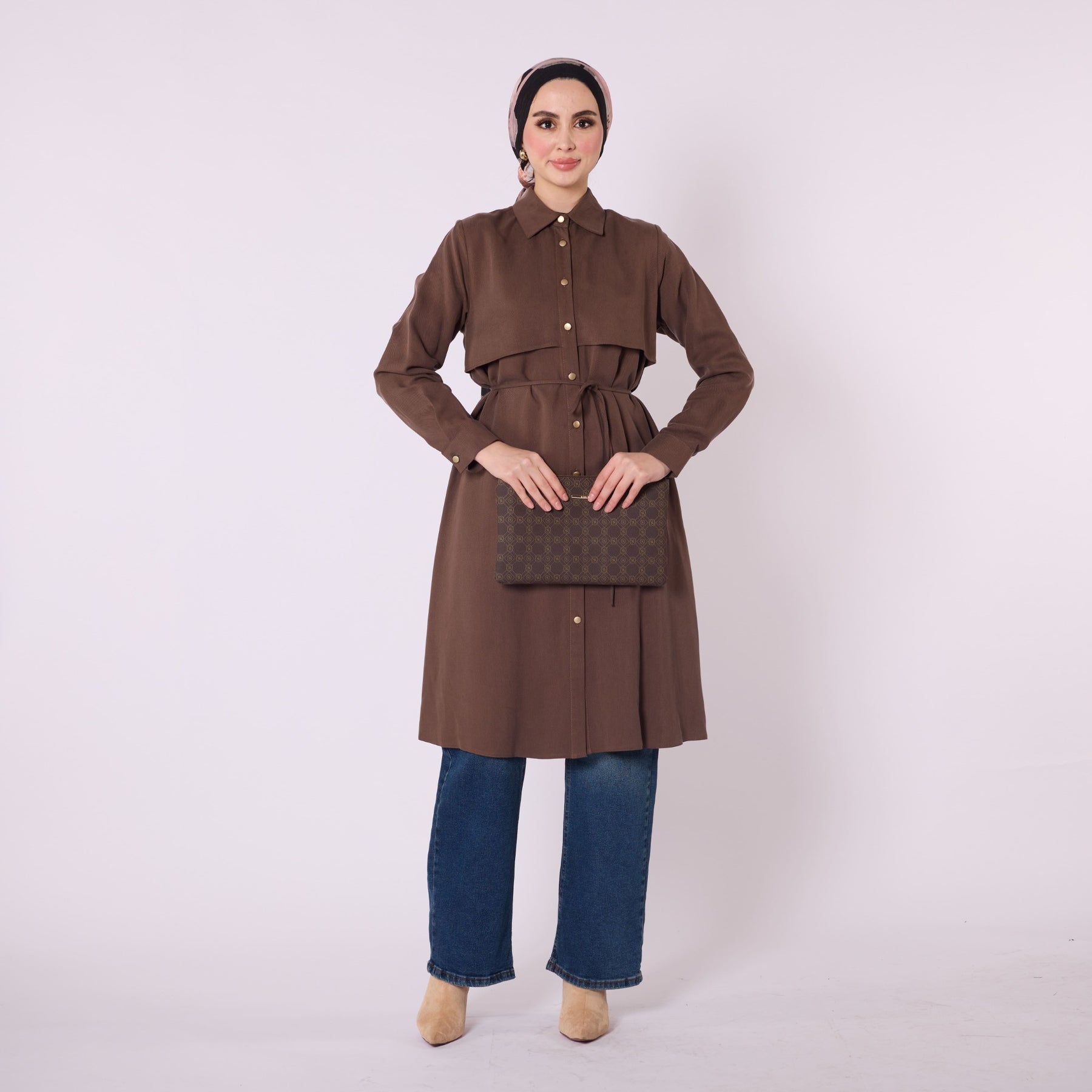 Crafted from 100% polyester, this tunic offers a lightweight and fluid drape, combining elegance with a modern silhouette. The polo collar, front button closure and adjustable waist tie allow versatile styling—wear it fitted for a defined shape or loose for a relaxed flow. The cape-style upper layer adds movement and a refined touch, making the tunic visually striking. Available in brown and navy, it is suitable for daily wear, office outfits or elevated day-to-night looks.