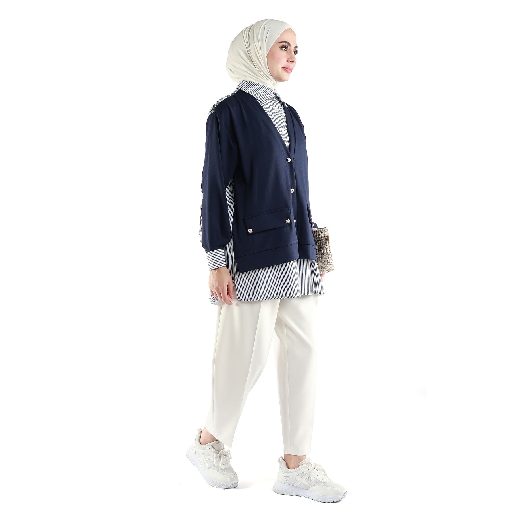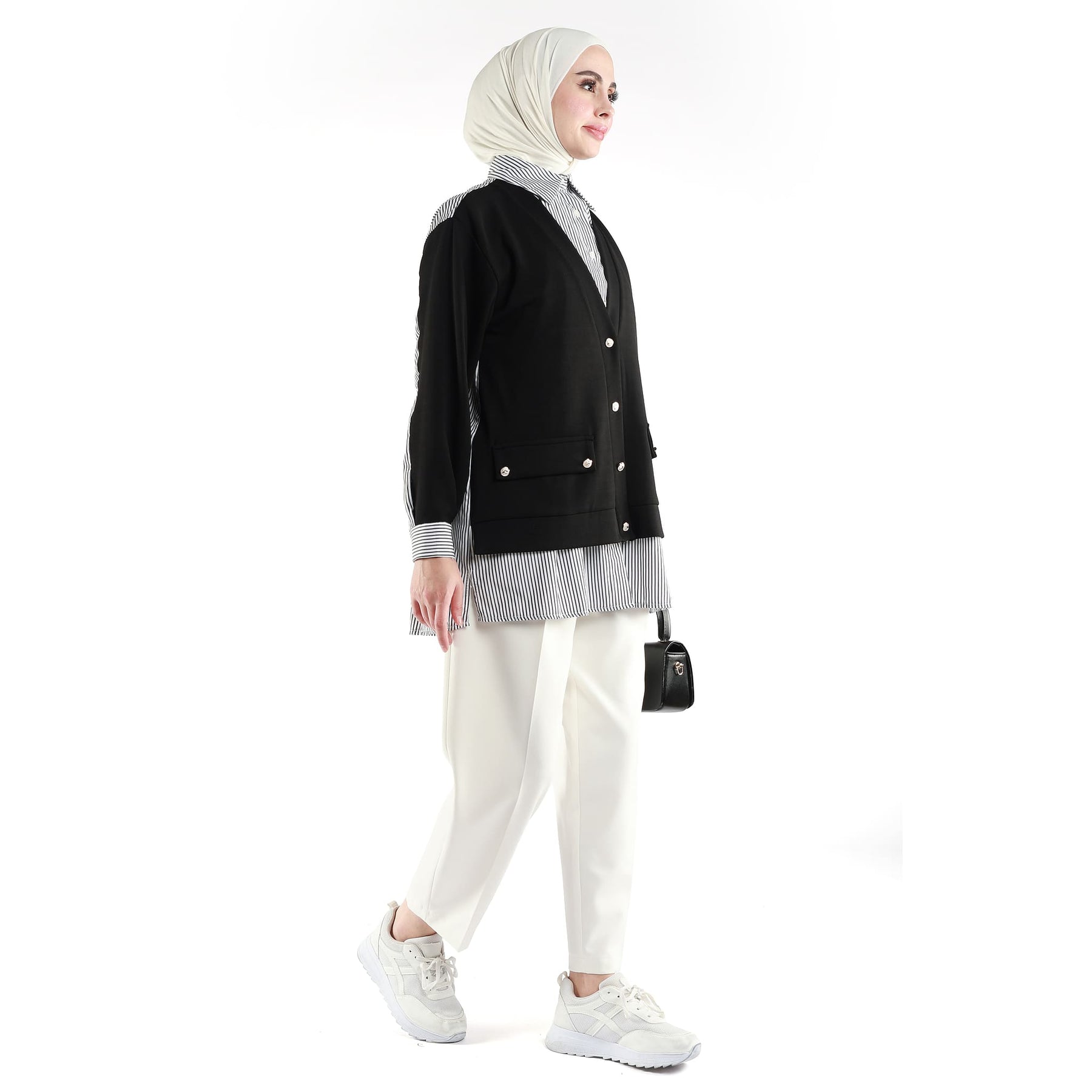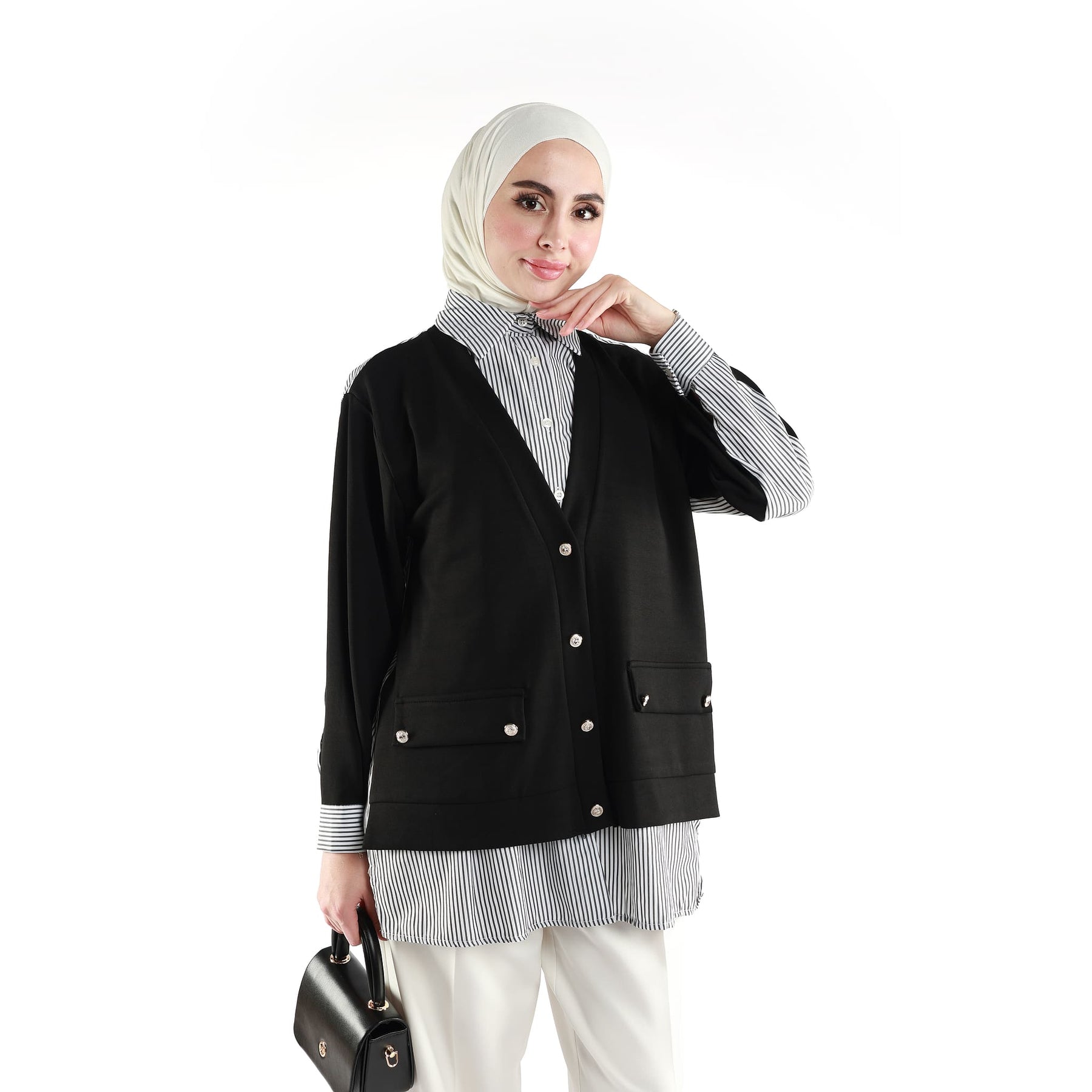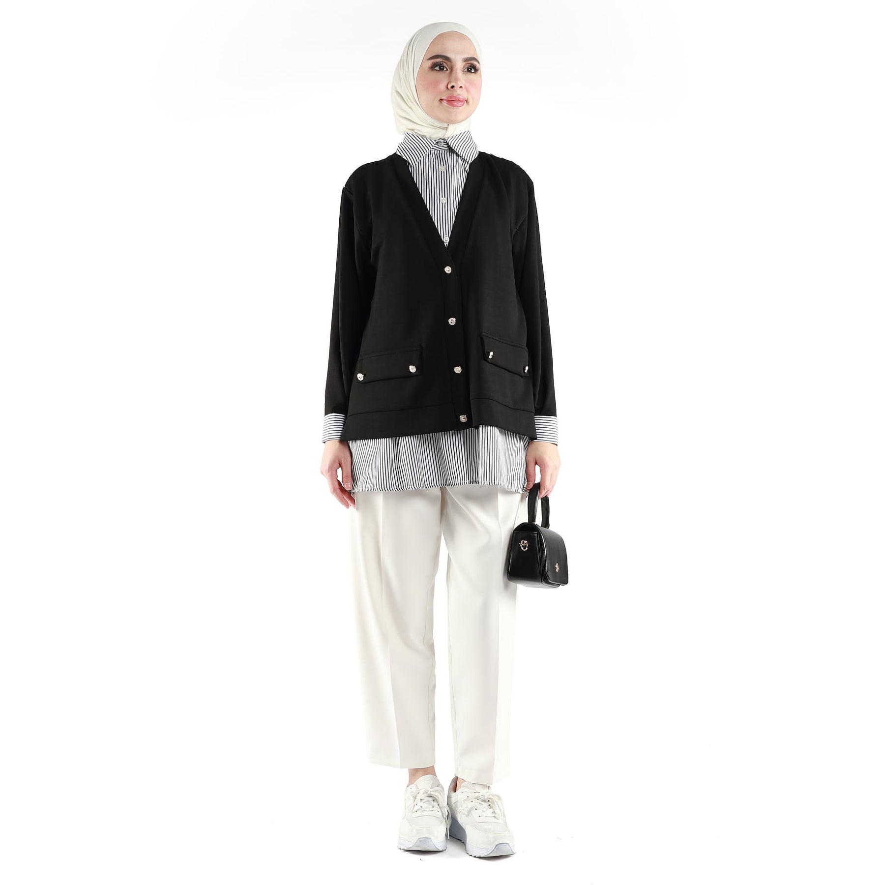 Featuring a unique design, the shirt and cardigan look tunic combines the appearance of two garments into one stylish top. From the back, it resembles a shirt, while the front features a shirt-over-cardigan look, offering a modern and sophisticated style.