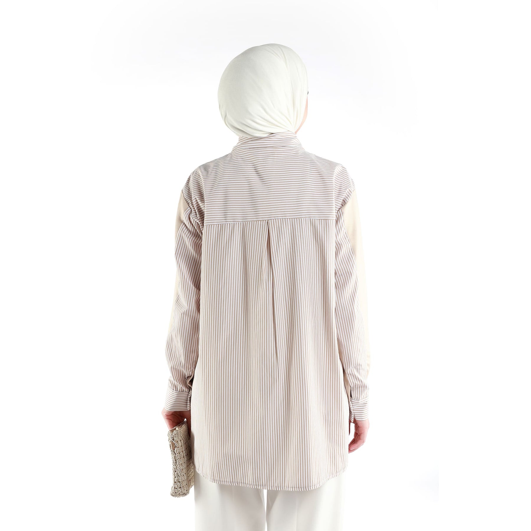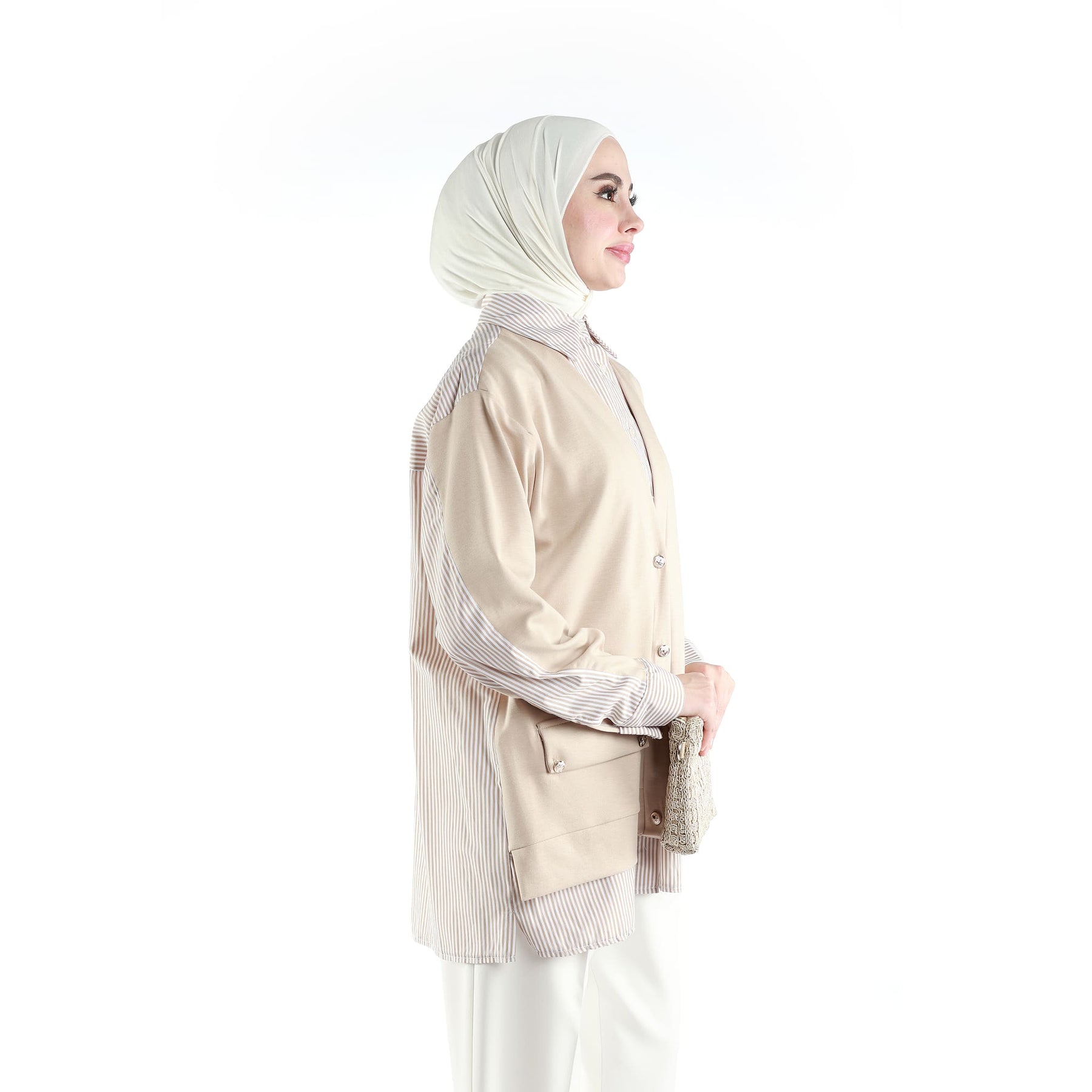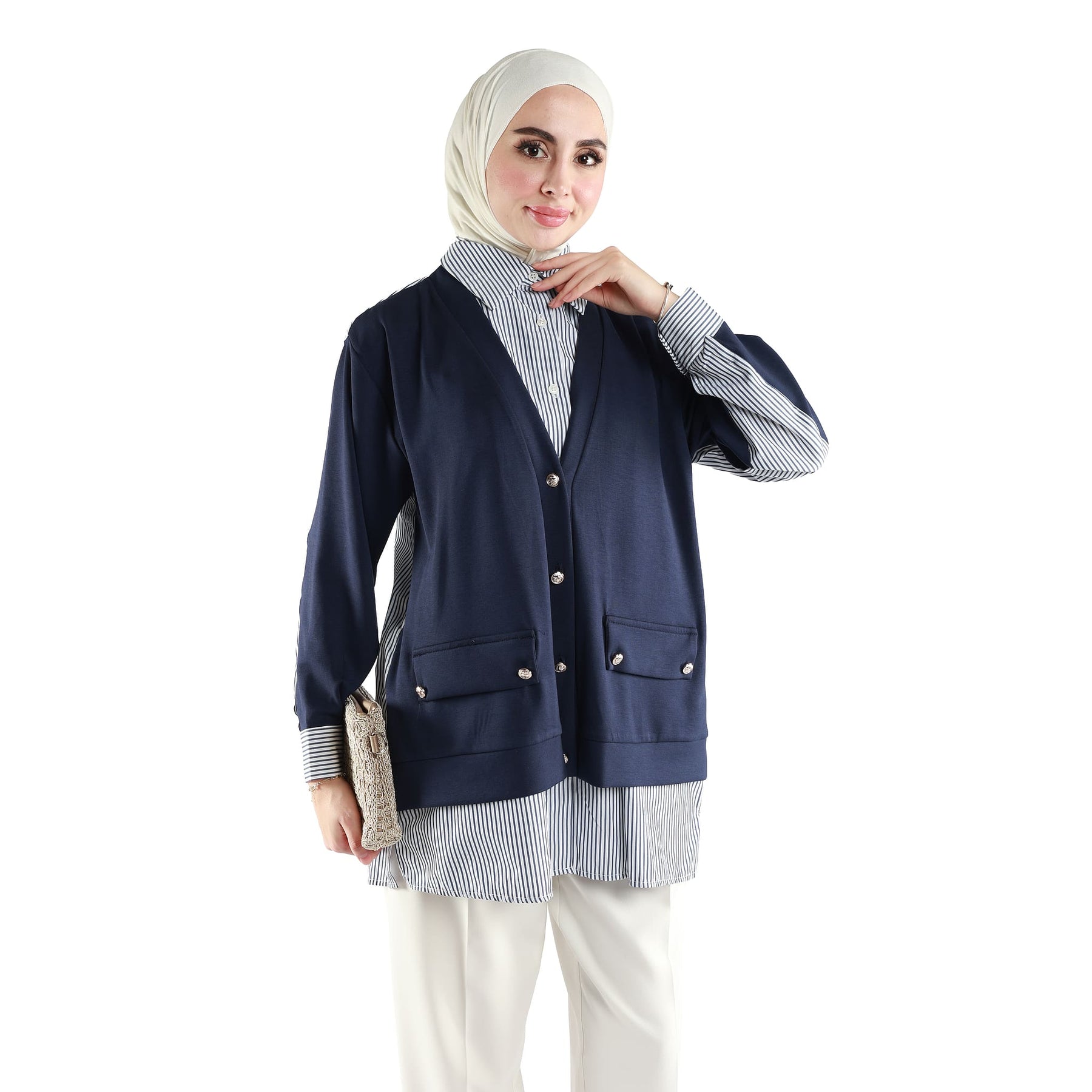 Featuring a unique design, the shirt and cardigan look tunic combines the appearance of two garments into one stylish top. From the back, it resembles a shirt, while the front features a shirt-over-cardigan look, offering a modern and sophisticated style.