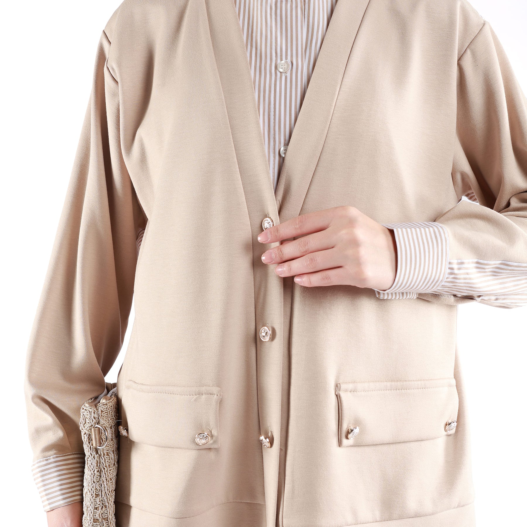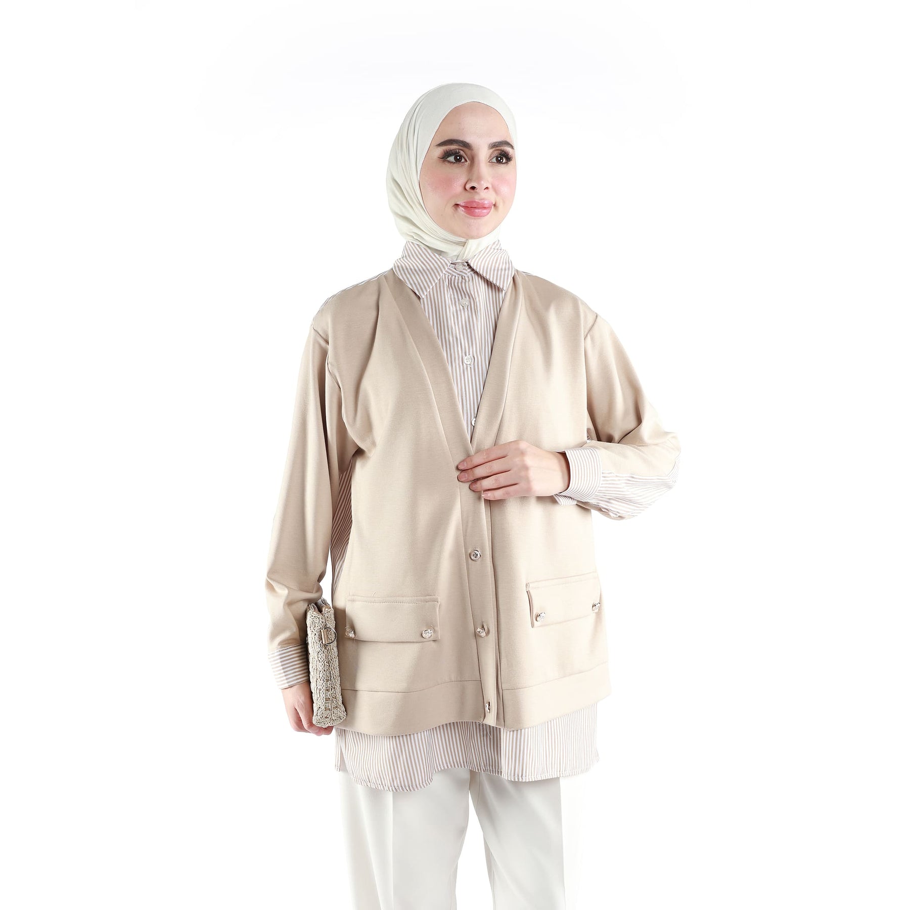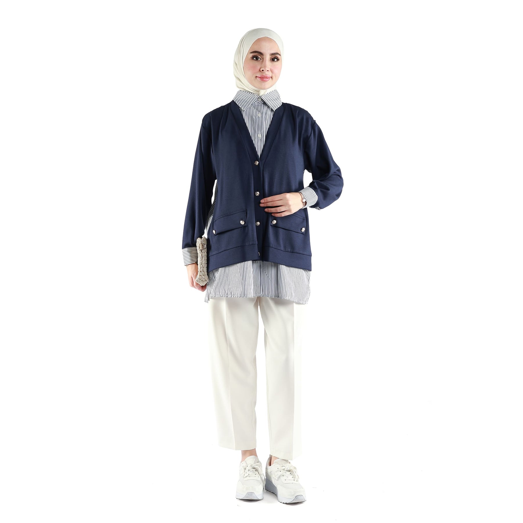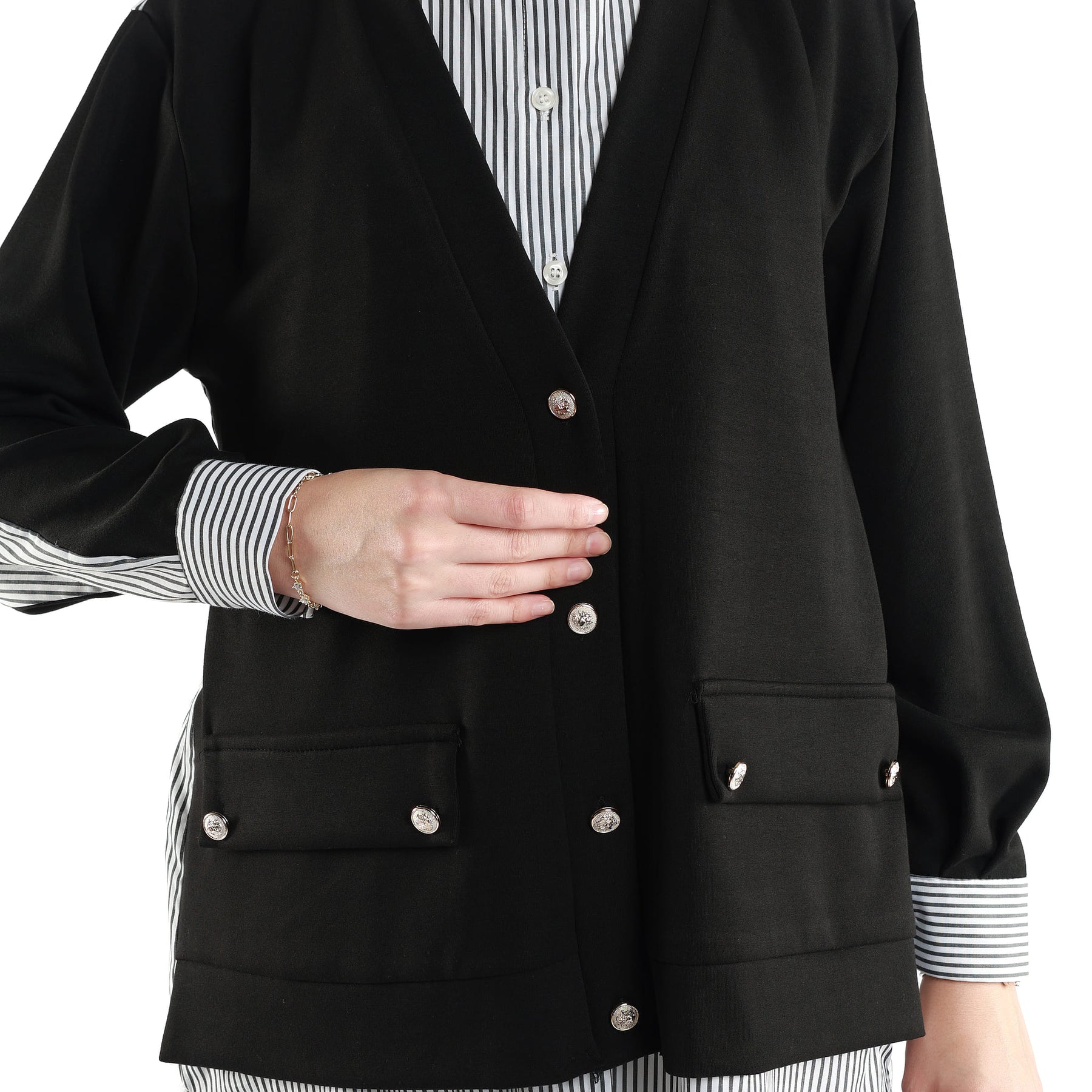 Featuring a unique design, the shirt and cardigan look tunic combines the appearance of two garments into one stylish top. From the back, it resembles a shirt, while the front features a shirt-over-cardigan look, offering a modern and sophisticated style.