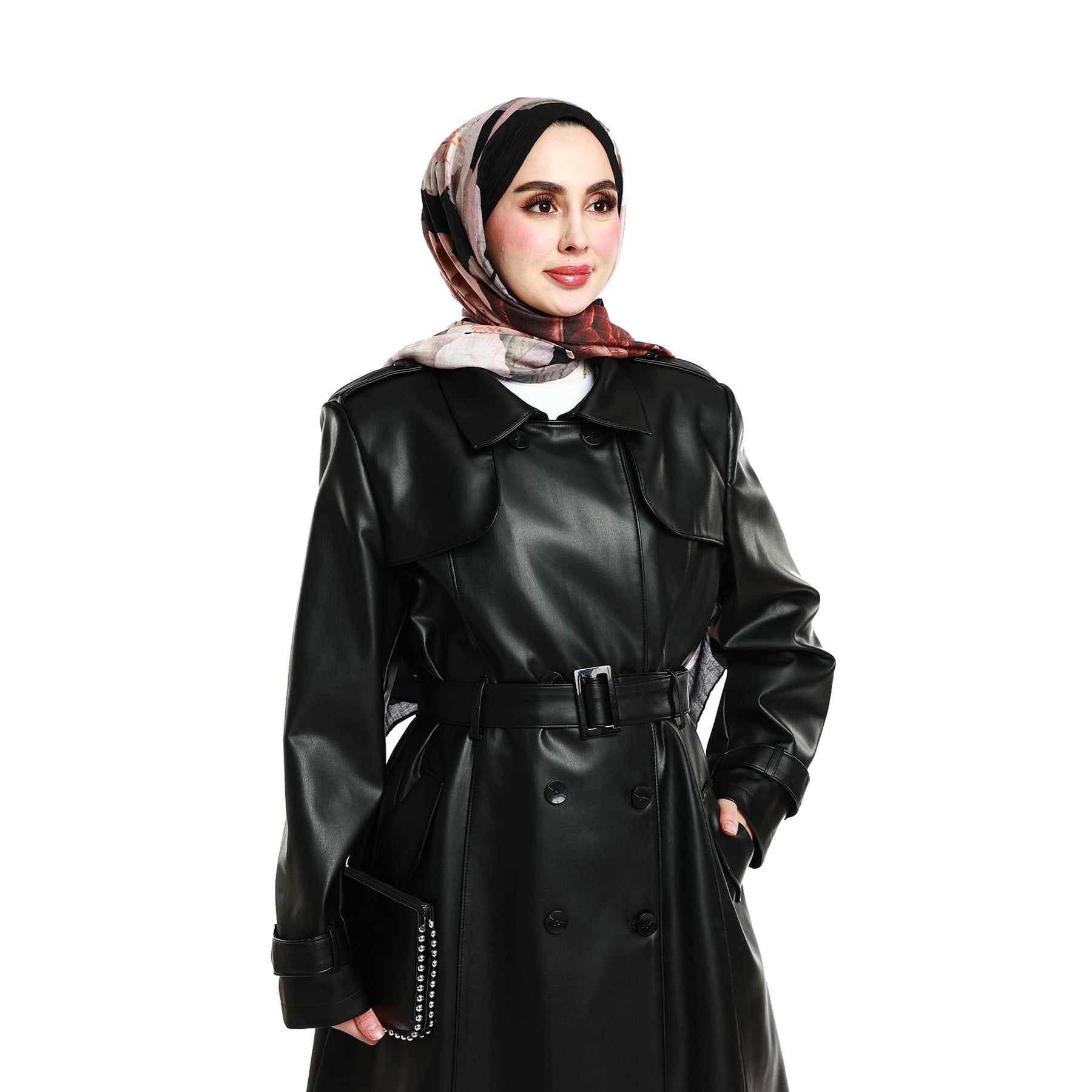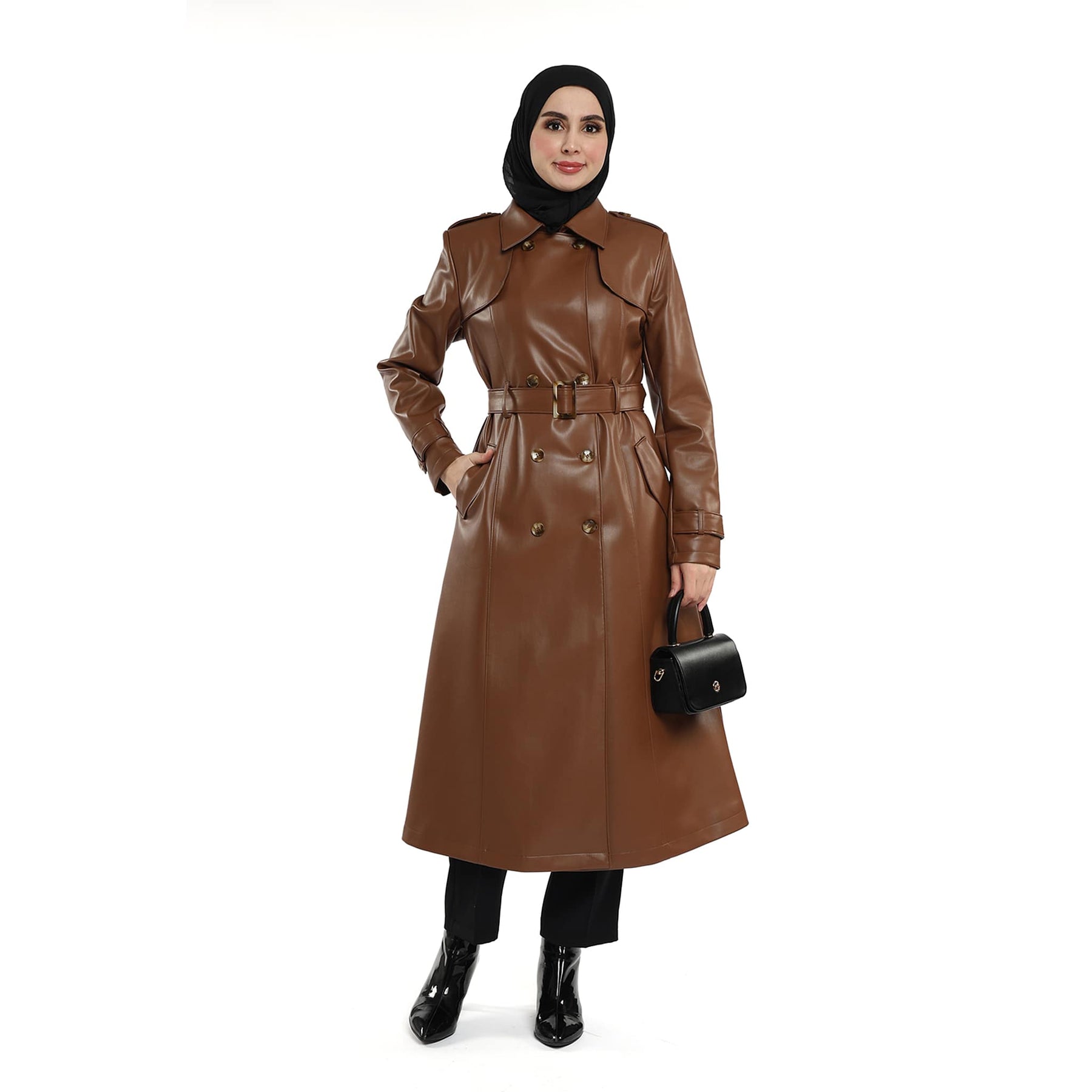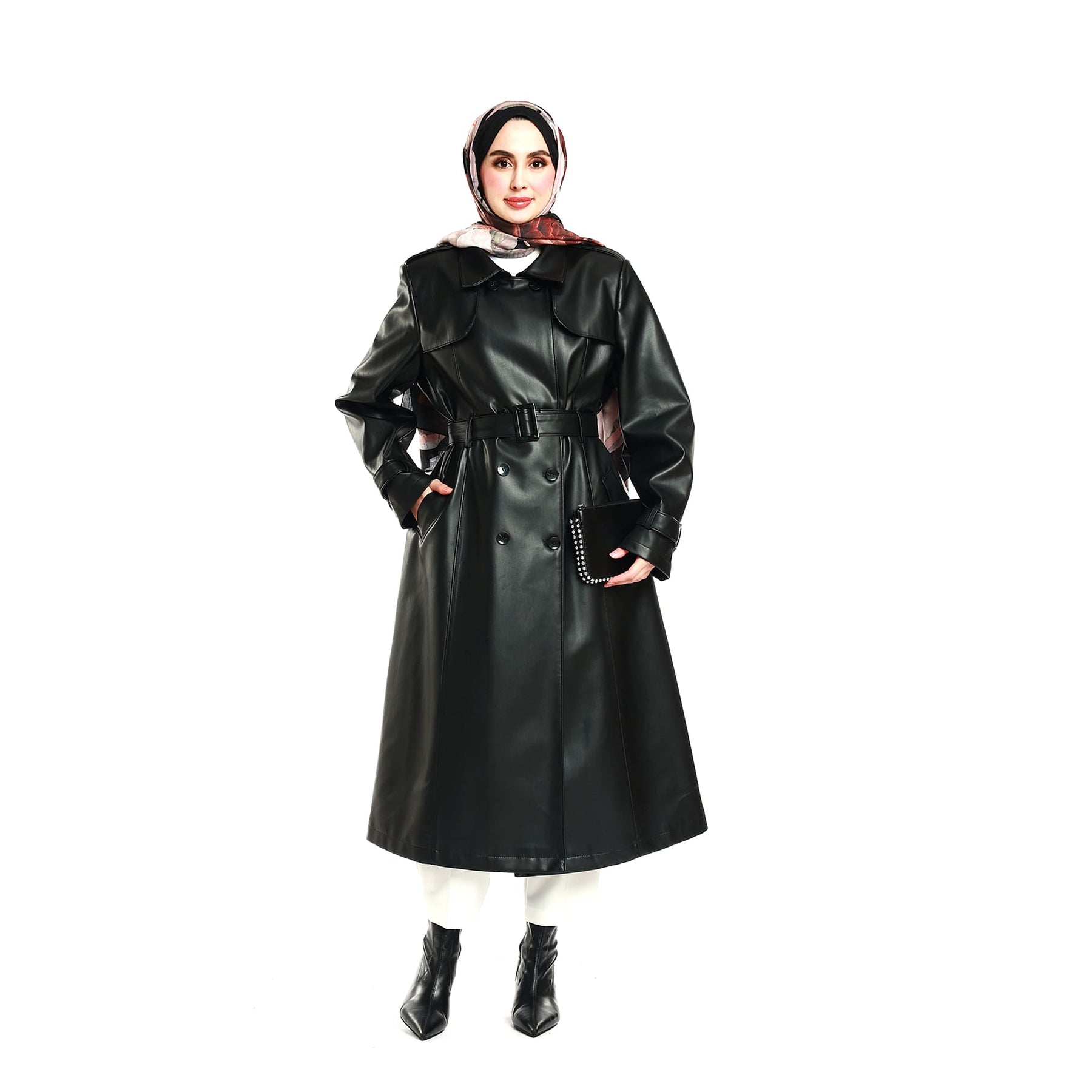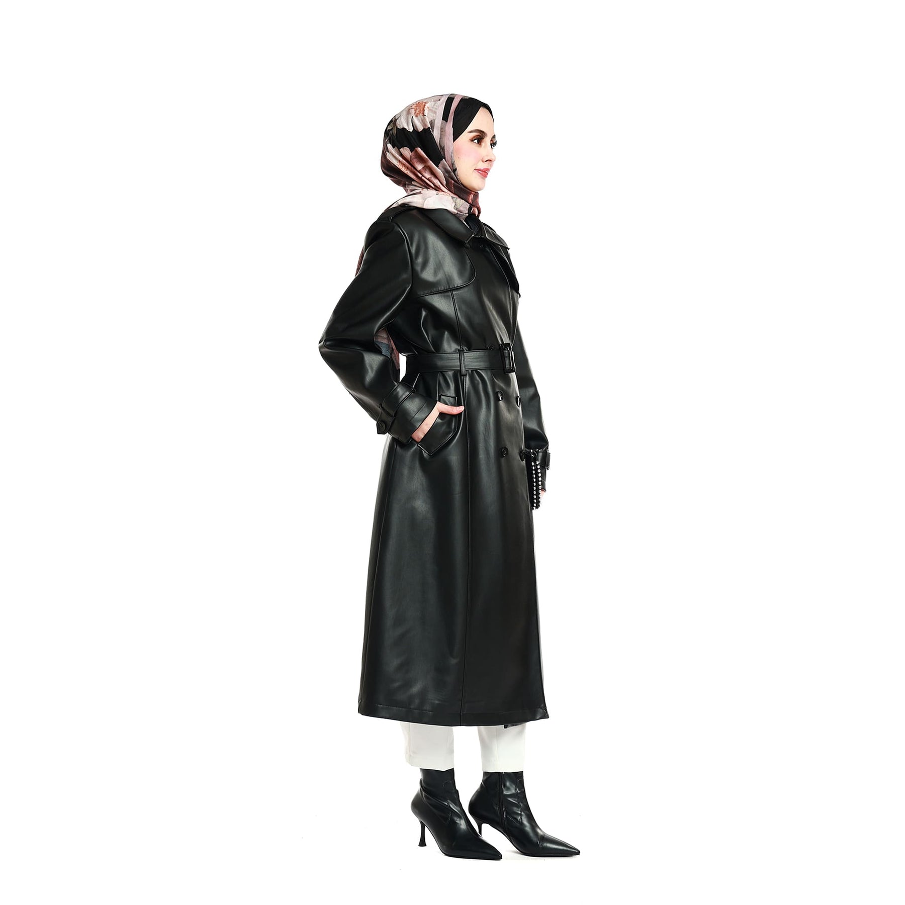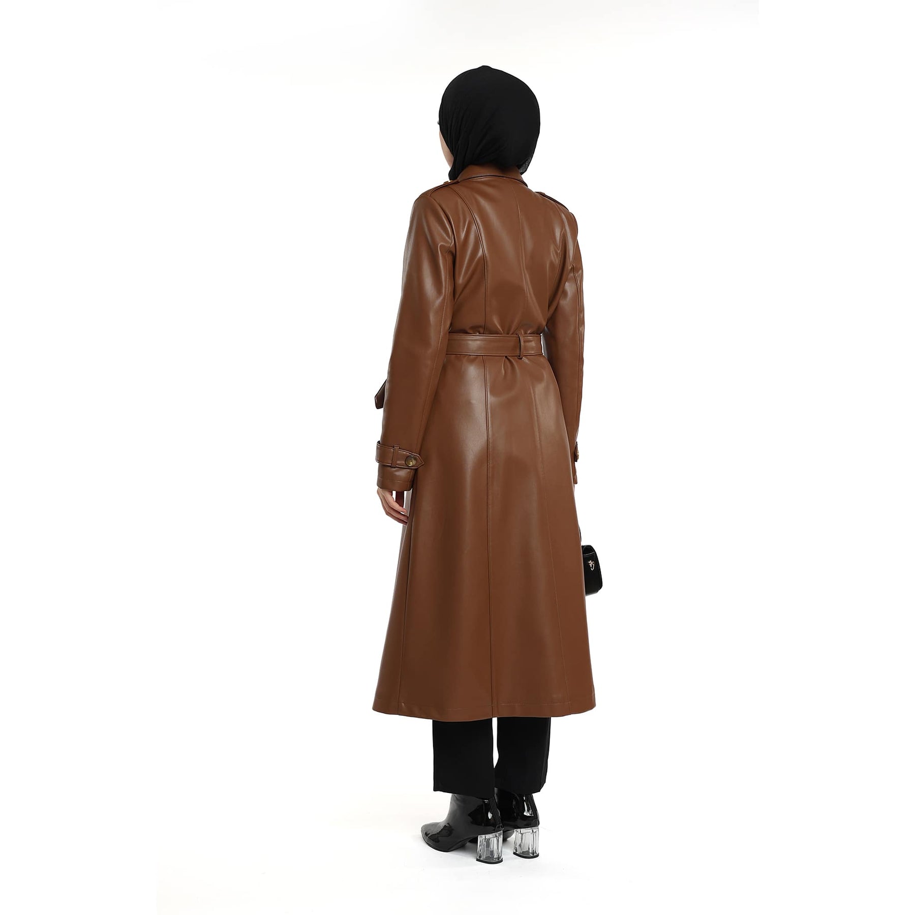 The Epaulette and Belt Detail Faux Leather Coat is a statement outerwear piece designed for those who appreciate a bold yet refined look. Made from faux leather, it offers a structured appearance and a polished finish while remaining durable and comfortable to wear. Epaulettes on the shoulders give the coat a confident and defined silhouette, while the belt at the waist gently shapes the body and allows you to adjust the fit as you wish. The belt is crafted from the same fabric to create a clean, harmonious look. On the front, six asymmetrically placed buttons bring a modern twist to the classic buttoned coat design. Two front pockets add practicality without disturbing the sleek overall line.