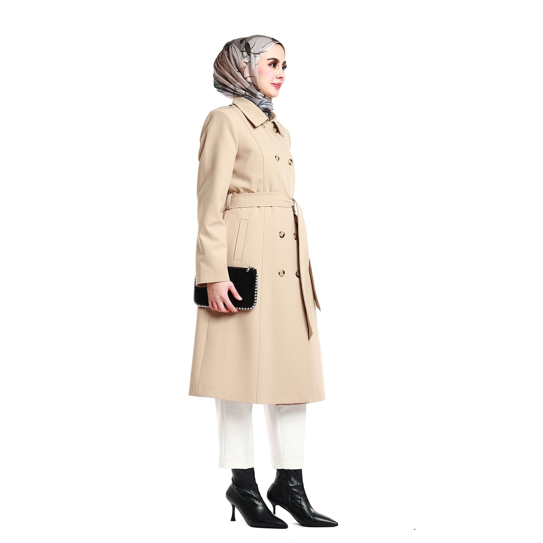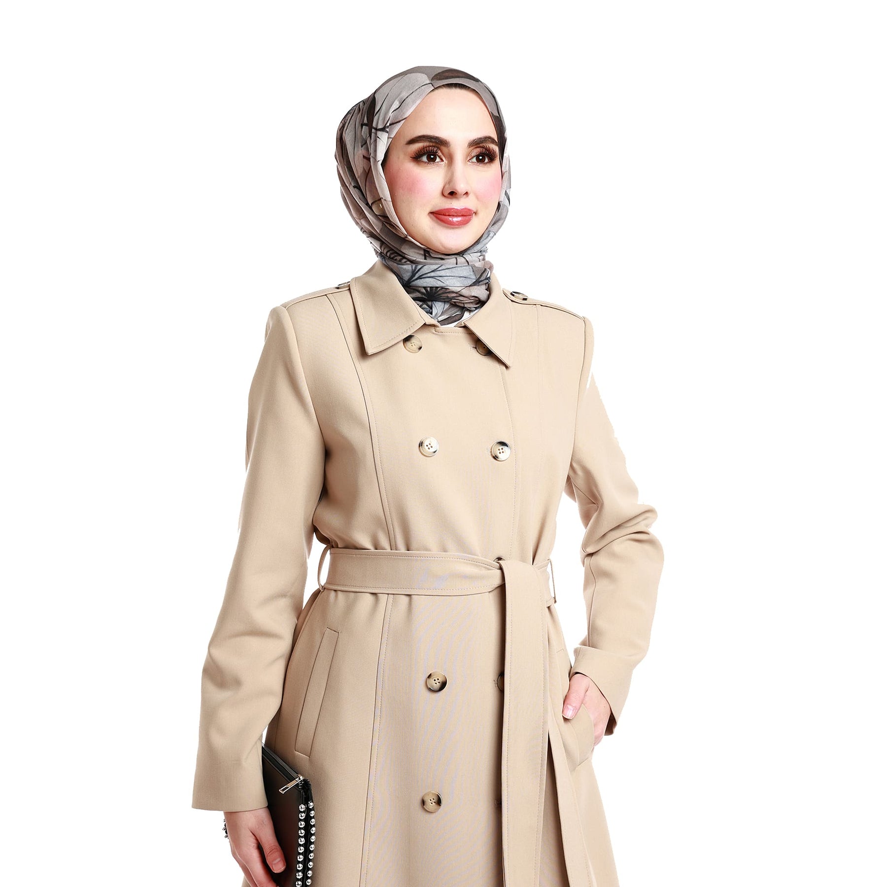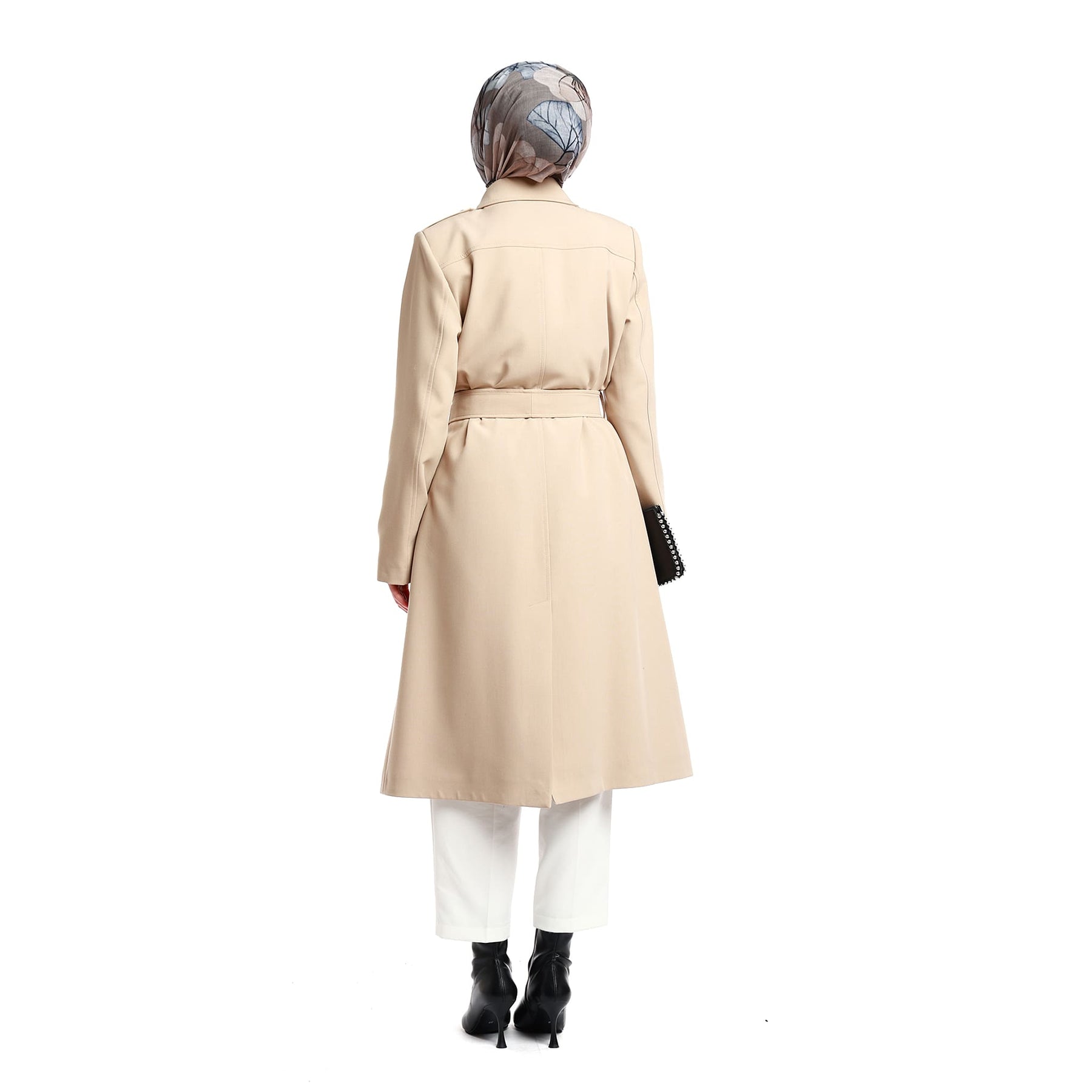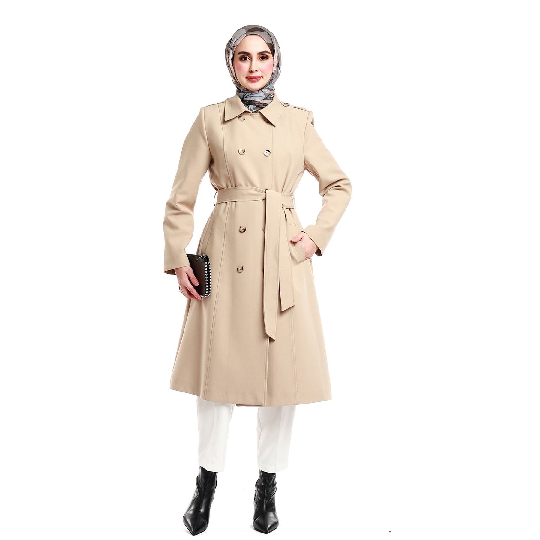 Made from a 75% polyester and 25% viscose blend, the fabric is durable and long-lasting. Available in Beige, Navy, Light Vison, Rose, Stone, Black, and Brown, it coordinates effortlessly with various outfits. With a 120 cm length, it pairs beautifully with both trousers and skirts.